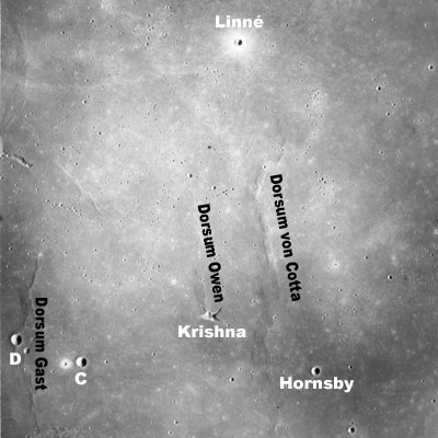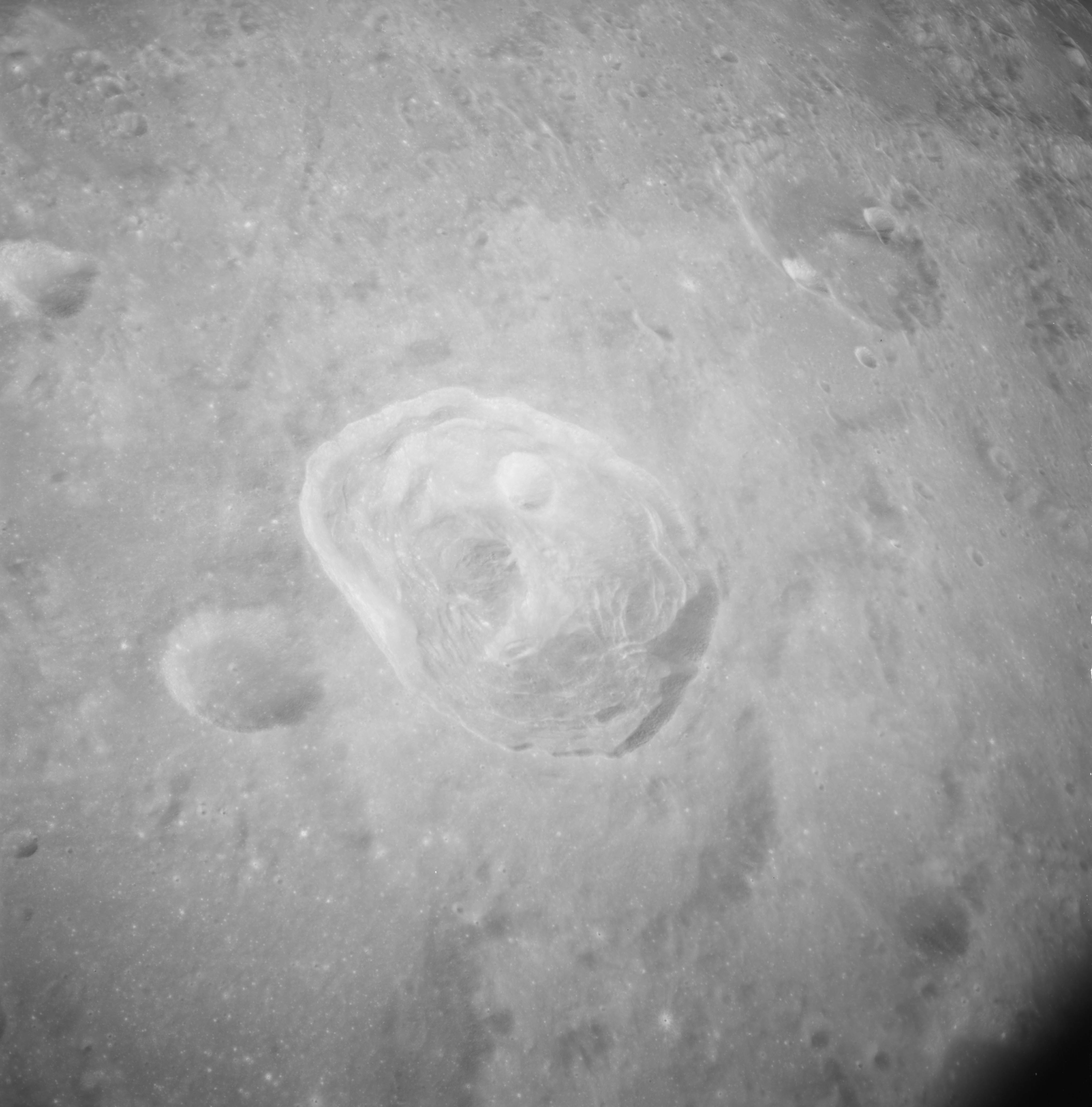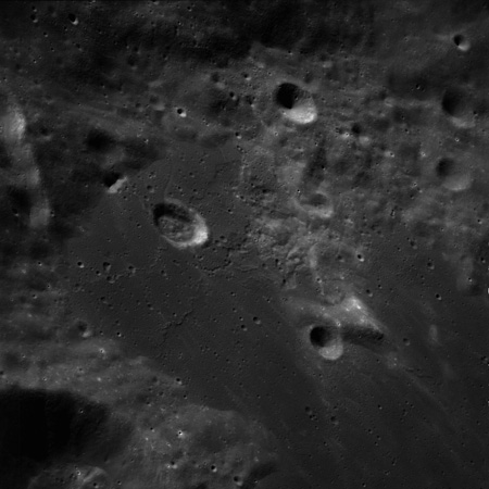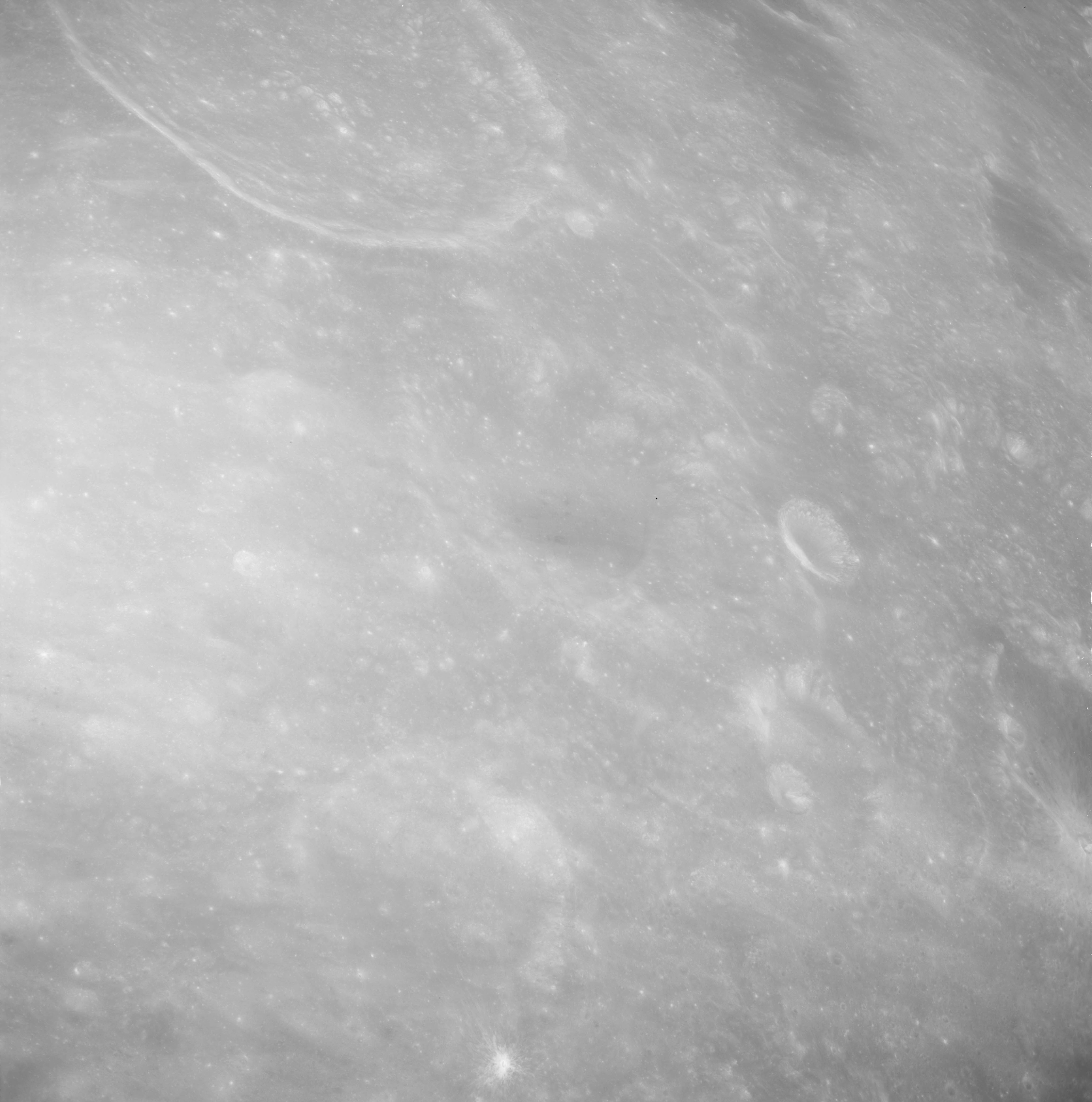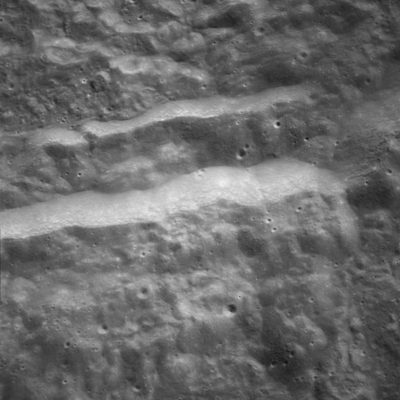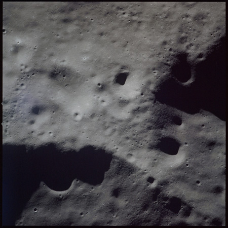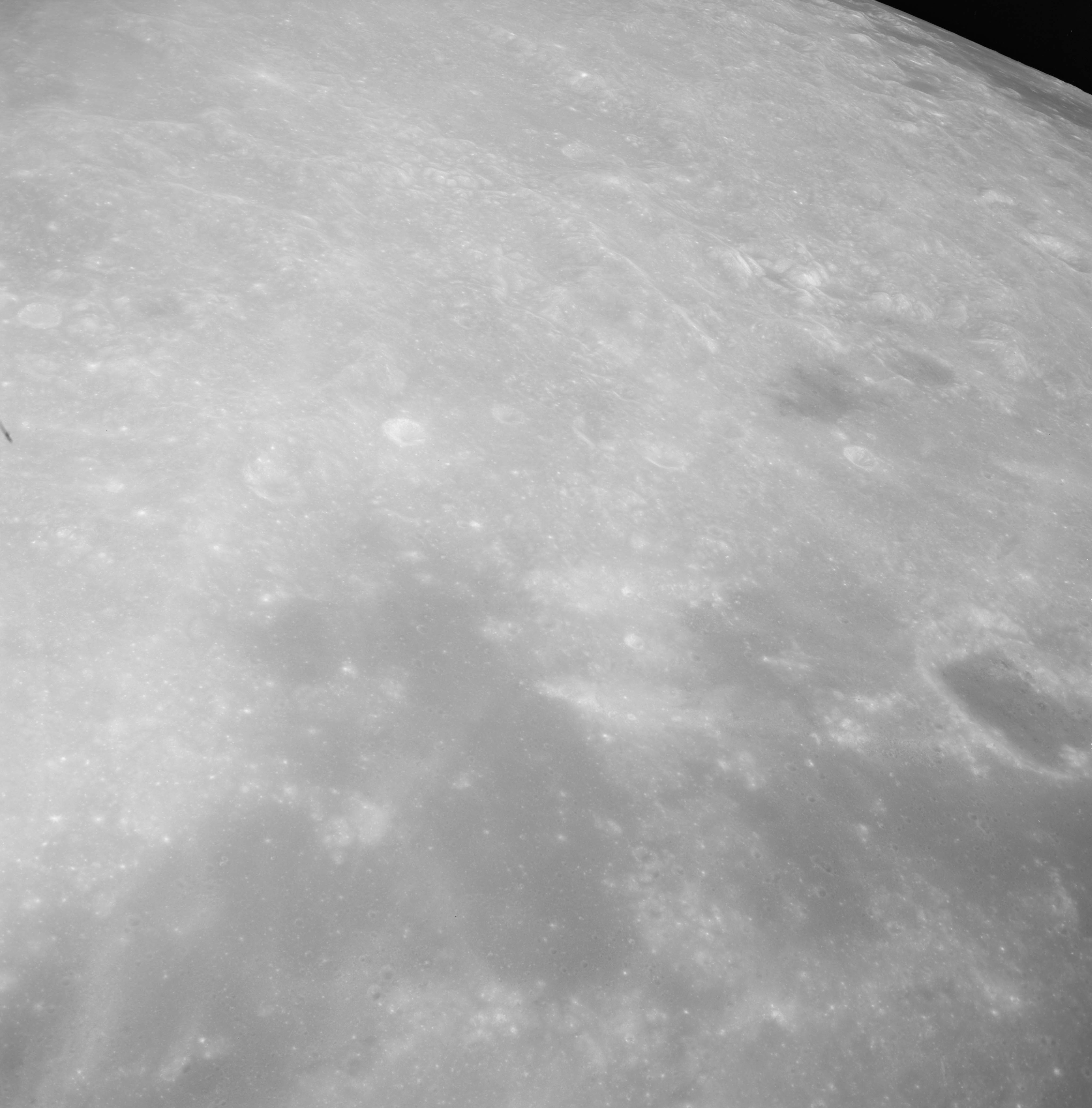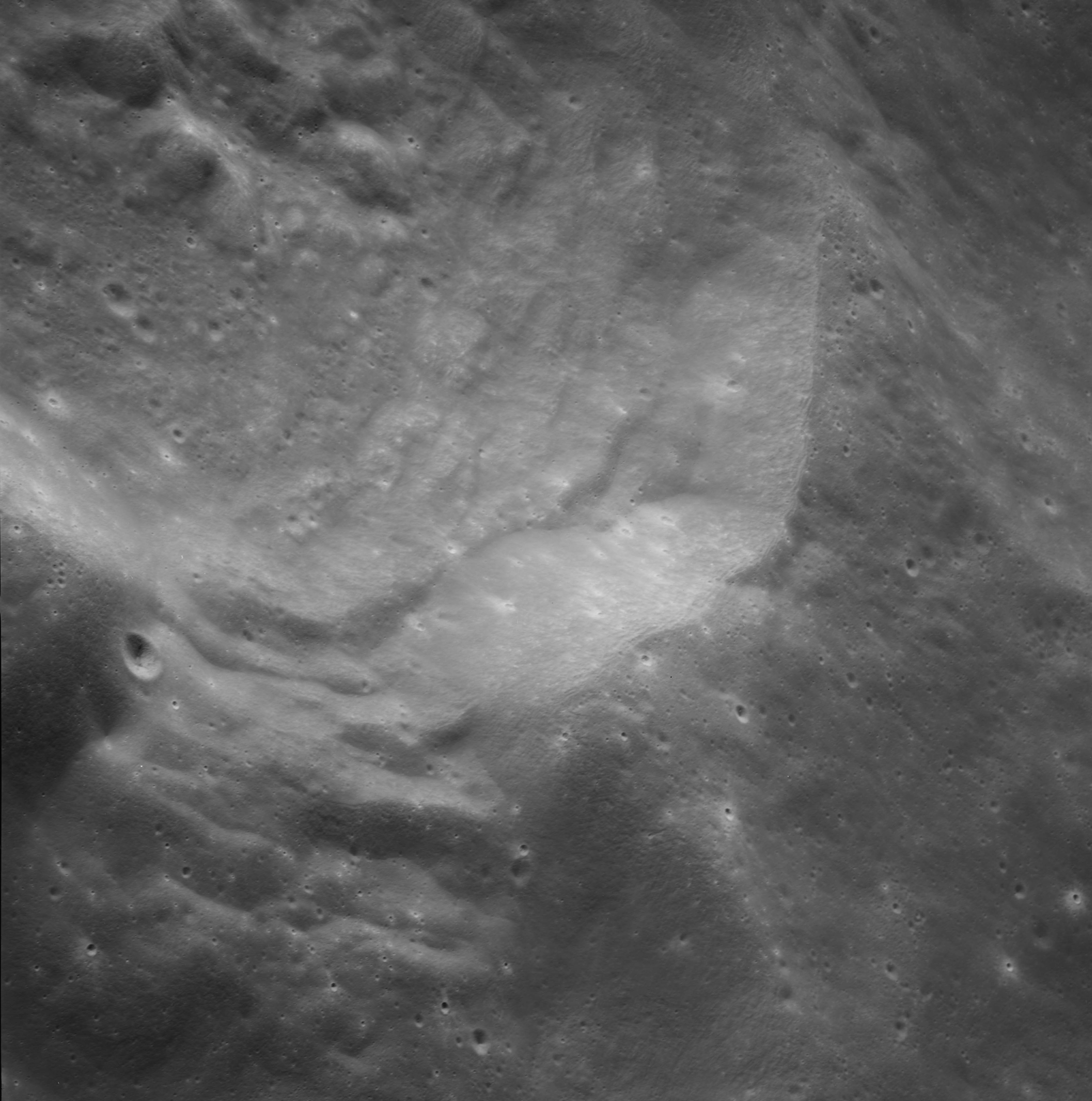 Of particular note in the last four images is the radial "sculpture"; evidence of the outrushing sheet of ejecta from the impact which carved long furrows in the ground. These are smaller scale examples of similar landforms seen around the Imbrium basin on the front side, particularly around Mare Vaporum, which are traces of the tremendous effect the formation of the Imbrium Basin had on the Moon's surface. The correct interpretation of the origin of sculpture would prove to be crucial to understanding the history of the Moon's features. For vertical context, this is a more recent image from the Lunar Reconnaissance Orbiter.