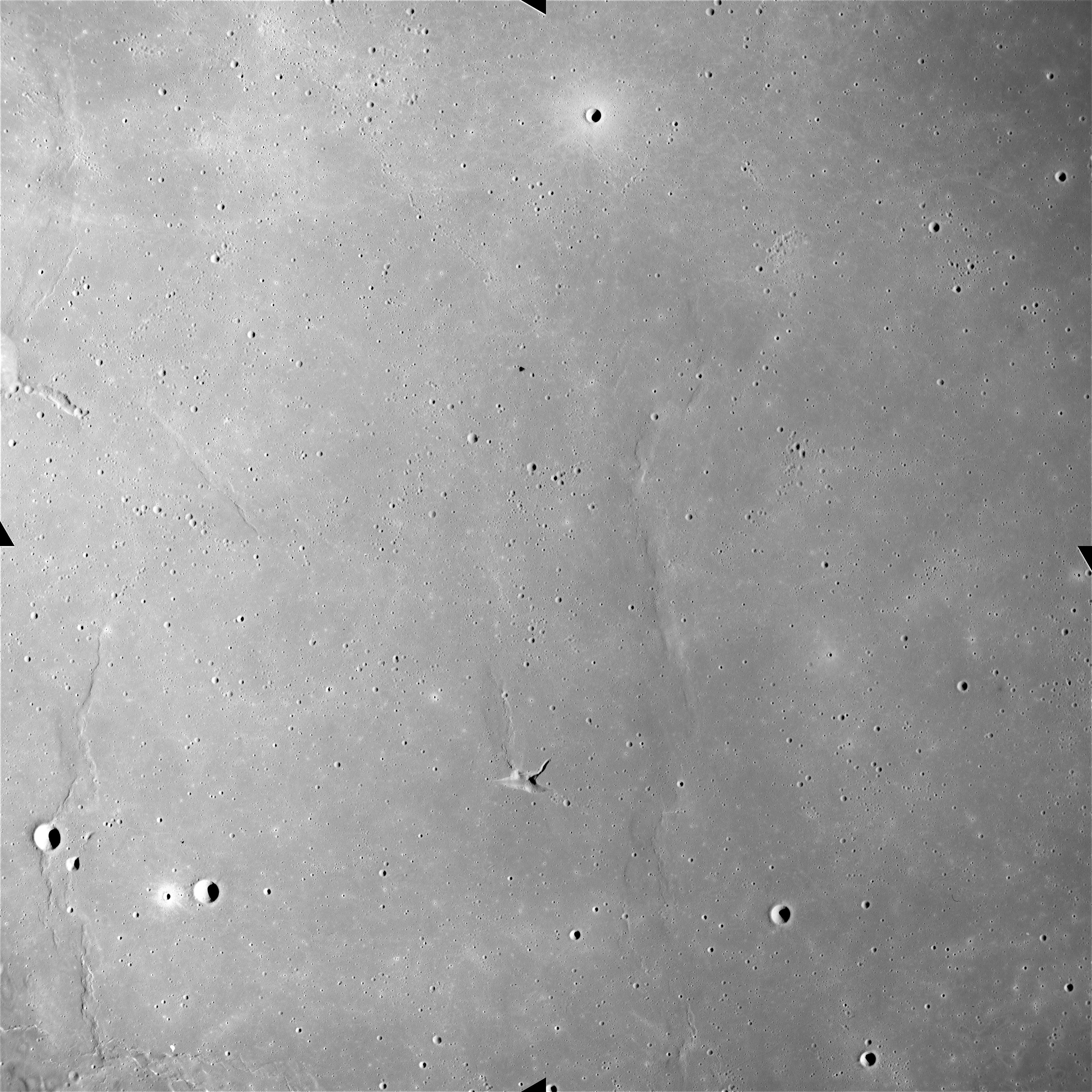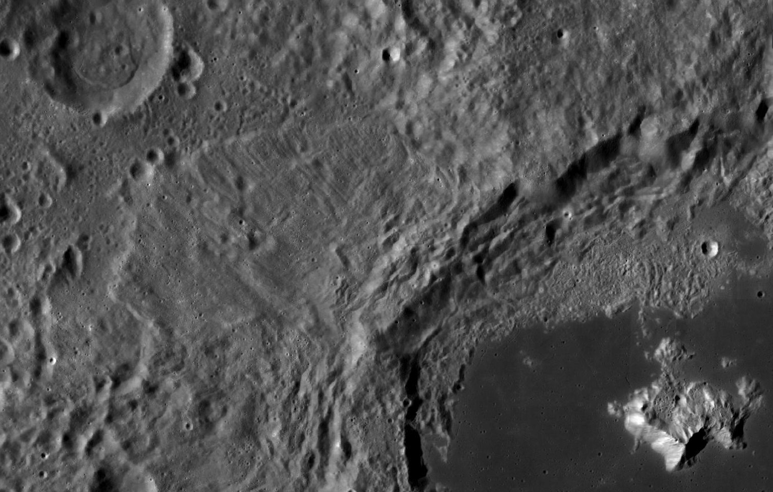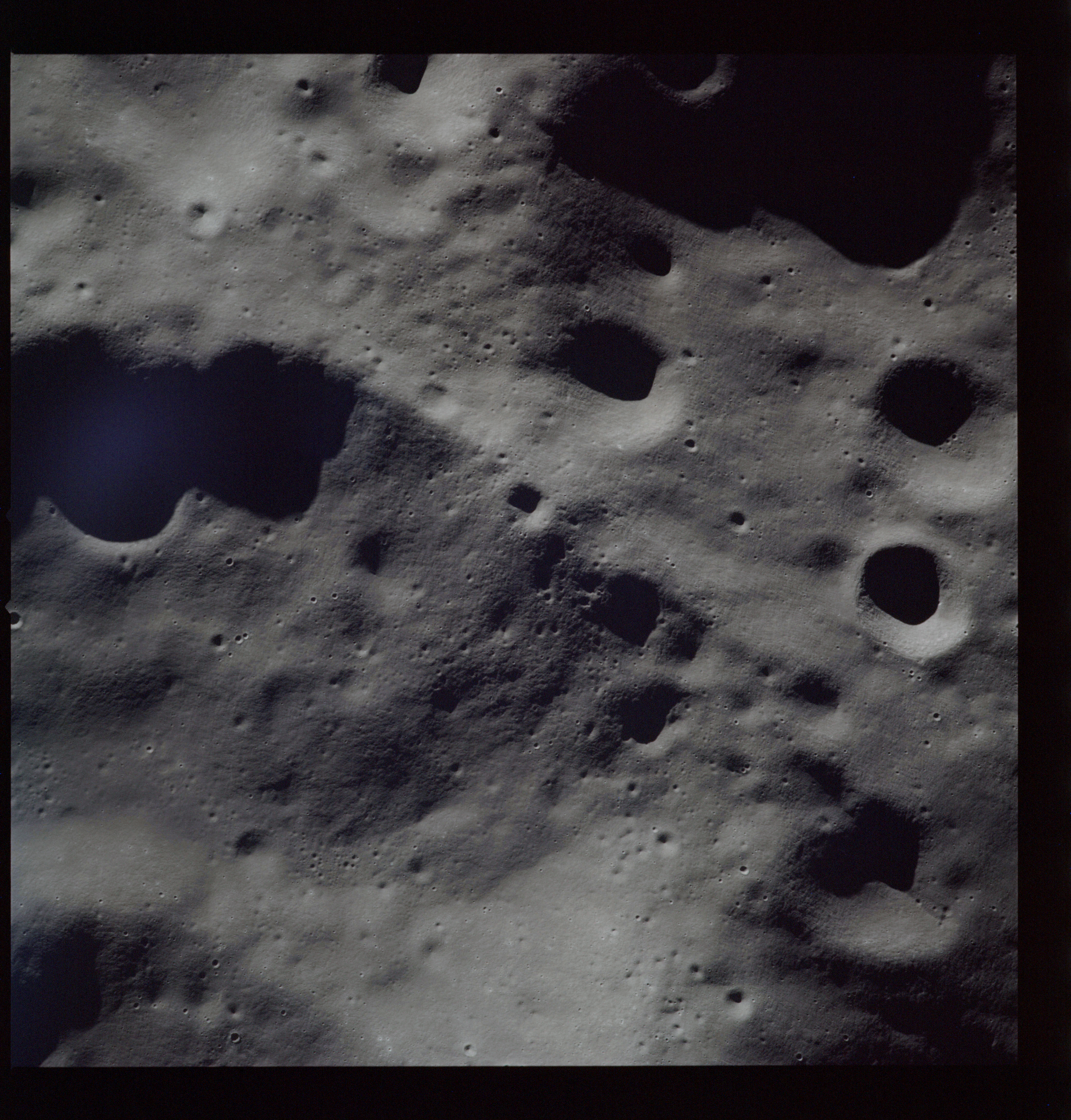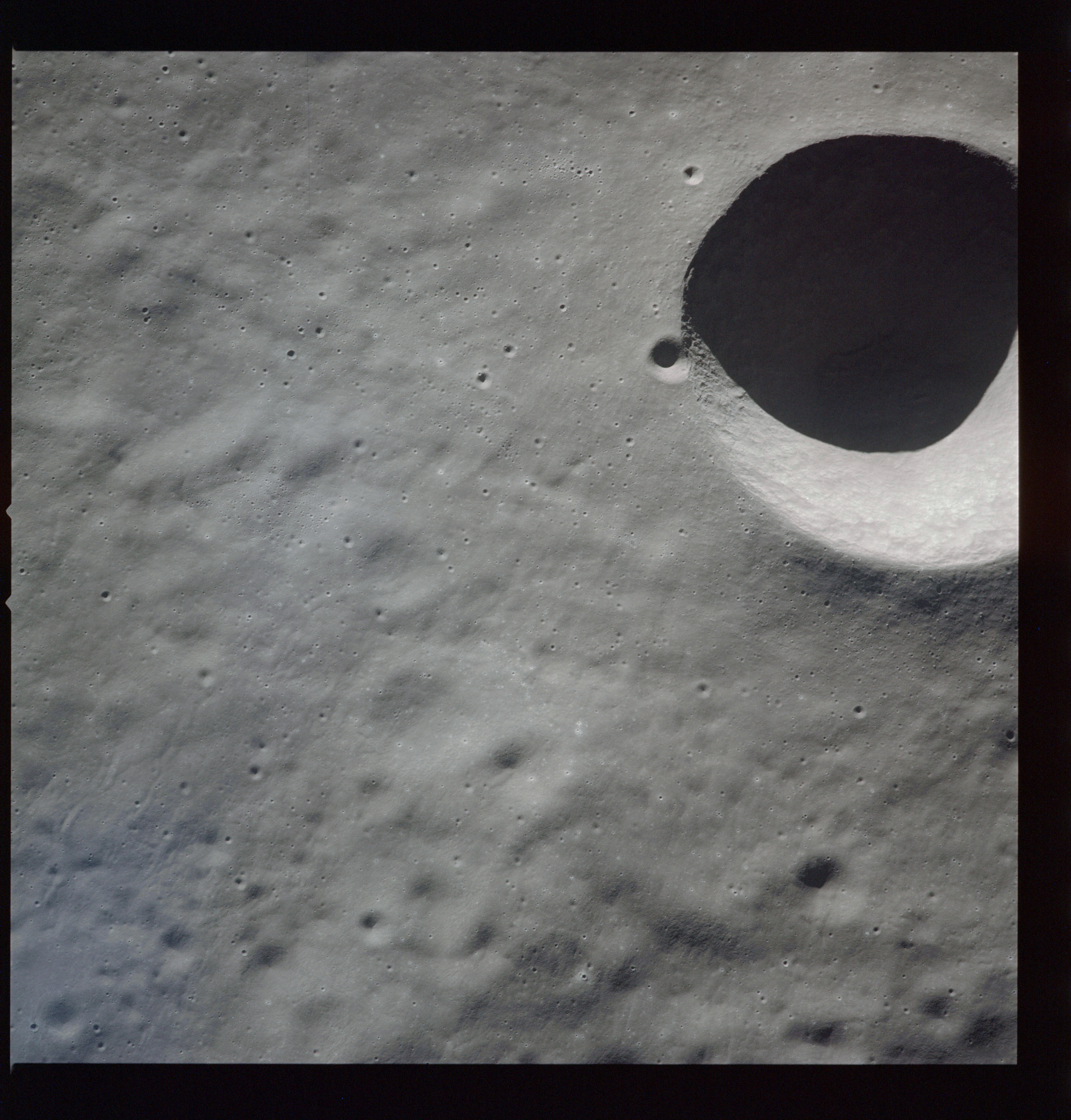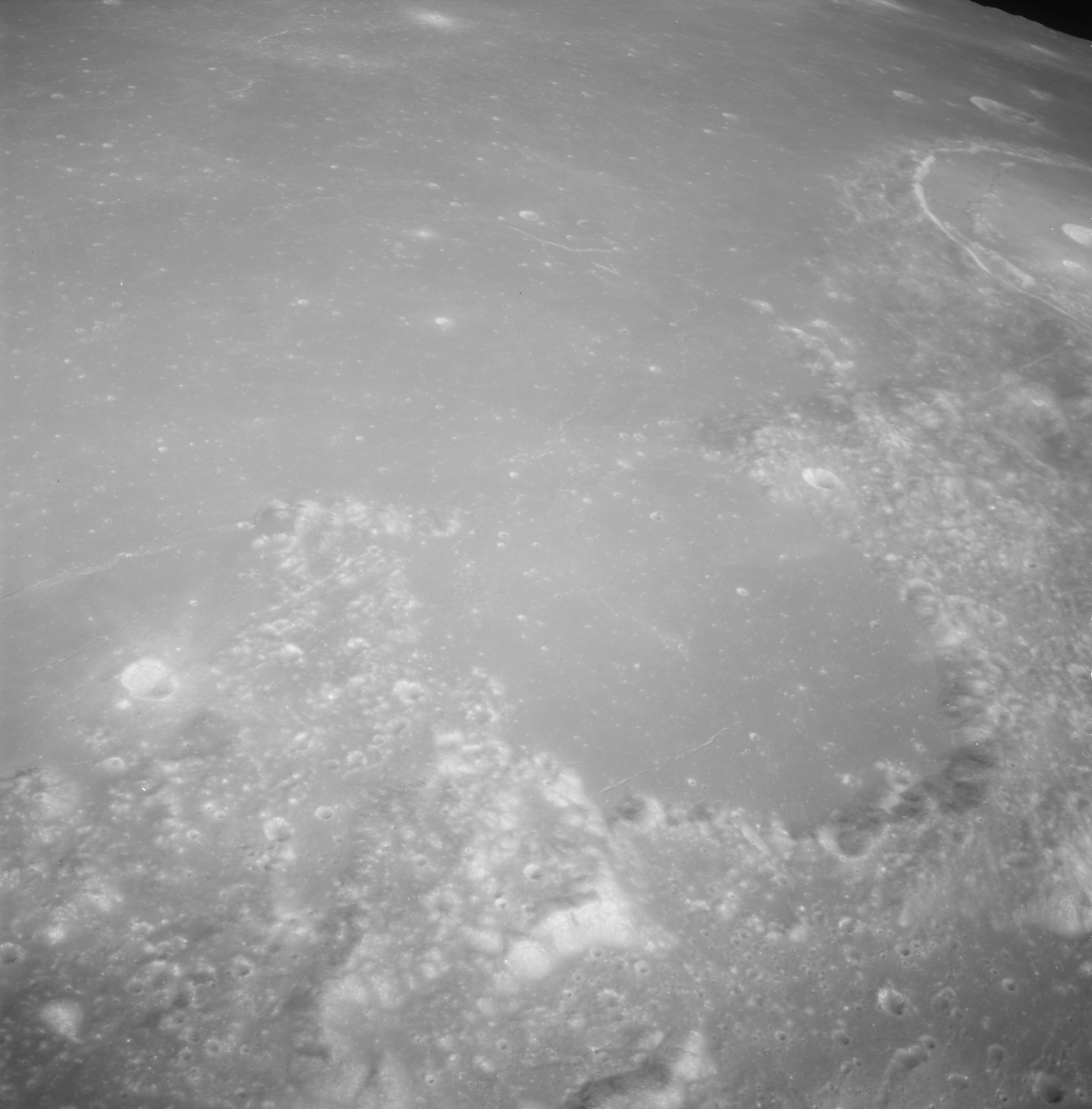Of particular note in the last four images is the radial "sculpture"; evidence of the outrushing sheet of ejecta from the impact which carved long furrows in the ground. These are smaller scale examples of similar landforms seen around the Imbrium basin on the front side, particularly around Mare Vaporum, which are traces of the tremendous effect the formation of the Imbrium Basin had on the Moon's surface. The correct interpretation of the origin of sculpture would prove to be crucial to understanding the history of the Moon's features. For vertical context, this is a more recent image from the Lunar Reconnaissance Orbiter.