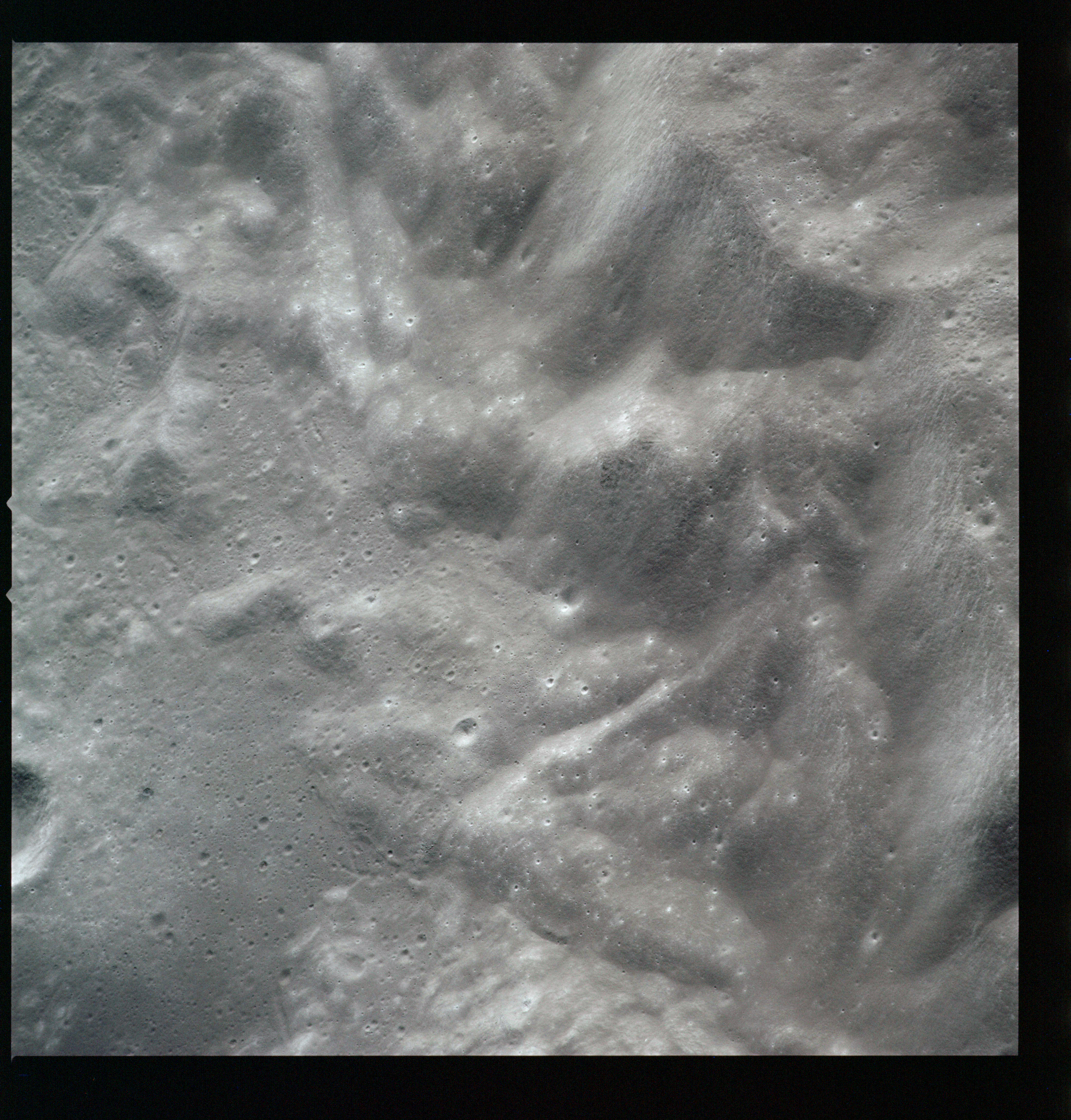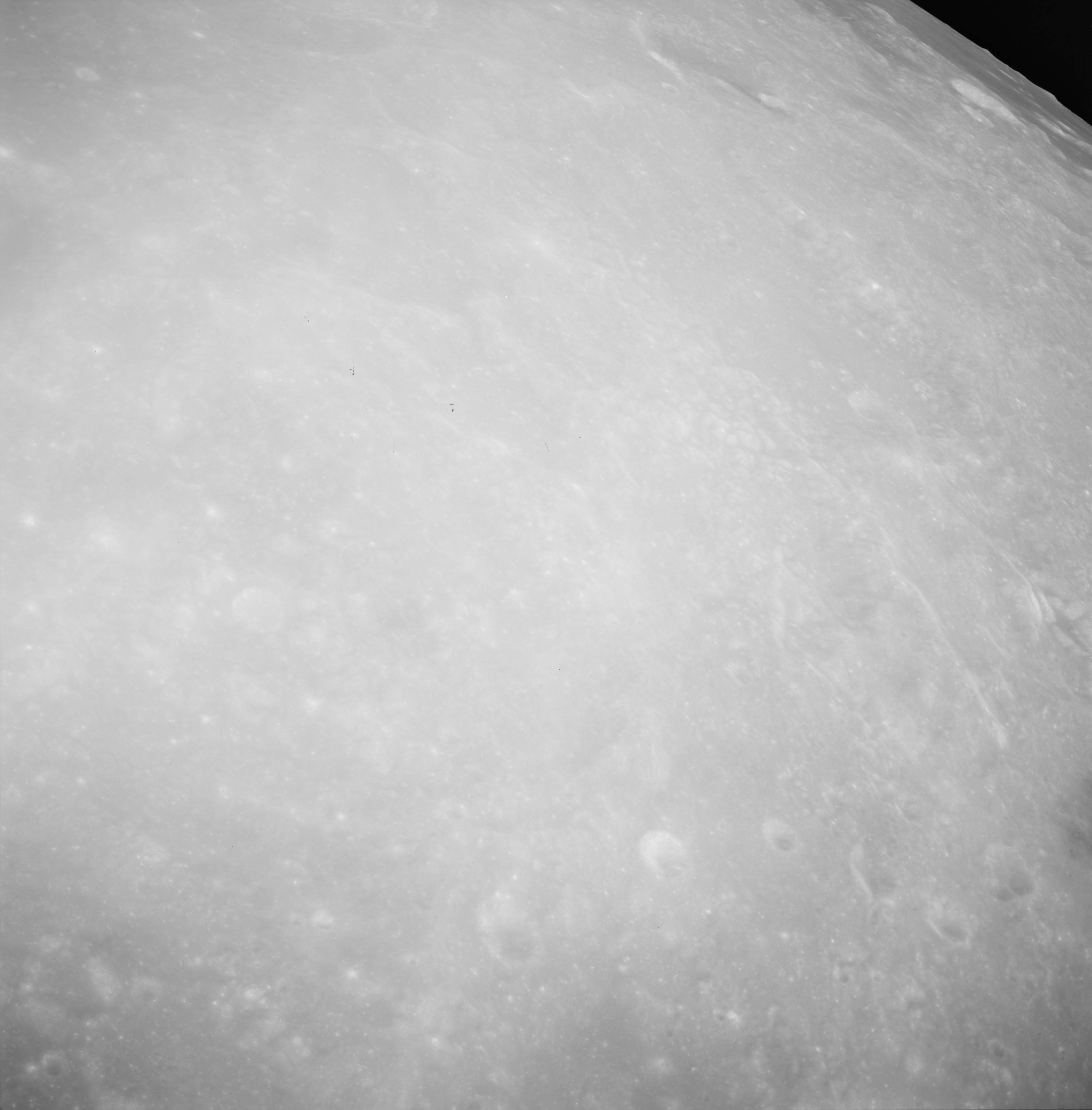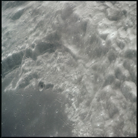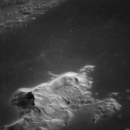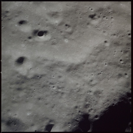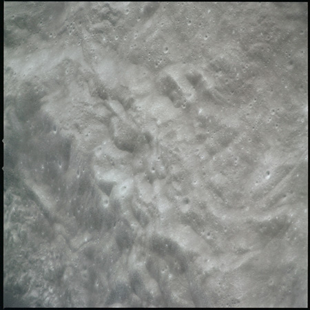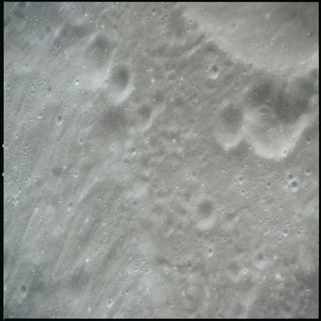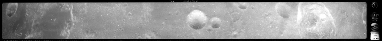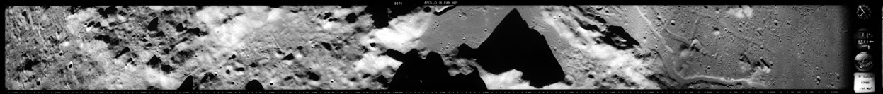 Compensation for the motion of the spacecraft is provided by the V over H sensor which detects the rate at which surface detail moves across the camera's field of view, generating a signal that controls the compensating movement of the film. This allows the camera to achieve a resolution of better than 2 metres from the nominal orbital height of 110 km. On this, its first flight to the Moon, this sensor will not operate properly, degrading the quality of the imaging by introducing a small degree of smearing. The camera is used during 11 orbits and 1,529 usable photographs are obtained on the 2-km roll of Kodak EK-3414 film contained in a cassette of 25-kilograms mass which Al will retrieve later in the mission. Journal Contributor Brian Lawrence has more to add on the camera's pedigree.