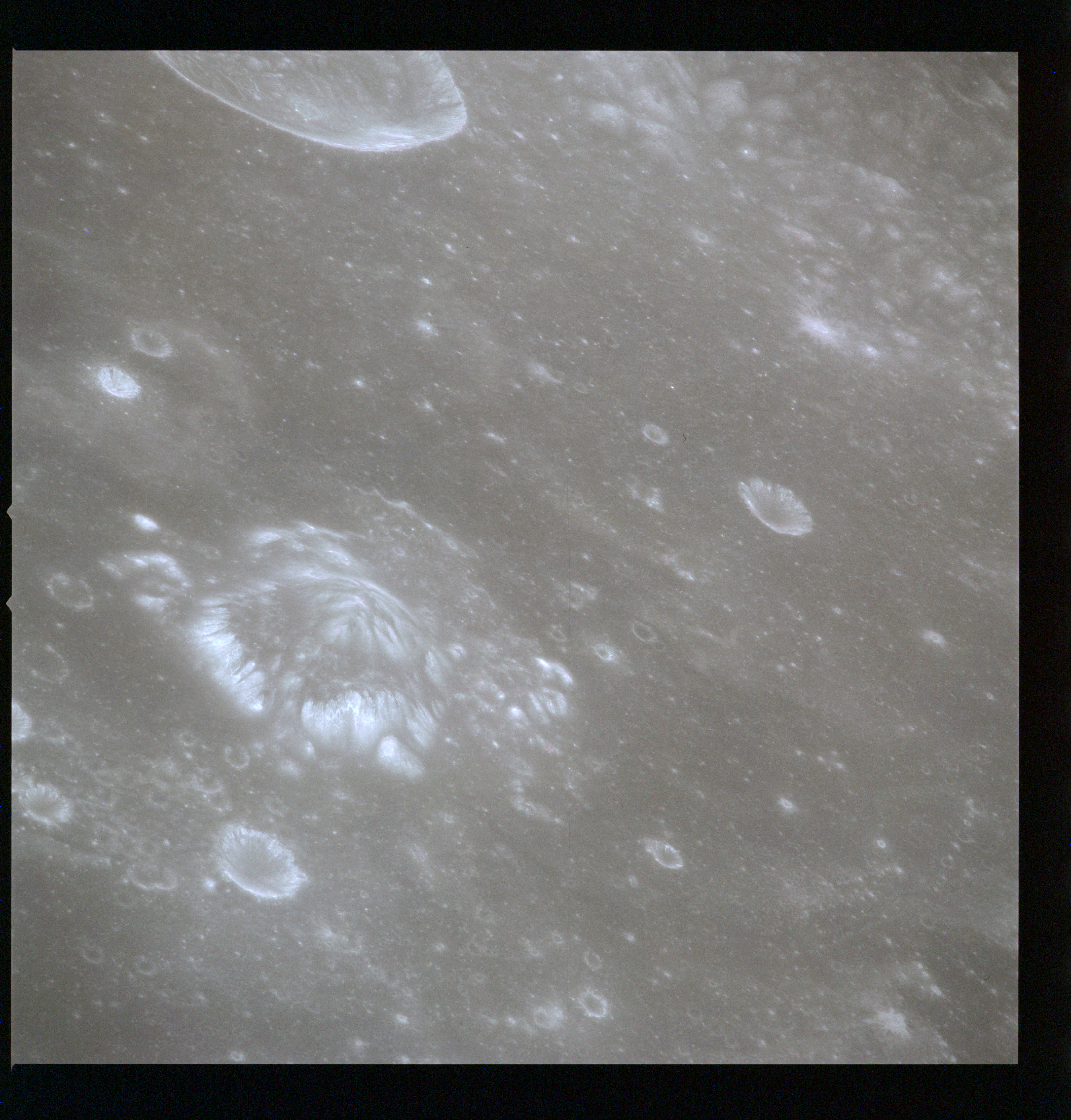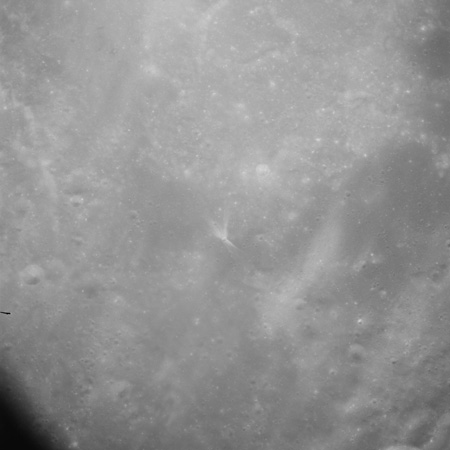This spectacular photo of a rayed crater manages to display virtually the entire ray system. The result of a relatively recent impact, this feature illustrates the transition from the continuous to the discontinuous ejecta blanket. This transition is roughly two crater diameters out but is irregular and lobate in shape. The light colour of the ray material is due to the highly shocked and fractured nature of the ejected rock. Time, and the irradiated environment of the Moon will eventually darken this material to match its surroundings. Consider that every other crater in this photograph, from the truly ancient and barely visible depressions to the more recent, neat bowls peppering the landscape, once was graced with a similar stunning ray system.