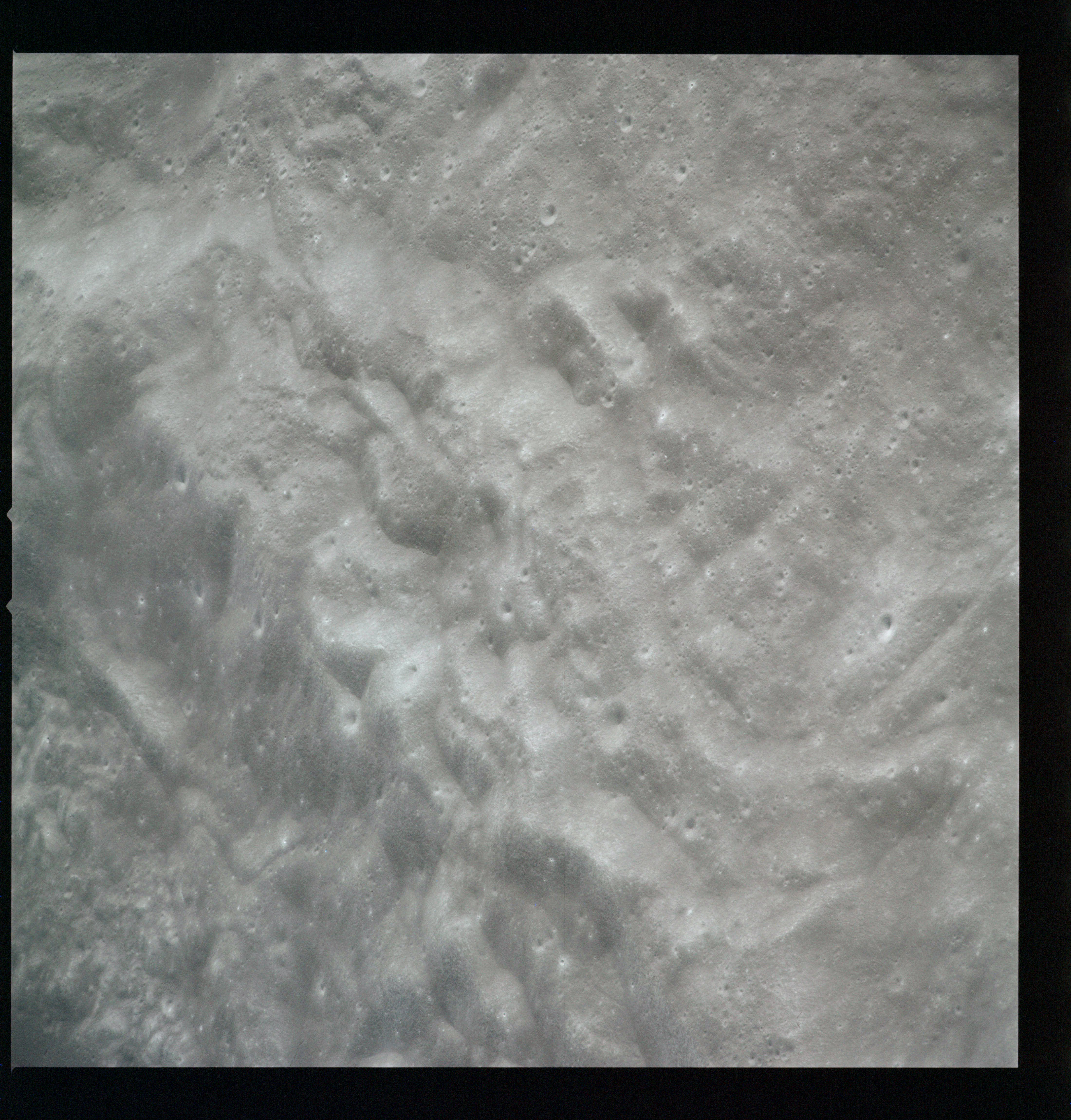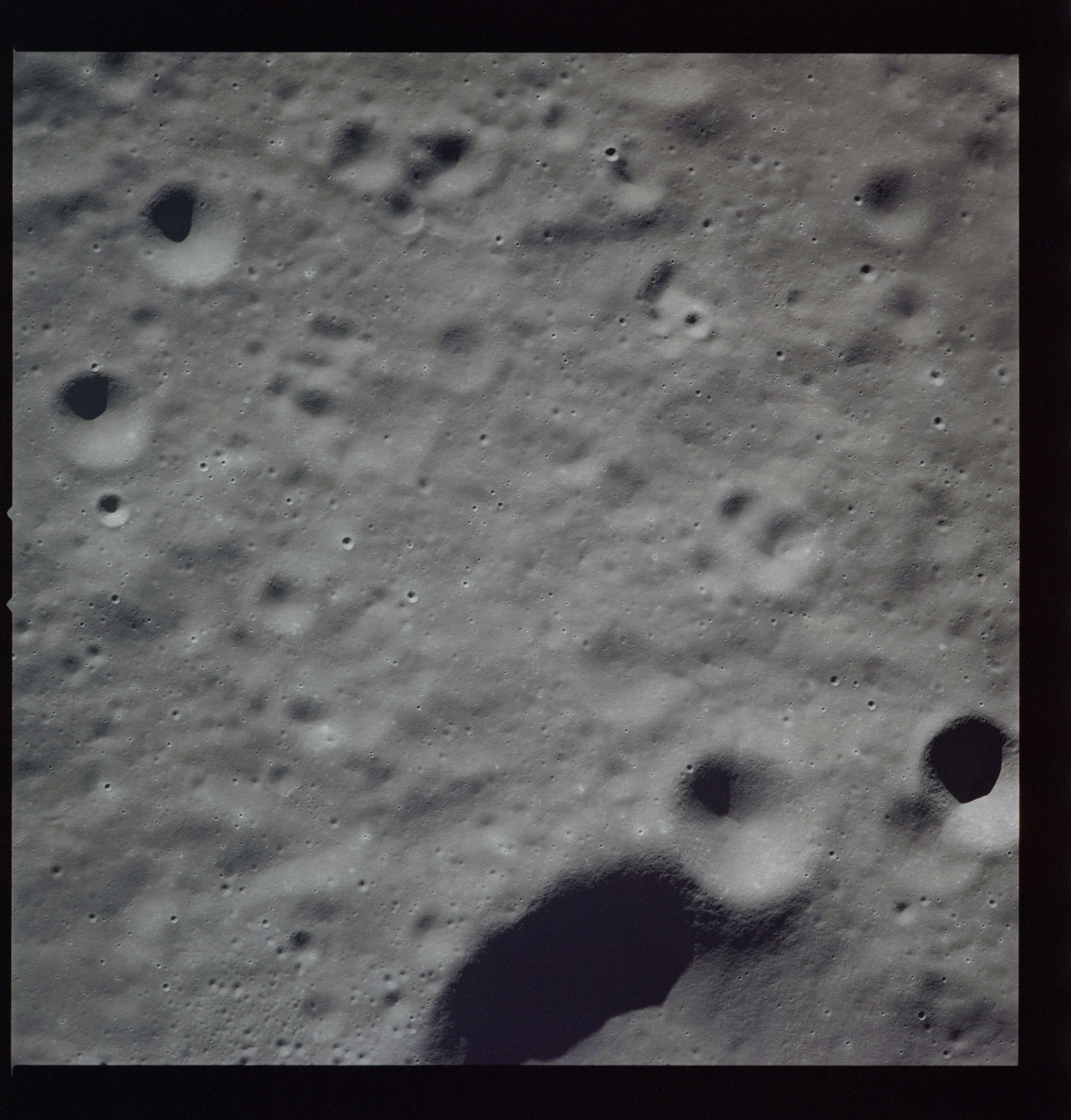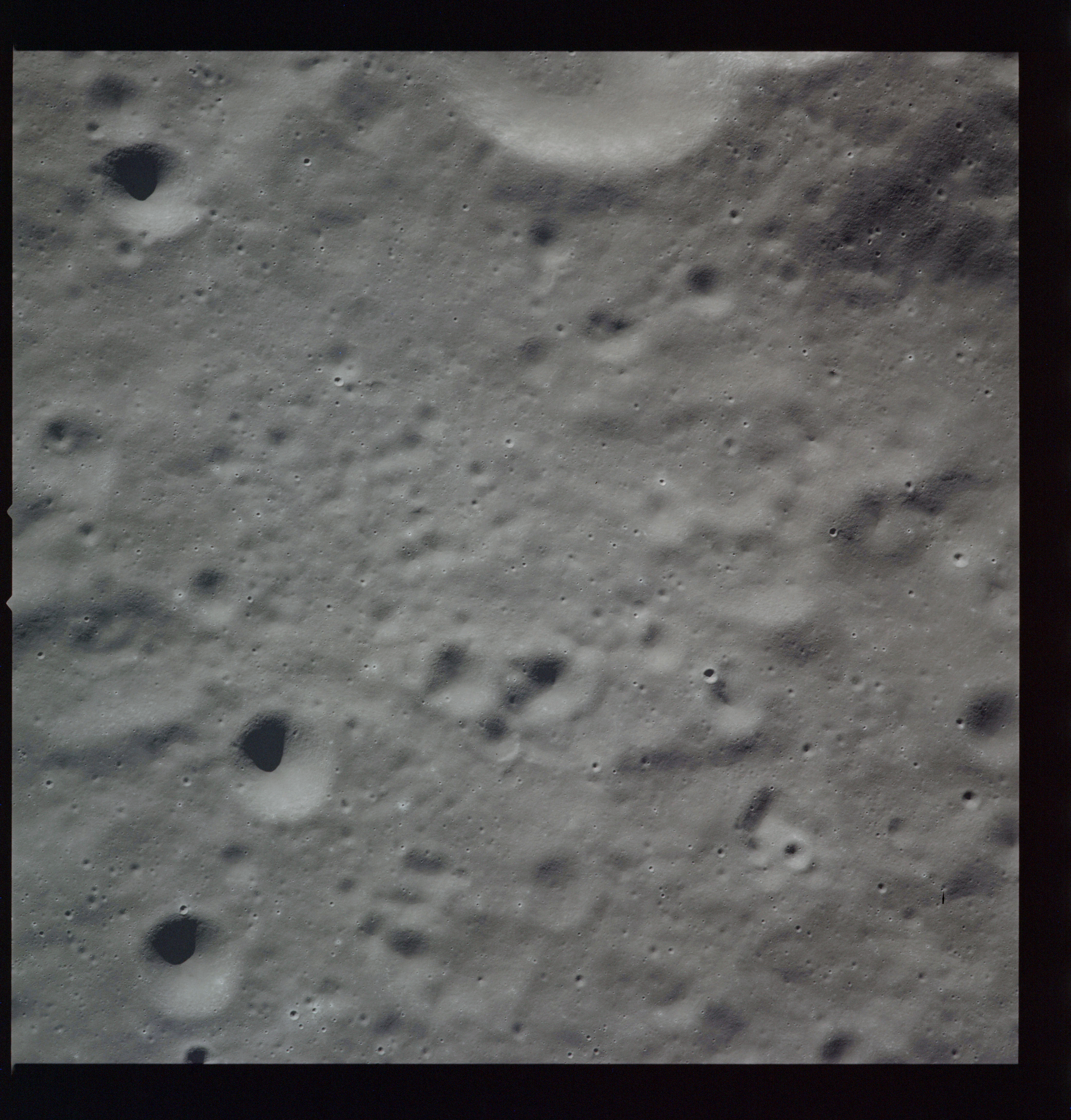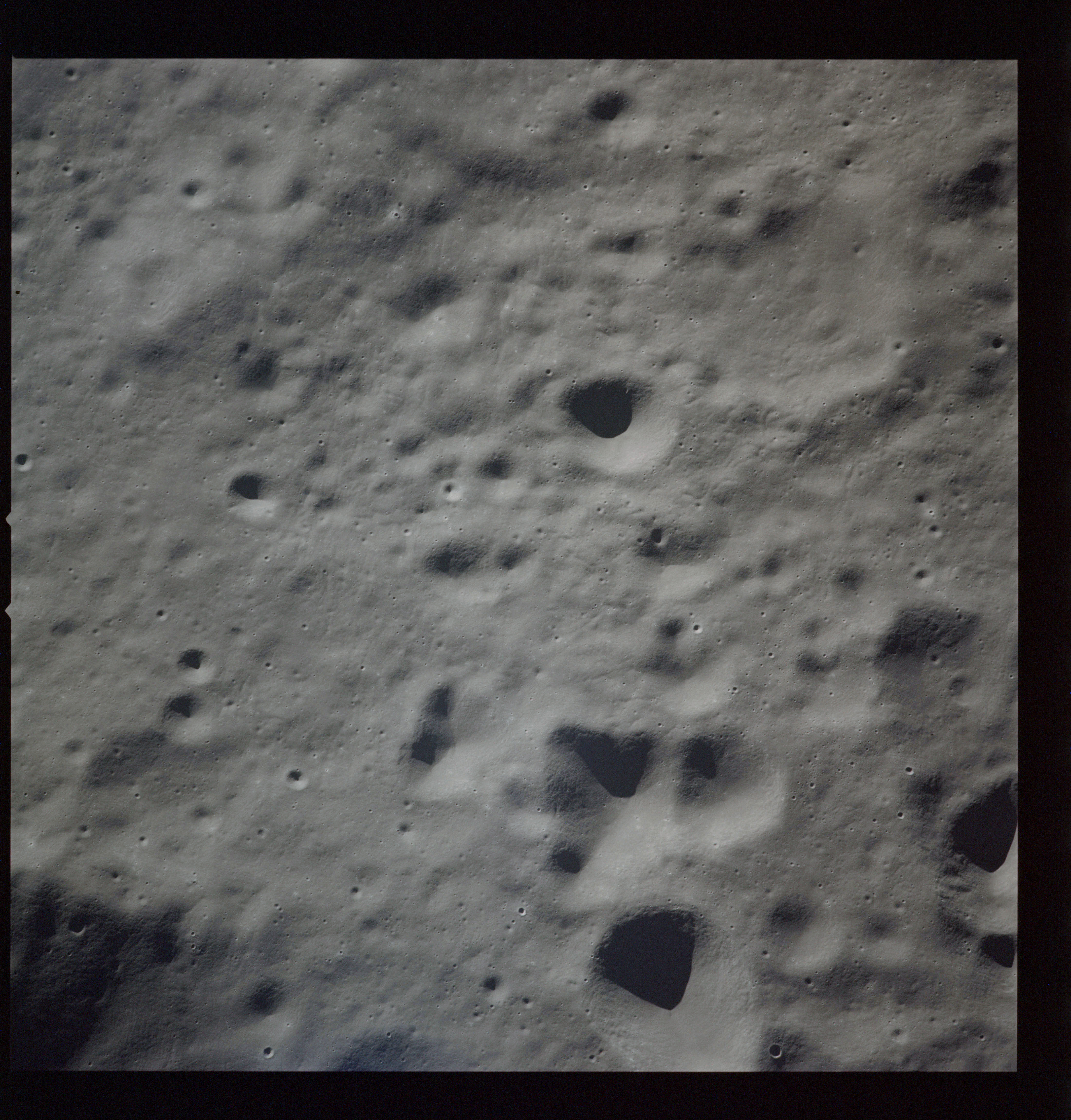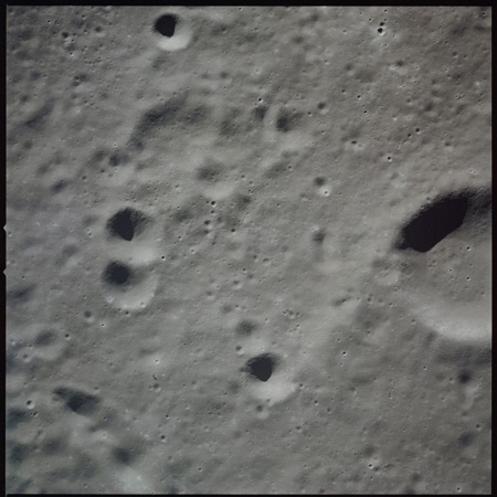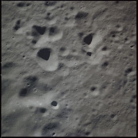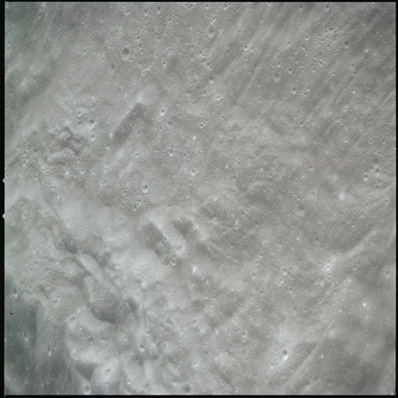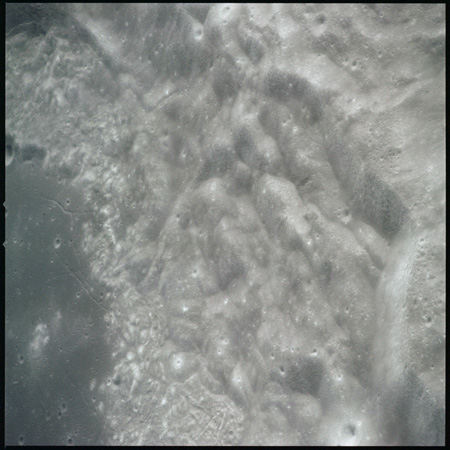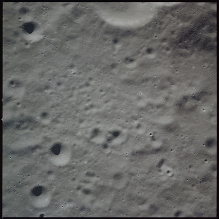 Al continues his photography as Endeavour crosses the floor of Gagarin. This composite of AS15-97-13140 to 13152 shows the rough floor of Gagarin where the debris blankets flung in from distant craters are pockmarked by smaller craters, old and new.