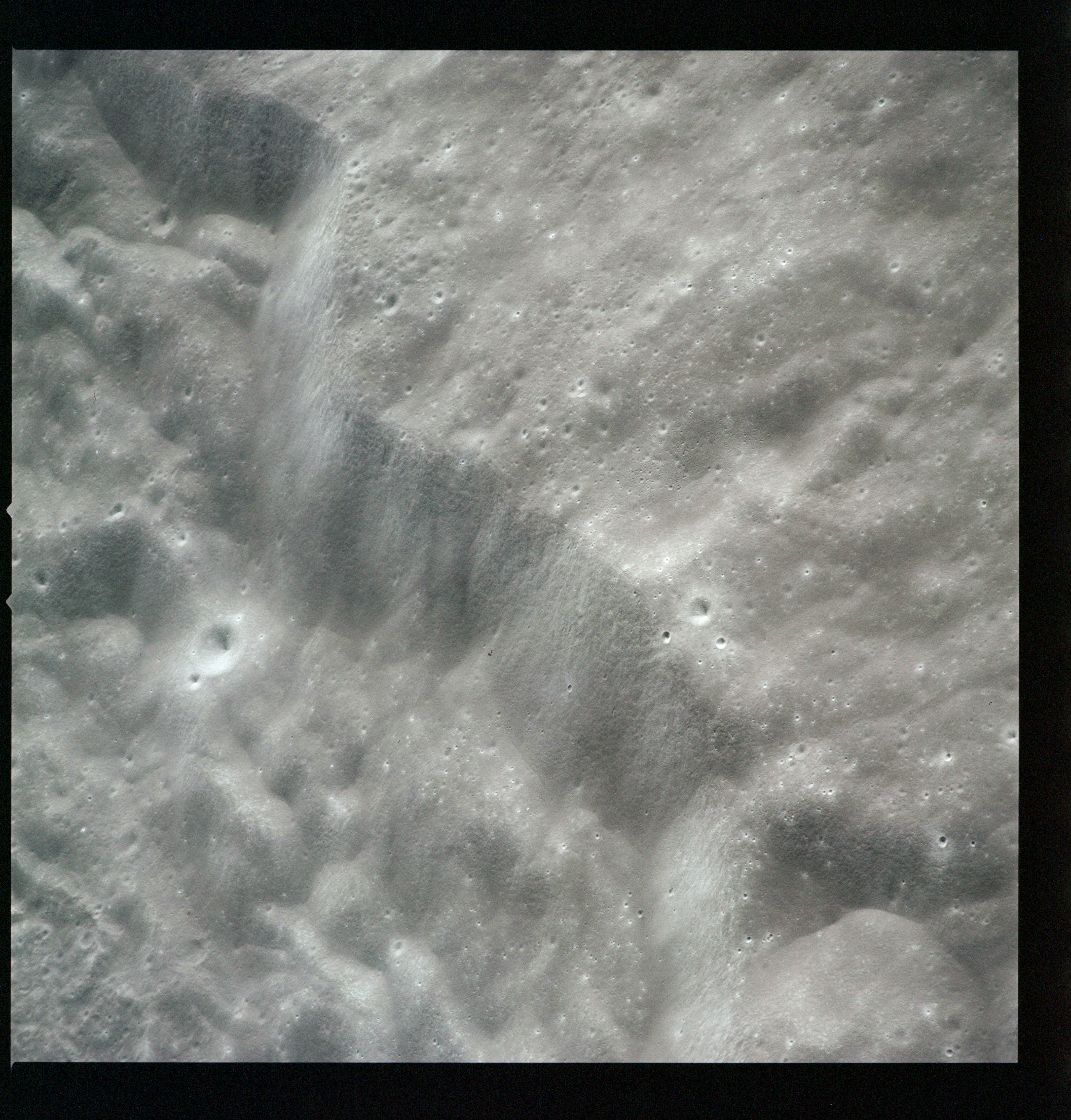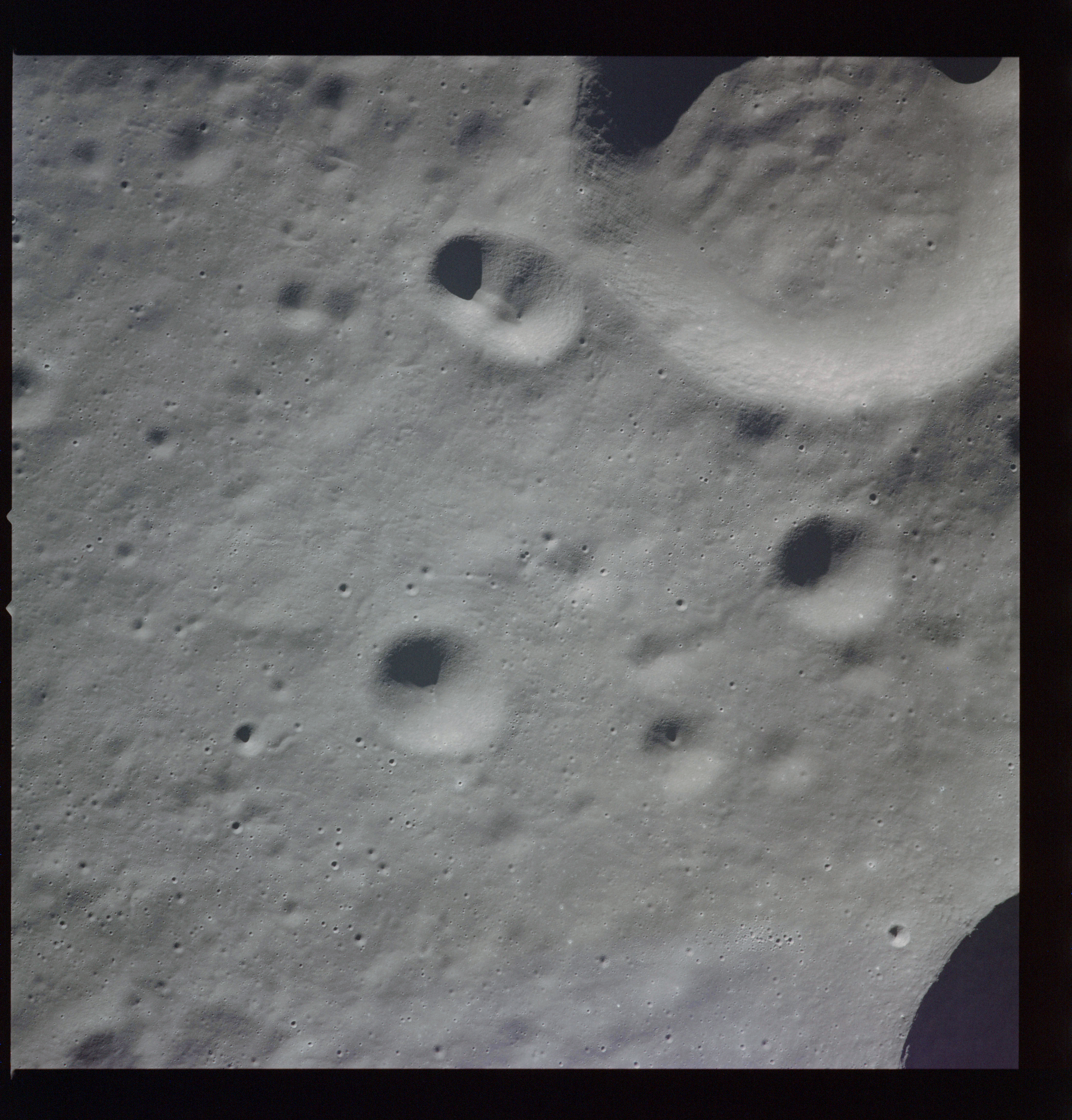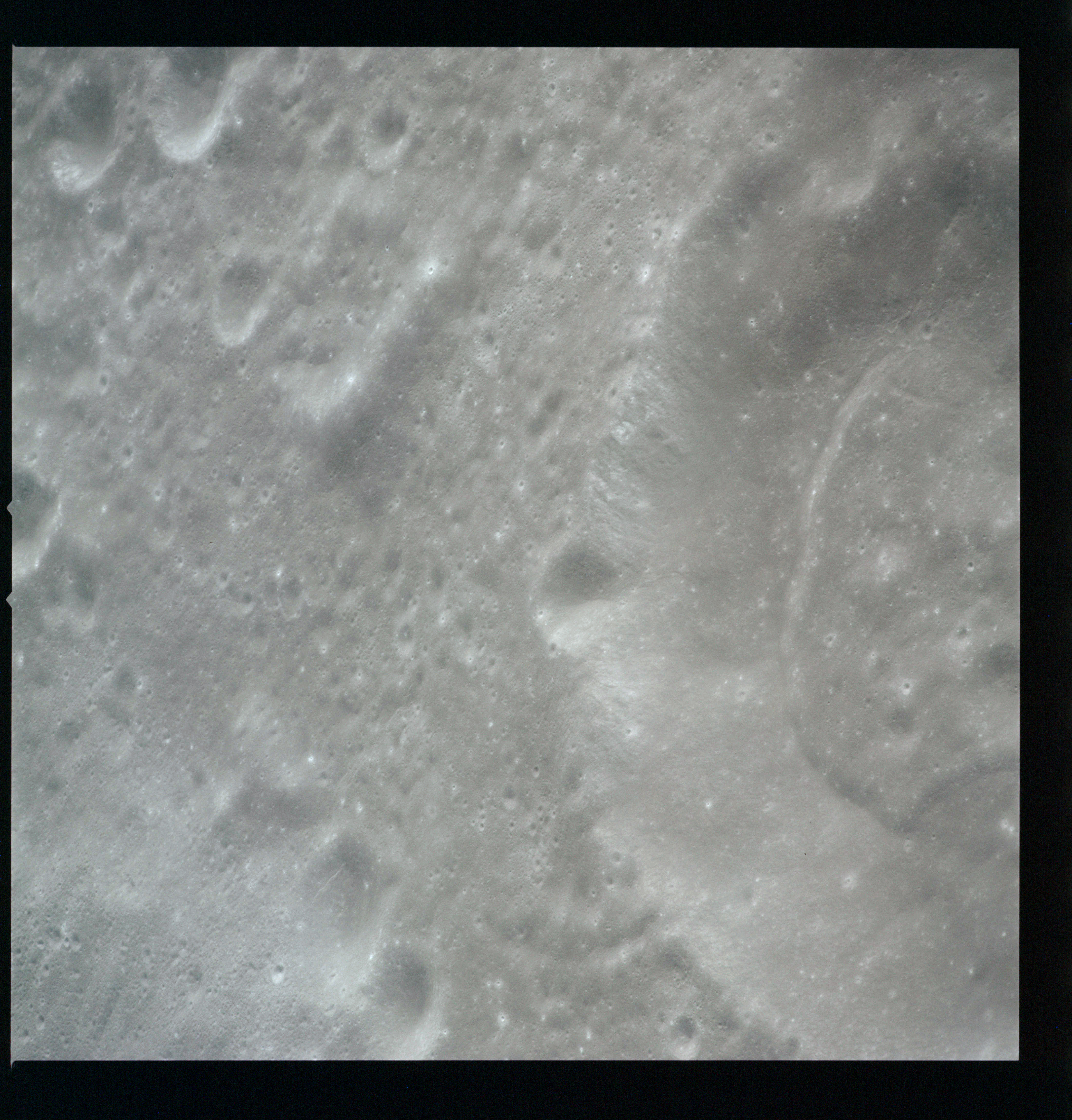 Al's next target for the Hasselblad is Tsiolkovsky; first pointed out by the crew soon after they settled into lunar orbit at 083:16:41 GET. First, he gets the Mapping and Panoramic Cameras going, then takes AS15-97-13157 to 13168, 12 frames taken, out of the planned 28, showing the crater and its northwest hinterland. The first three in this series AS15-97-13157 to 13159, combined here into a composite image, show the steep slopes of the crater's eastern rim with the slumped terrain below.