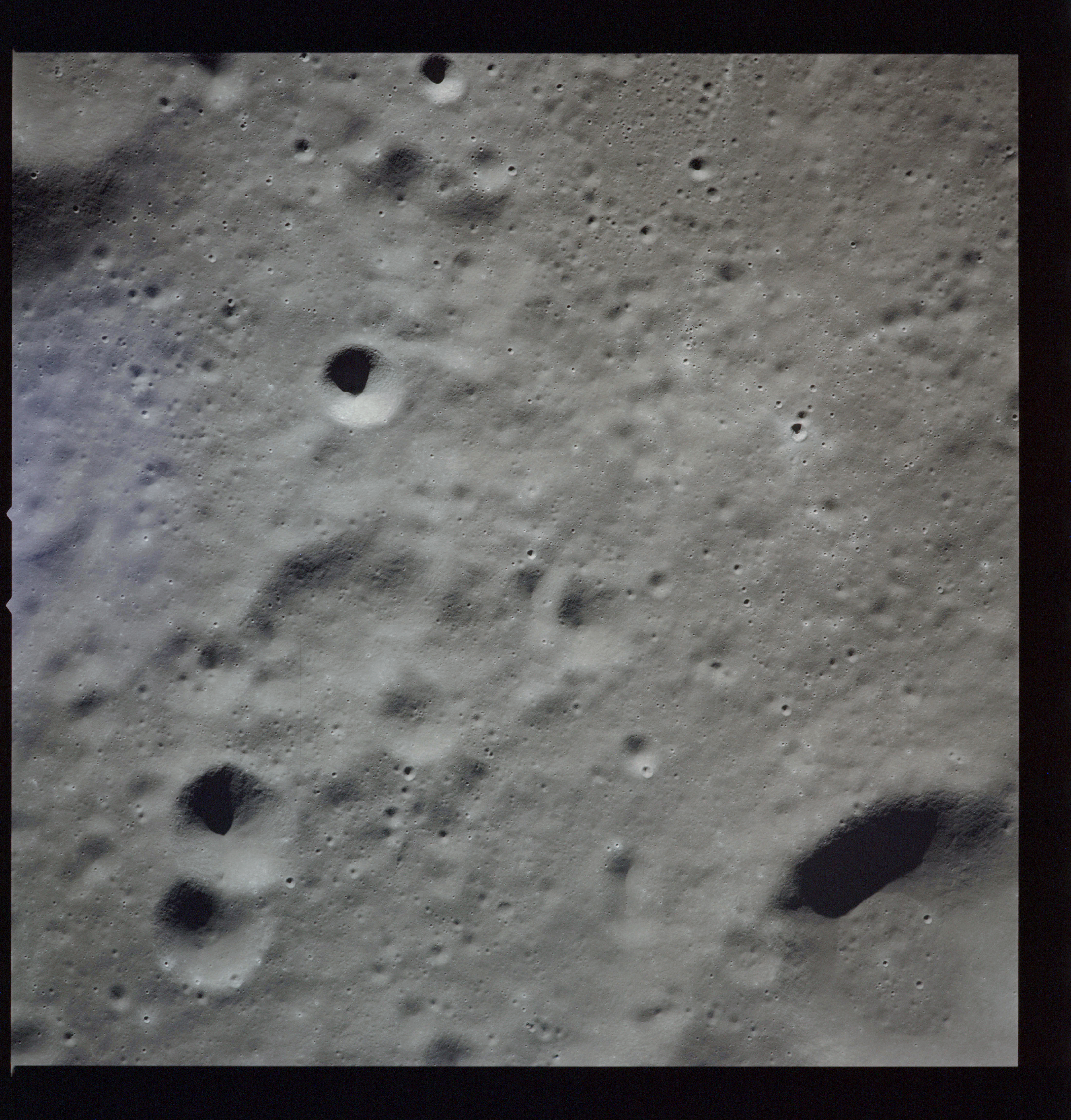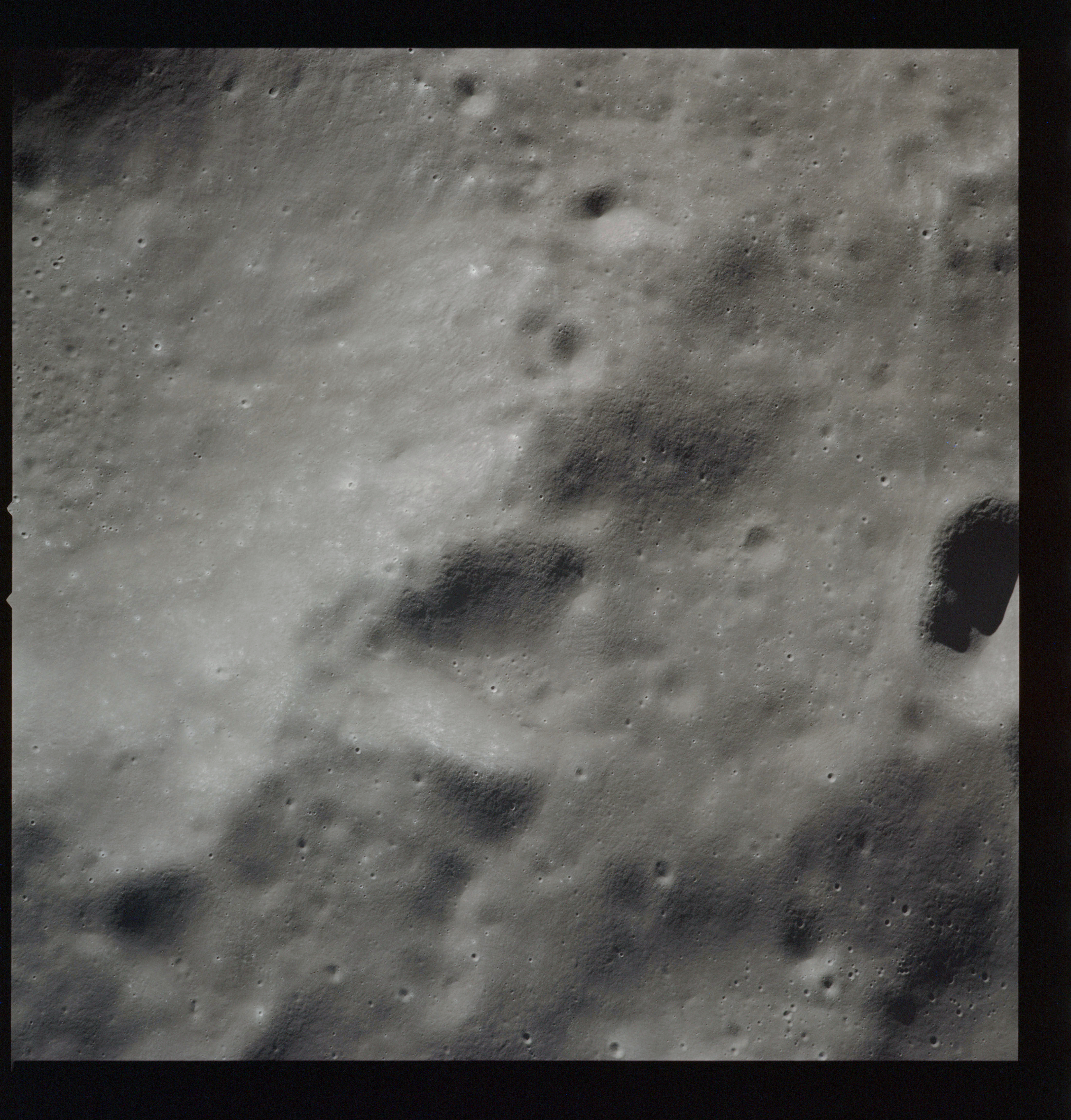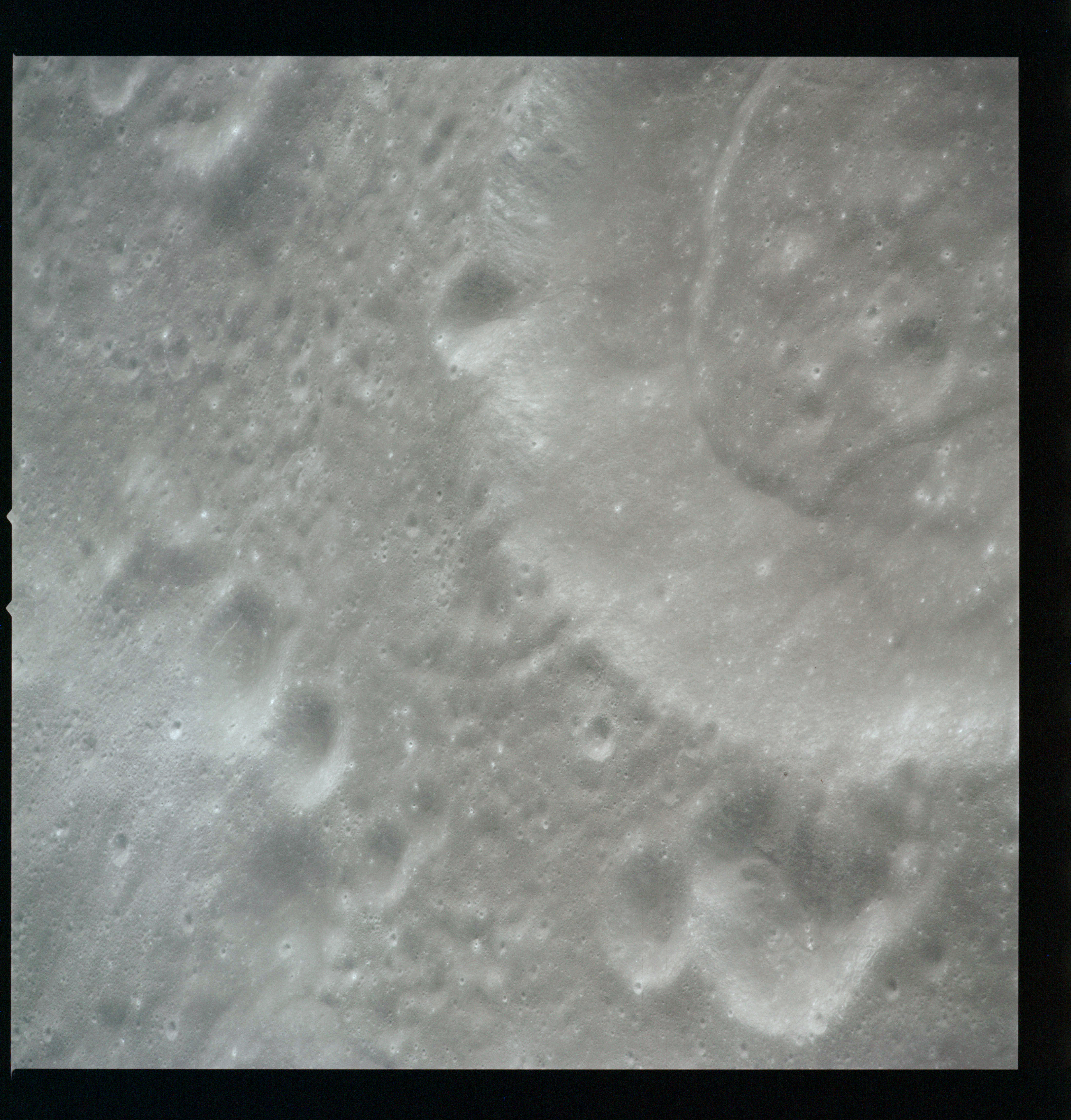 Al's next target for the Hasselblad is Tsiolkovsky; first pointed out by the crew soon after they settled into lunar orbit at 083:16:41 GET. First, he gets the Mapping and Panoramic Cameras going, then takes AS15-97-13157 to 13168, 12 frames taken, out of the planned 28, showing the crater and its northwest hinterland. The first three in this series AS15-97-13157 to 13159, combined here into a composite image, show the steep slopes of the crater's eastern rim with the slumped terrain below.