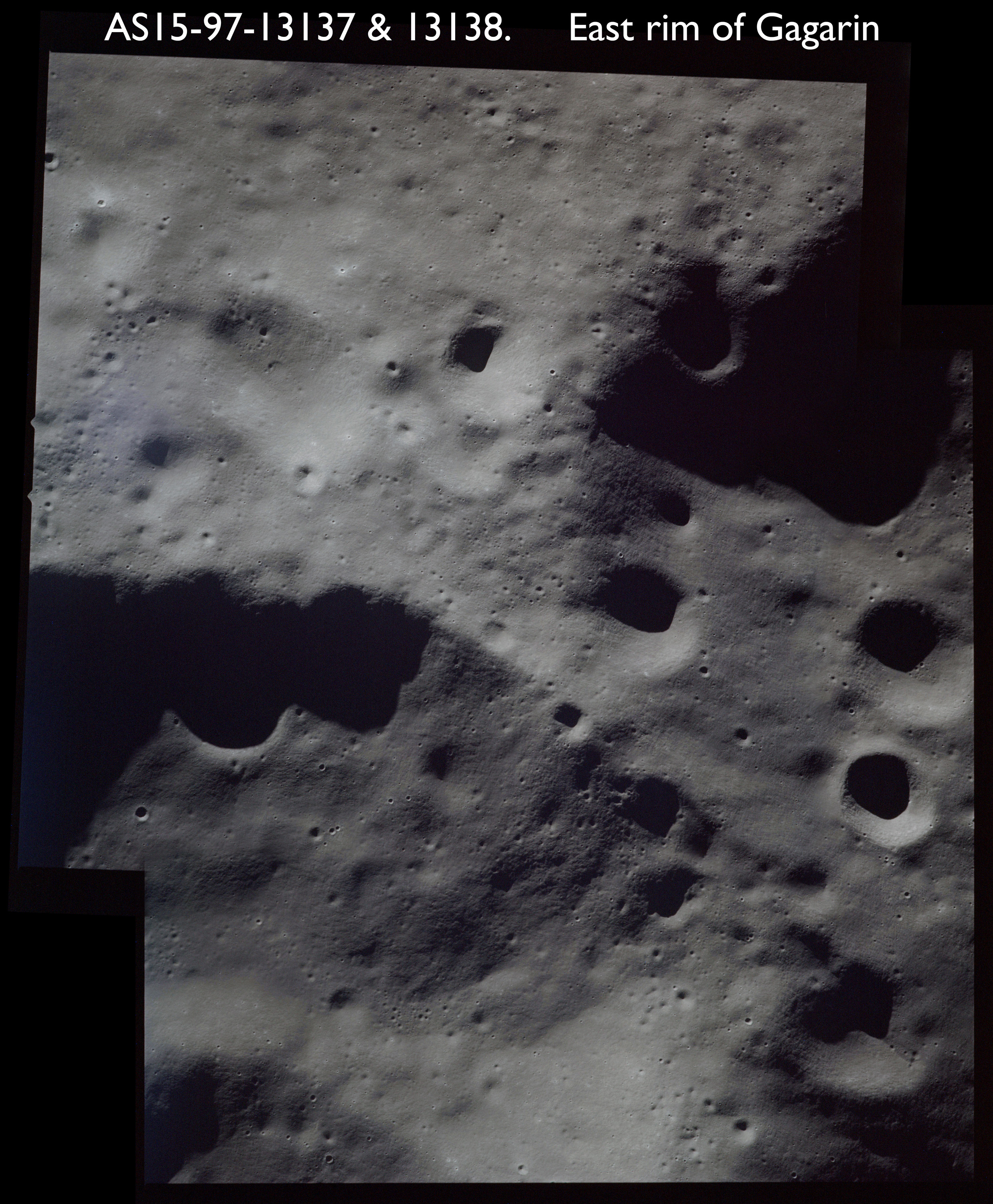 AS15-97-13137 and 13138 composited - Gagarin's eastern rim - Source images by NASA/Johnson Space Center.
