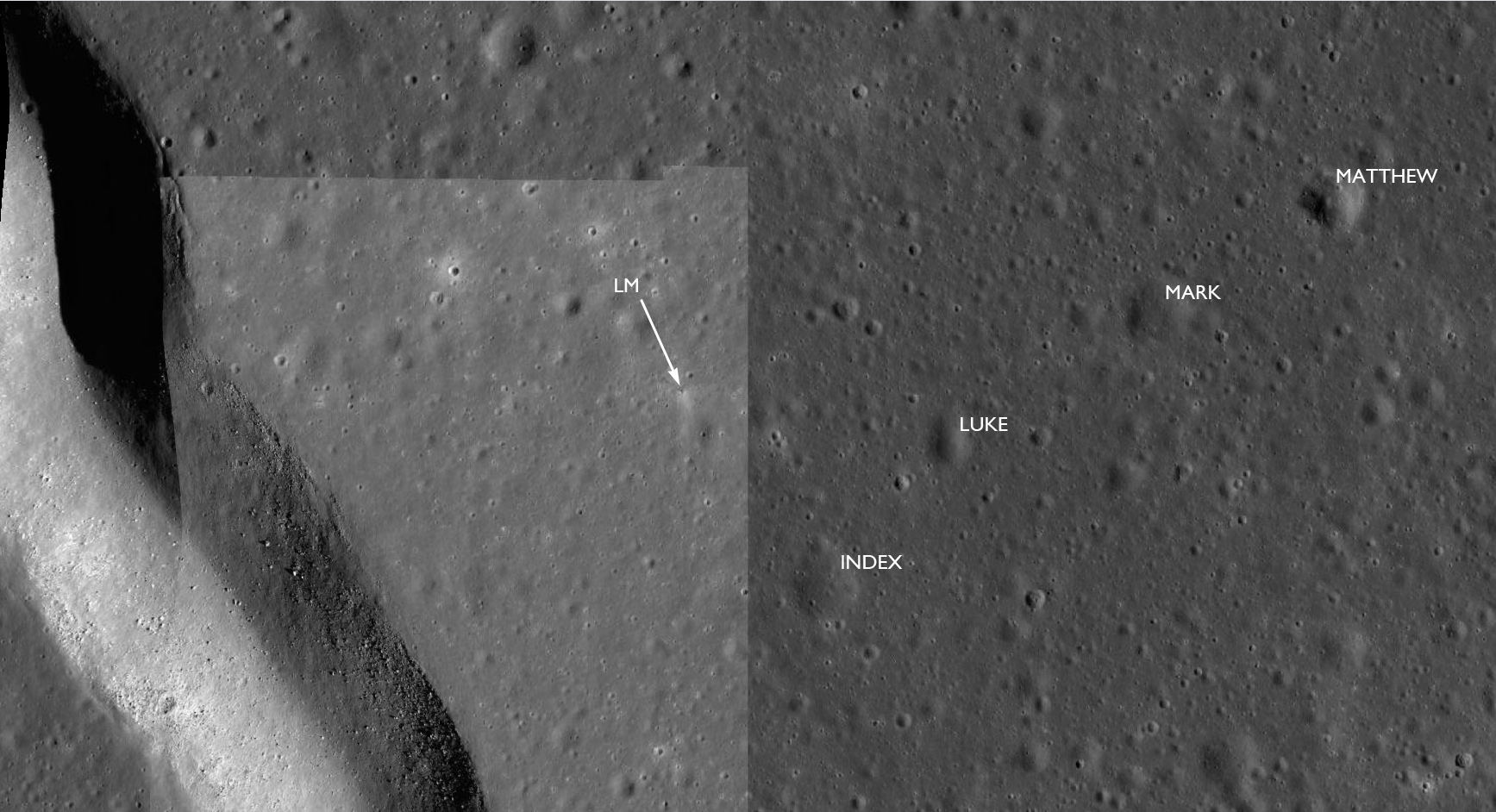 The first two images, AS15-97-13137 and 13138, composited here, along with 13139, show a small region of the crater's eastern rim.