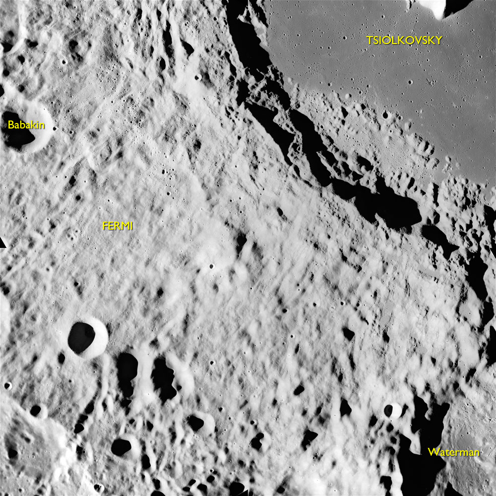 AS15-M-1715 - Metric Camera image of the southwest rim of crater Tsiolkovsky, the northwest rim of crater Waterman and the floor of crater Fermi. Image taken at about 163:04. (250 megapixel version), (labelled version) - Image by NASA/ASU.
