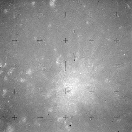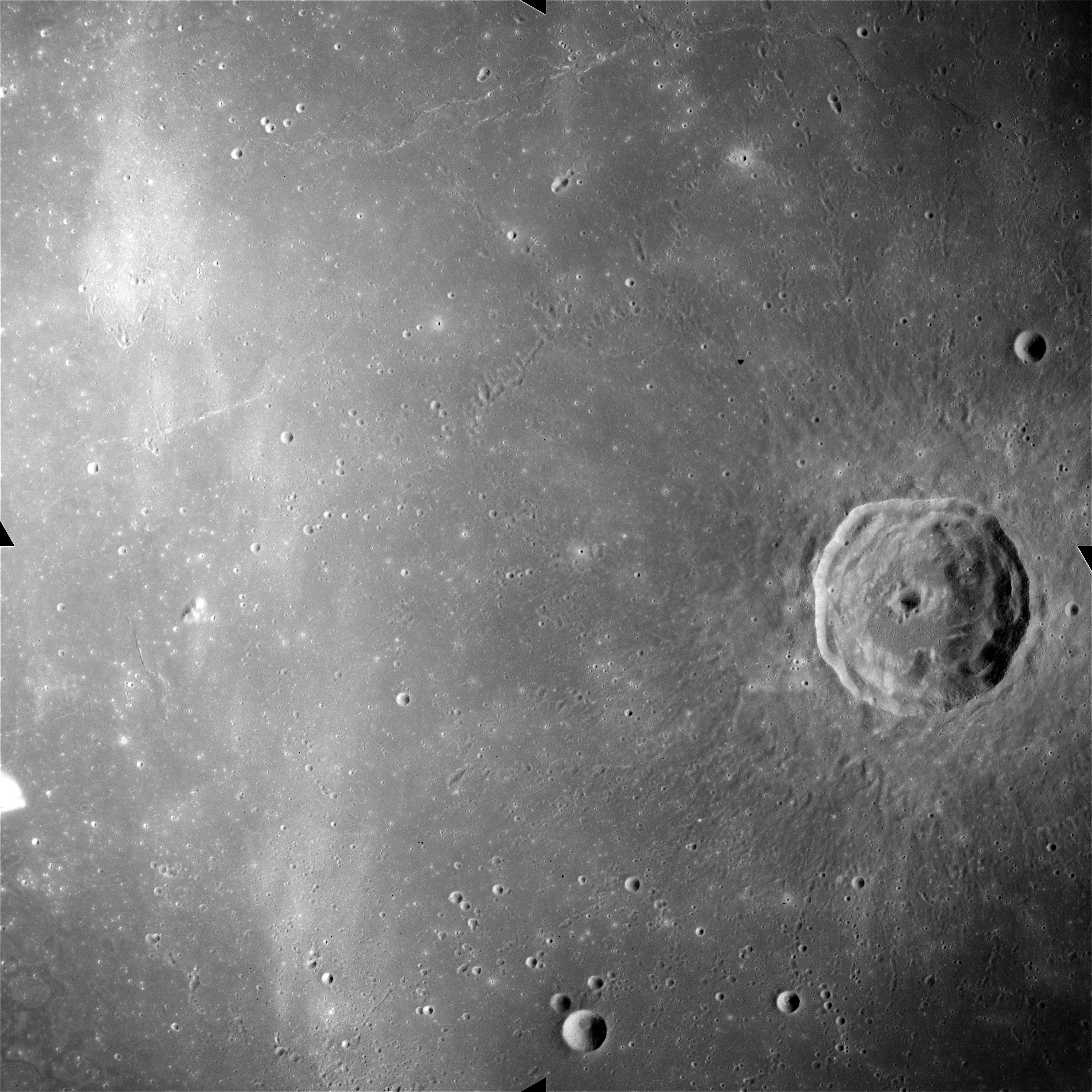 AS15-96-13050 is an oblique image of Aristarchus looking roughly north. Note the texture of the surrounding ejecta blanket and how it covers the southern basalt plain in the foreground indicating that the crater is younger than the mare. The terracing or slumping of the wall of this spectacular 40-km diameter, 3-km-deep feature is also well shown. The crater's name comes from the Greek astronomer, Aristarchus of Samos, c. 310-230 B.C.E., who is notable for professing that Earth rotates on its axis and that it revolves around the Sun.