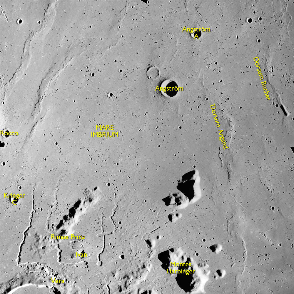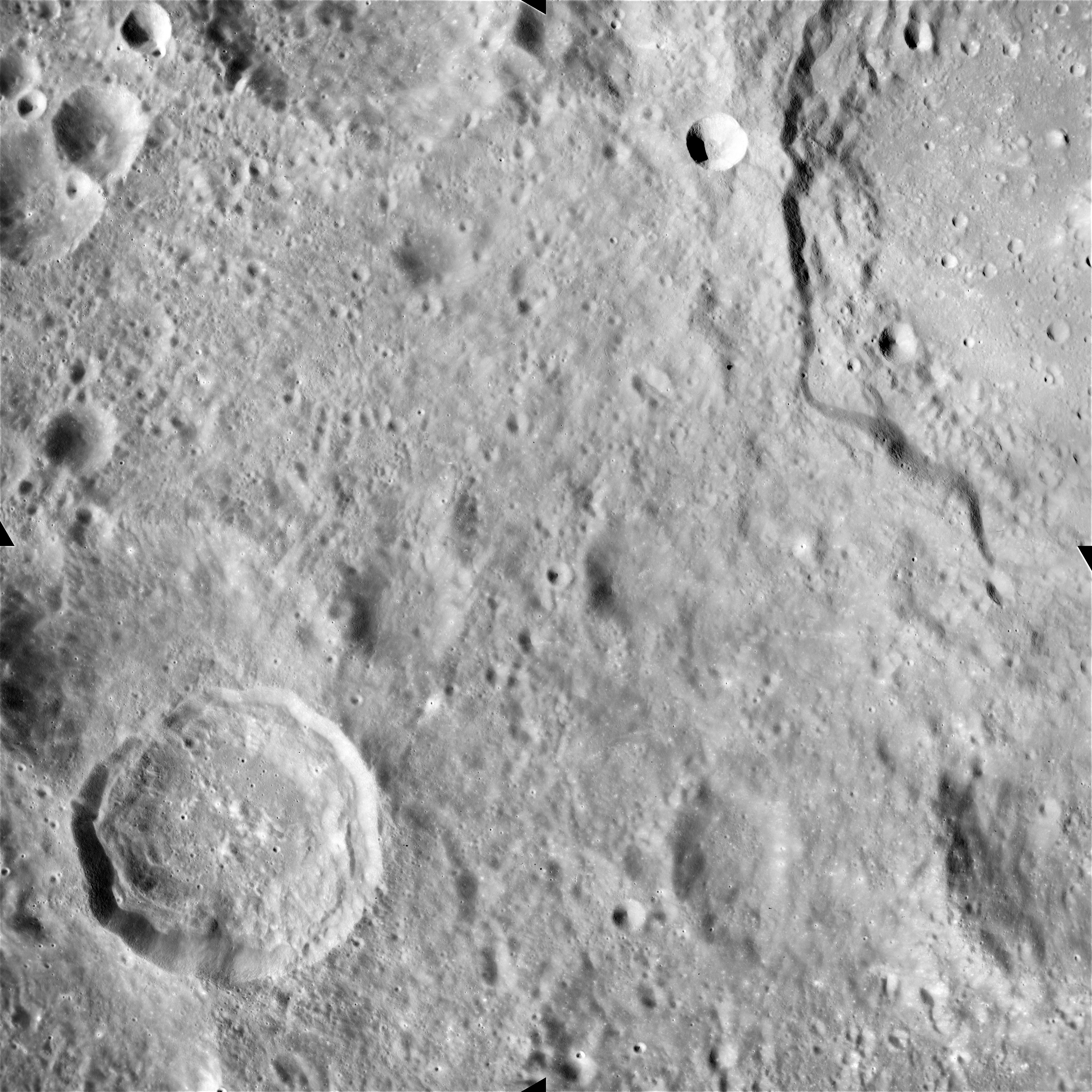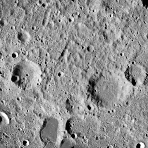 AS15-96-13042 and 13043 are of two rilles just east of the westernmost outcrop of Montes Harbinger. One of these rilles is bisected by an extraordinary depression somewhat like an elongated stadium. This may be a pre-existing crater chain which was inundated by the lavas that were delivered by the rille. 13043 includes a depression, Ivan, that is clearly the source of one of these rilles. Ivan is an example of the many small features on the Moon that have been assigned arbitrary male or female forenames rather than the more usual name of a deceased scientist.