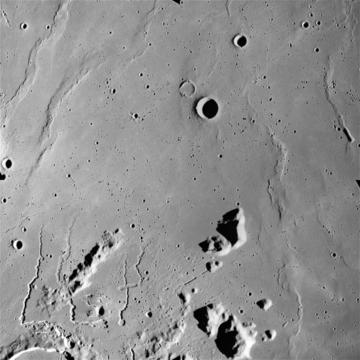 They have good reason to be concentrating on this region as it is one of the most spectacular on the Moon and one to which they will return later in the mission. Aristarchus itself is perhaps the brightest large crater on the near side and is visible with the naked eye, even in the gloom of Earthshine. It was formed about half a billion years ago on a large plateau that is the source of a great many sinuous rilles, large and small. These were cut by flowing lava in much the same way as Hadley Rille was formed, when they fed the expanse of Oceanus Procellarum surrounding the plateau. Often these rilles begin in crater-like bowl-shaped depressions, including the largest, Vallis Schröteri or Schröter's Valley. The landscape around Aristarchus is probably more than six times older than the crater itself.