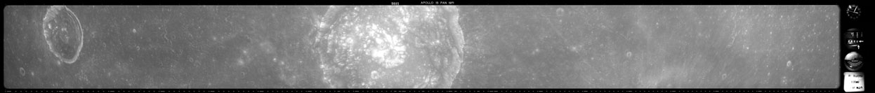 AS15-P-9940 - Panoramic Camera image of the Apennine Bench Formation. Crater Archimedes is at the extreme right (north). Mare Imbrium is at the extreme left (south). This image exhibits brightness variations due to a problem with the slit-based exposure mechanism. A 385 megapixel PNG format version can be had from the ASU Apollo Image Archive - Image by NASA/ASU.