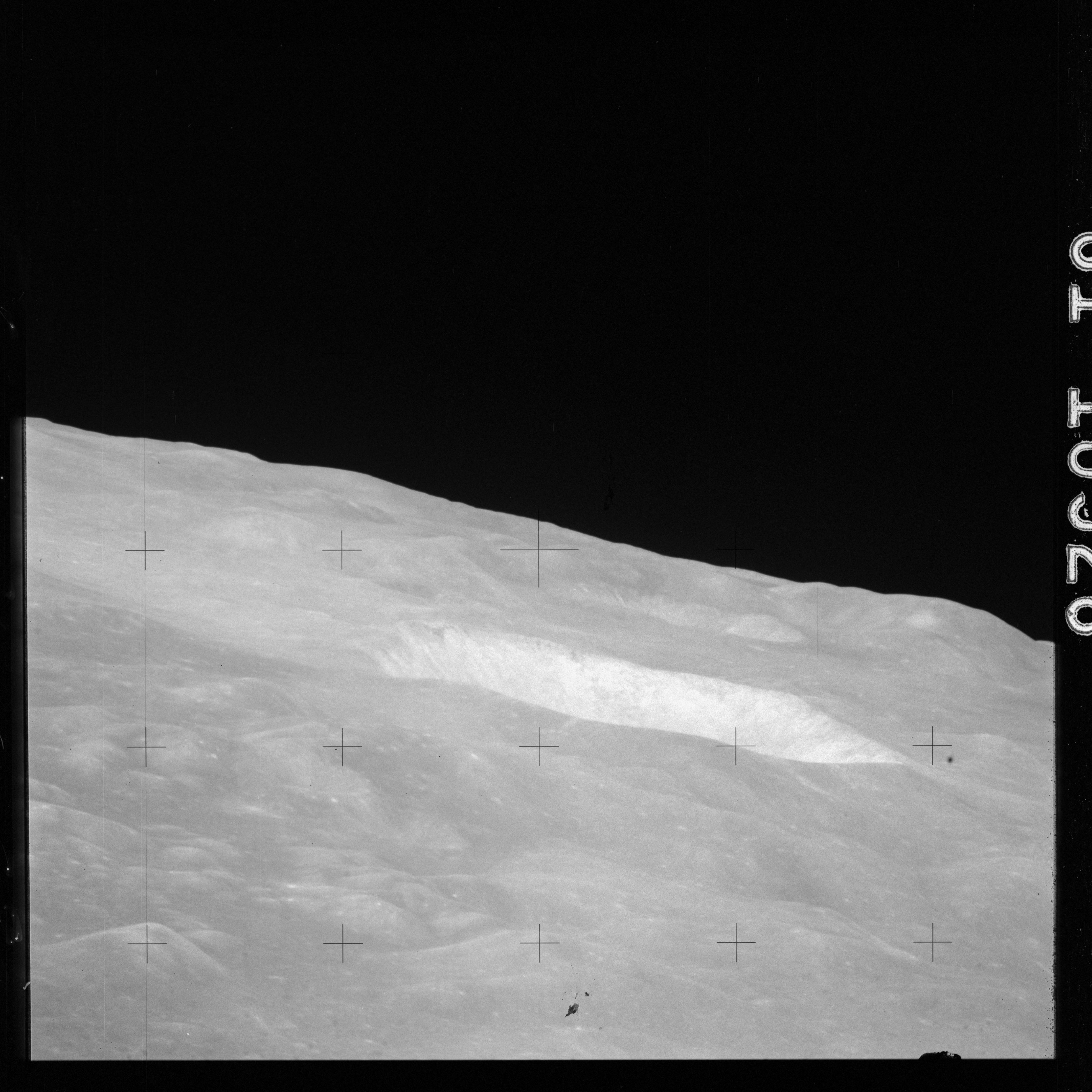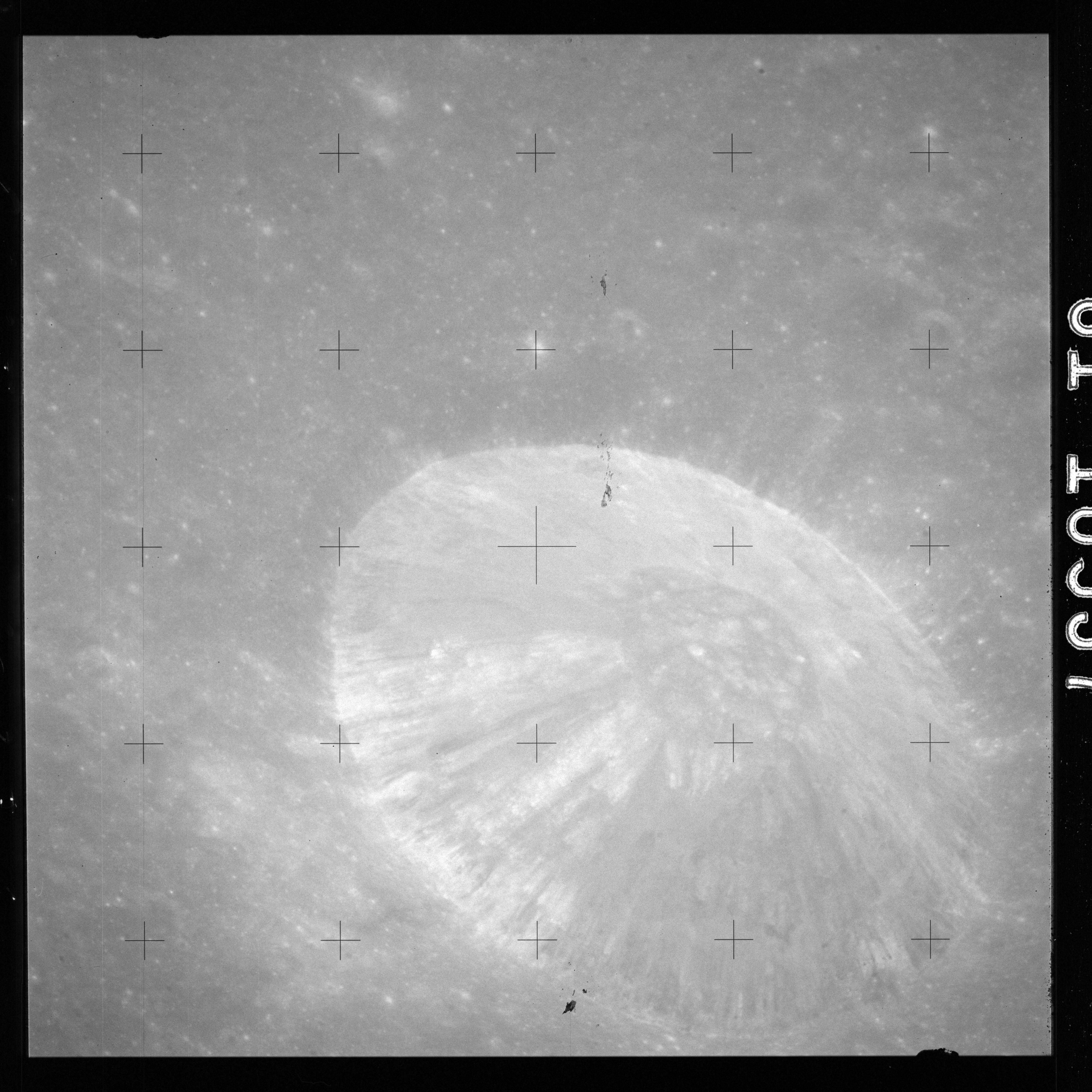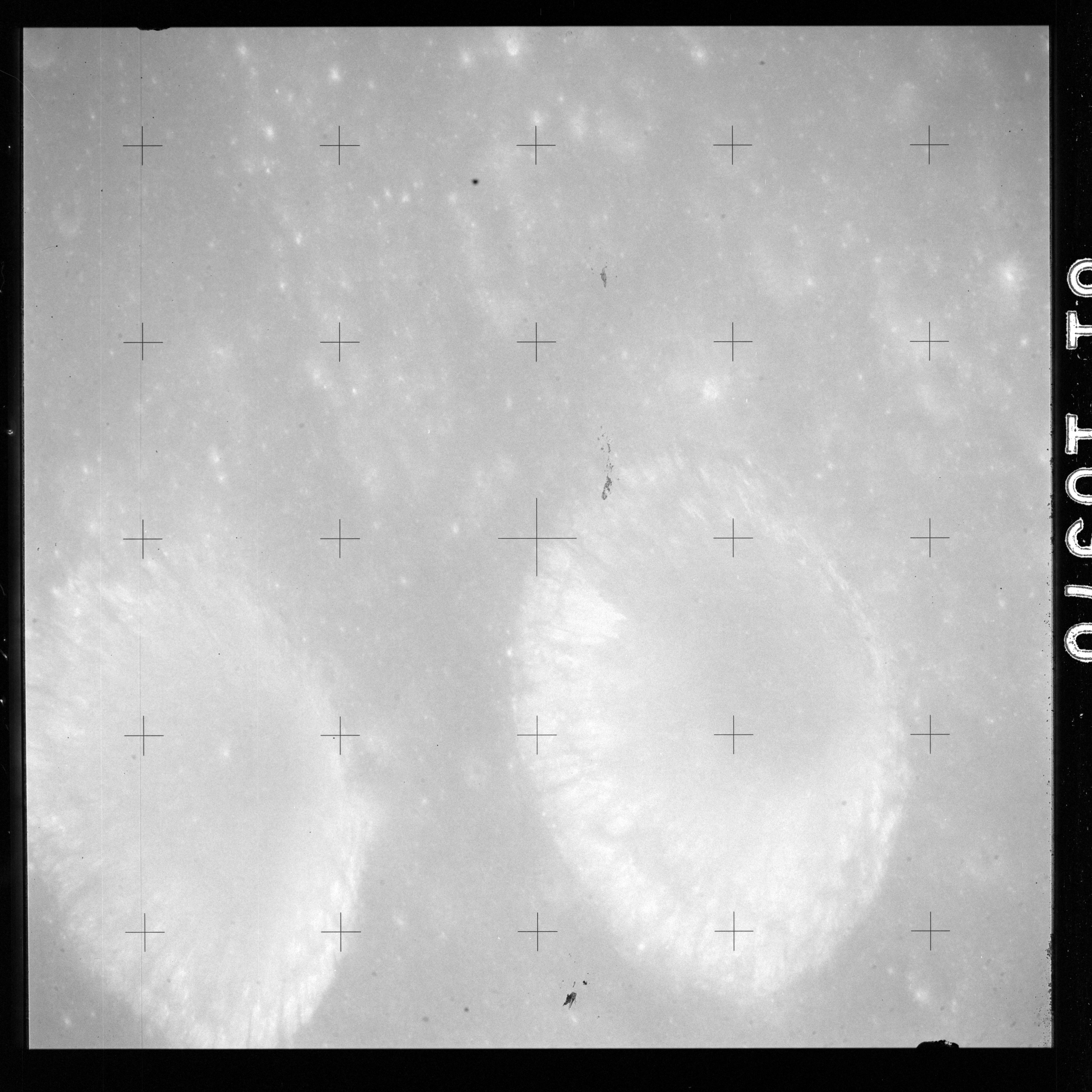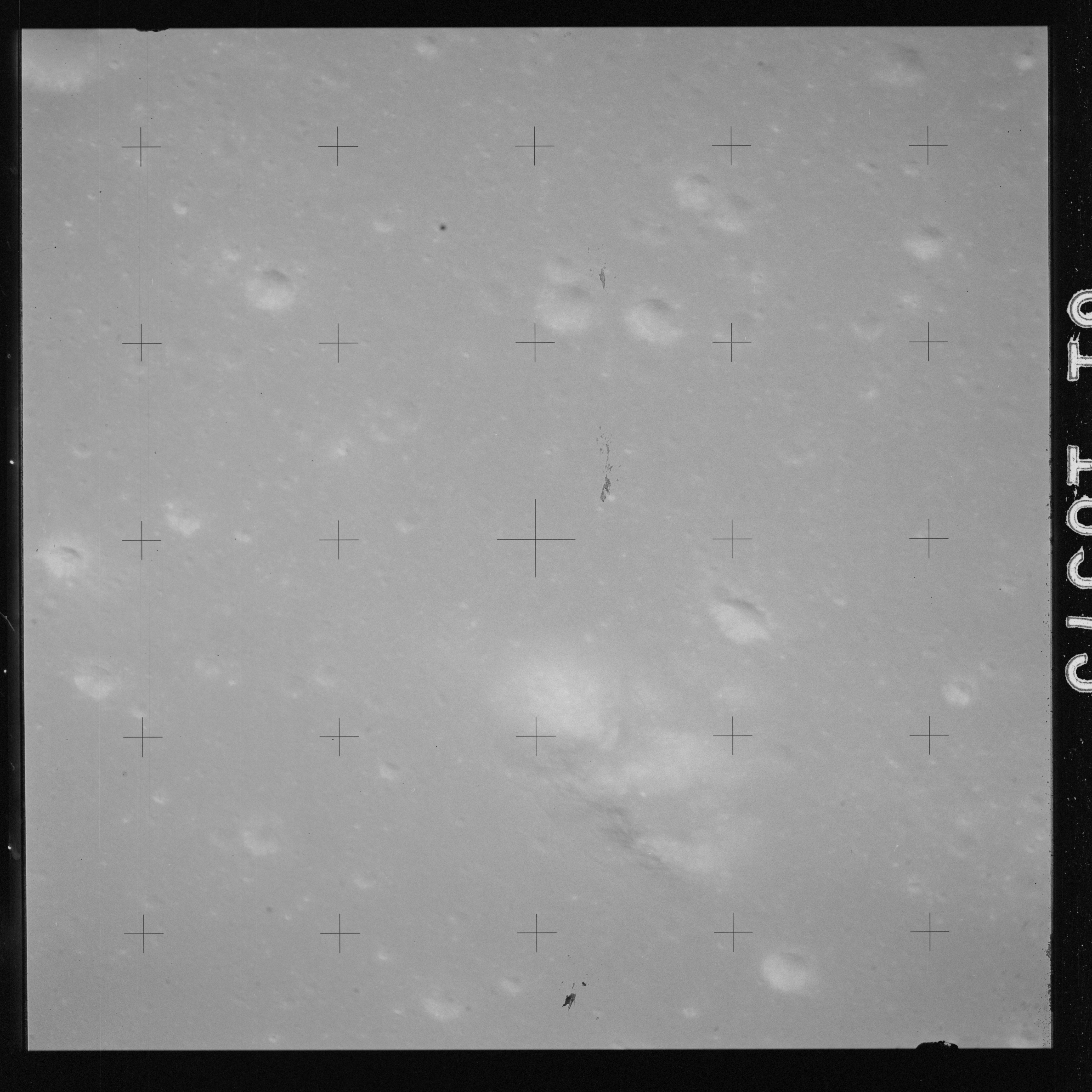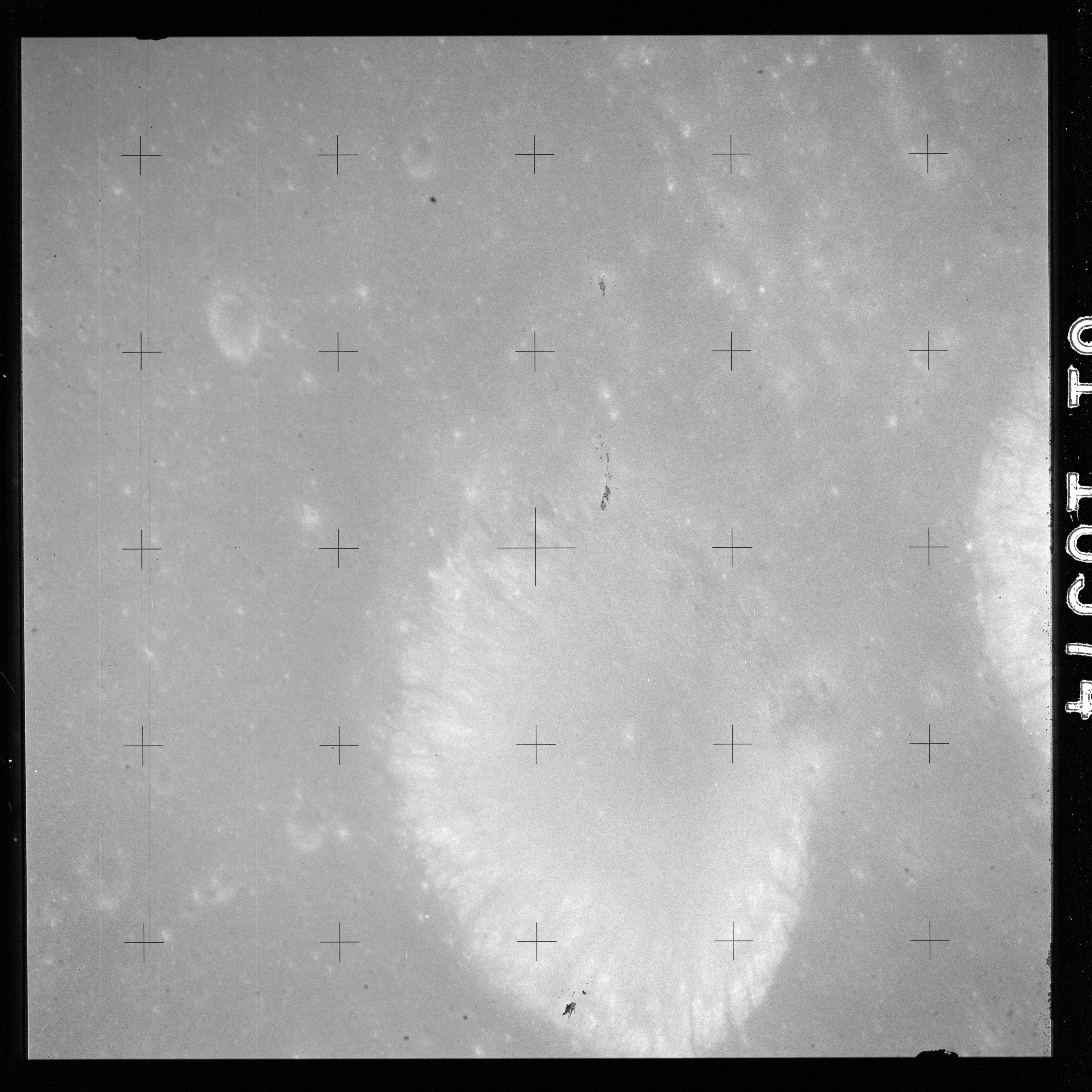 They have two Hasselblad cameras in use. One has a Réseau glass plate fitted which imprints crosses on the photographs for photogrammetry purposes. It has magazine QQ attached loaded with black and white film adn its current lens is a 500-mm telephoto. The other camera has magazine O with colour film (Ektachrome) and a 250-mm medium telephoto lens. It has no Réseau plate fitted. During a sequence of 19 images taken with the latter combination just before AOS, AS15-97-13175 to 13193, they will photograph target number 10 as given in the Flight Plan, the ancient 130-km crater Sklodowska.