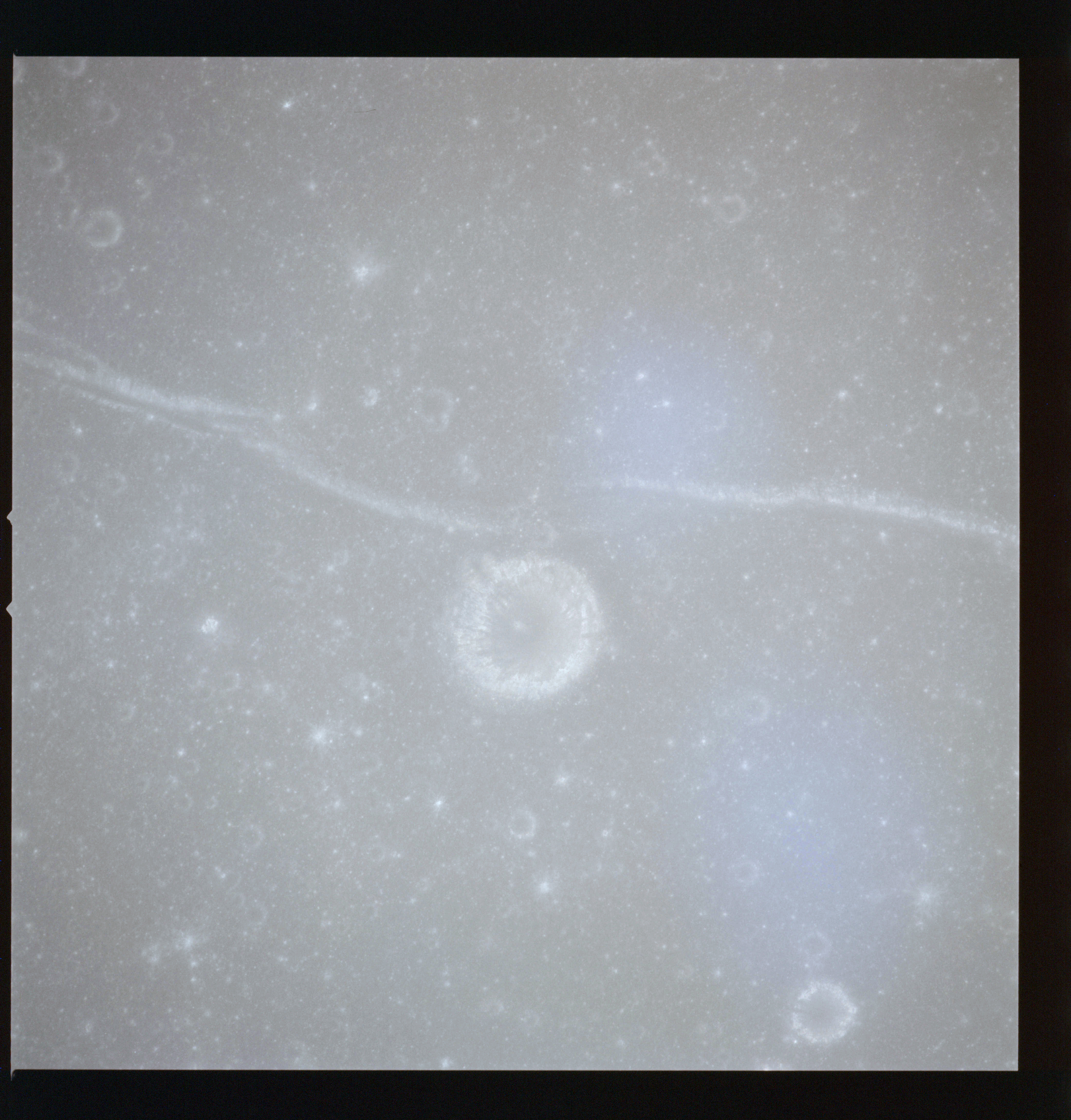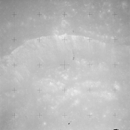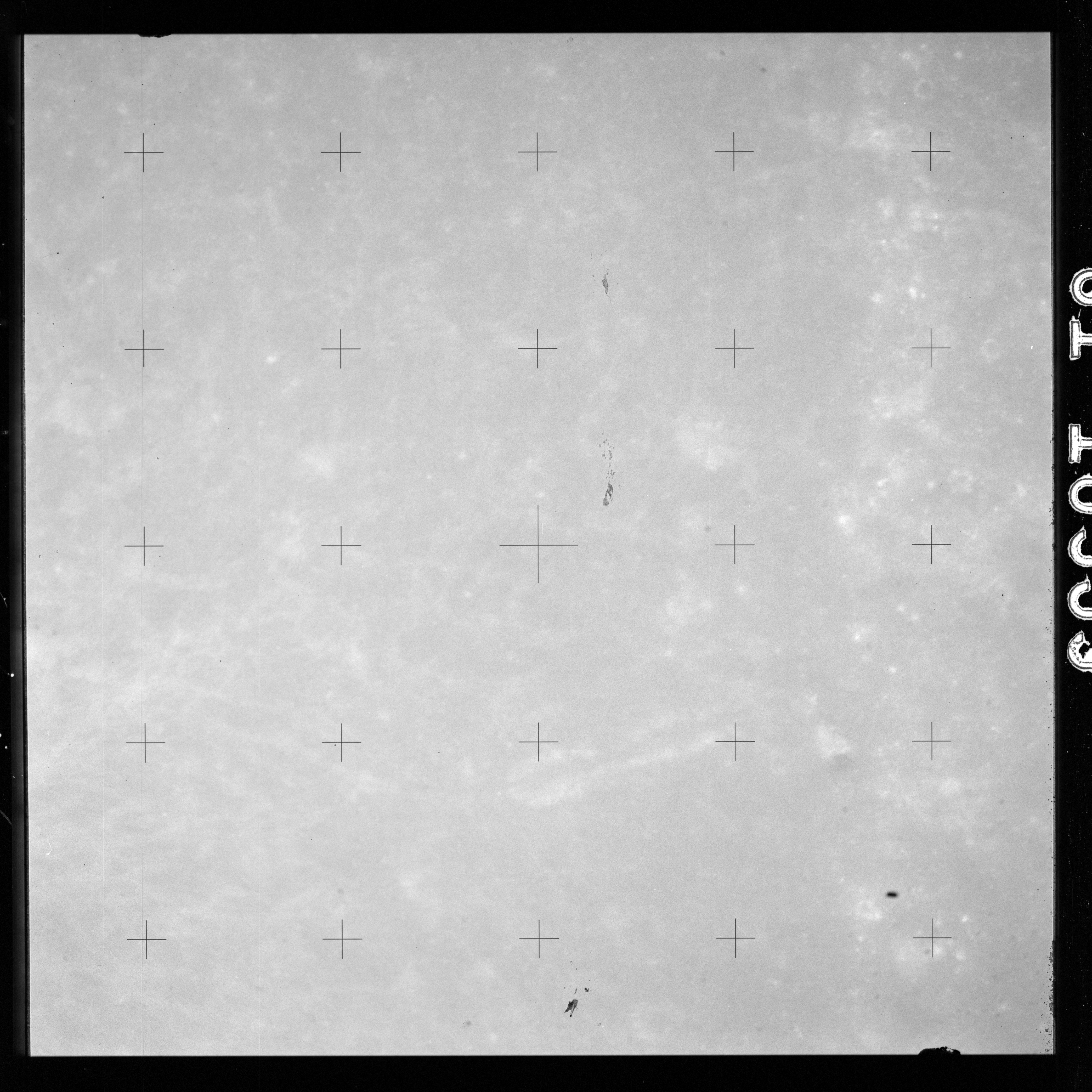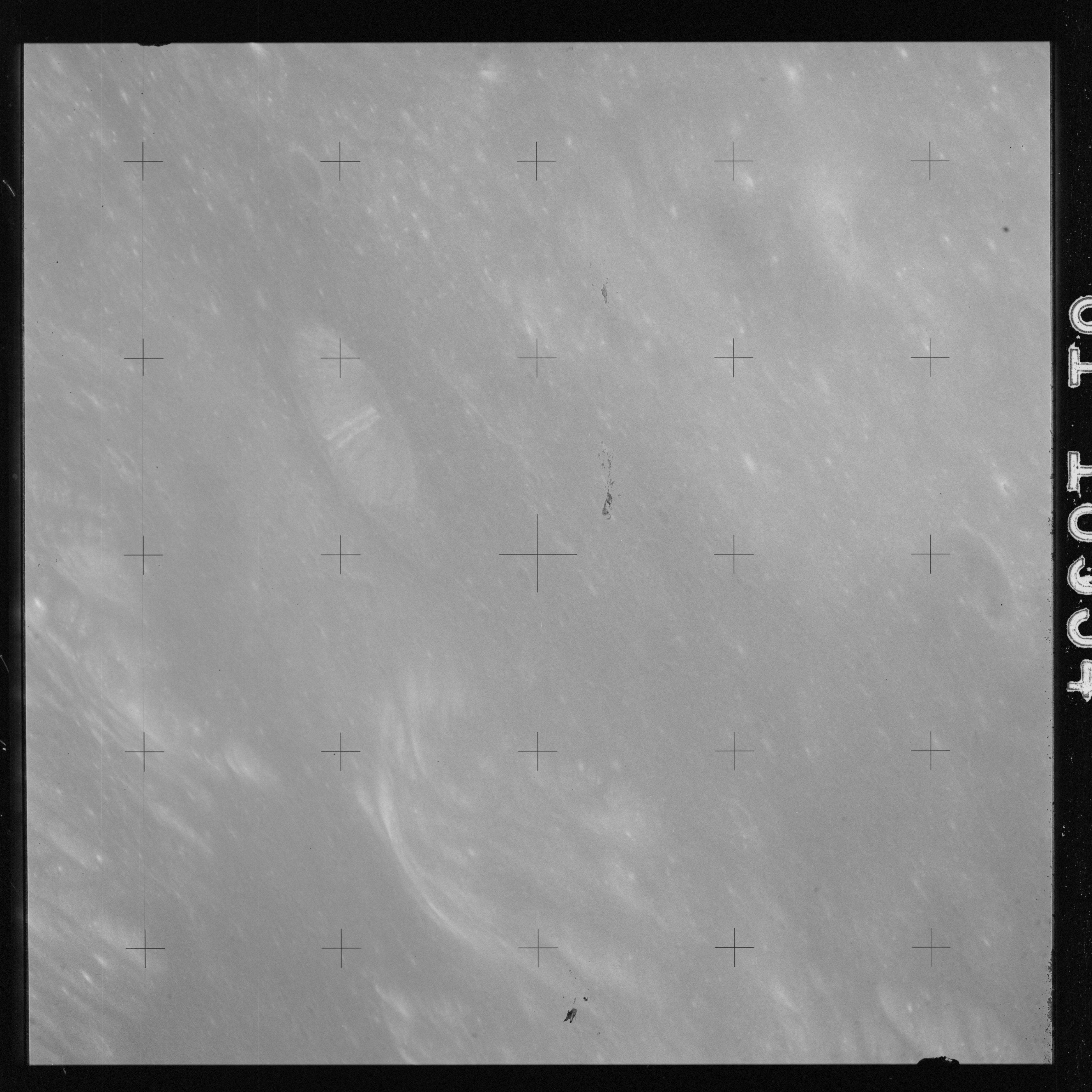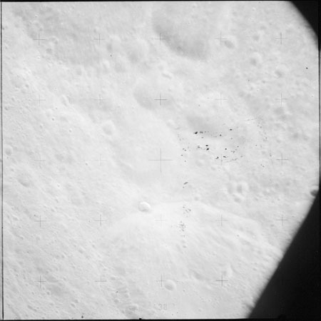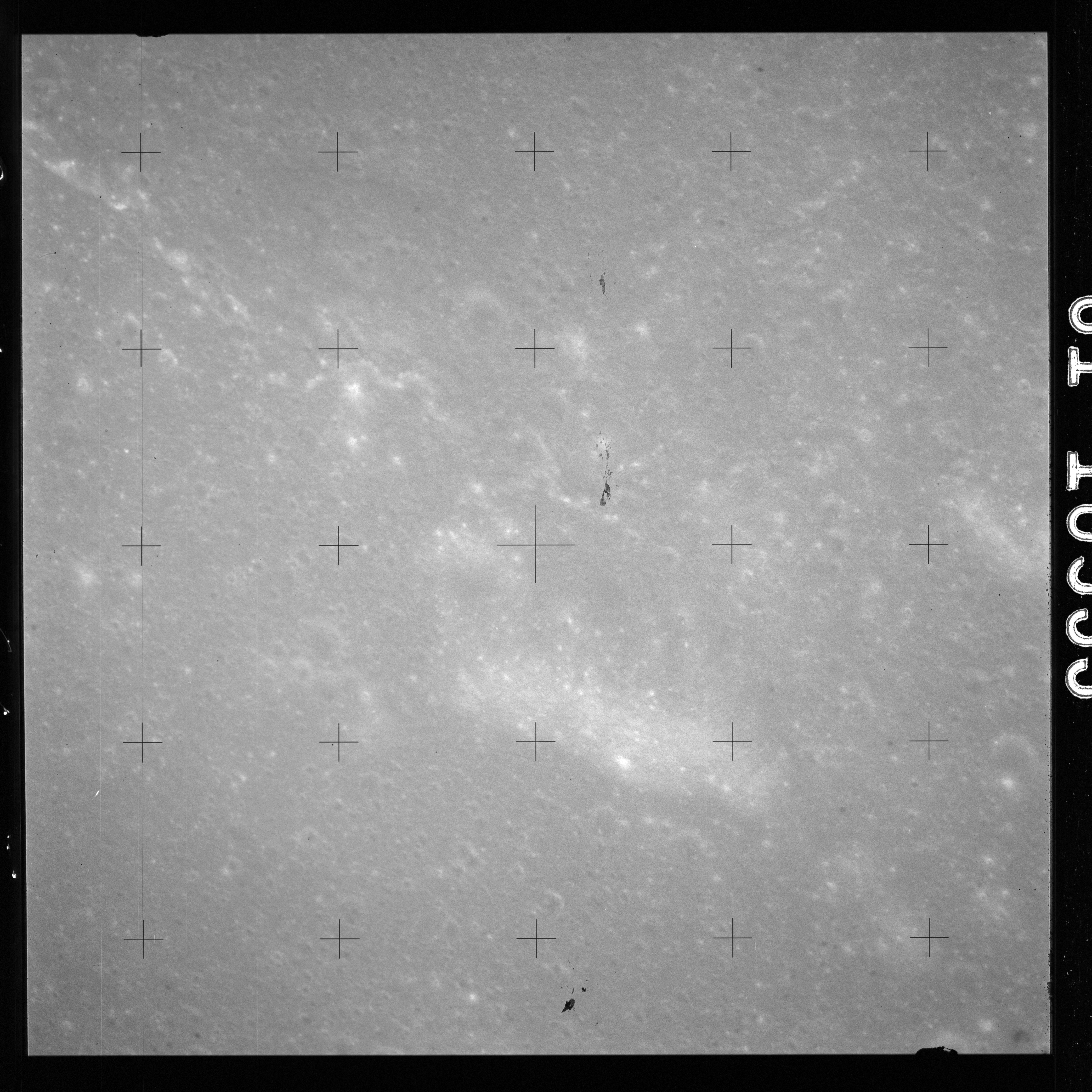 They have two Hasselblad cameras in use. One has a Réseau glass plate fitted which imprints crosses on the photographs for photogrammetry purposes. It has magazine QQ attached loaded with black and white film adn its current lens is a 500-mm telephoto. The other camera has magazine O with colour film (Ektachrome) and a 250-mm medium telephoto lens. It has no Réseau plate fitted. During a sequence of 19 images taken with the latter combination just before AOS, AS15-97-13175 to 13193, they will photograph target number 10 as given in the Flight Plan, the ancient 130-km crater Sklodowska.