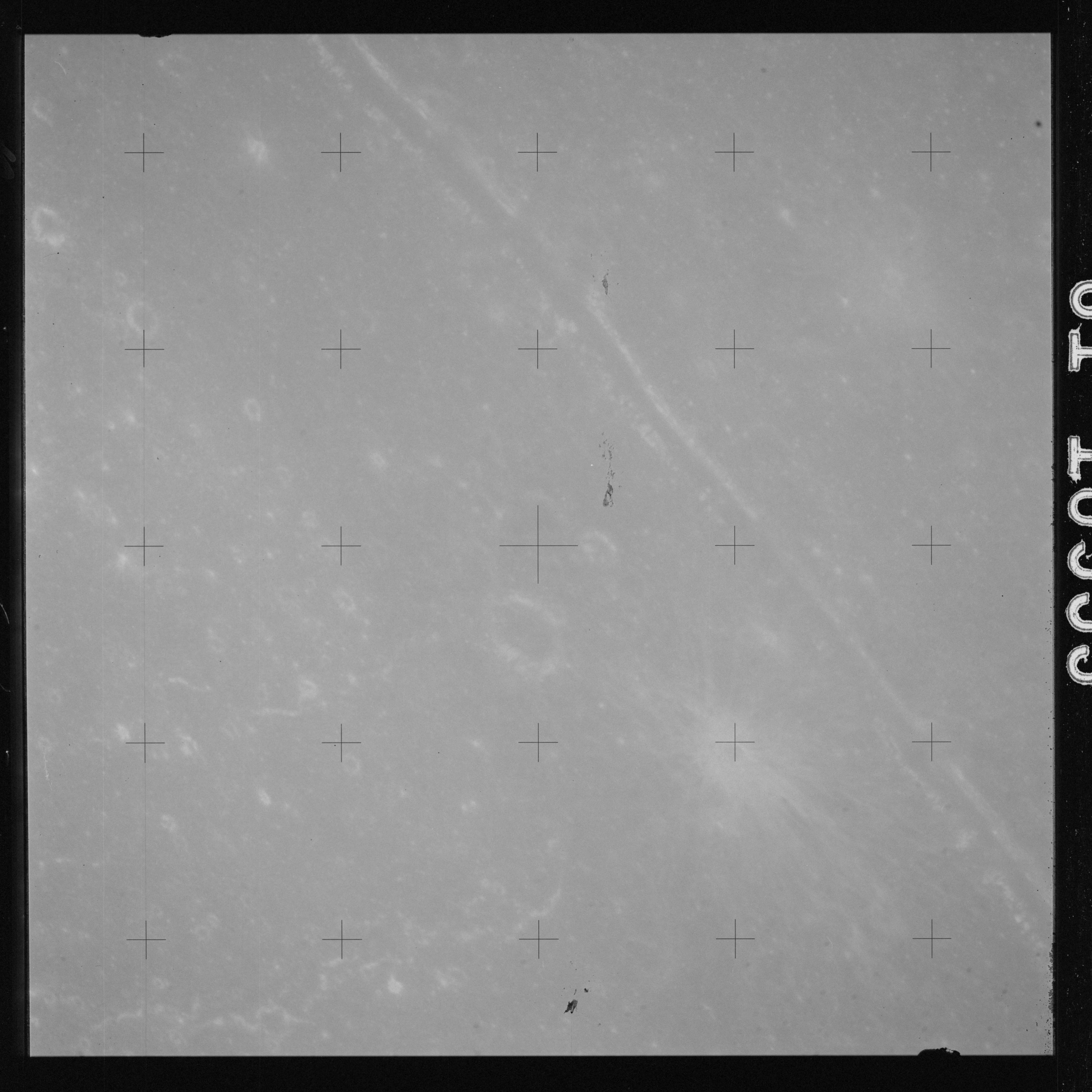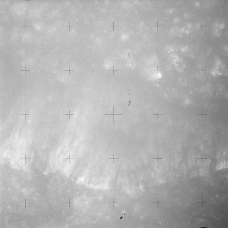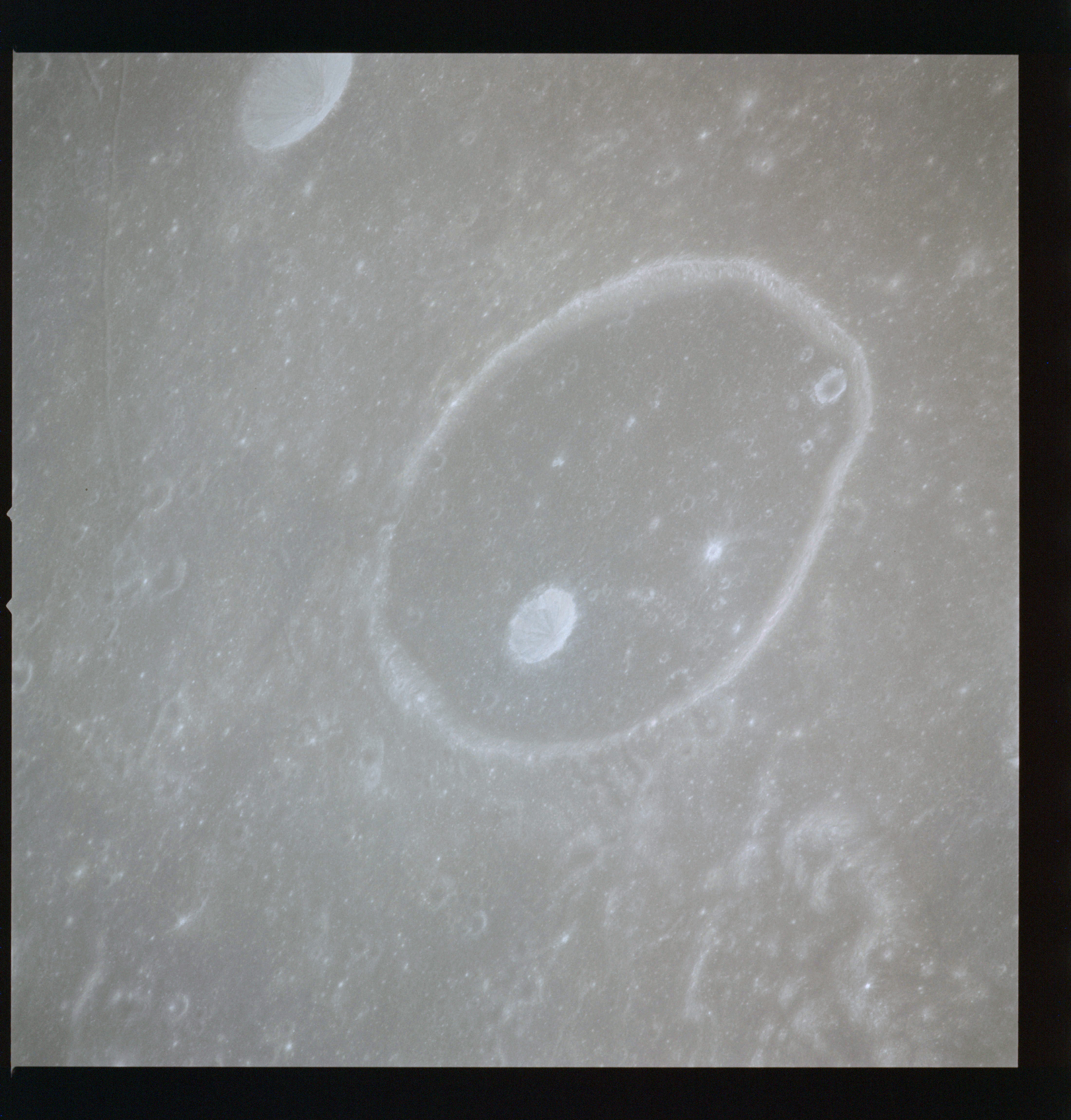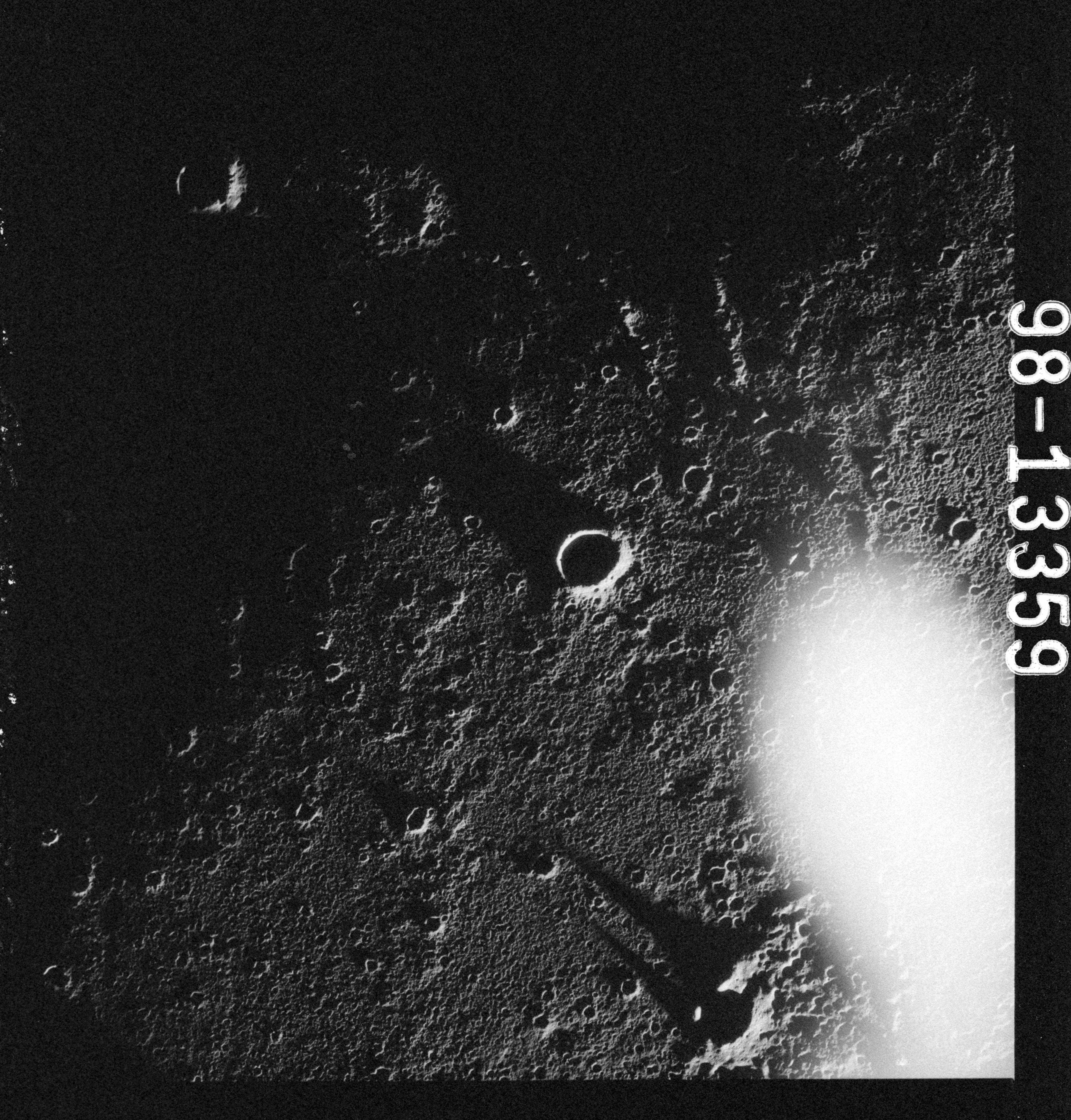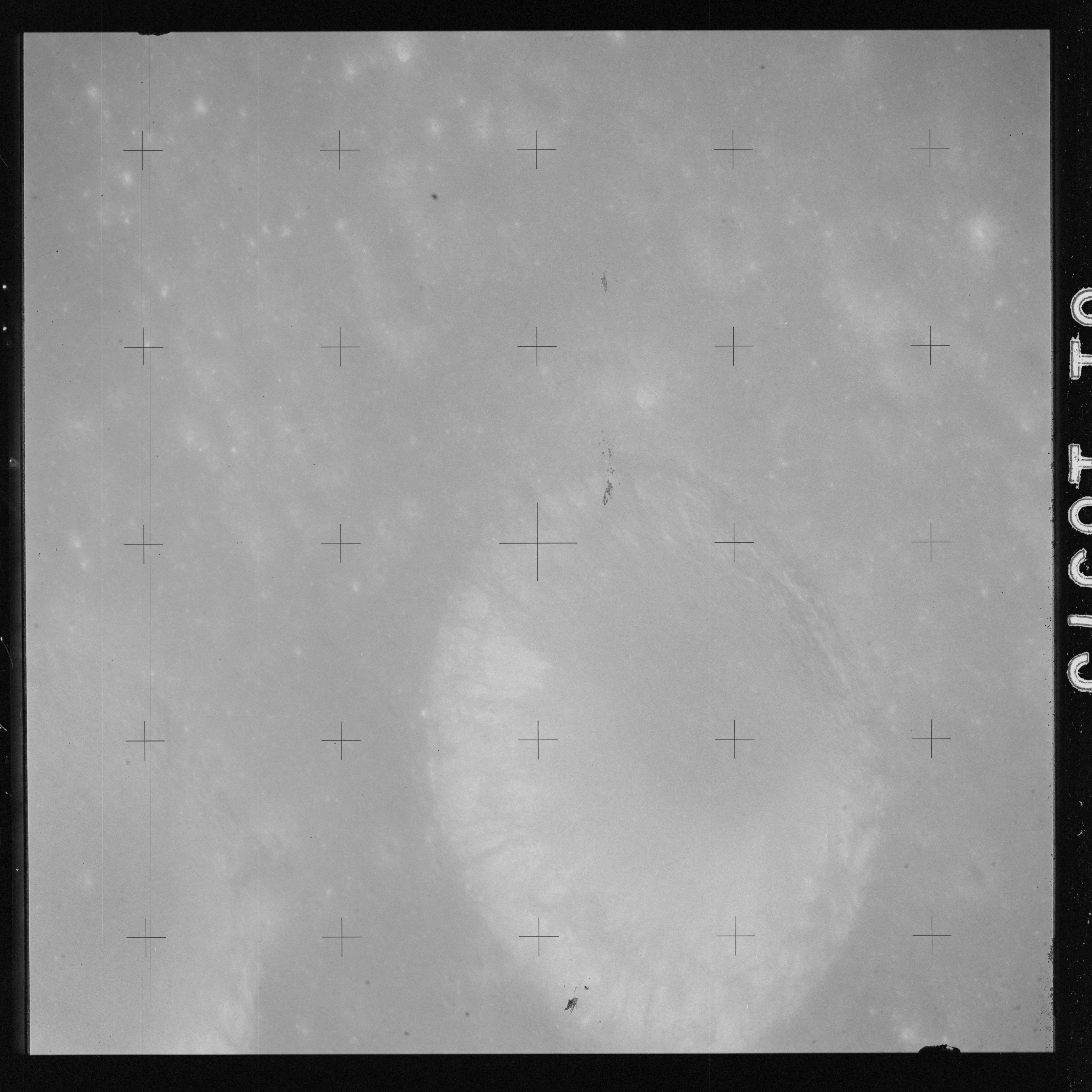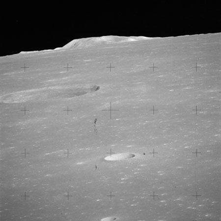 They have two Hasselblad cameras in use. One has a Réseau glass plate fitted which imprints crosses on the photographs for photogrammetry purposes. It has magazine QQ attached loaded with black and white film adn its current lens is a 500-mm telephoto. The other camera has magazine O with colour film (Ektachrome) and a 250-mm medium telephoto lens. It has no Réseau plate fitted. During a sequence of 19 images taken with the latter combination just before AOS, AS15-97-13175 to 13193, they will photograph target number 10 as given in the Flight Plan, the ancient 130-km crater Sklodowska.