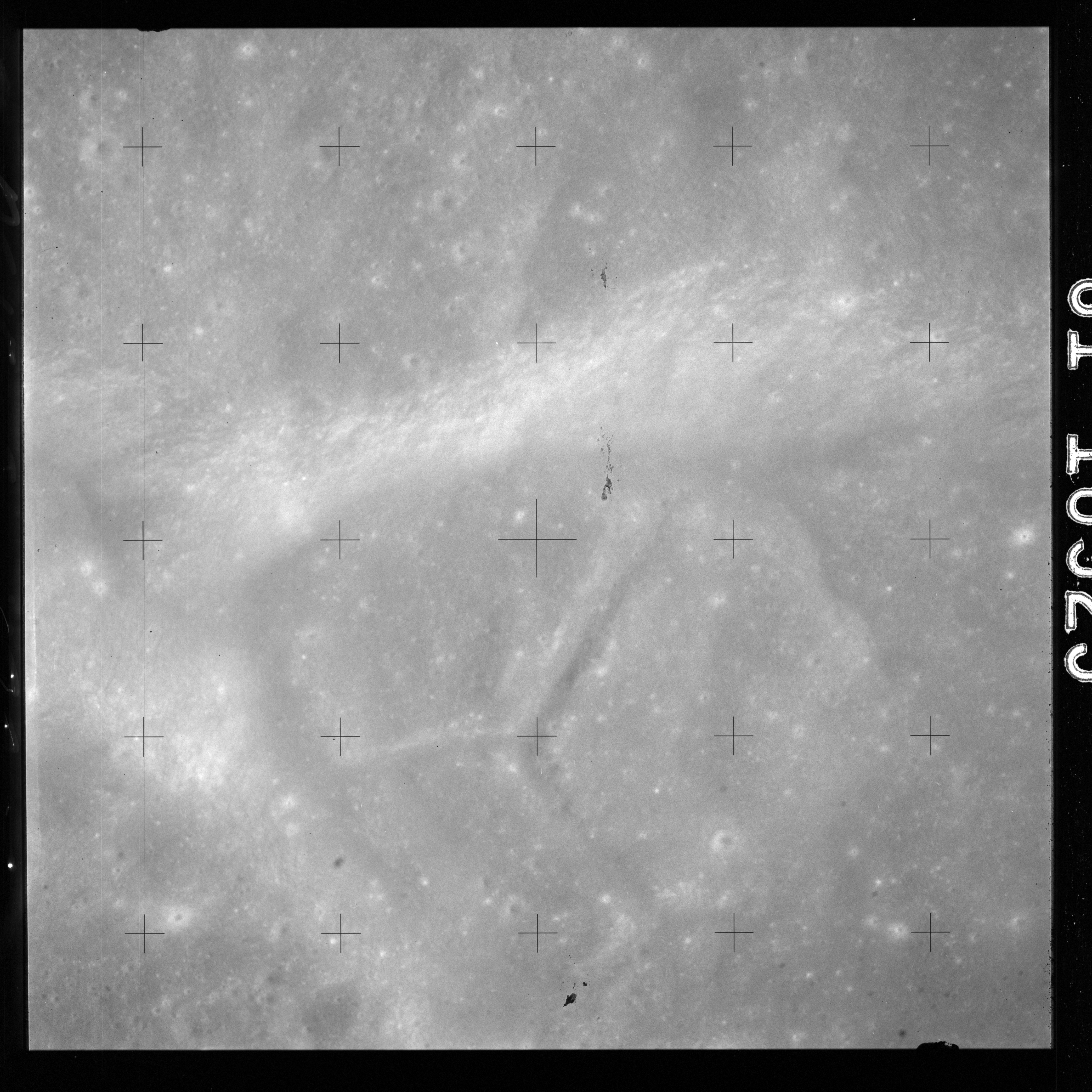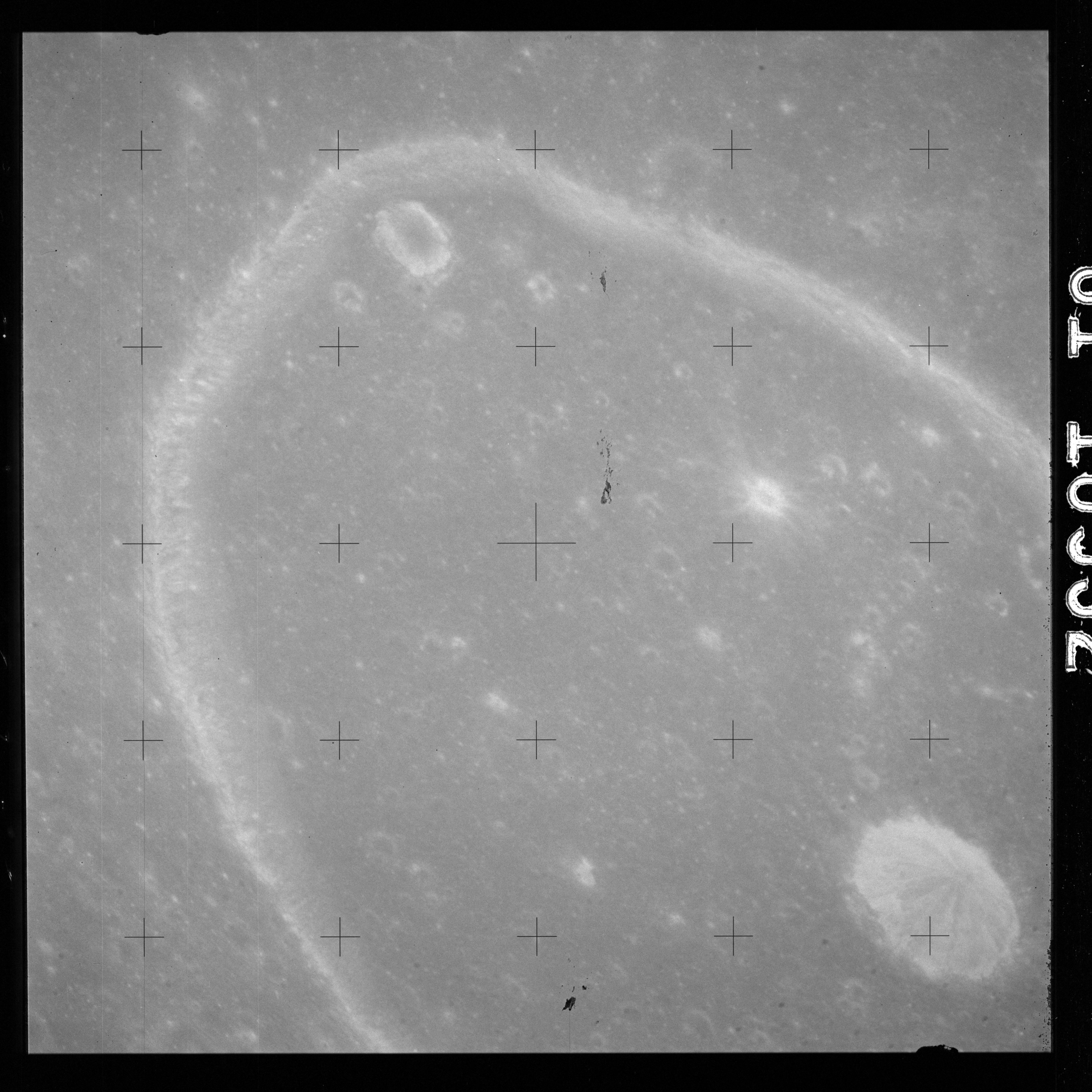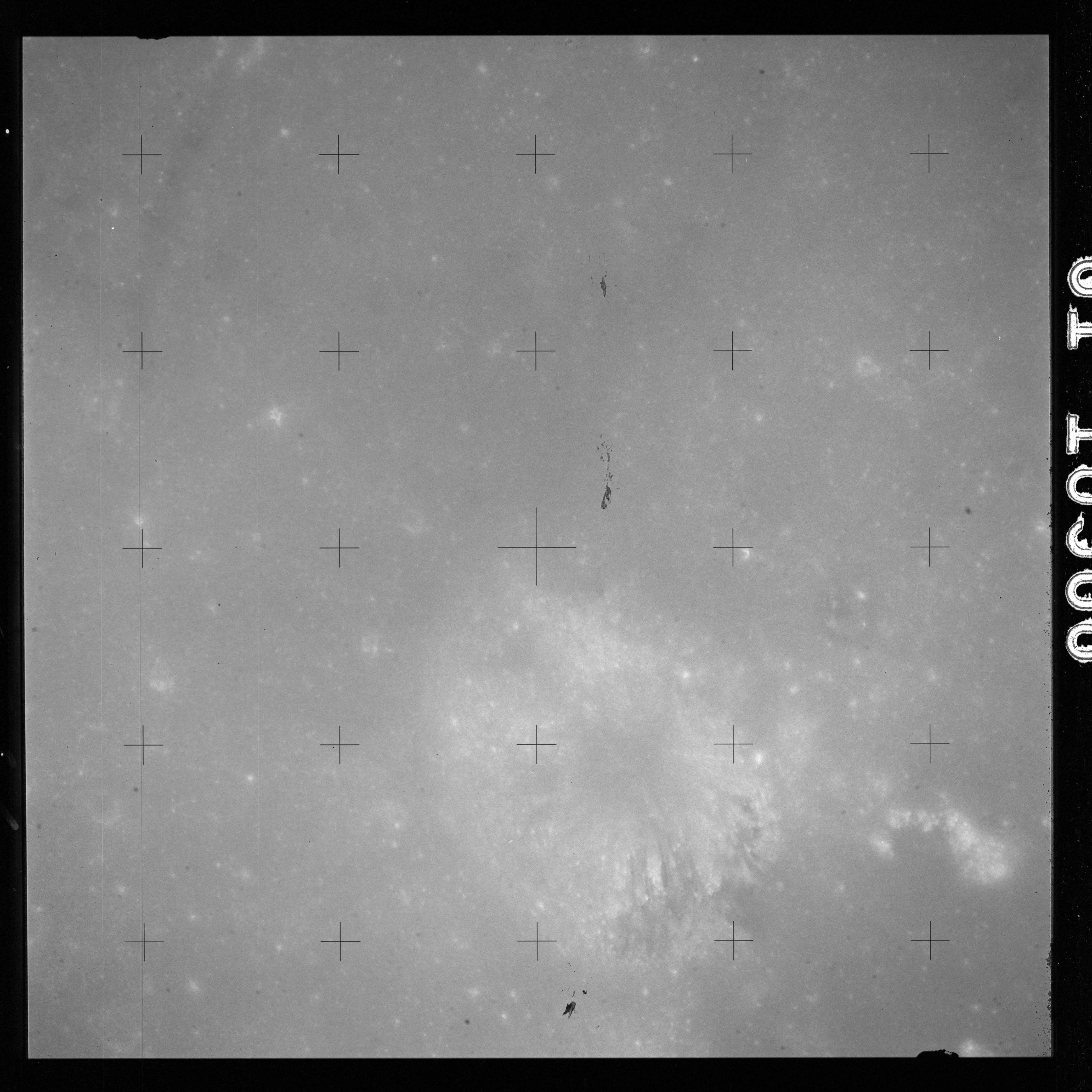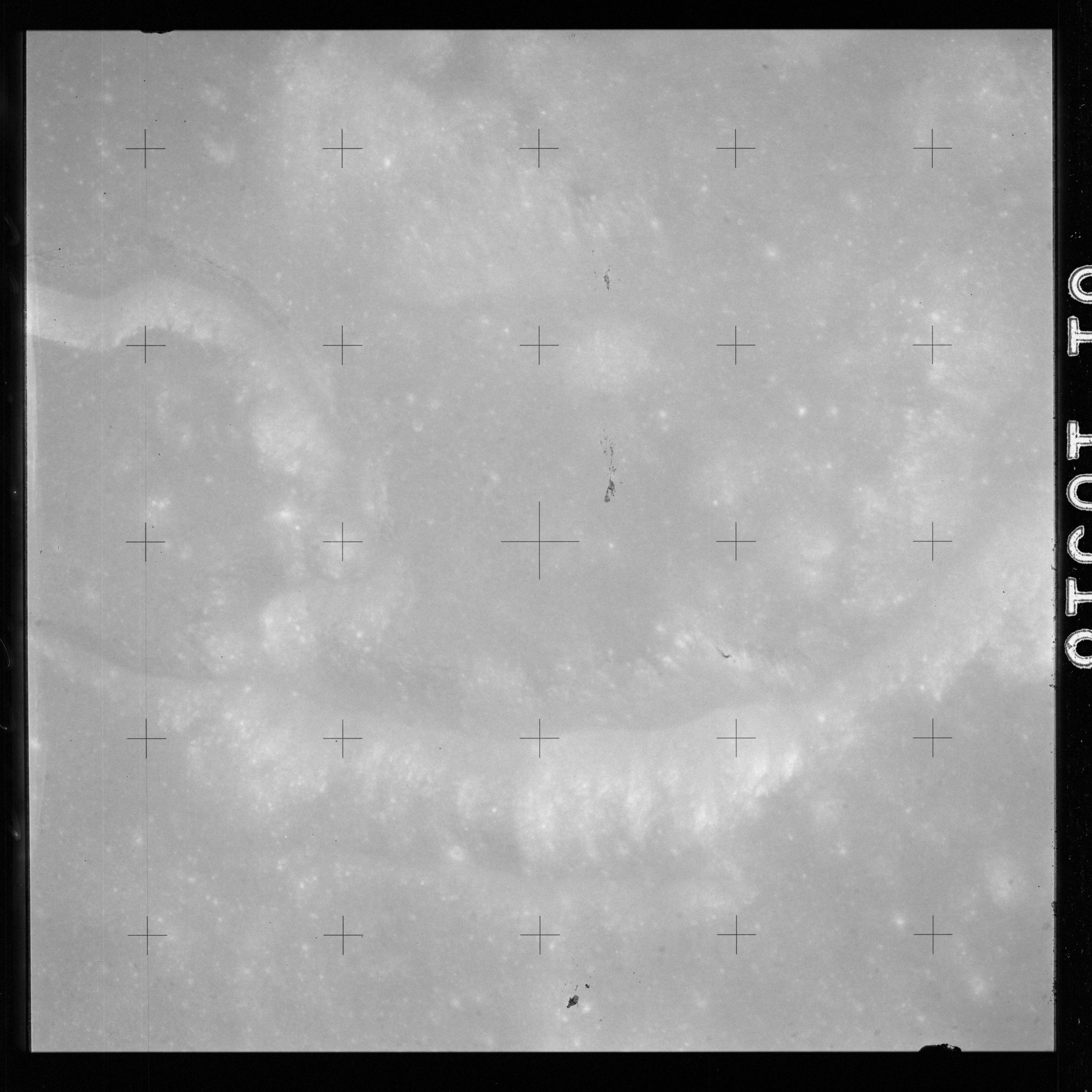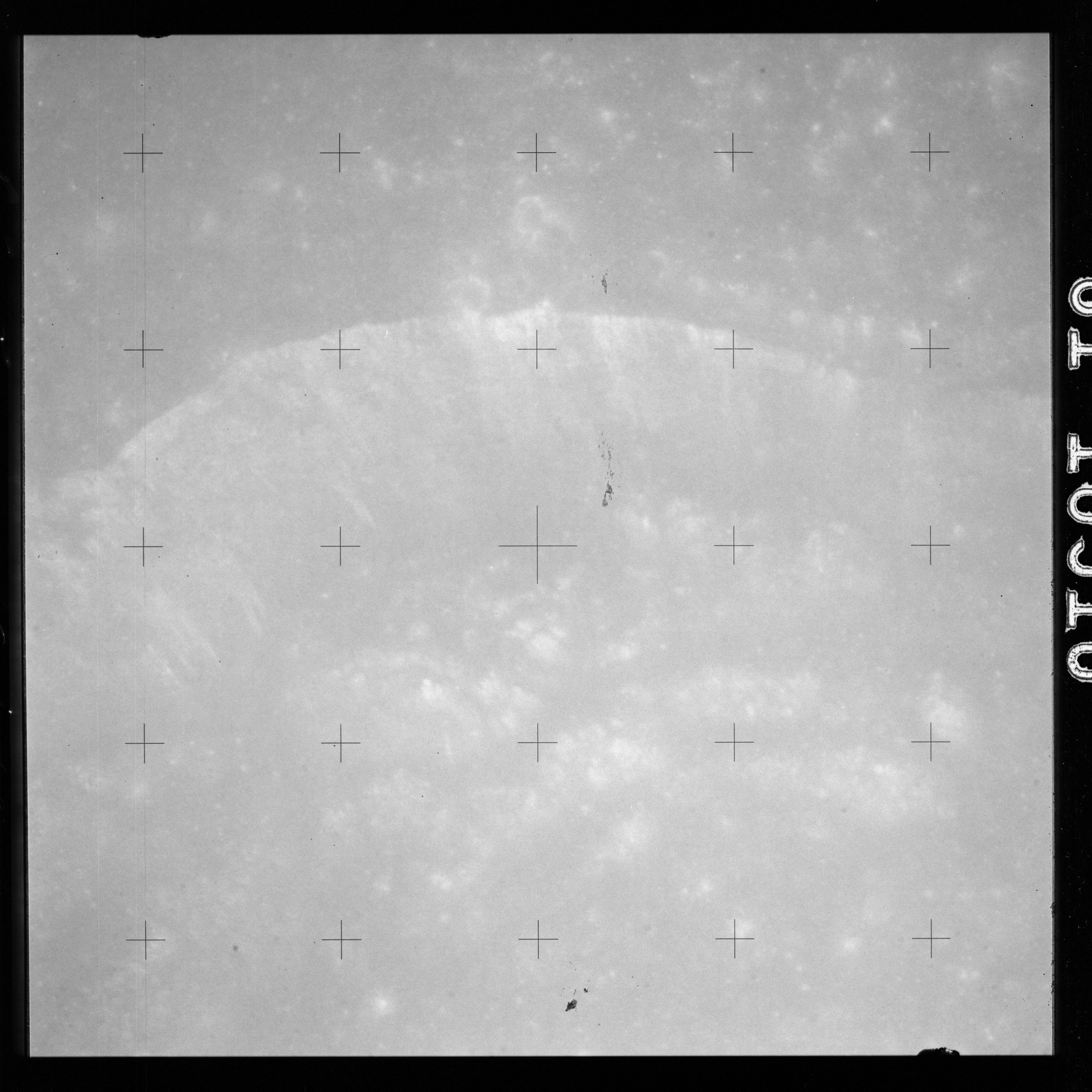 They have two Hasselblad cameras in use. One has a Réseau glass plate fitted which imprints crosses on the photographs for photogrammetry purposes. It has magazine QQ attached loaded with black and white film adn its current lens is a 500-mm telephoto. The other camera has magazine O with colour film (Ektachrome) and a 250-mm medium telephoto lens. It has no Réseau plate fitted. During a sequence of 19 images taken with the latter combination just before AOS, AS15-97-13175 to 13193, they will photograph target number 10 as given in the Flight Plan, the ancient 130-km crater Sklodowska.