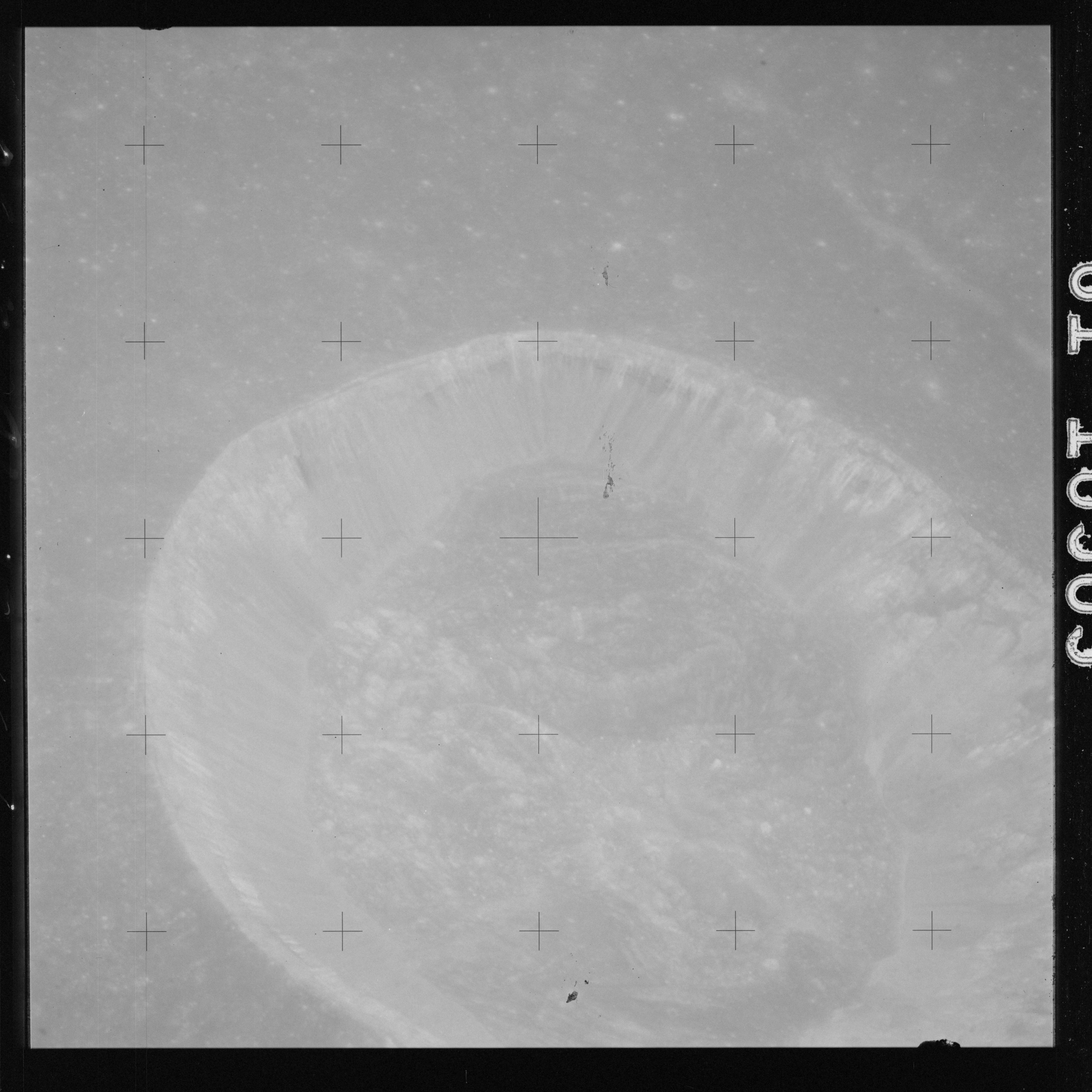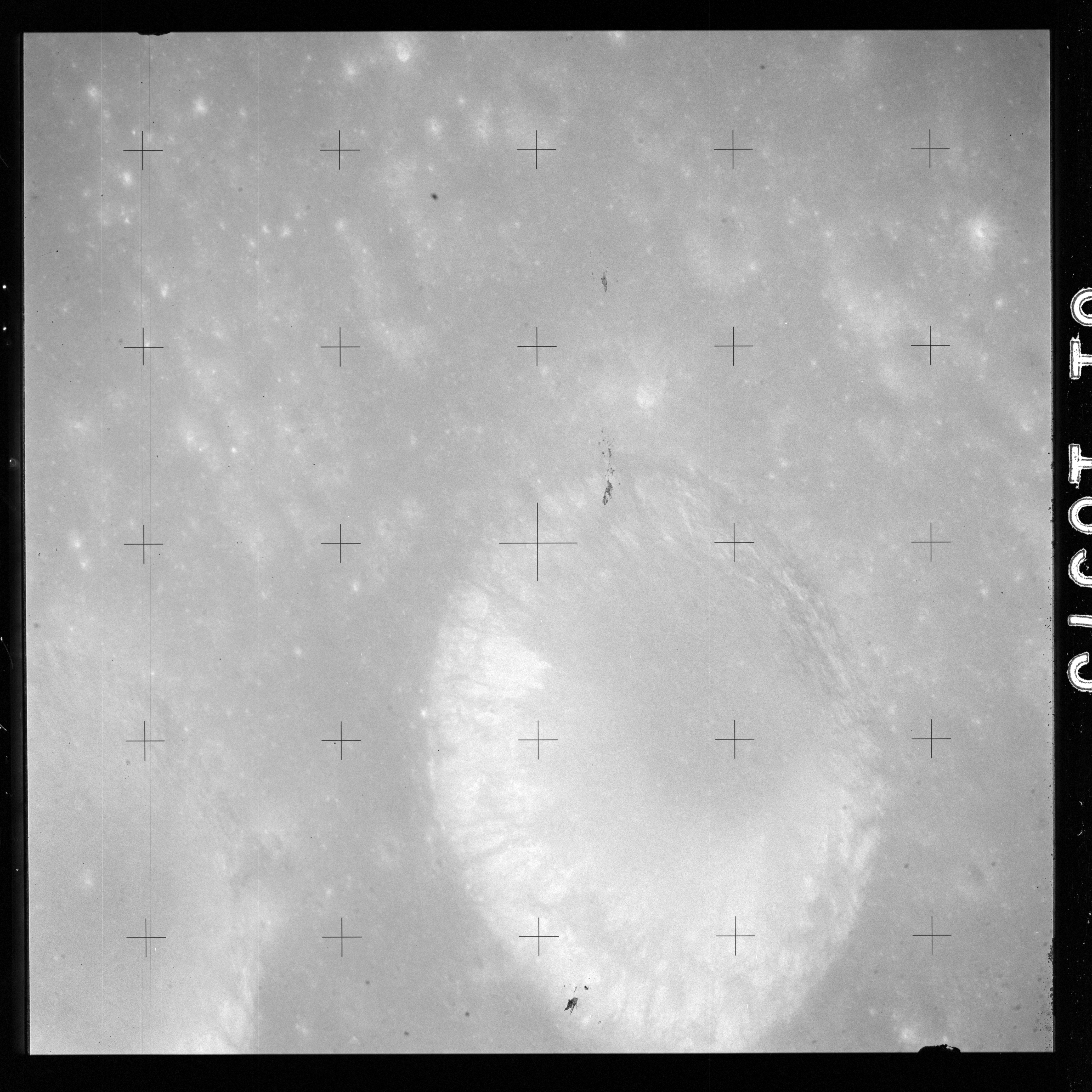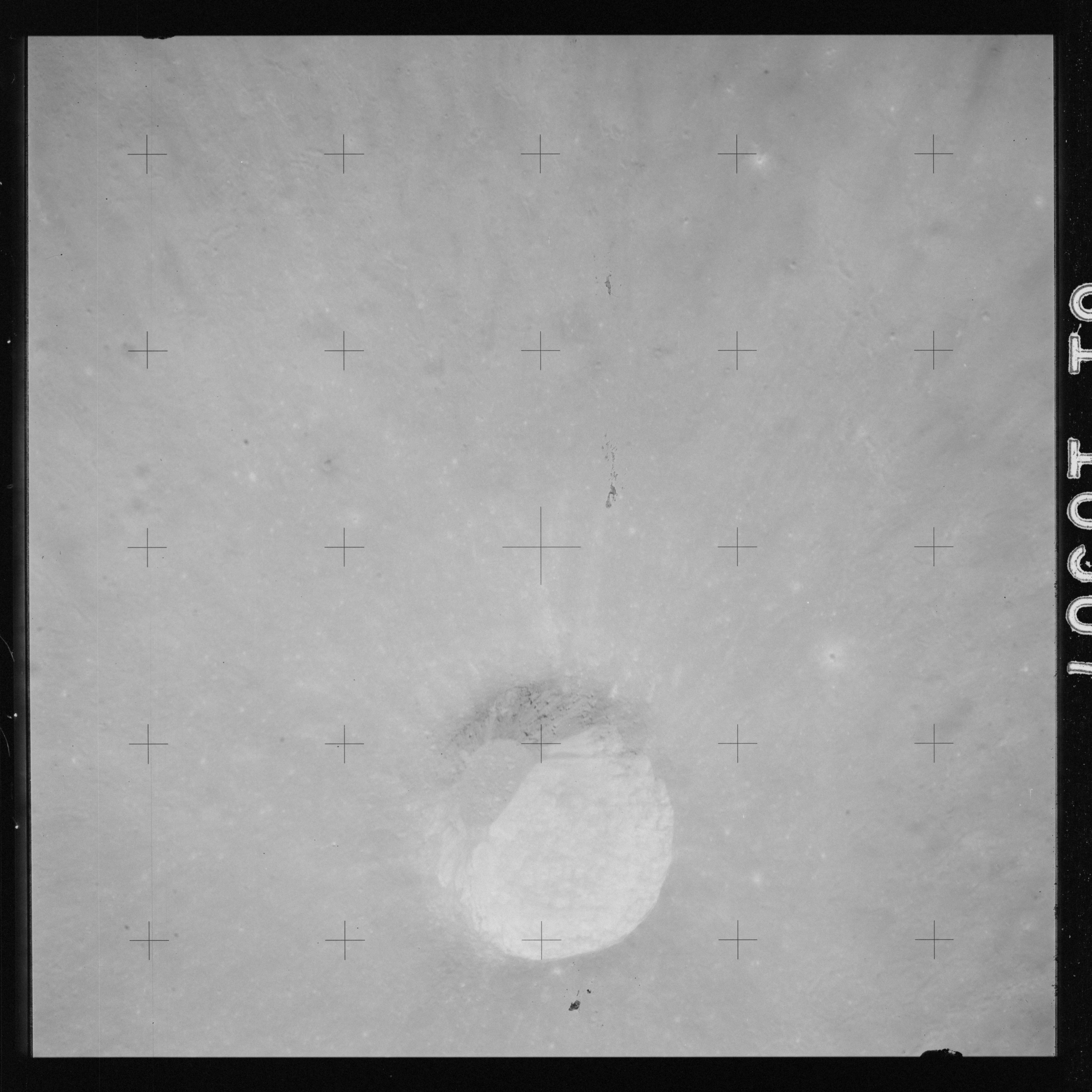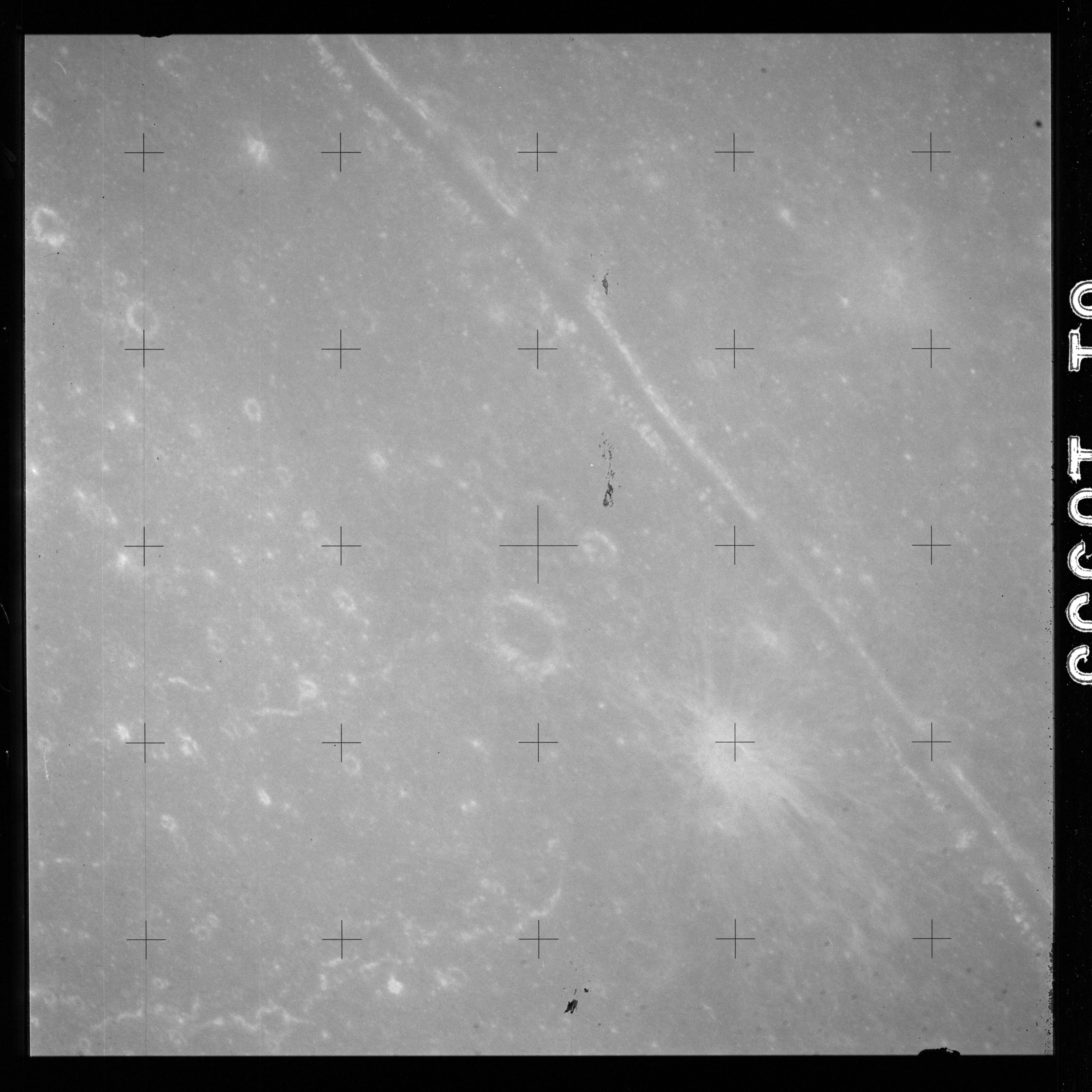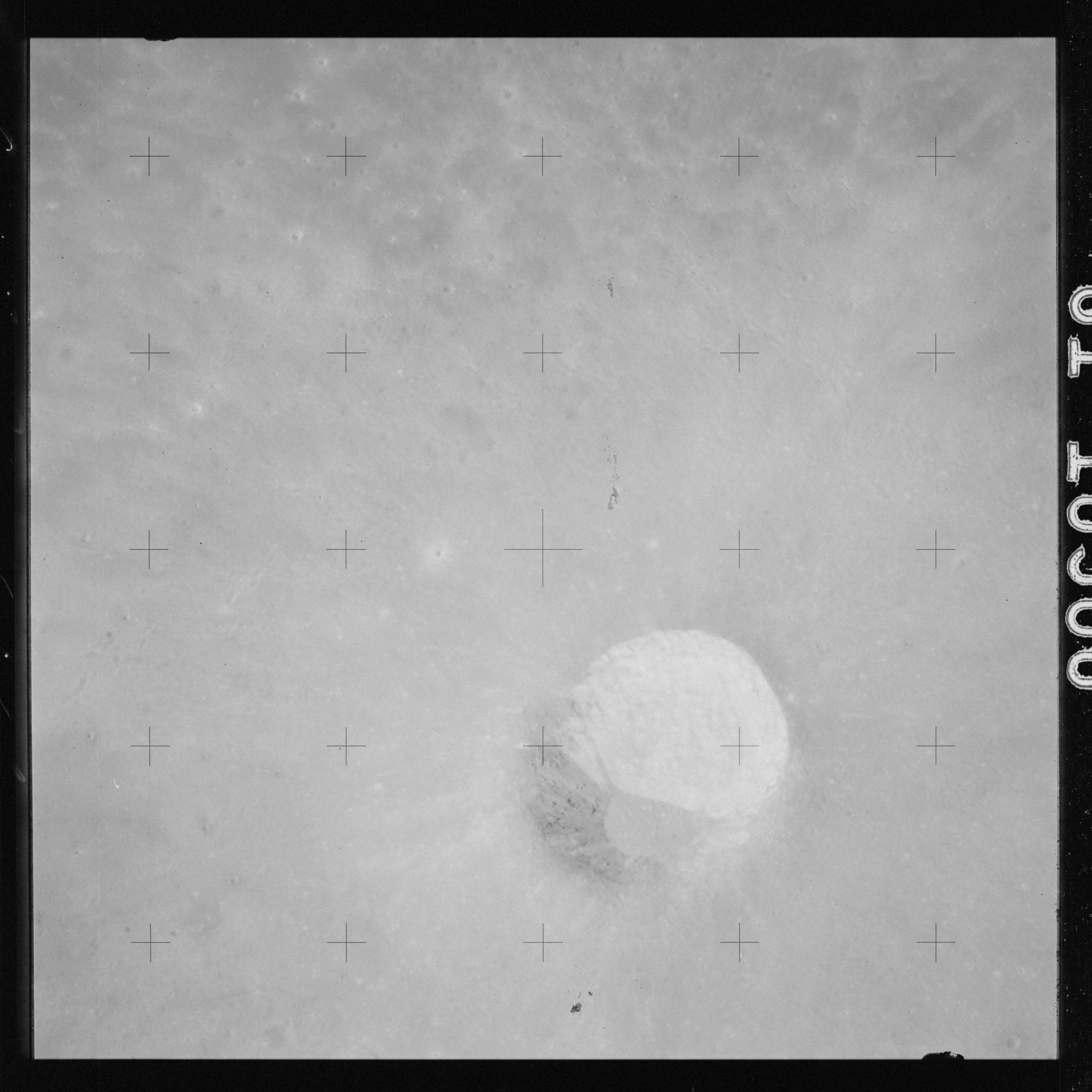 They have two Hasselblad cameras in use. One has a Réseau glass plate fitted which imprints crosses on the photographs for photogrammetry purposes. It has magazine QQ attached loaded with black and white film adn its current lens is a 500-mm telephoto. The other camera has magazine O with colour film (Ektachrome) and a 250-mm medium telephoto lens. It has no Réseau plate fitted. During a sequence of 19 images taken with the latter combination just before AOS, AS15-97-13175 to 13193, they will photograph target number 10 as given in the Flight Plan, the ancient 130-km crater Sklodowska.
