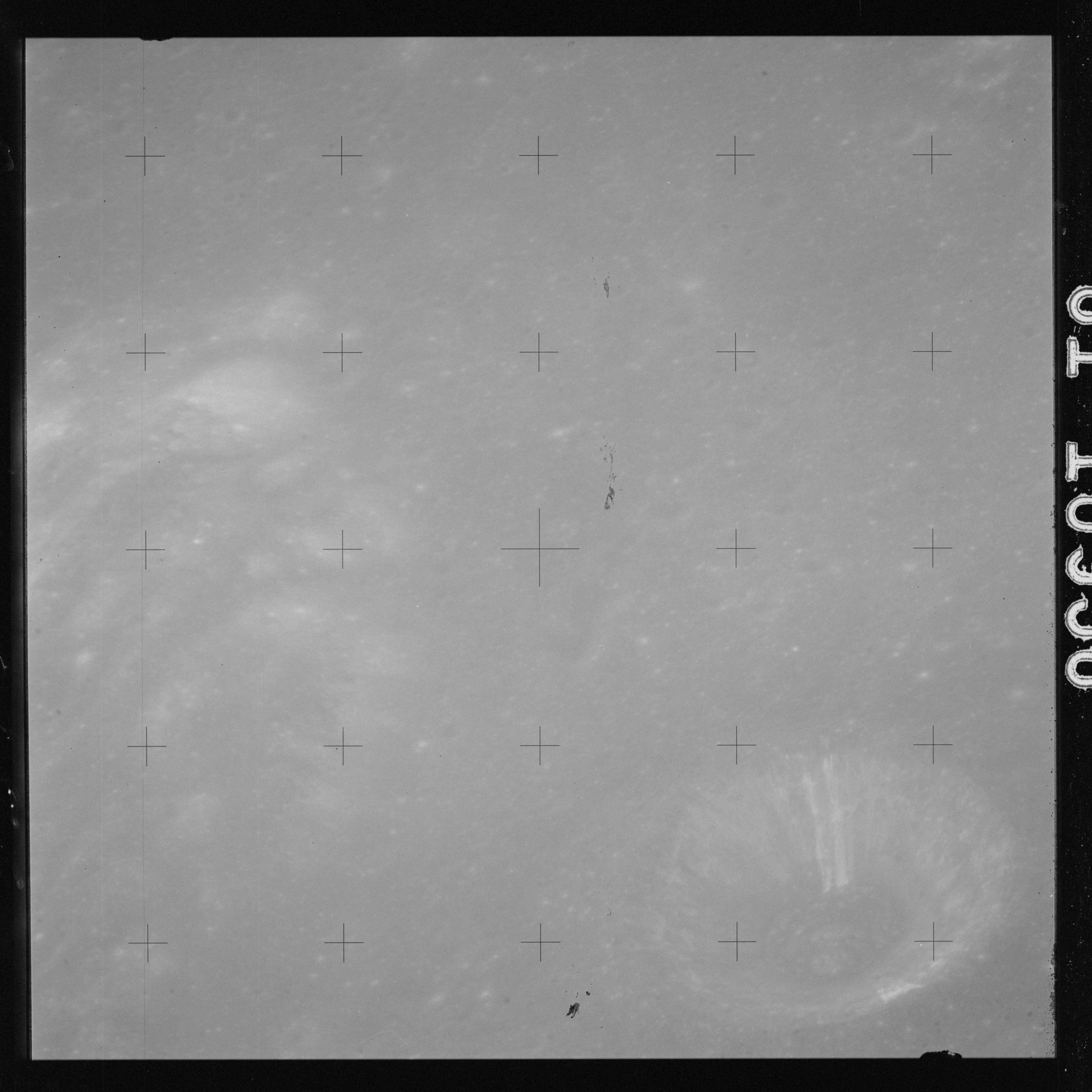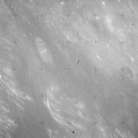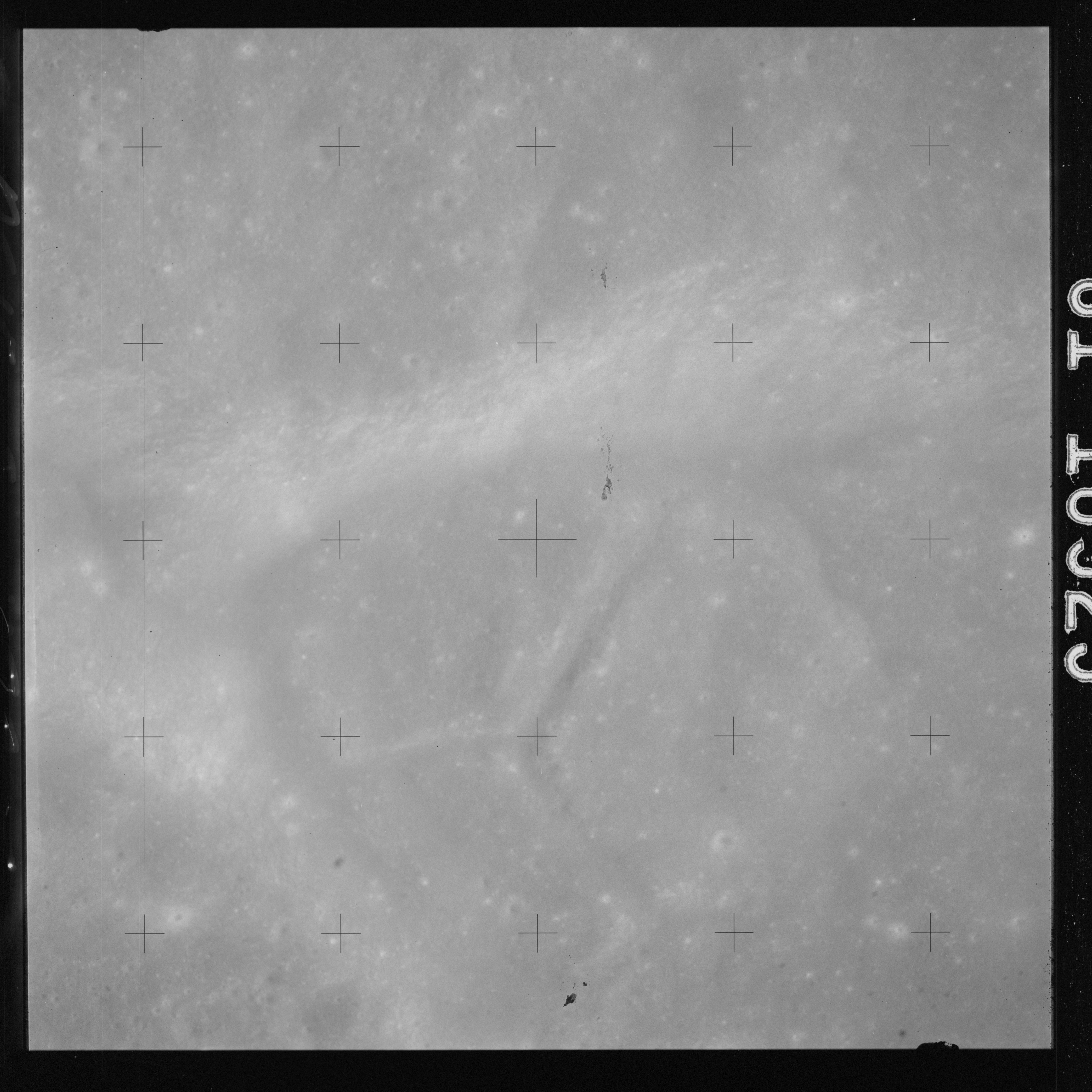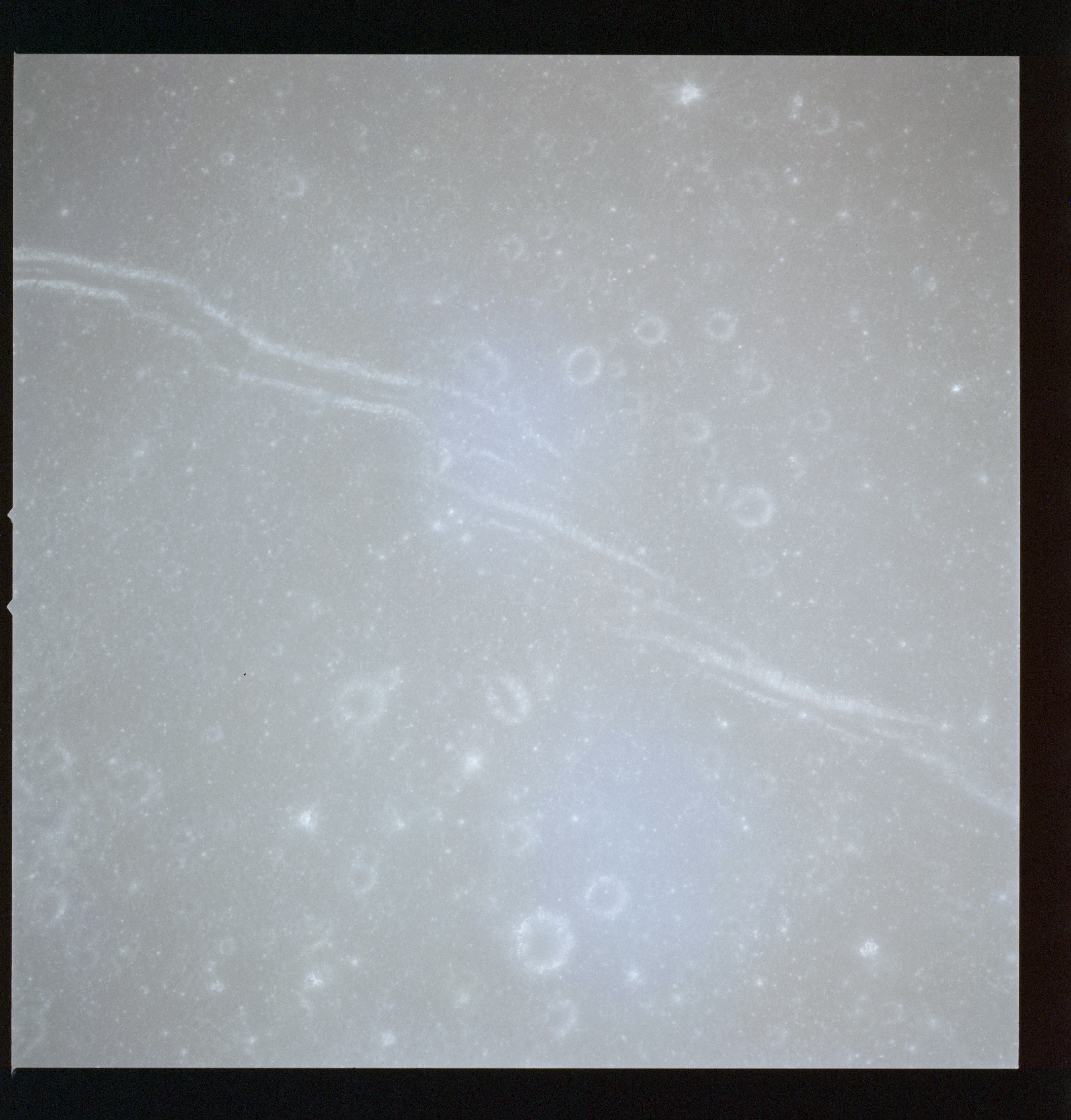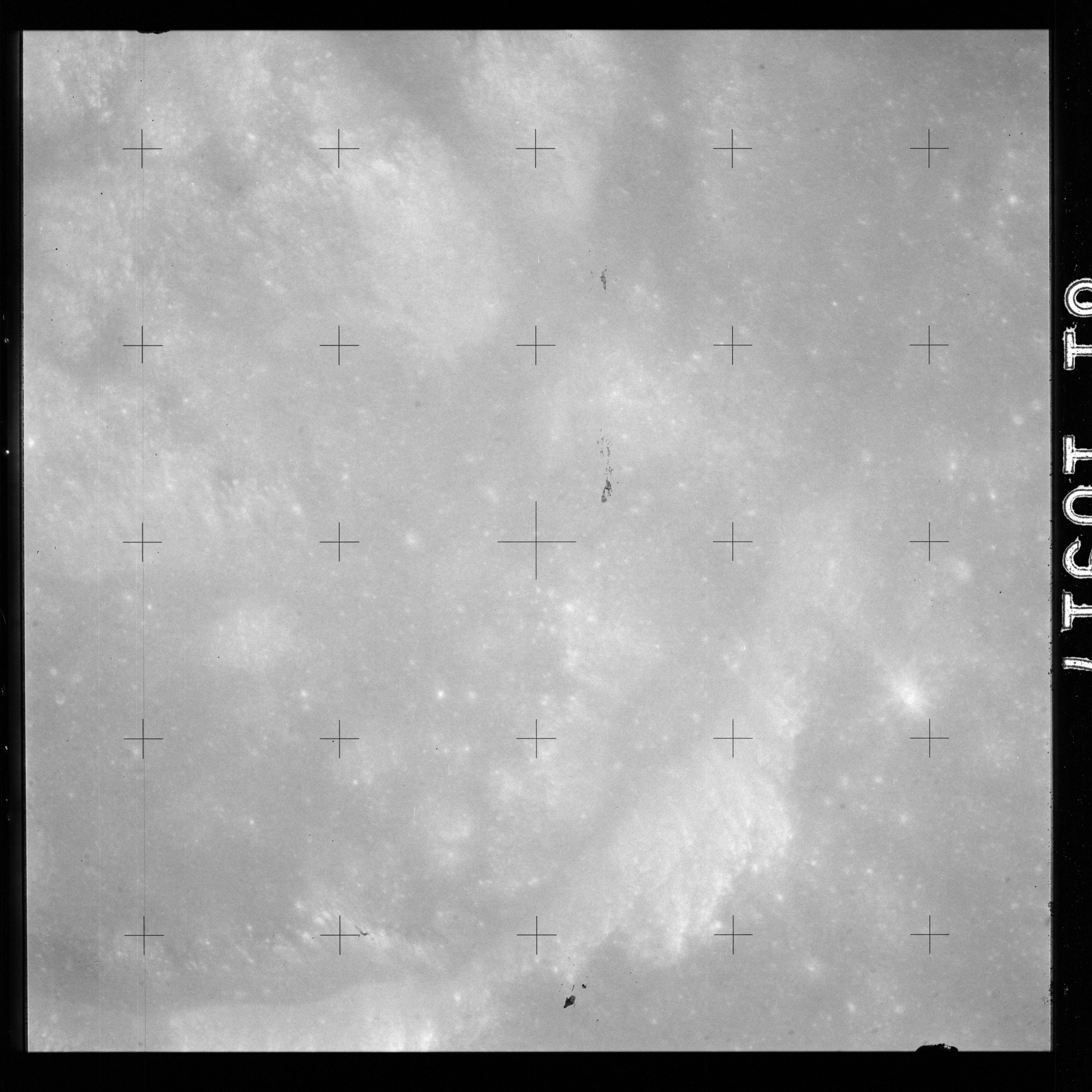 They have two Hasselblad cameras in use. One has a Réseau glass plate fitted which imprints crosses on the photographs for photogrammetry purposes. It has magazine QQ attached loaded with black and white film adn its current lens is a 500-mm telephoto. The other camera has magazine O with colour film (Ektachrome) and a 250-mm medium telephoto lens. It has no Réseau plate fitted. During a sequence of 19 images taken with the latter combination just before AOS, AS15-97-13175 to 13193, they will photograph target number 10 as given in the Flight Plan, the ancient 130-km crater Sklodowska.