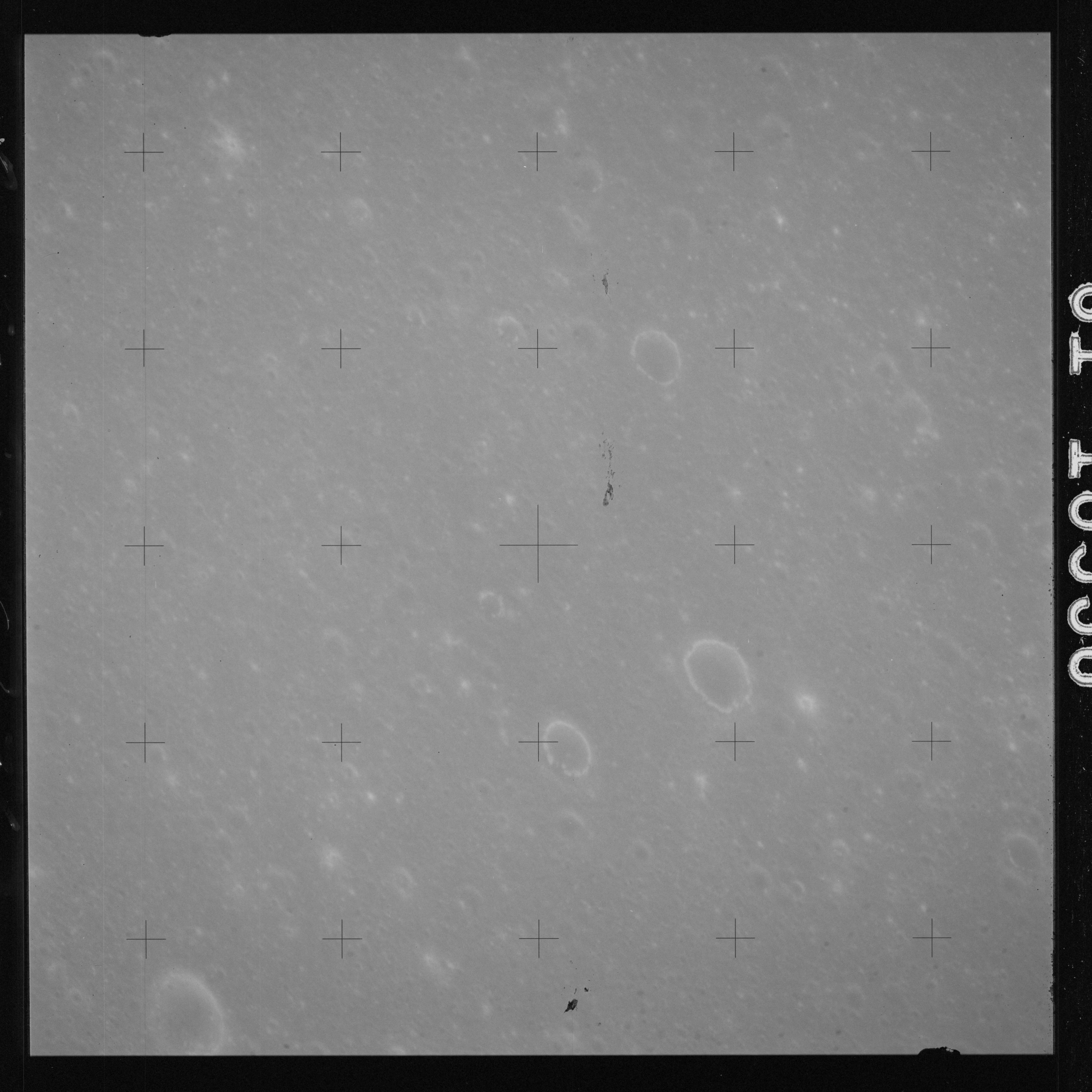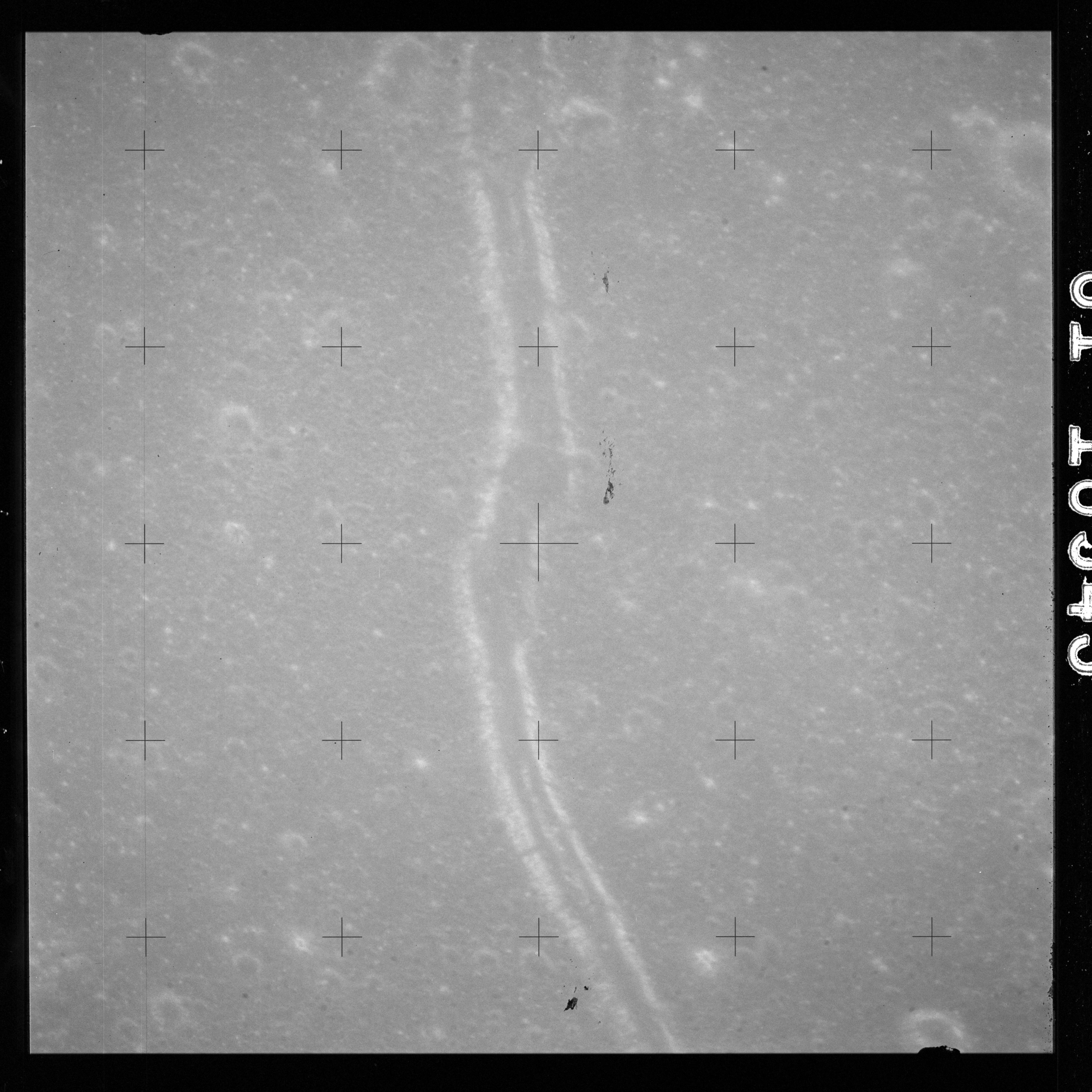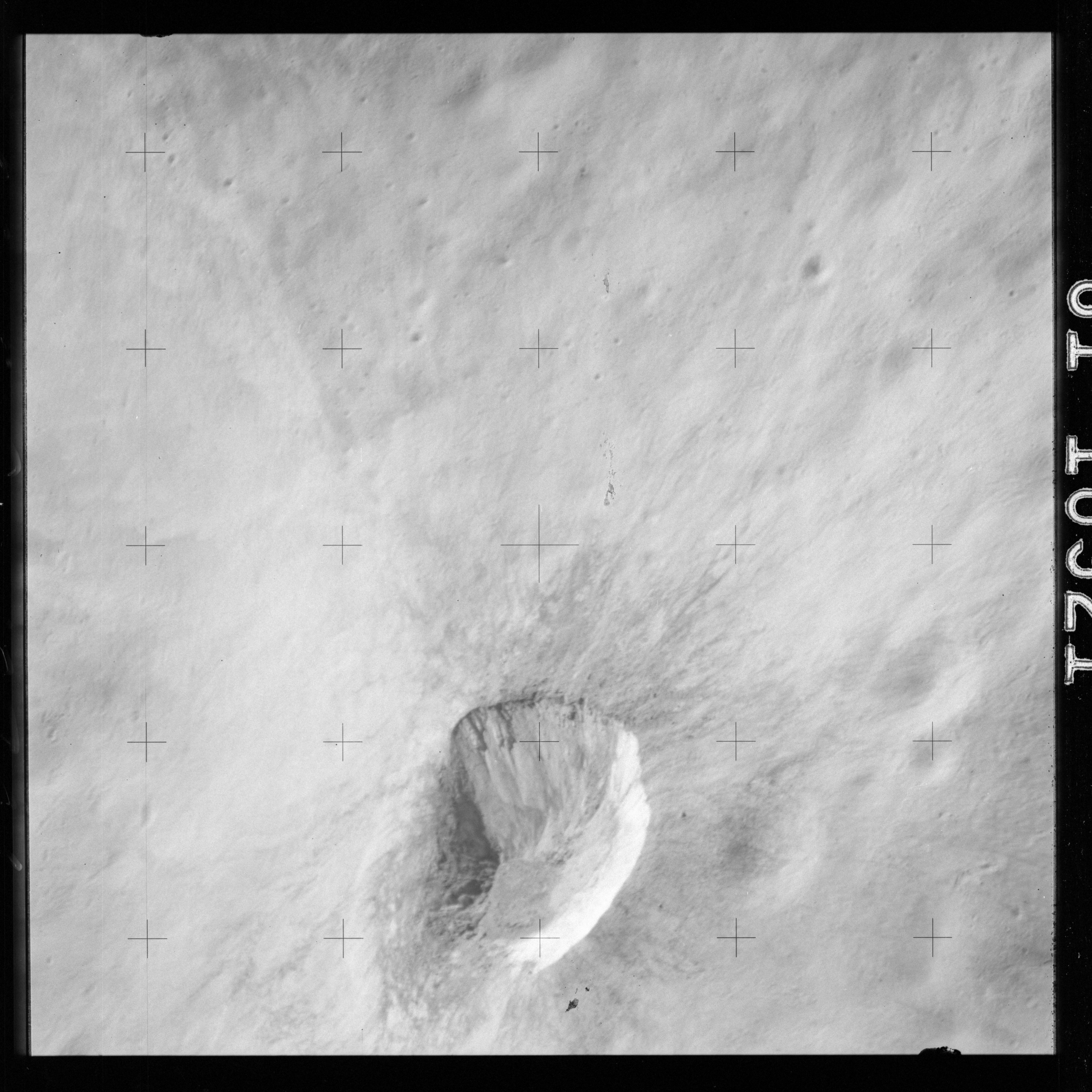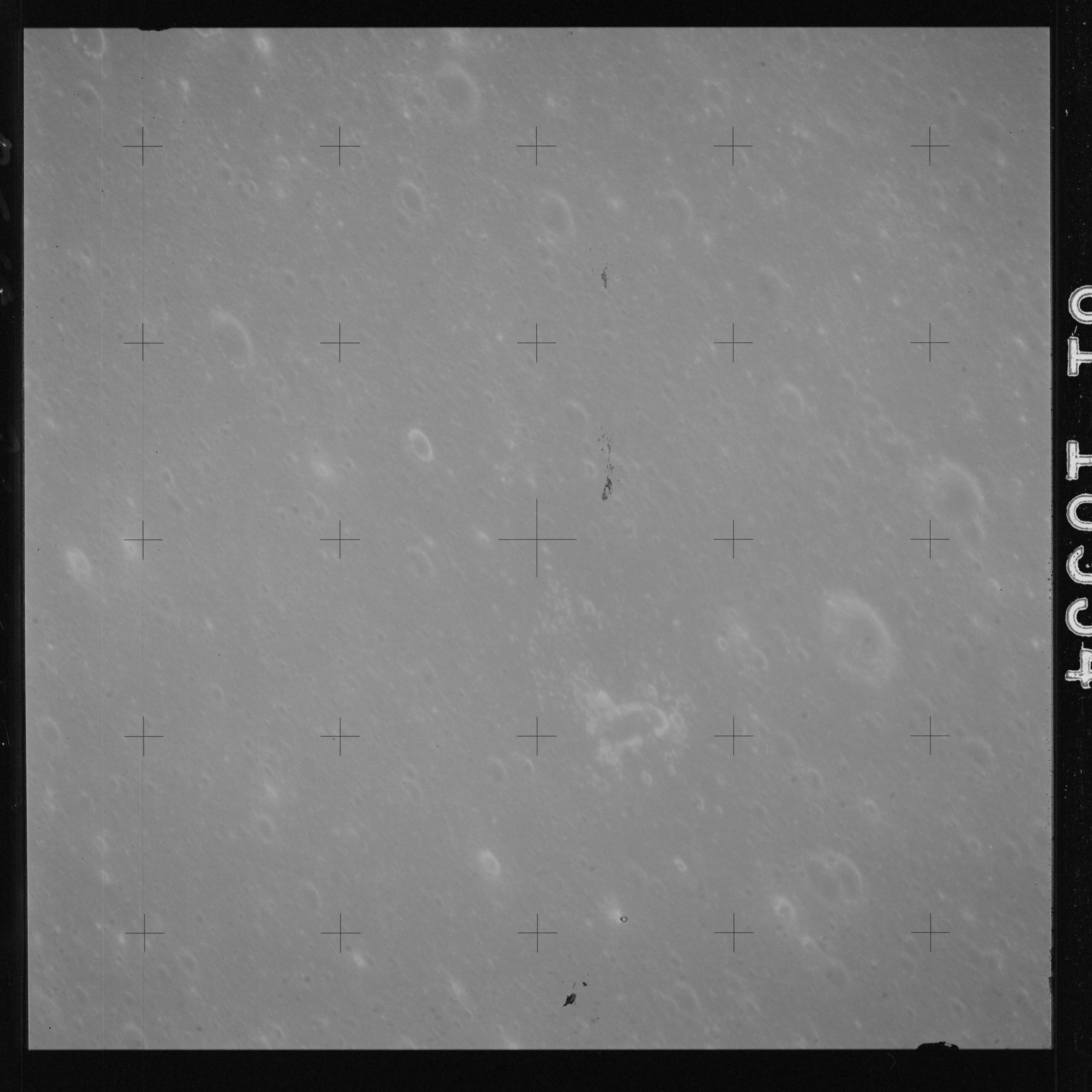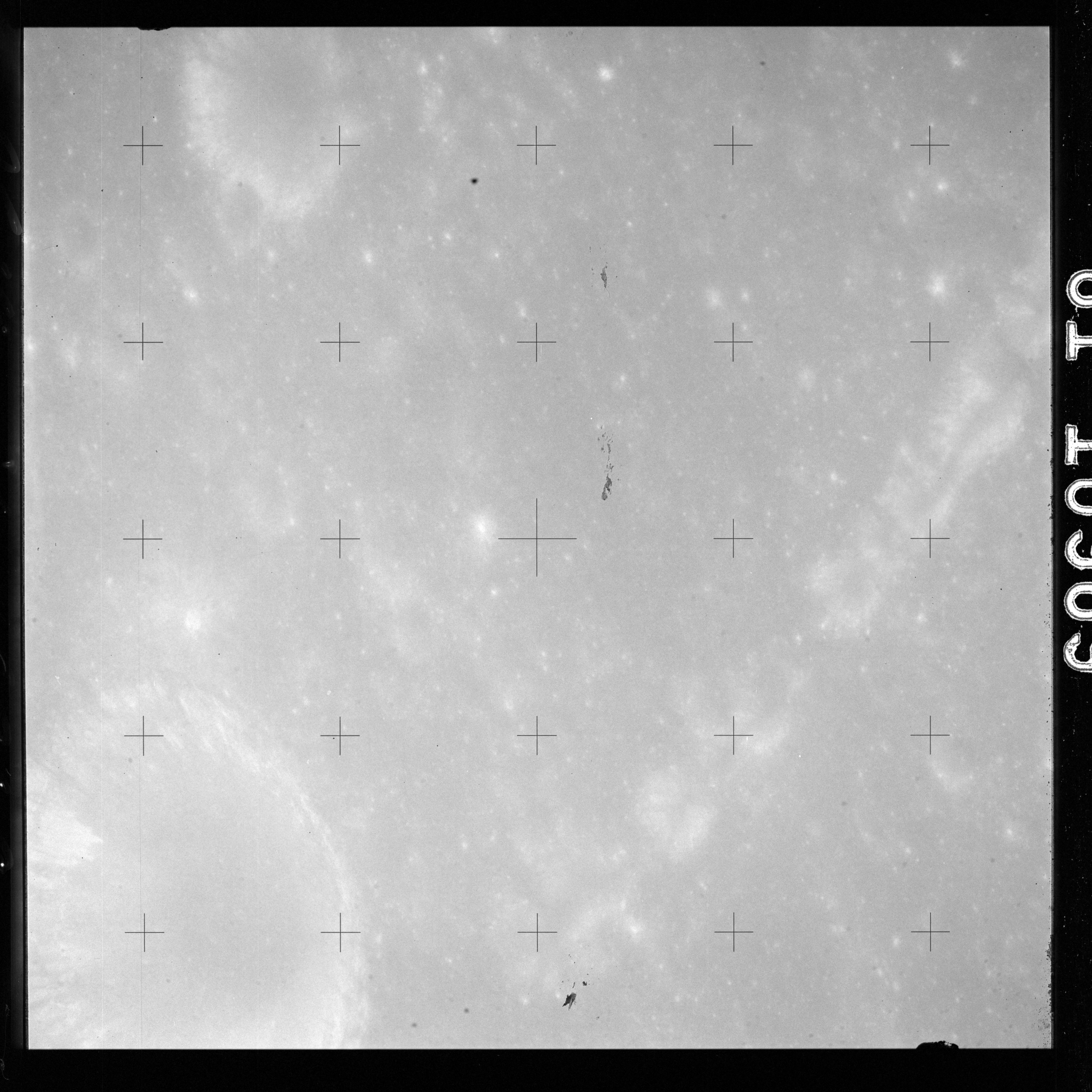 They have two Hasselblad cameras in use. One has a Réseau glass plate fitted which imprints crosses on the photographs for photogrammetry purposes. It has magazine QQ attached loaded with black and white film adn its current lens is a 500-mm telephoto. The other camera has magazine O with colour film (Ektachrome) and a 250-mm medium telephoto lens. It has no Réseau plate fitted. During a sequence of 19 images taken with the latter combination just before AOS, AS15-97-13175 to 13193, they will photograph target number 10 as given in the Flight Plan, the ancient 130-km crater Sklodowska.