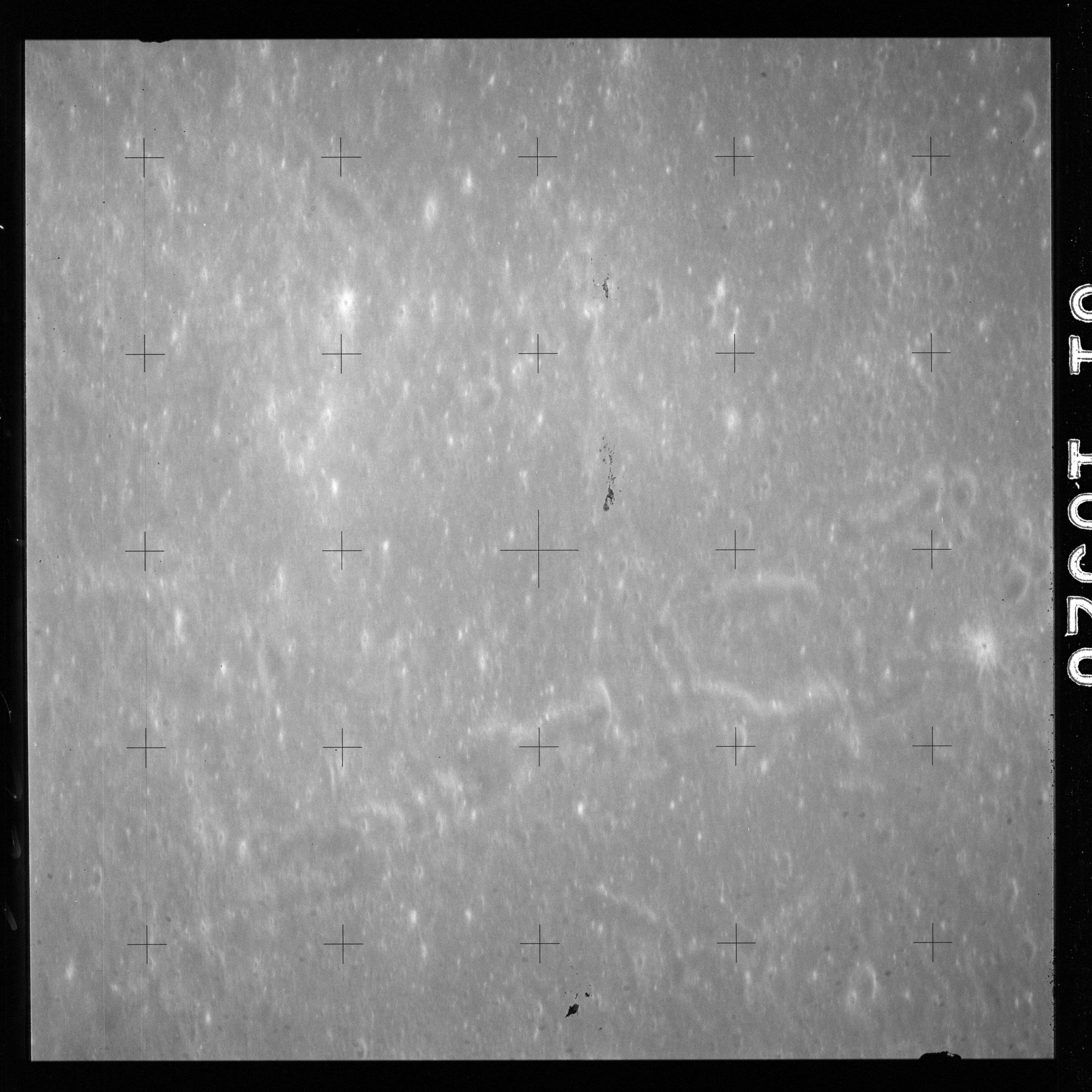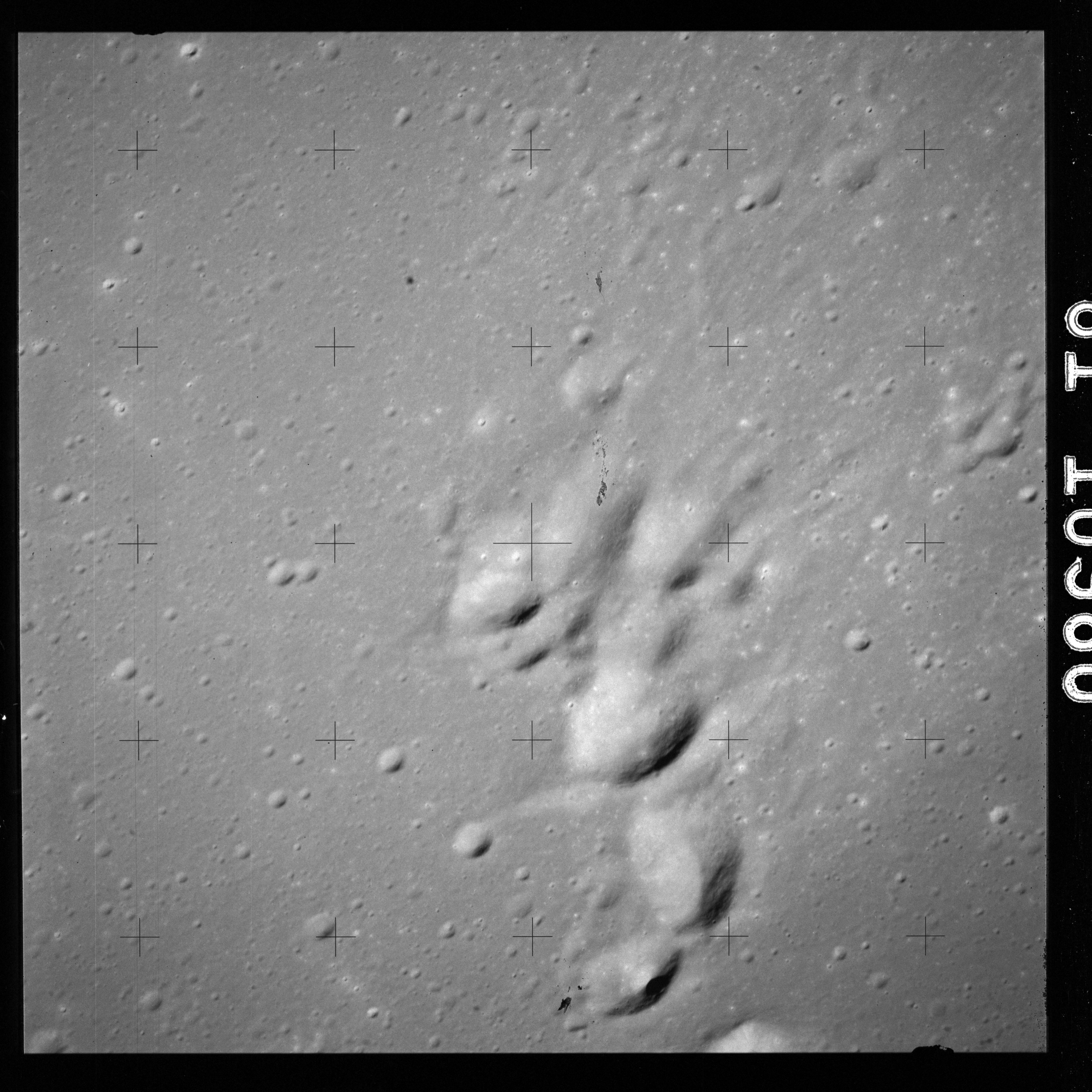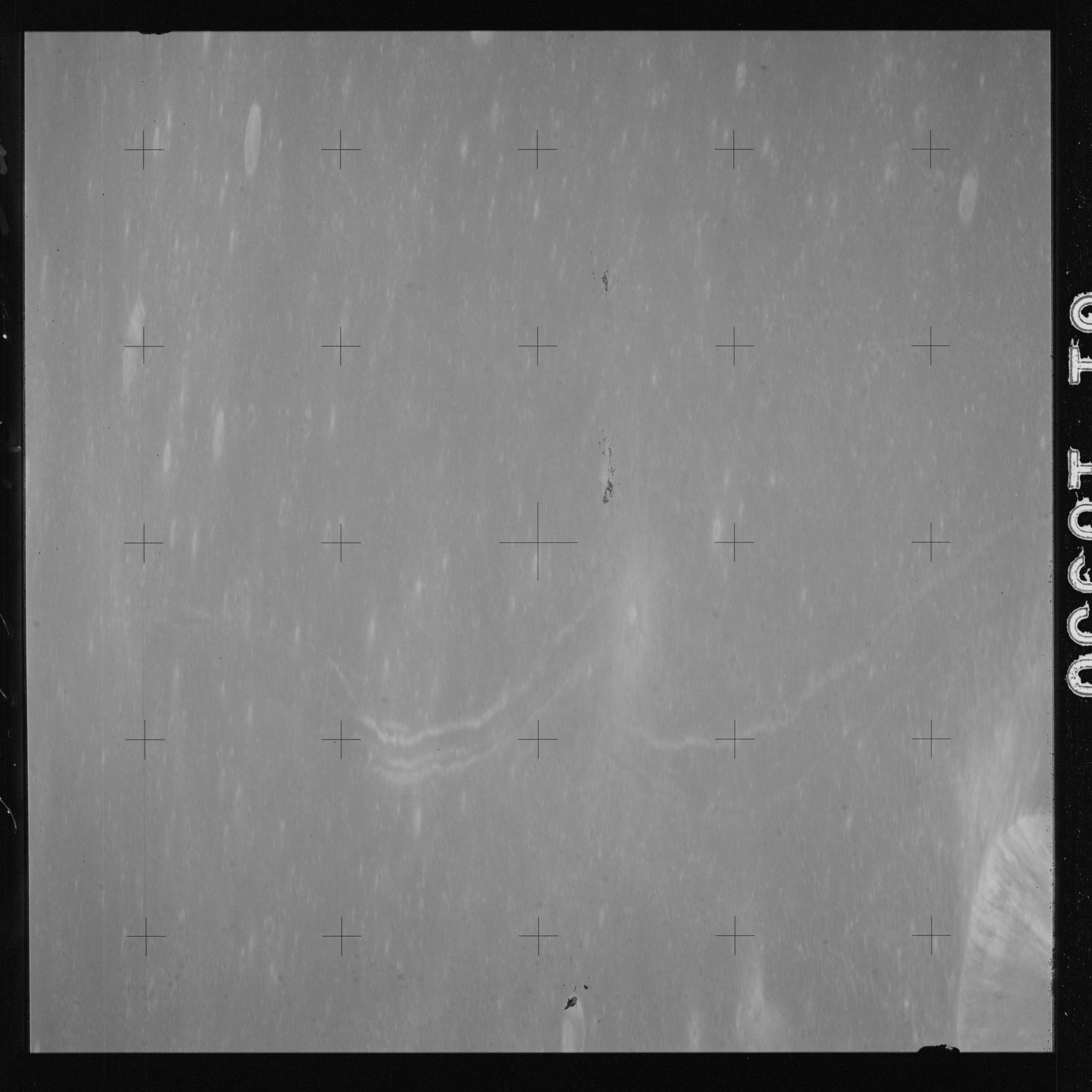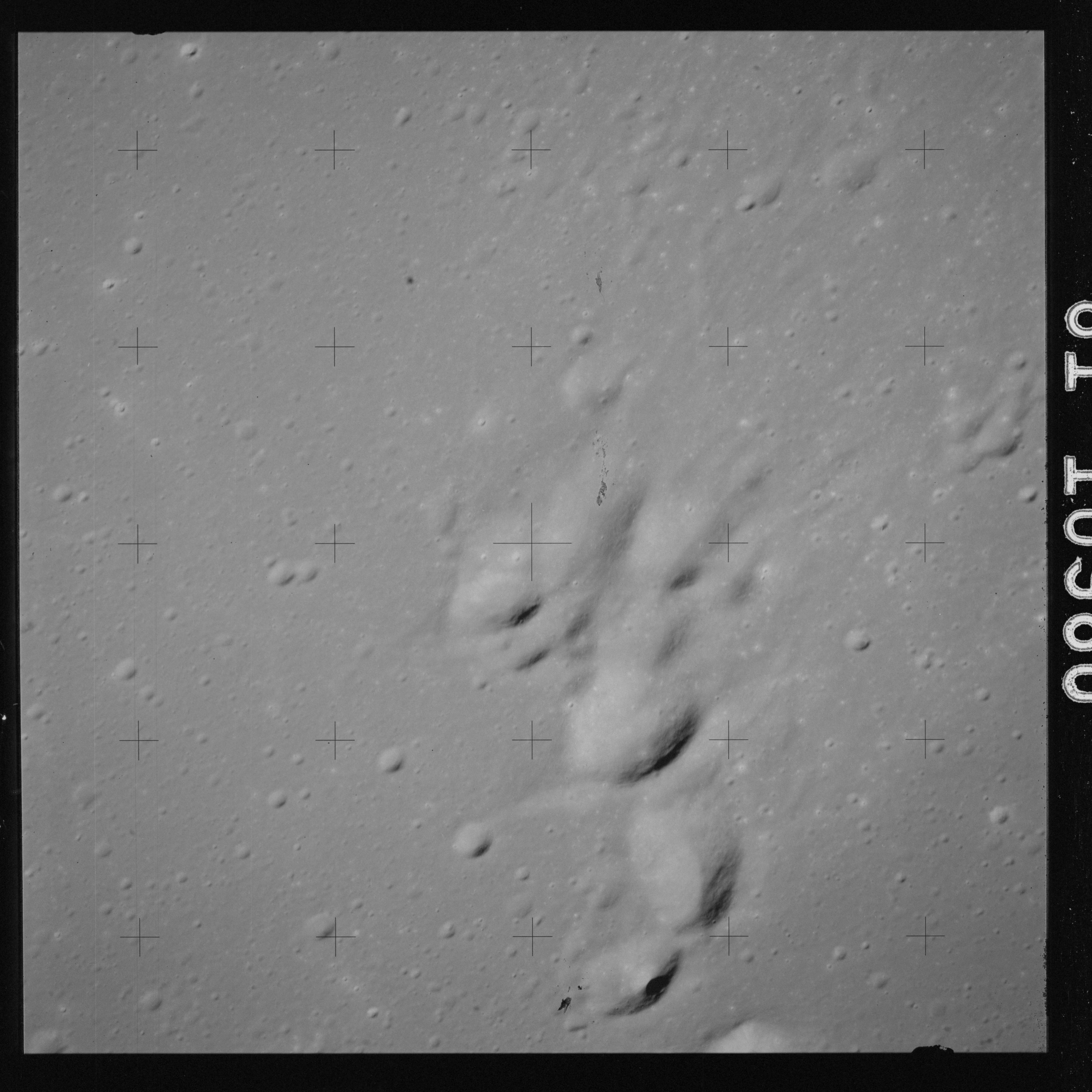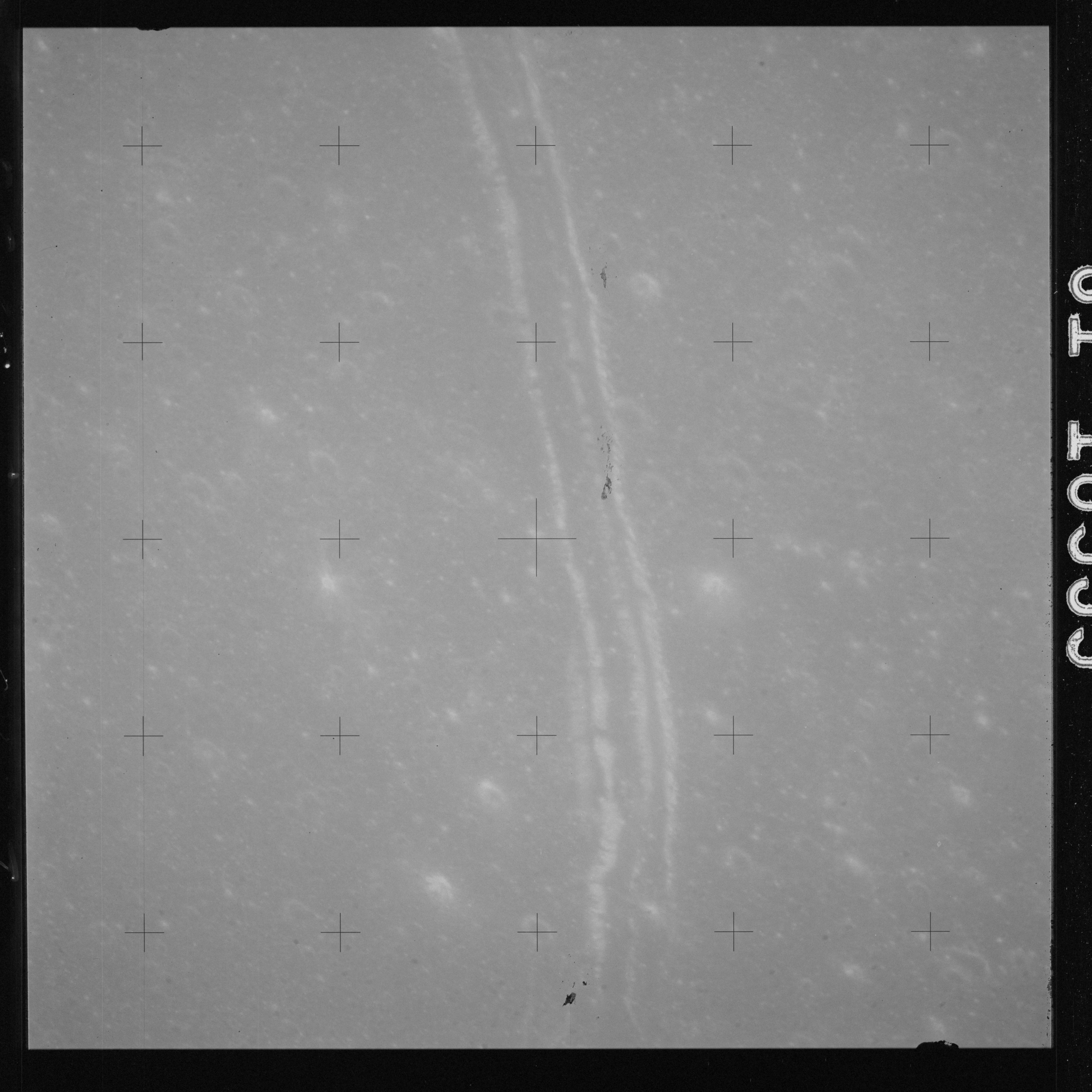 They have two Hasselblad cameras in use. One has a Réseau glass plate fitted which imprints crosses on the photographs for photogrammetry purposes. It has magazine QQ attached loaded with black and white film adn its current lens is a 500-mm telephoto. The other camera has magazine O with colour film (Ektachrome) and a 250-mm medium telephoto lens. It has no Réseau plate fitted. During a sequence of 19 images taken with the latter combination just before AOS, AS15-97-13175 to 13193, they will photograph target number 10 as given in the Flight Plan, the ancient 130-km crater Sklodowska.