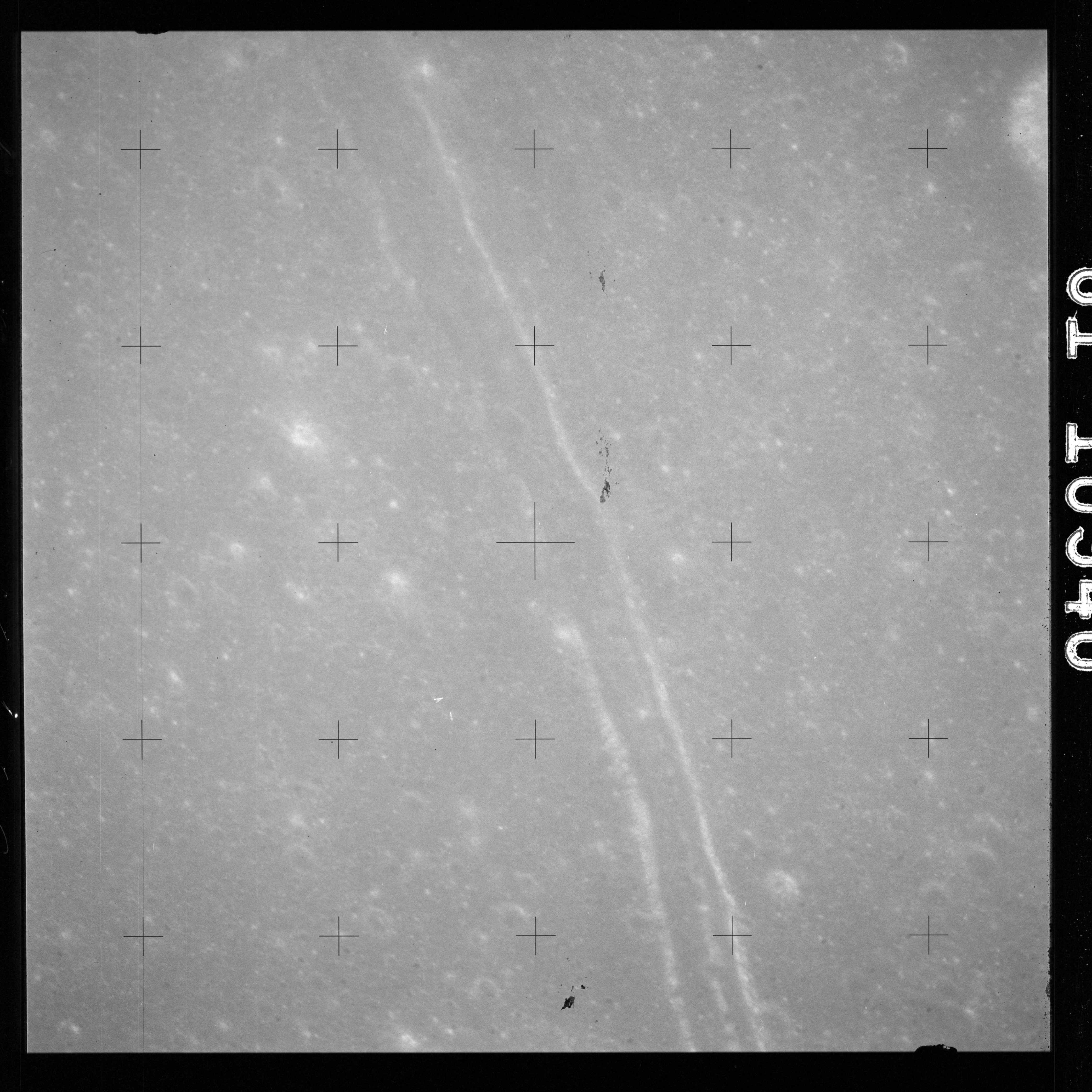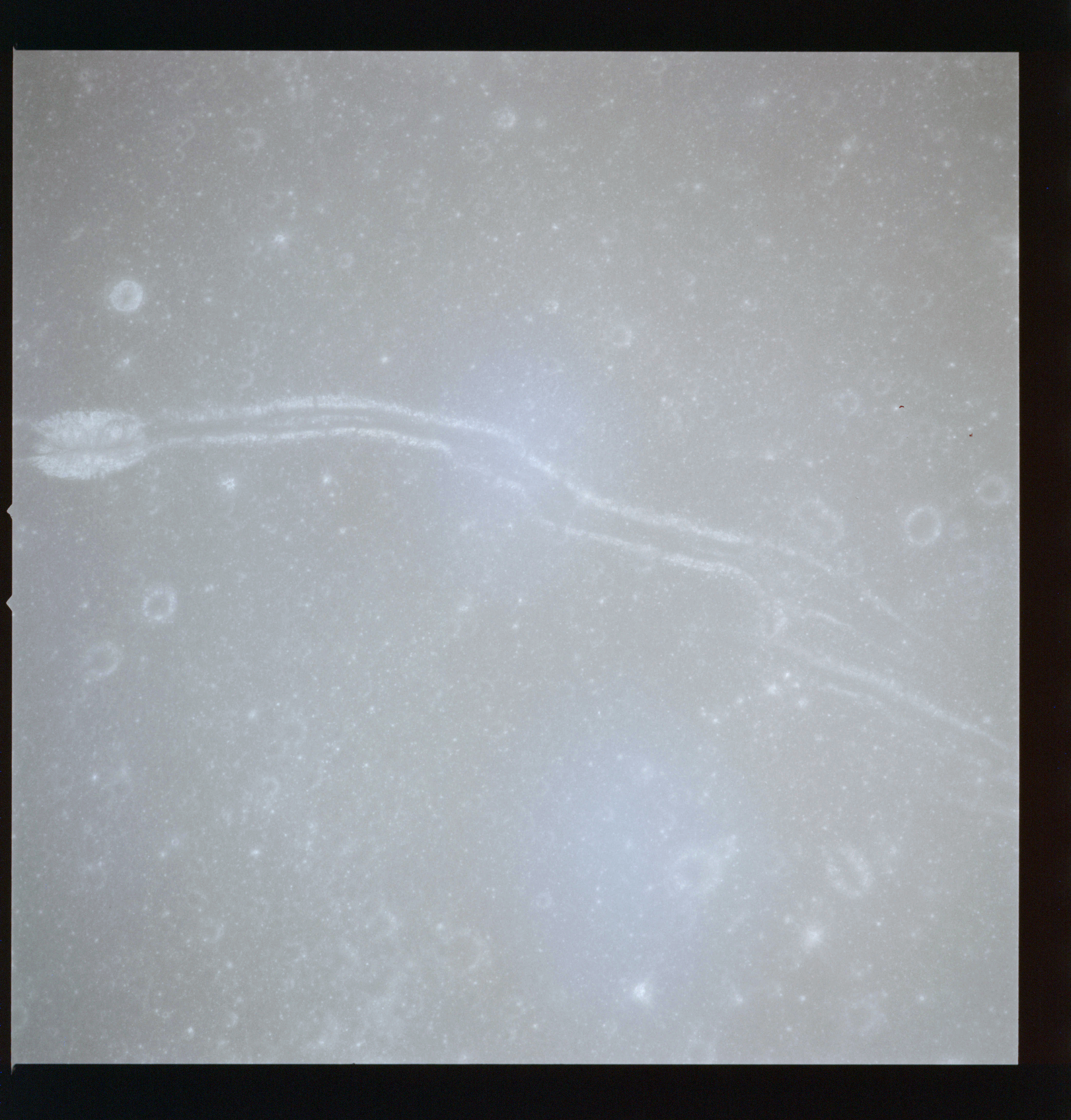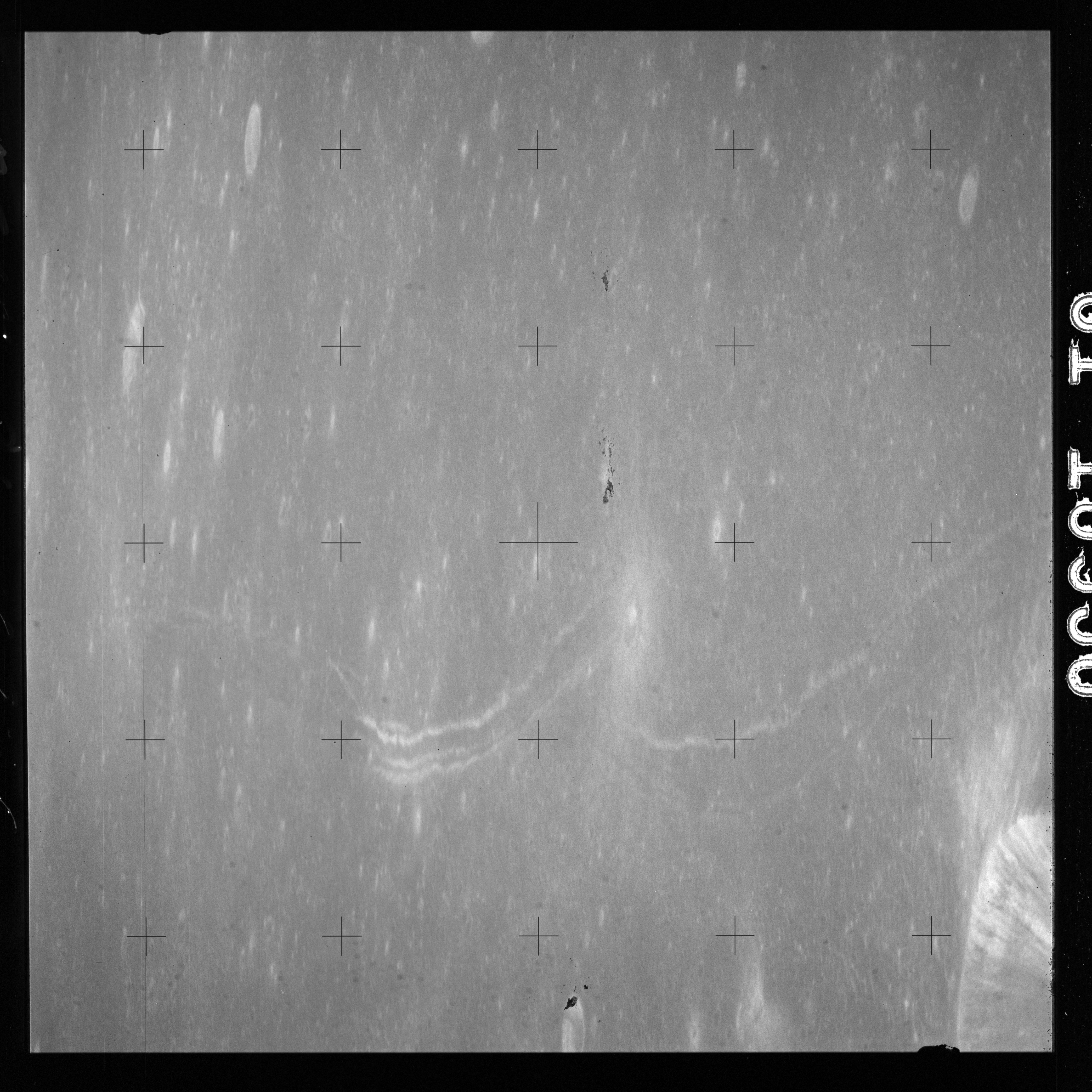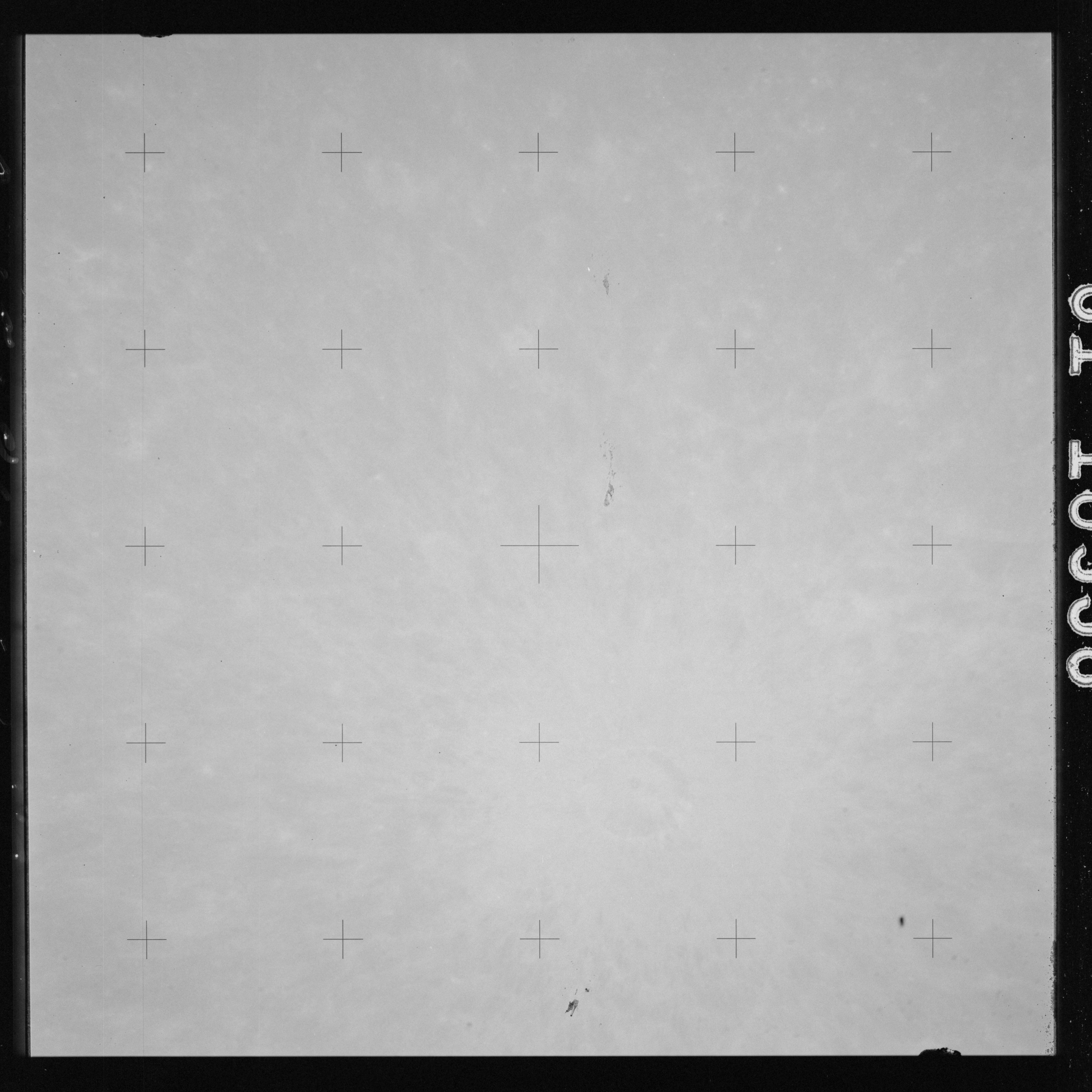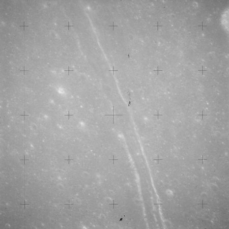They have two Hasselblad cameras in use. One has a Réseau glass plate fitted which imprints crosses on the photographs for photogrammetry purposes. It has magazine QQ attached loaded with black and white film adn its current lens is a 500-mm telephoto. The other camera has magazine O with colour film (Ektachrome) and a 250-mm medium telephoto lens. It has no Réseau plate fitted. During a sequence of 19 images taken with the latter combination just before AOS, AS15-97-13175 to 13193, they will photograph target number 10 as given in the Flight Plan, the ancient 130-km crater Sklodowska.