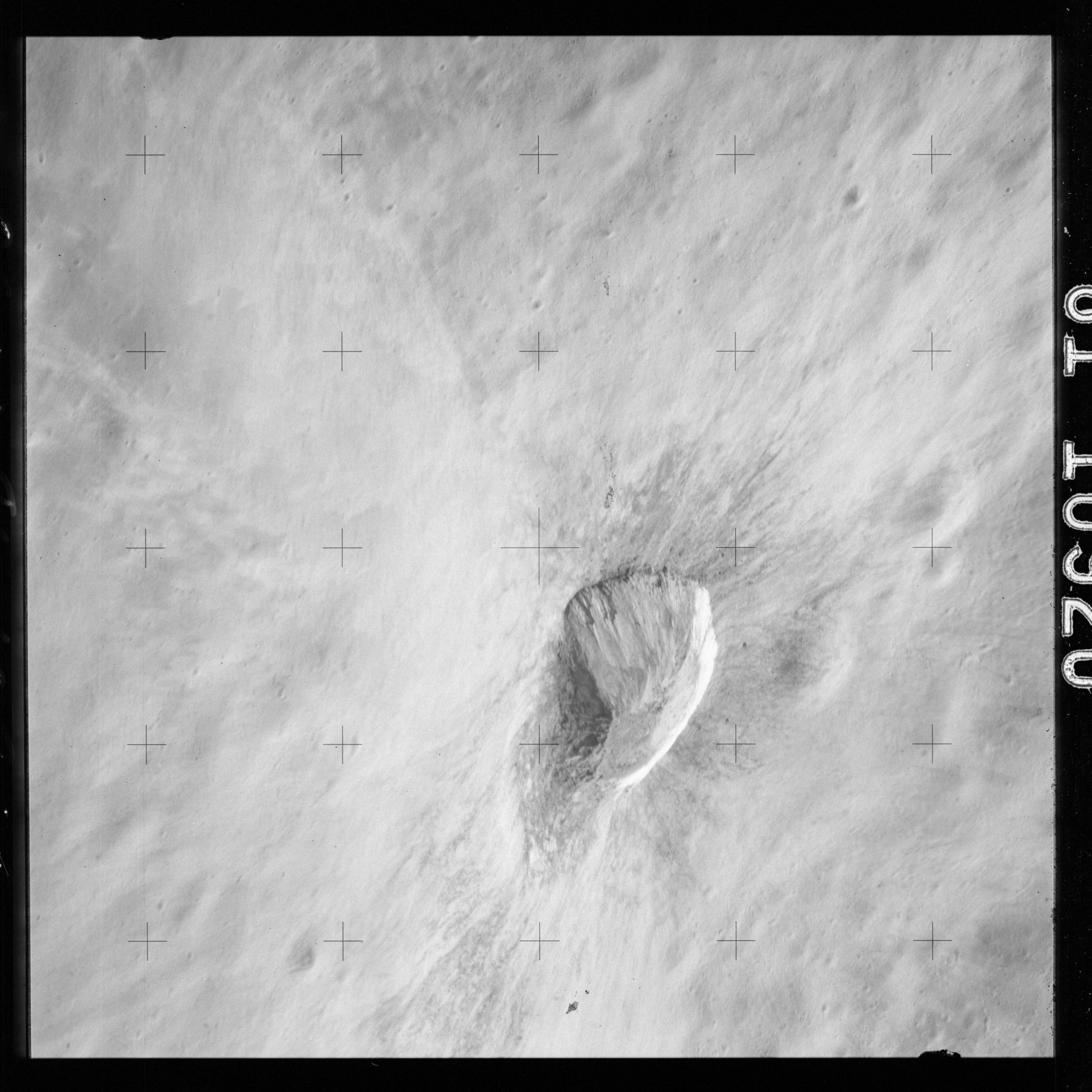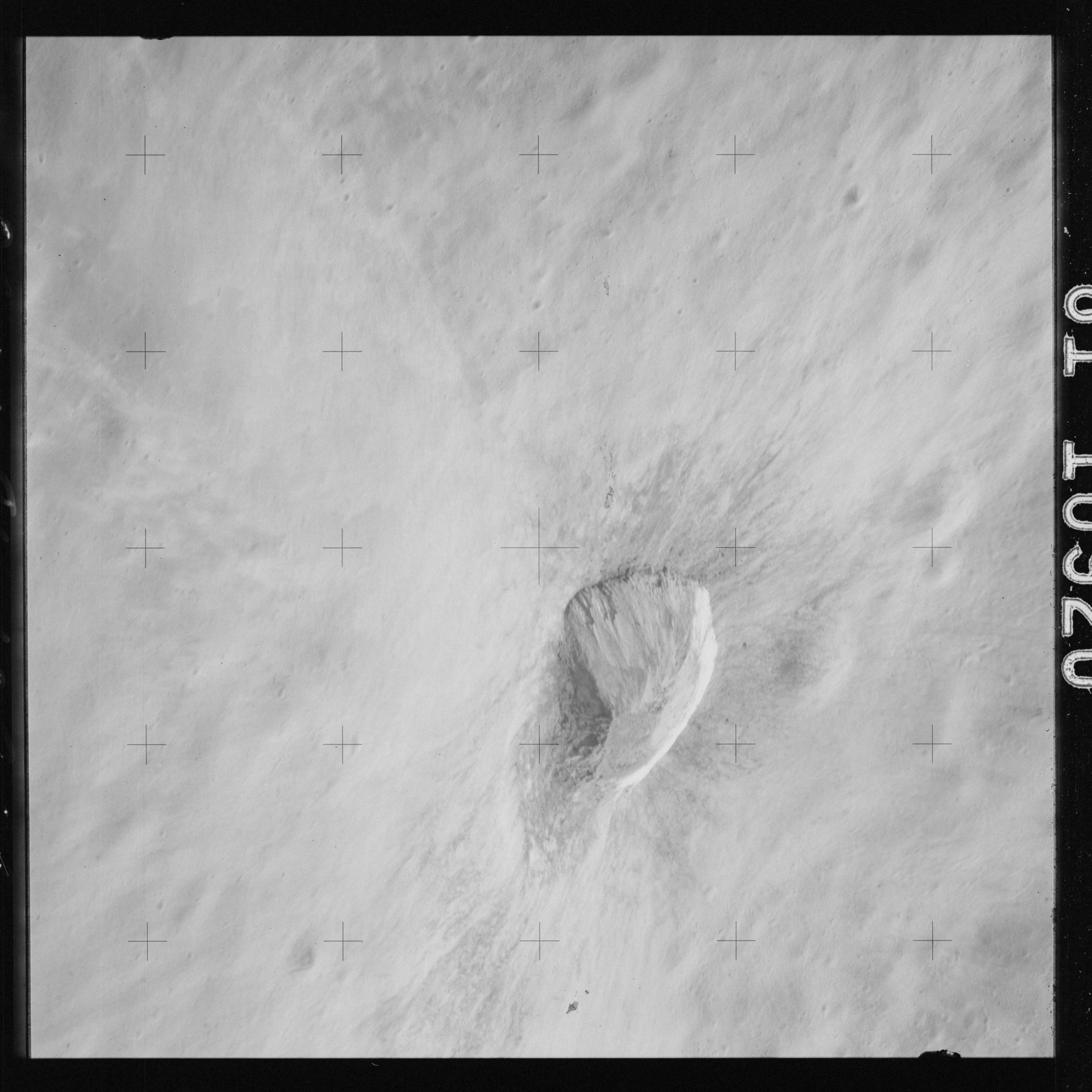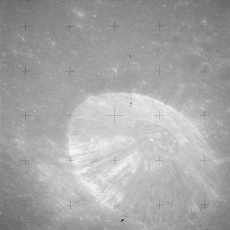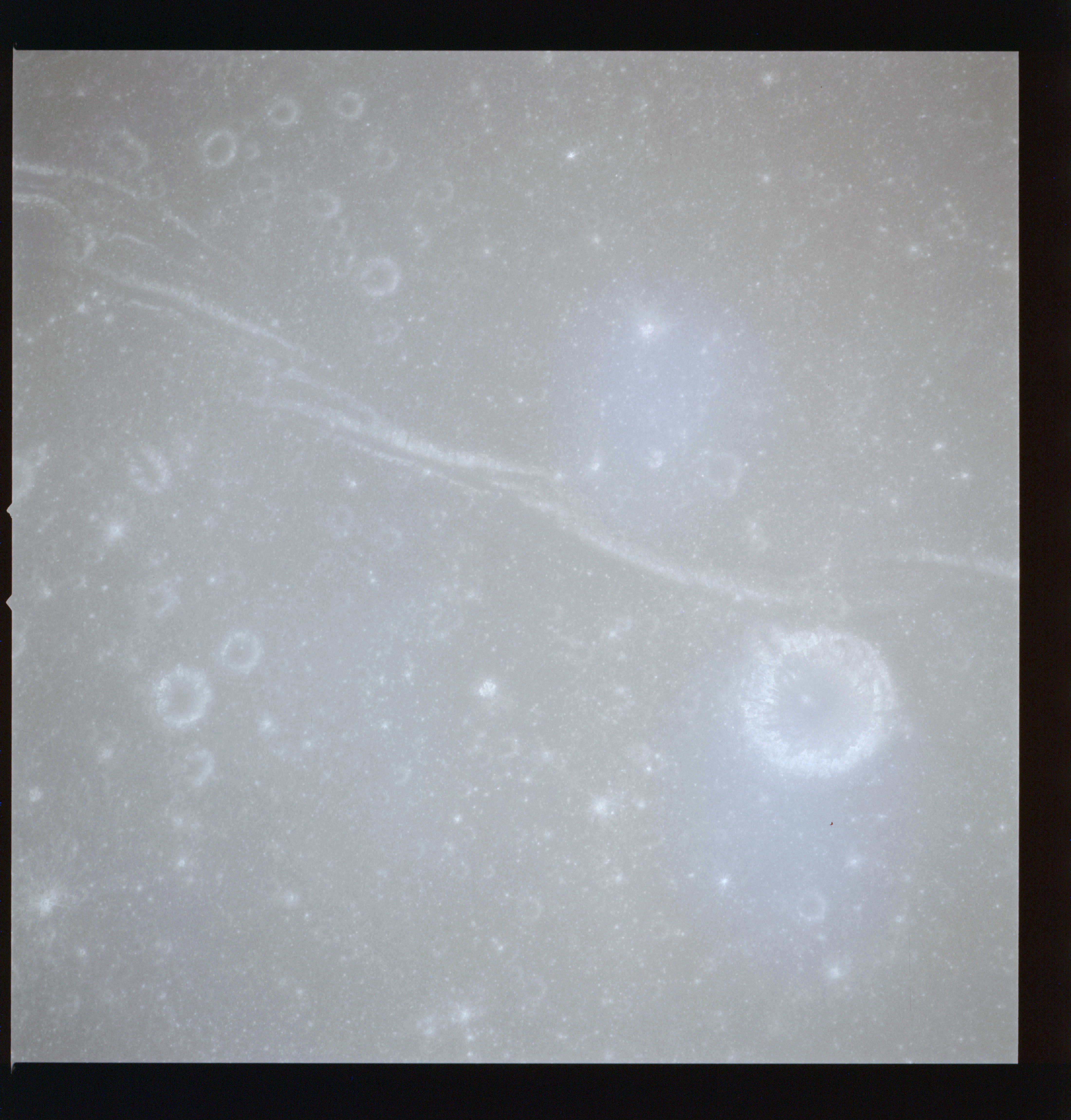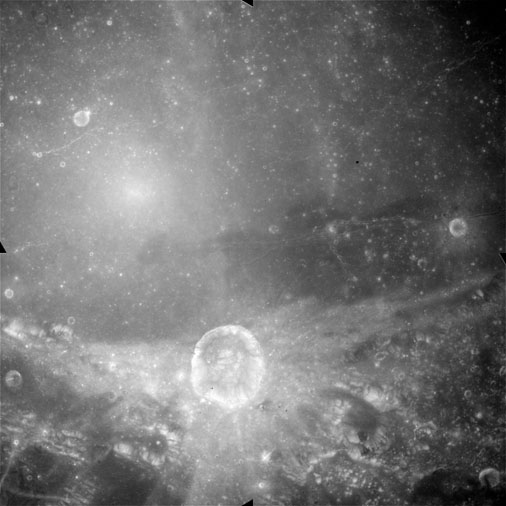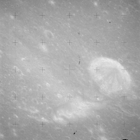 To the right of AS15-90-12283 is the exceptionally bright ray system of Censorinus, a small (3.8 kilometres) but highly visible crater which is considered by Earth observers as a useful landmark for timing the progress of lunar eclipses when Earth's shadow slowly moves across the Moon's disk. It is named after a Roman astronomer, circa 238 AD.