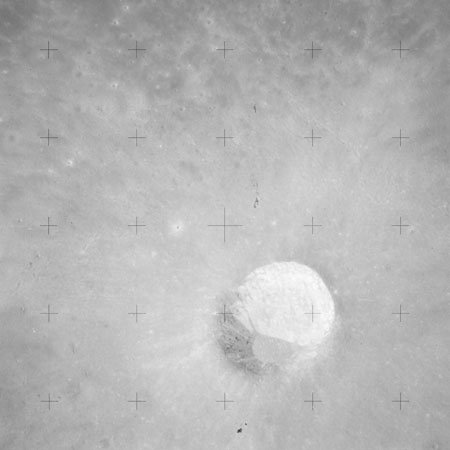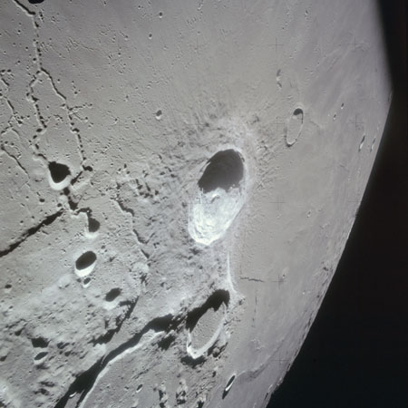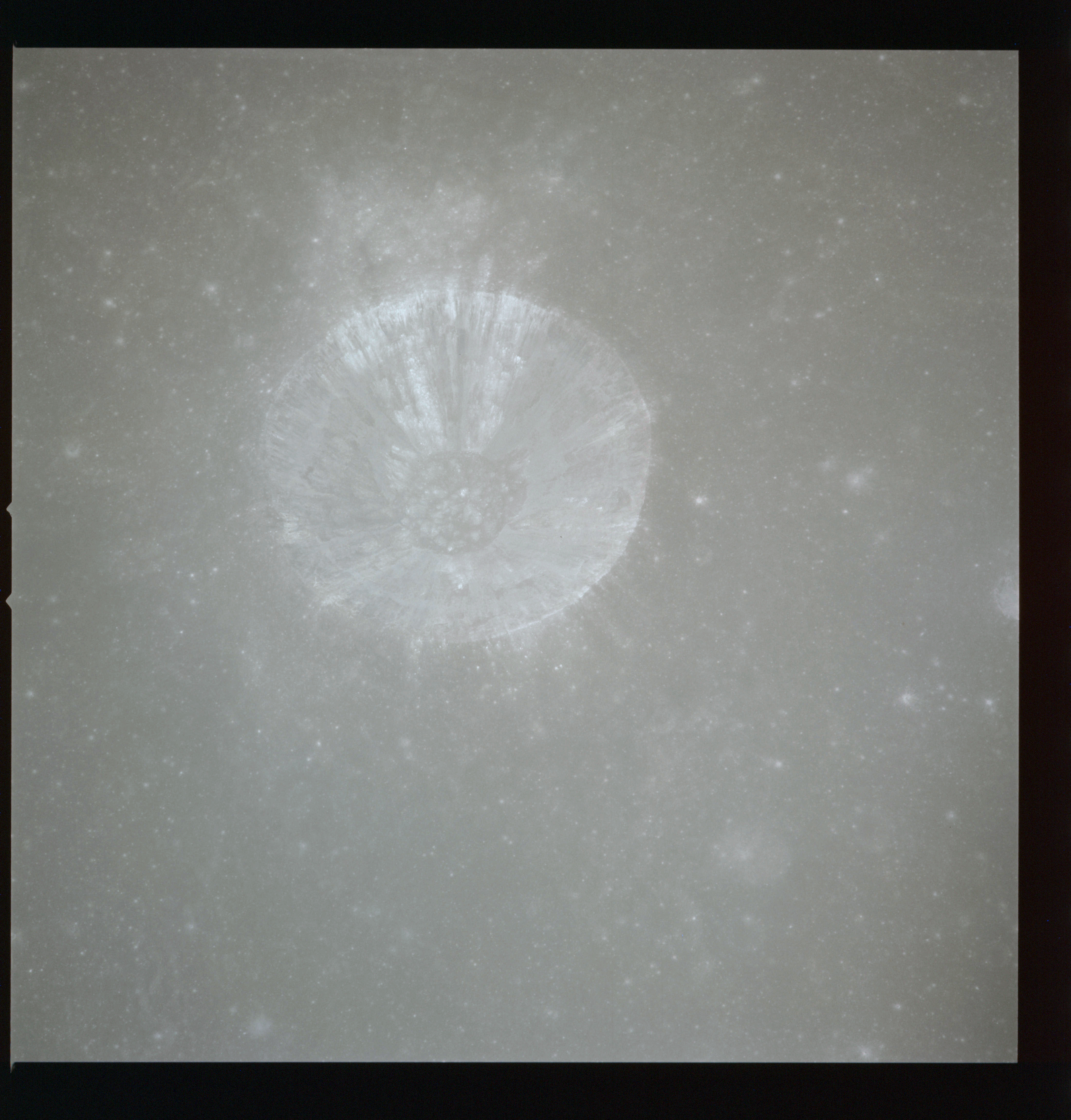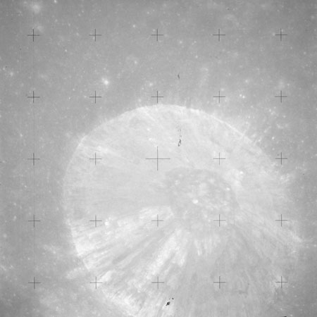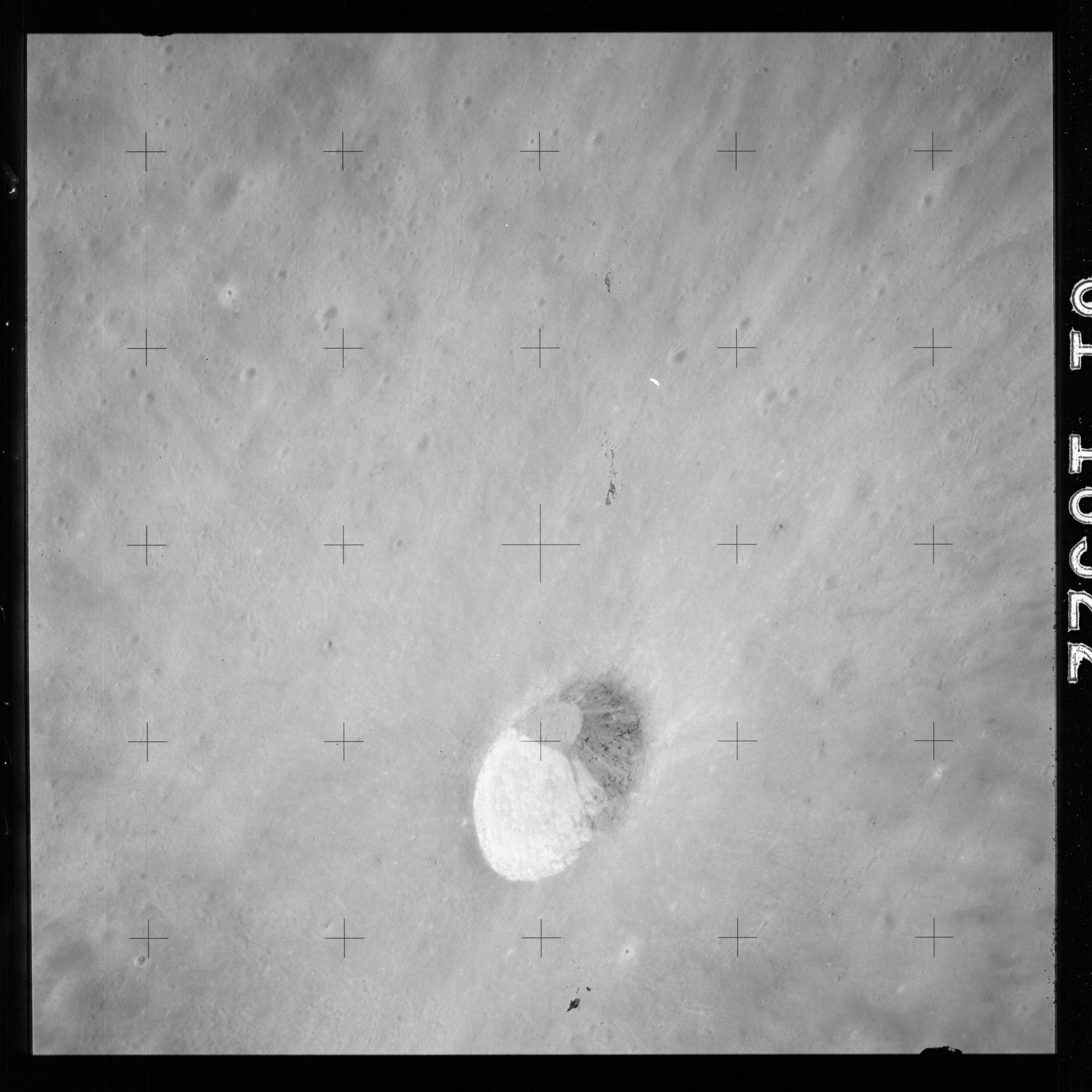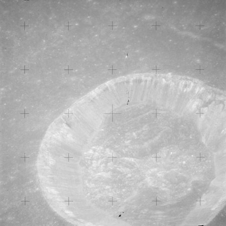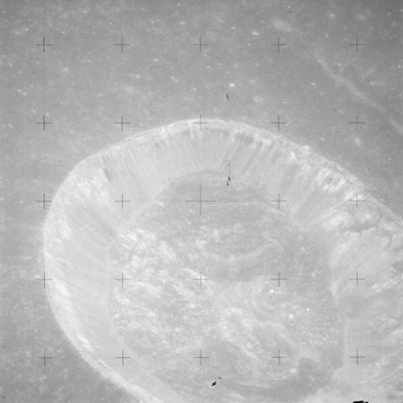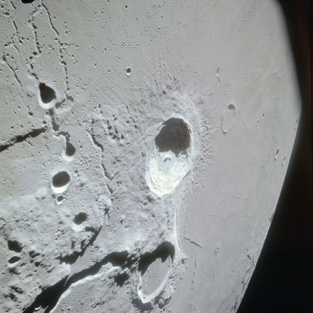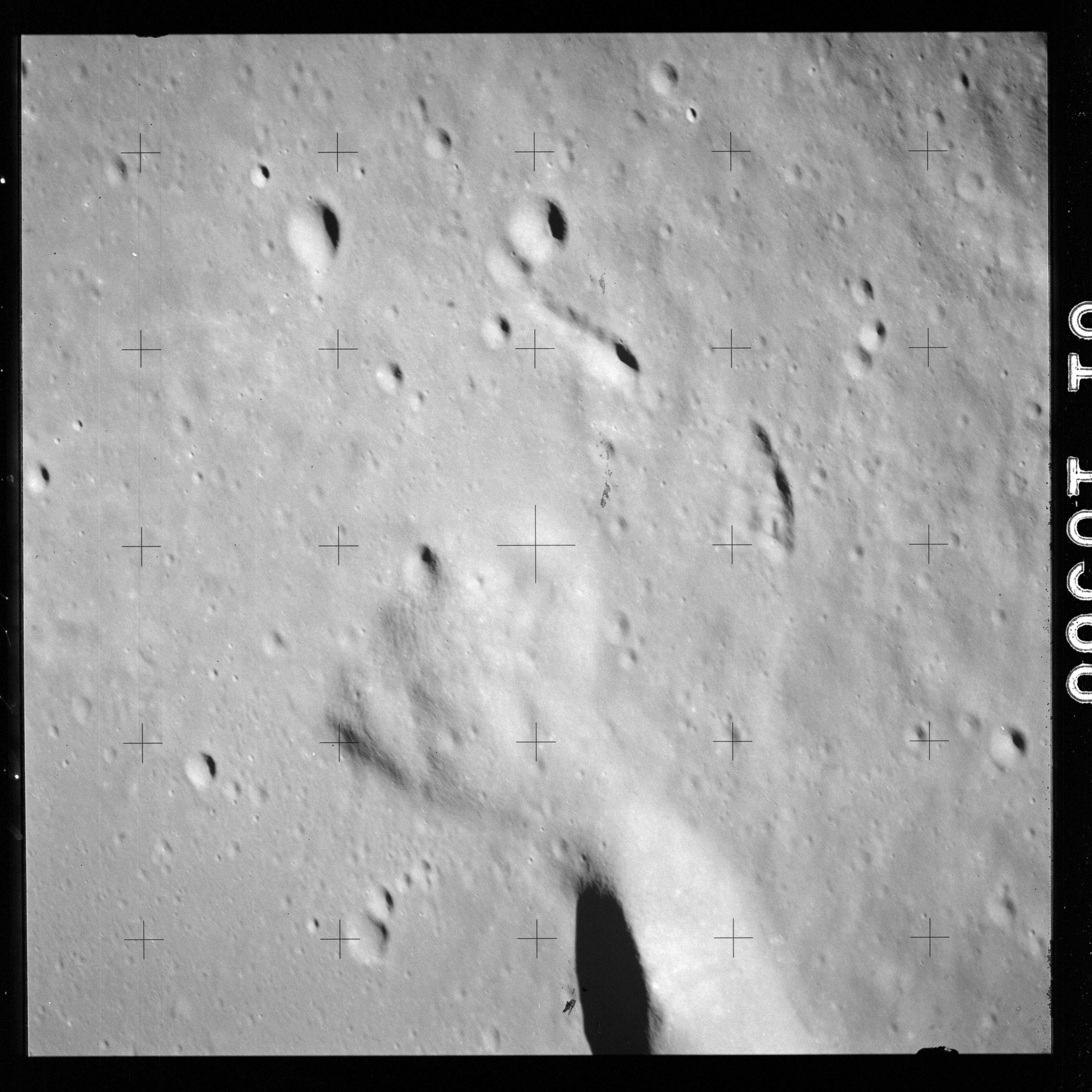 To the right of AS15-90-12283 is the exceptionally bright ray system of Censorinus, a small (3.8 kilometres) but highly visible crater which is considered by Earth observers as a useful landmark for timing the progress of lunar eclipses when Earth's shadow slowly moves across the Moon's disk. It is named after a Roman astronomer, circa 238 AD.