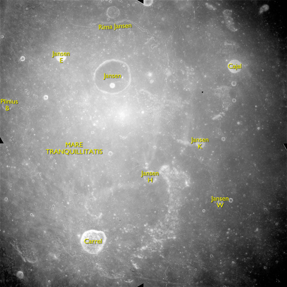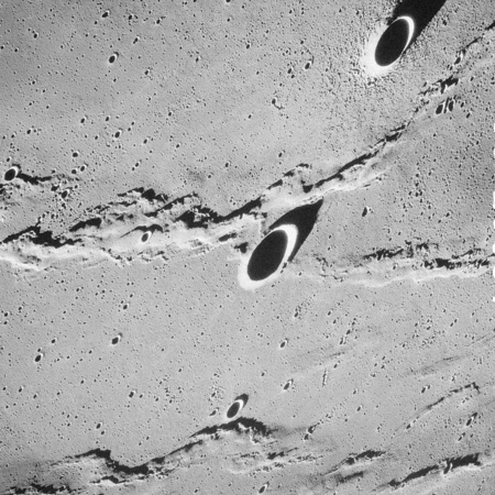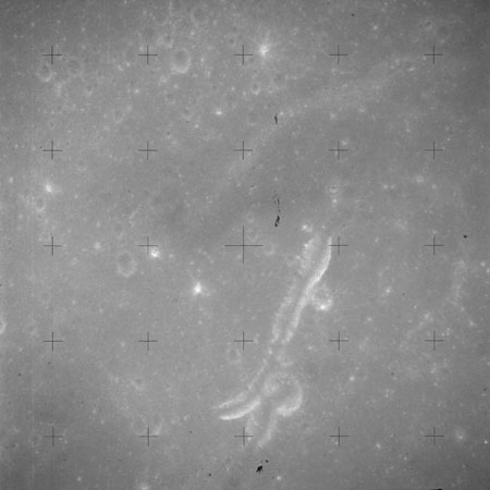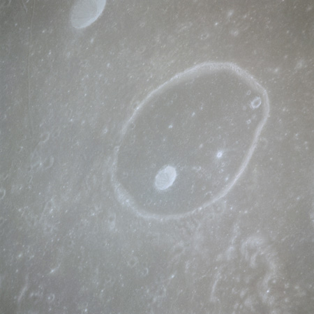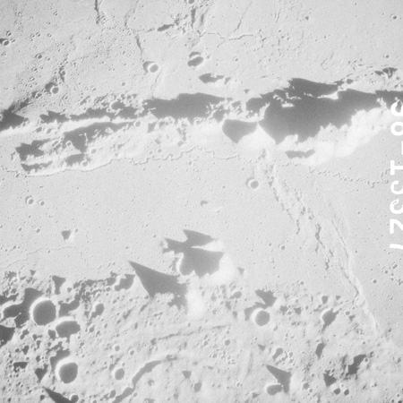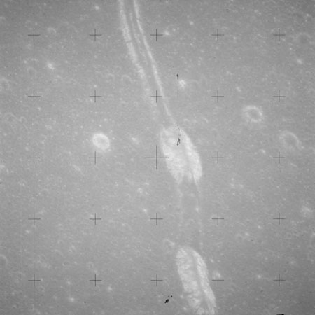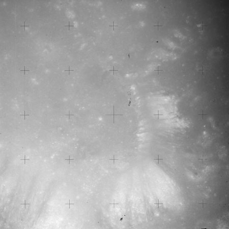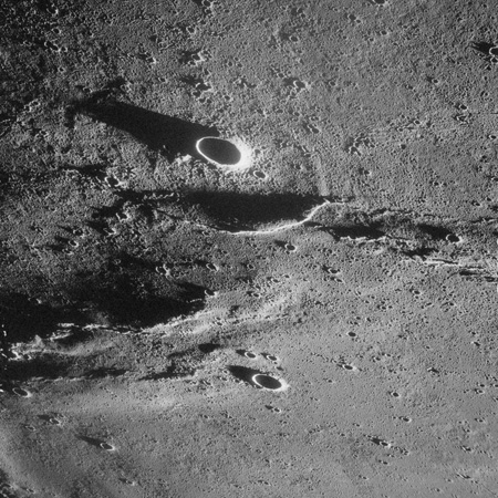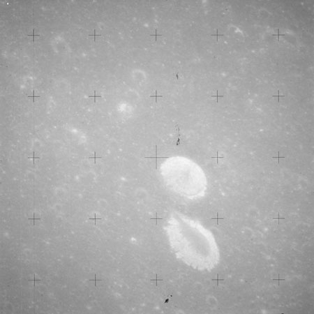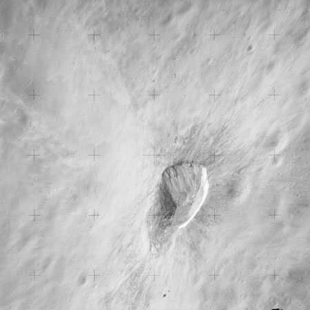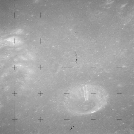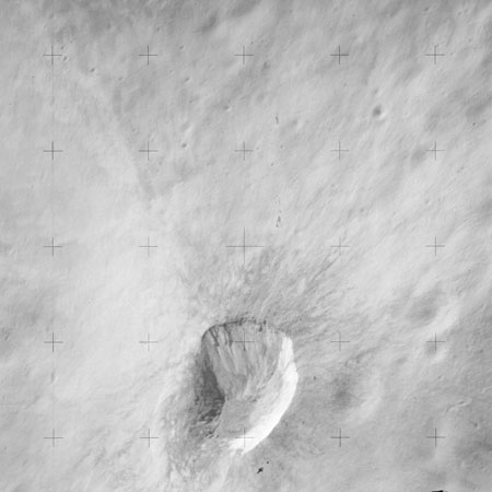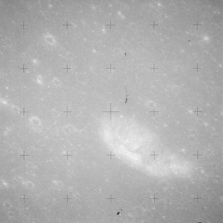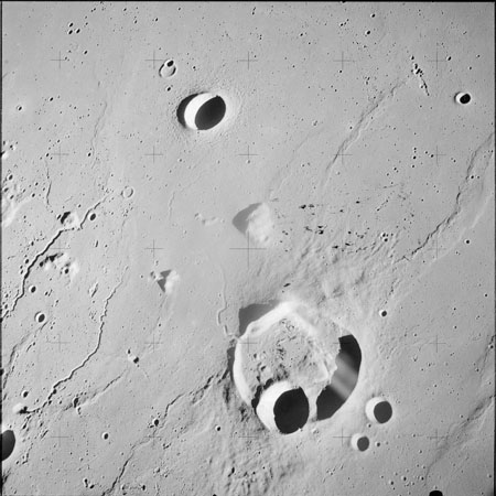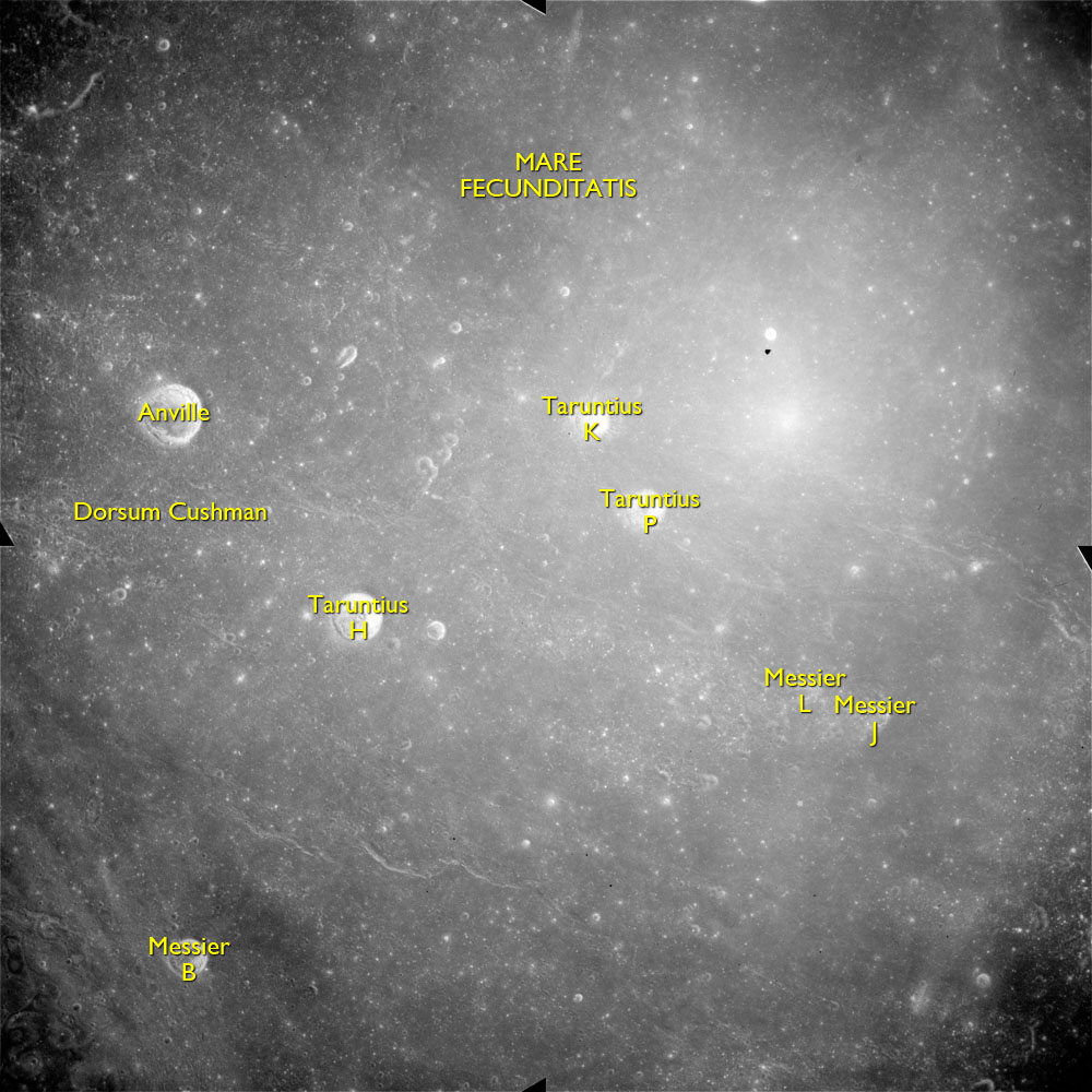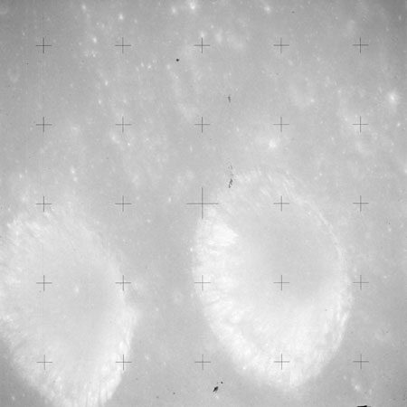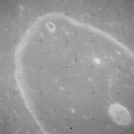 The double rays sprayed across the mare surface radiate from a well-known pair of craters, the Messier Twins, named after the French astronomer, Charles Messier, 1730-1817, whose catalogue of fuzzy objects in the night sky has made his name synonymous with galaxies, nebulae and the amateur astronomer's desire to view as many of them as possible. The crater pair, actually known as Messier and Messier A, are very unusual in that both are quite oval in shape with their long axes aligned with each other and with the striking double ray seen in this photograph. It is almost certain that they originated in a most unusual, highly oblique impact, probably of a small double asteroid. It is known that a substantial number of asteroids are to be found in loose formation with one another, gently orbiting around their common centre-of-gravity. Left of centre and outlined in a light colour is Lubbock, a 14.5-km crater named after John Lubbock, 1803-1865, an English mathematician.