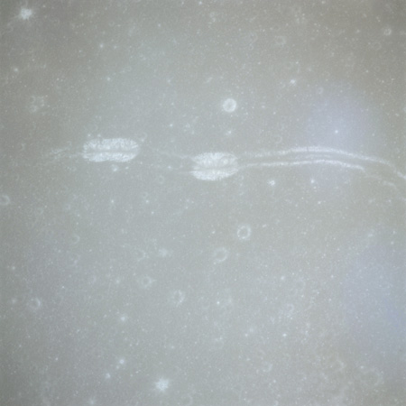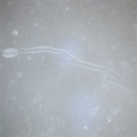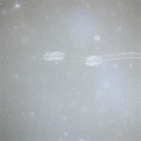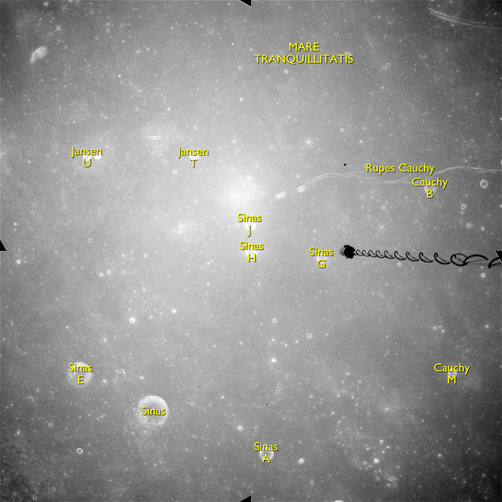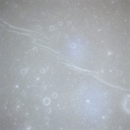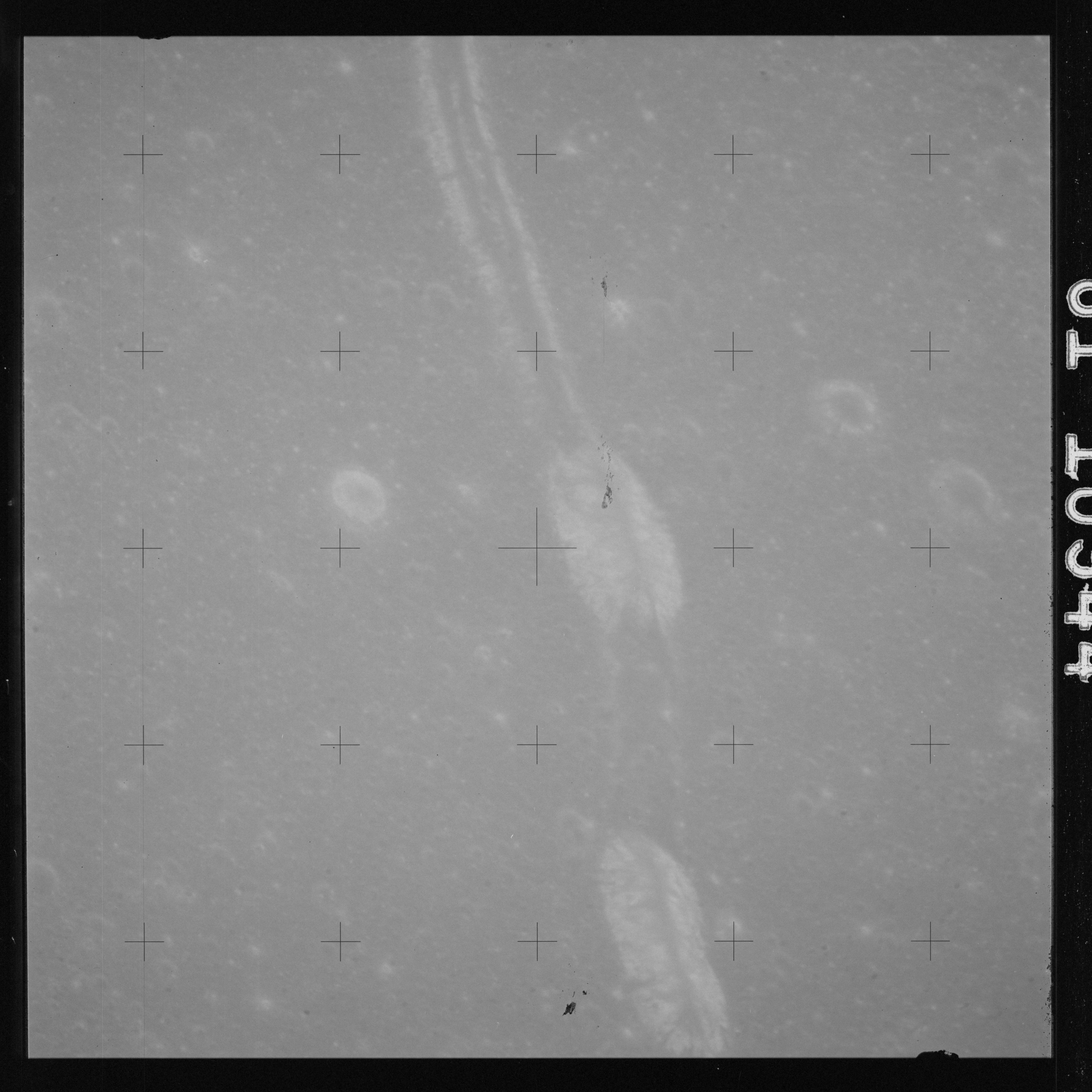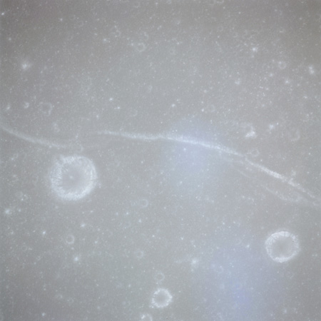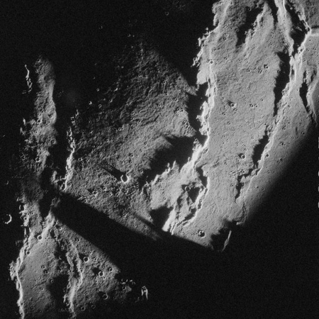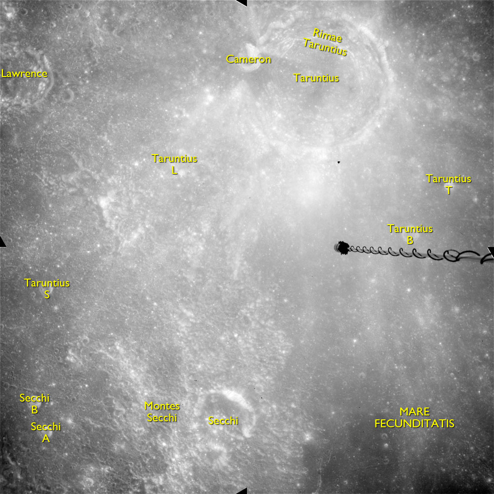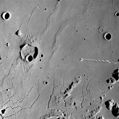 The double rays sprayed across the mare surface radiate from a well-known pair of craters, the Messier Twins, named after the French astronomer, Charles Messier, 1730-1817, whose catalogue of fuzzy objects in the night sky has made his name synonymous with galaxies, nebulae and the amateur astronomer's desire to view as many of them as possible. The crater pair, actually known as Messier and Messier A, are very unusual in that both are quite oval in shape with their long axes aligned with each other and with the striking double ray seen in this photograph. It is almost certain that they originated in a most unusual, highly oblique impact, probably of a small double asteroid. It is known that a substantial number of asteroids are to be found in loose formation with one another, gently orbiting around their common centre-of-gravity. Left of centre and outlined in a light colour is Lubbock, a 14.5-km crater named after John Lubbock, 1803-1865, an English mathematician.