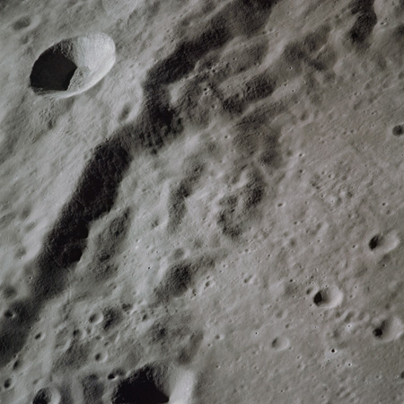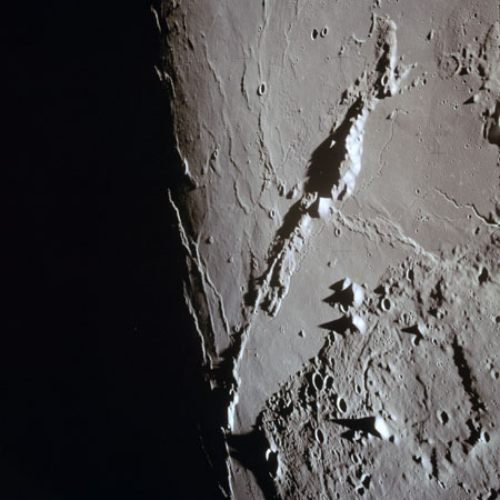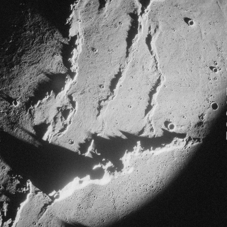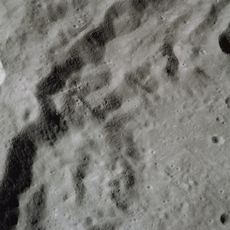 Lubbock is more to the foreground of AS15-90-12280, while beyond it and to the left is Gutenberg. Named after the pioneer of movable type and the printing press, Johann Gutenberg, 1398-1468, this 74-km crater's walls have been heavily intertwined with other large craters. The flooded Gutenberg E breaks up the foreground wall and the bright Gutenberg A punctures the far wall. Rather than having a central peak, Gutenberg's floor displays the beginnings of a central ring.