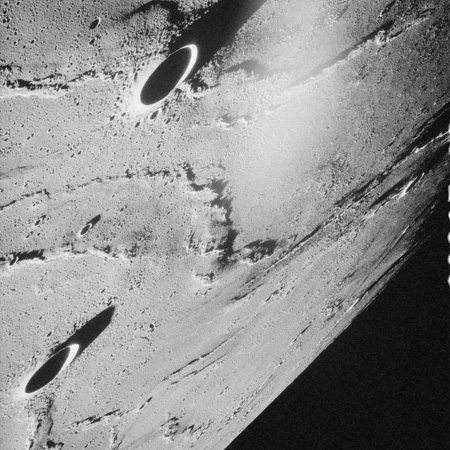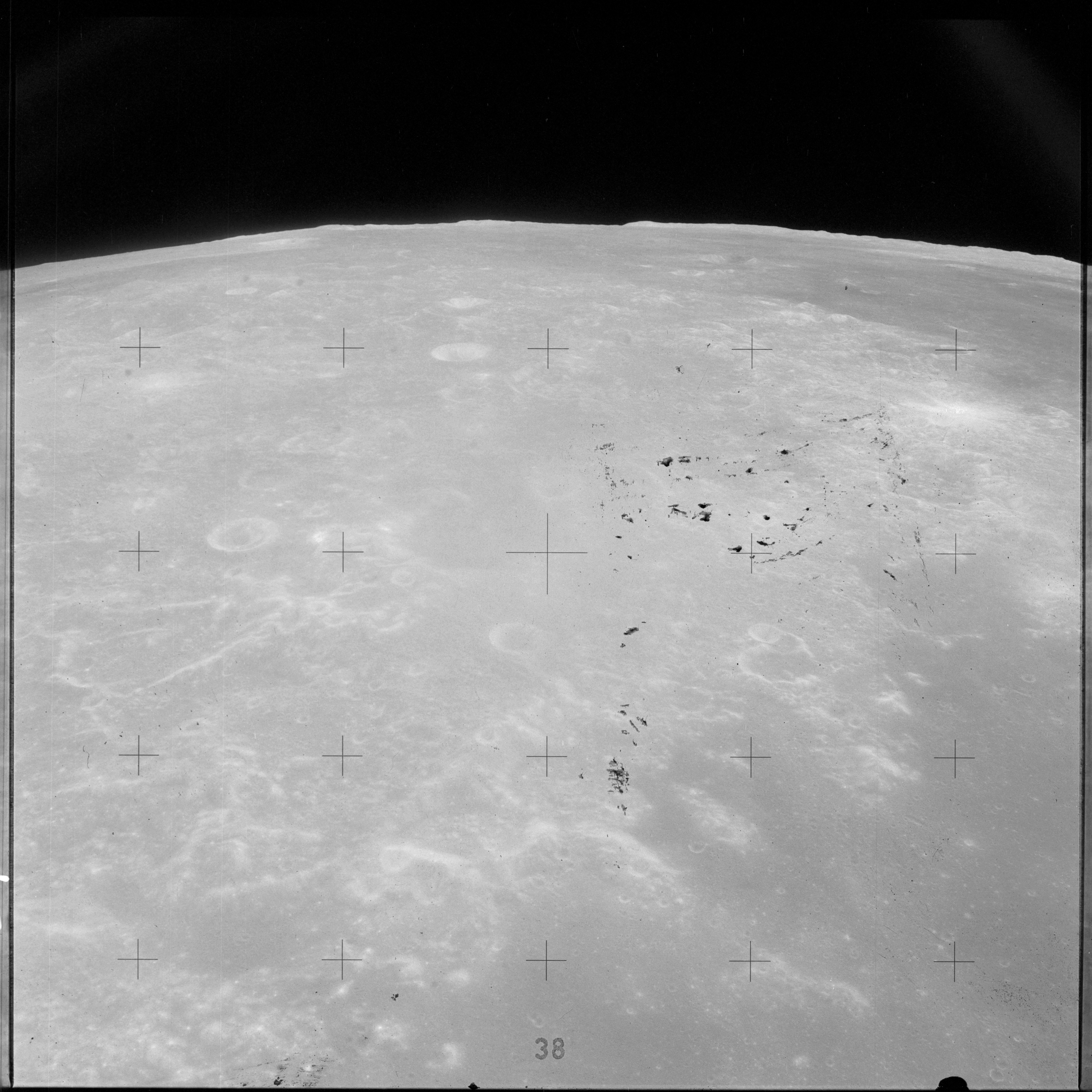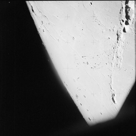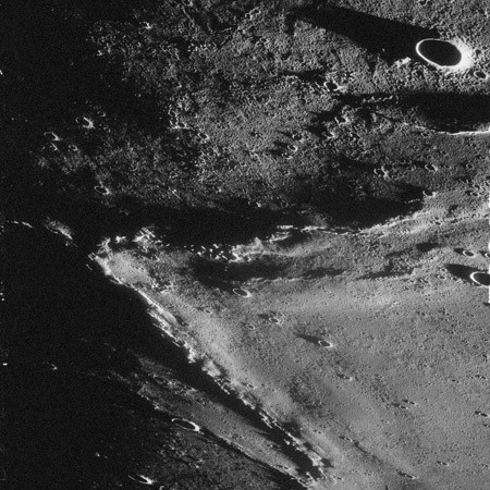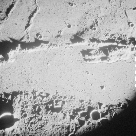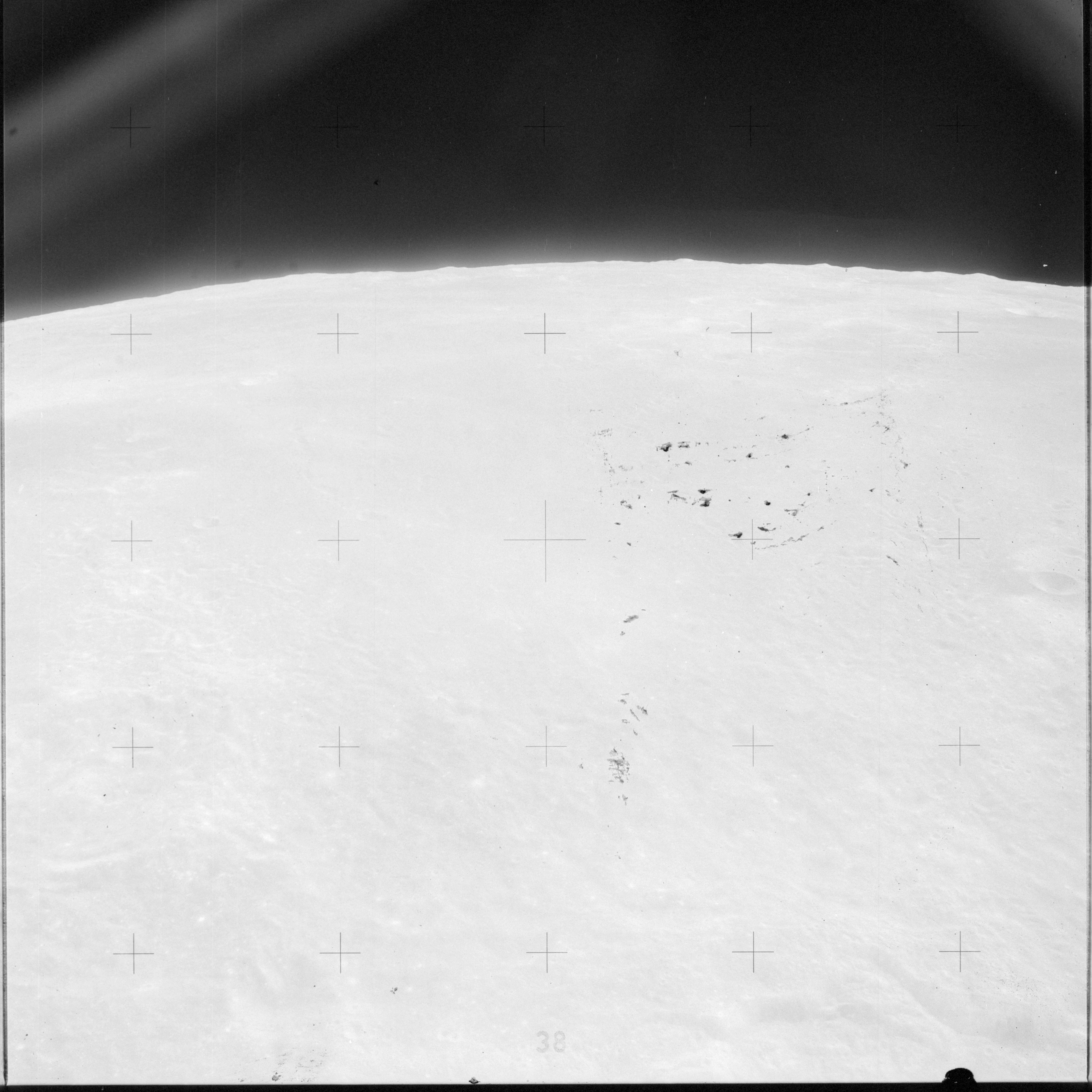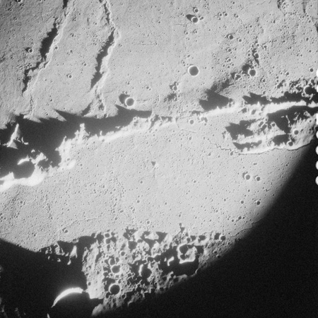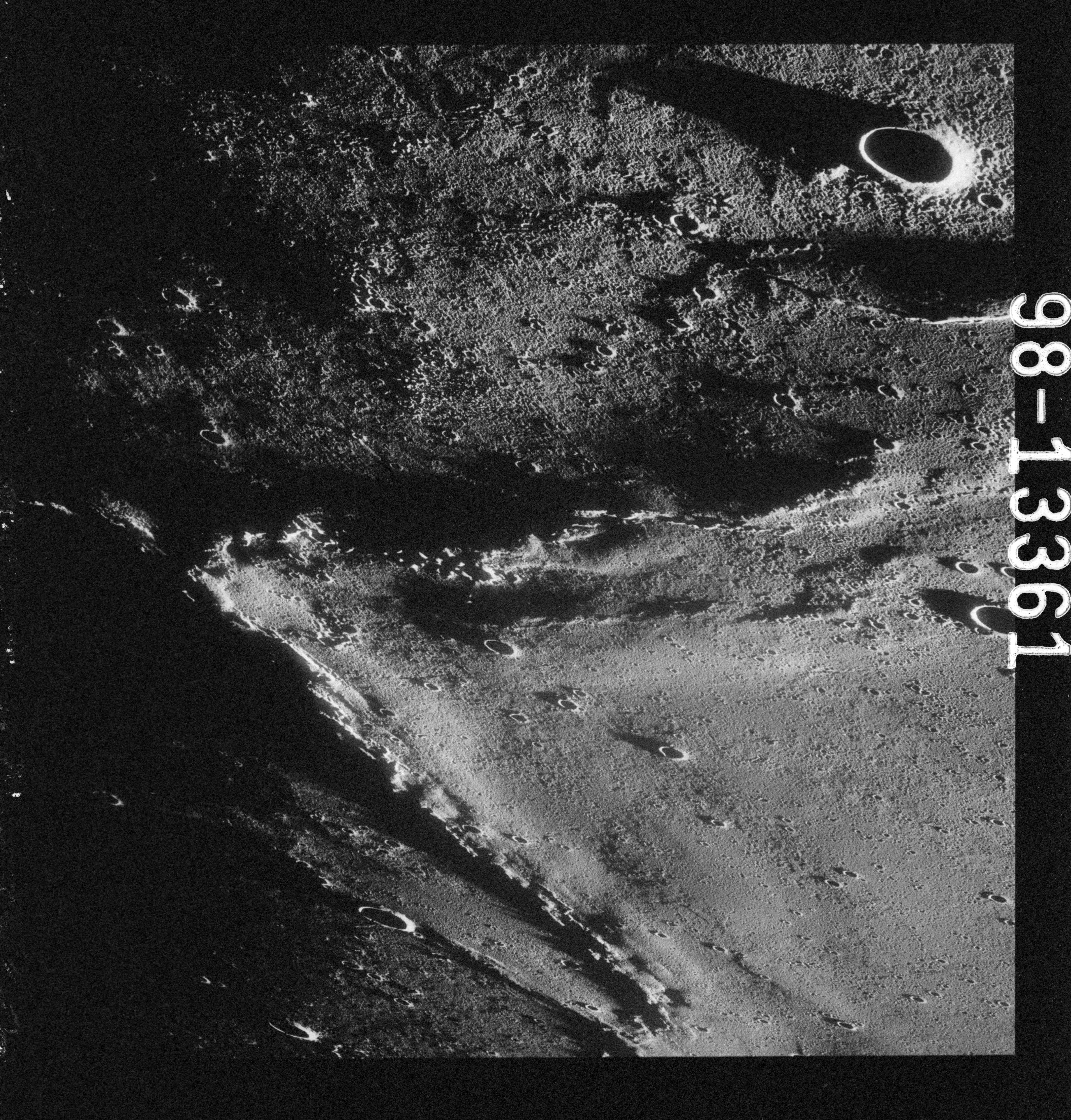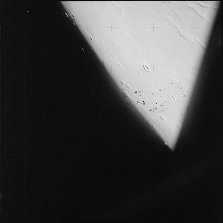Endeavour should reach the sunrise terminator at about 203:27. As they approach and shadows lengthen, and starting at about 203:21, nine photos are taken on magazine PP of the vast expanse of Oceanus Procellarum.