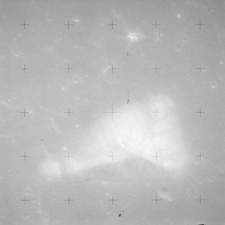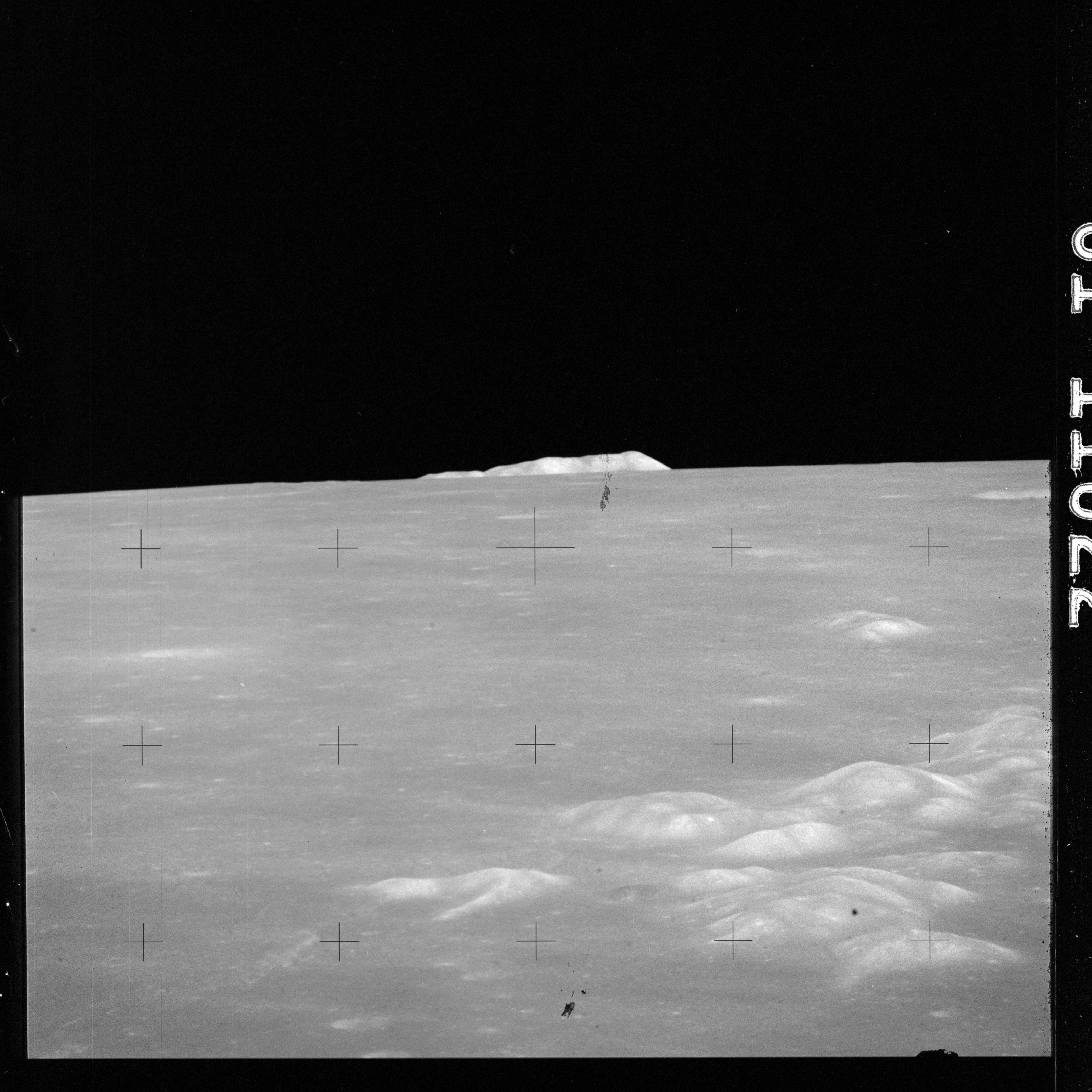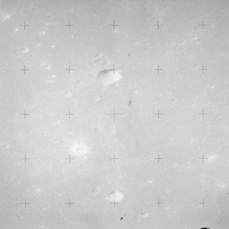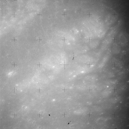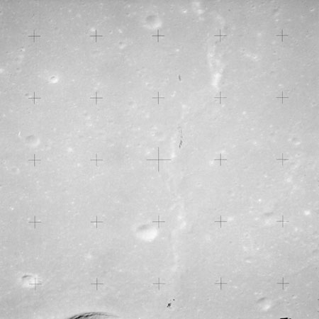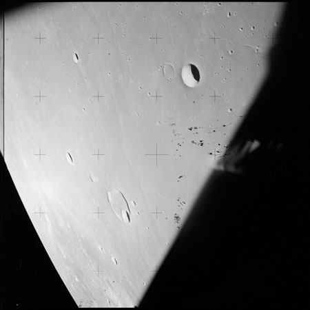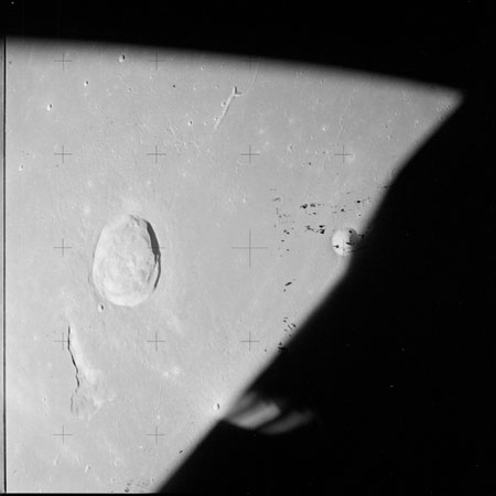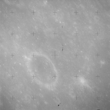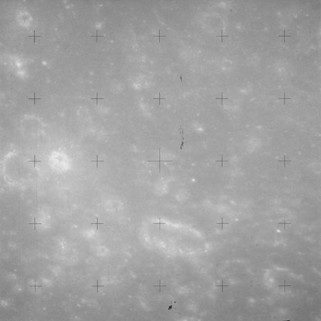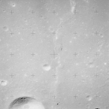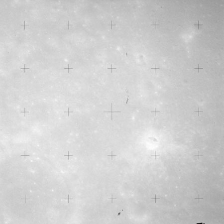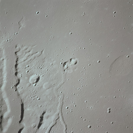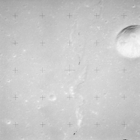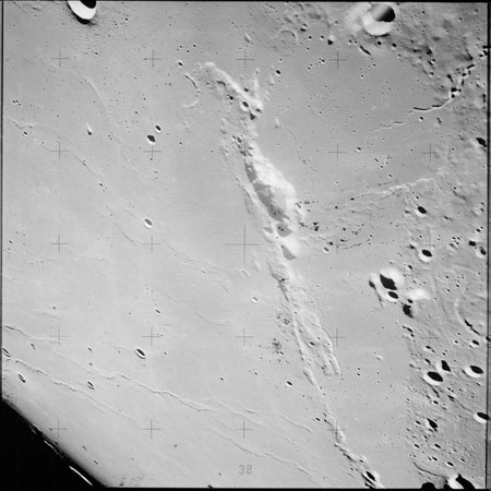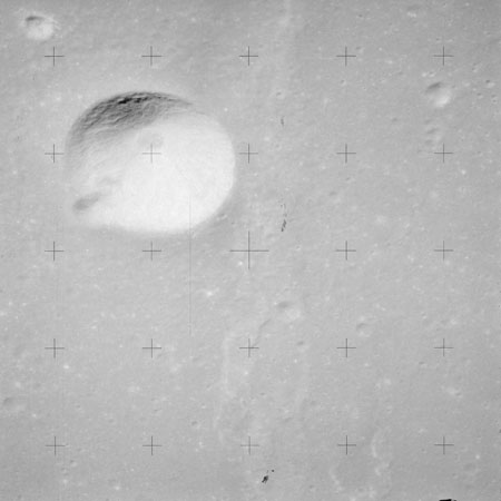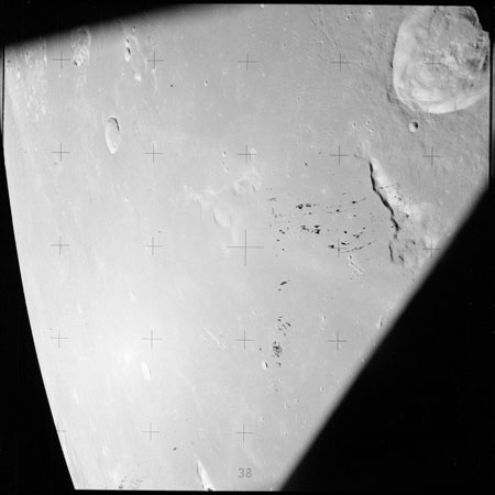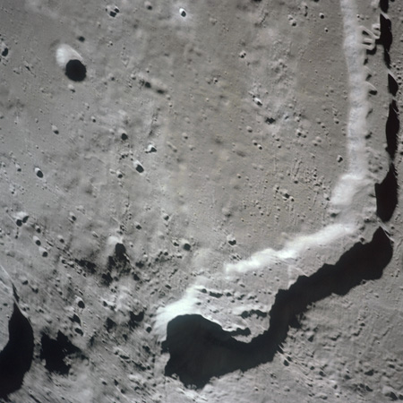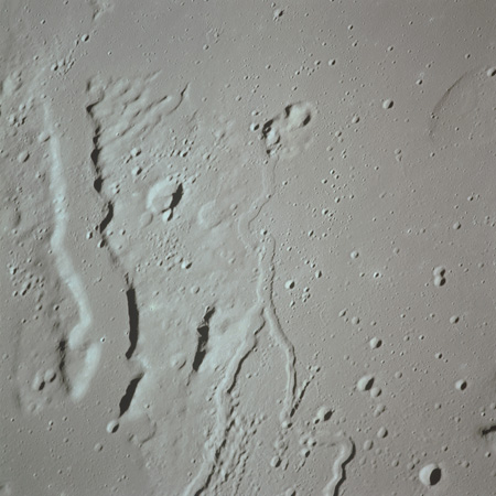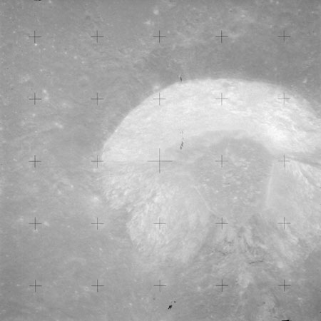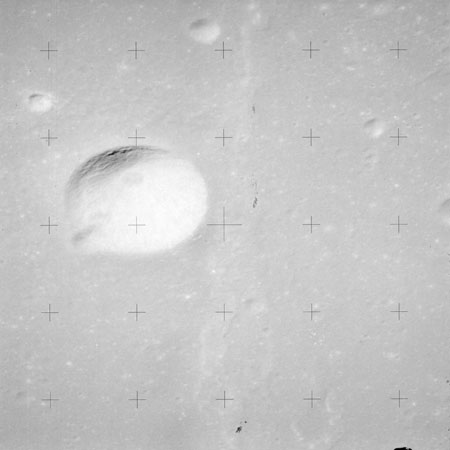 The crater to the right of the rille-producing pair is Toscanelli. The remaining ten frames on magazine PP for this pass follow slightly to the west of Toscanelli across the northern edge of the Aristarchus Plateau to Montes Agricola, finally settling on its northern end.