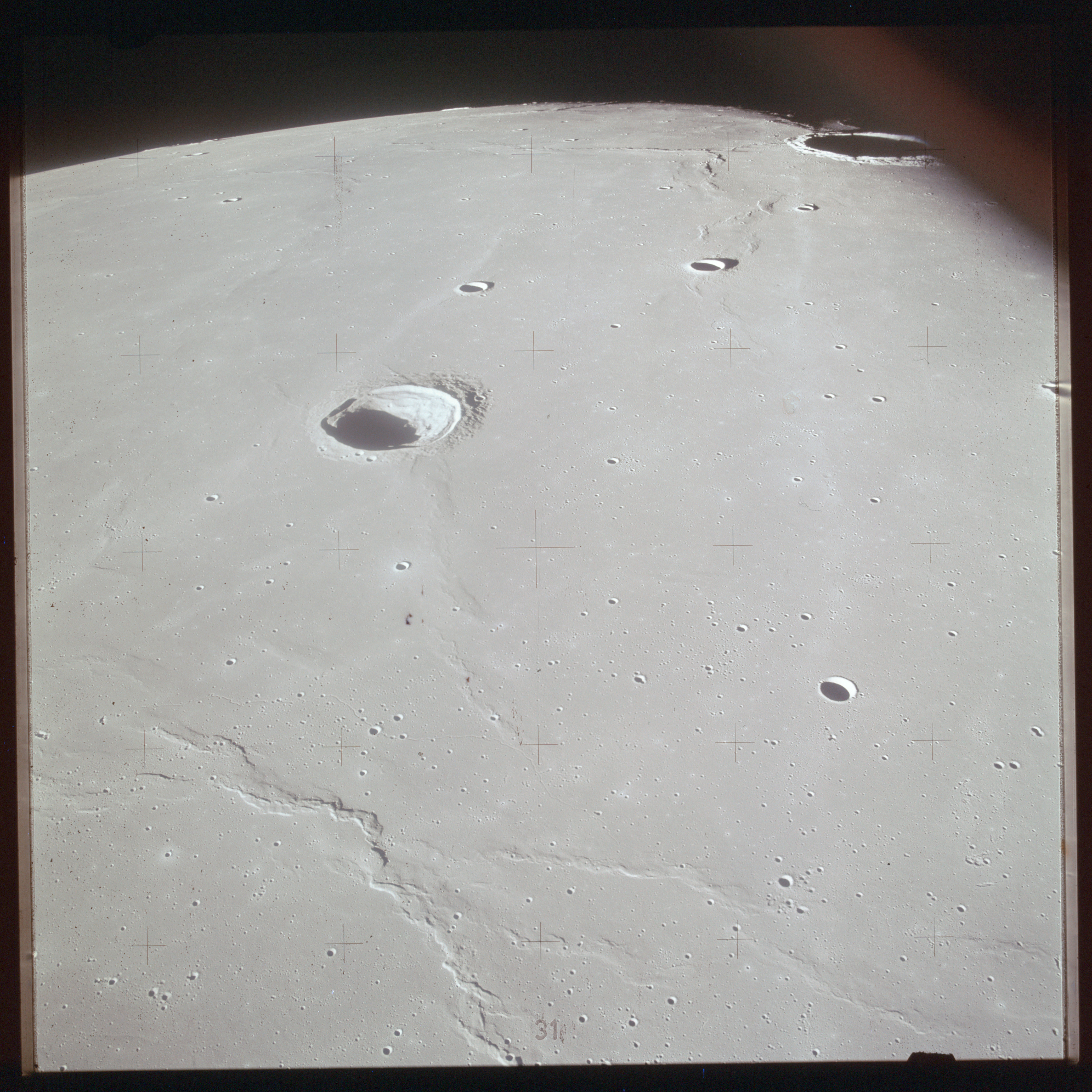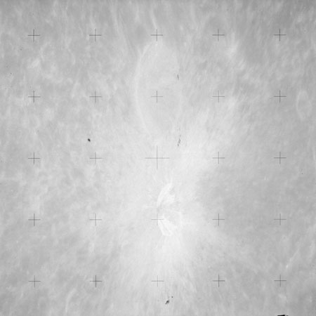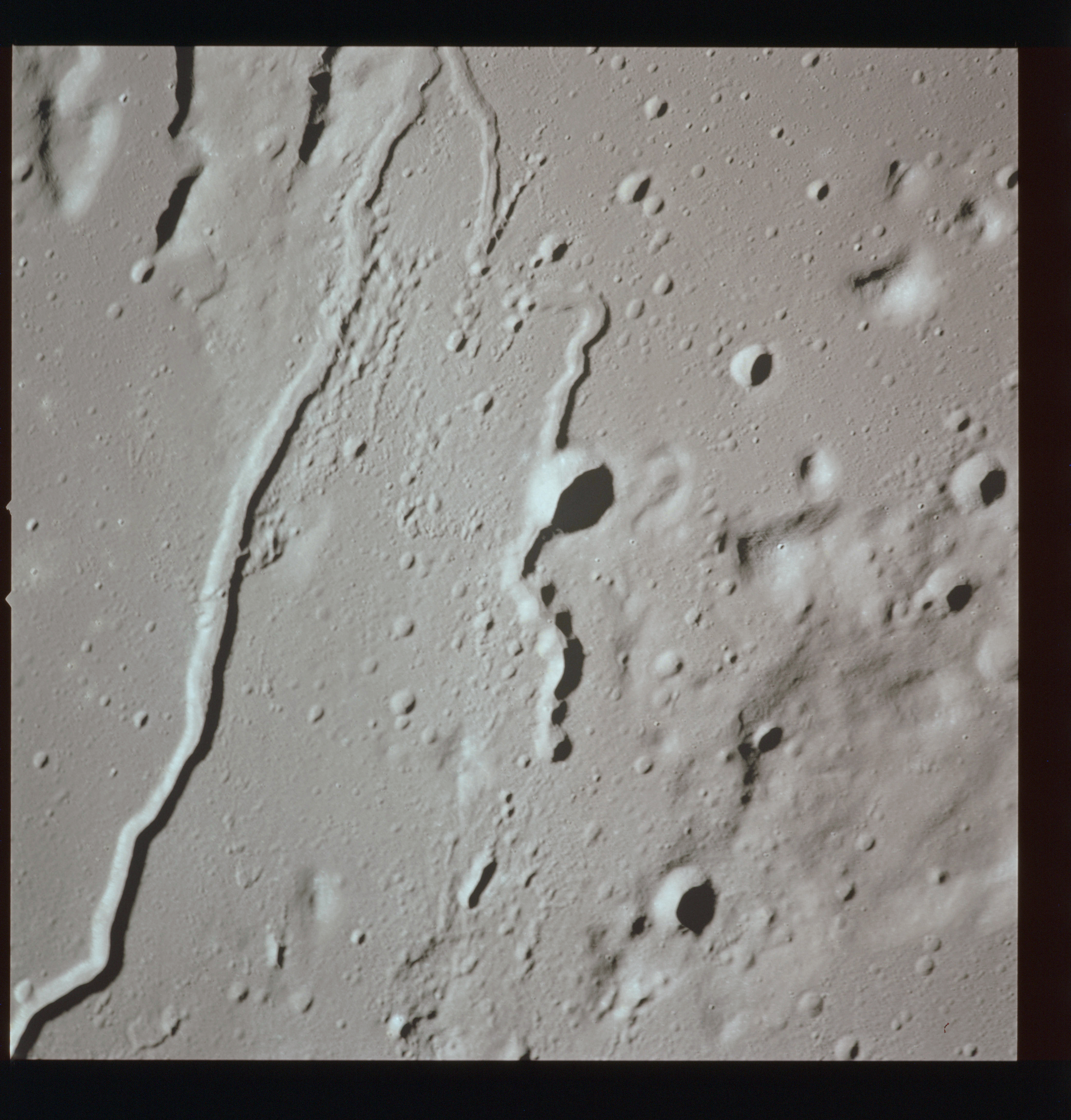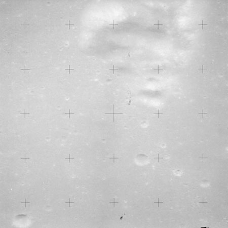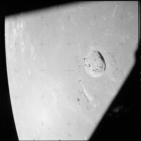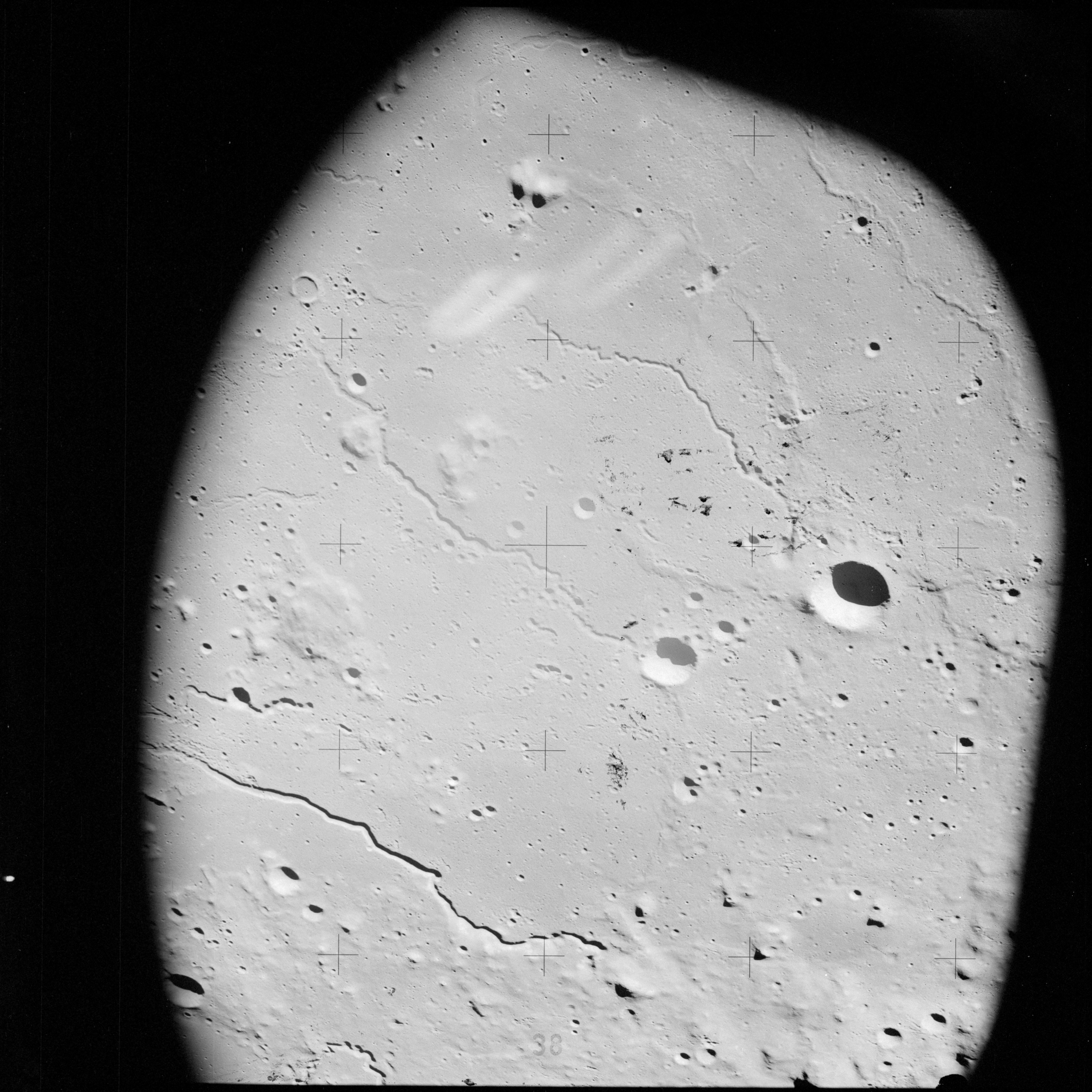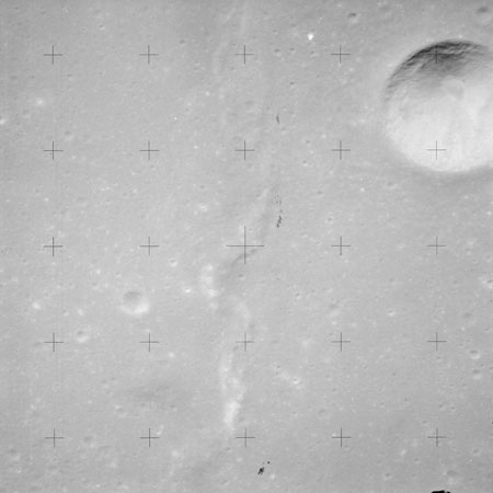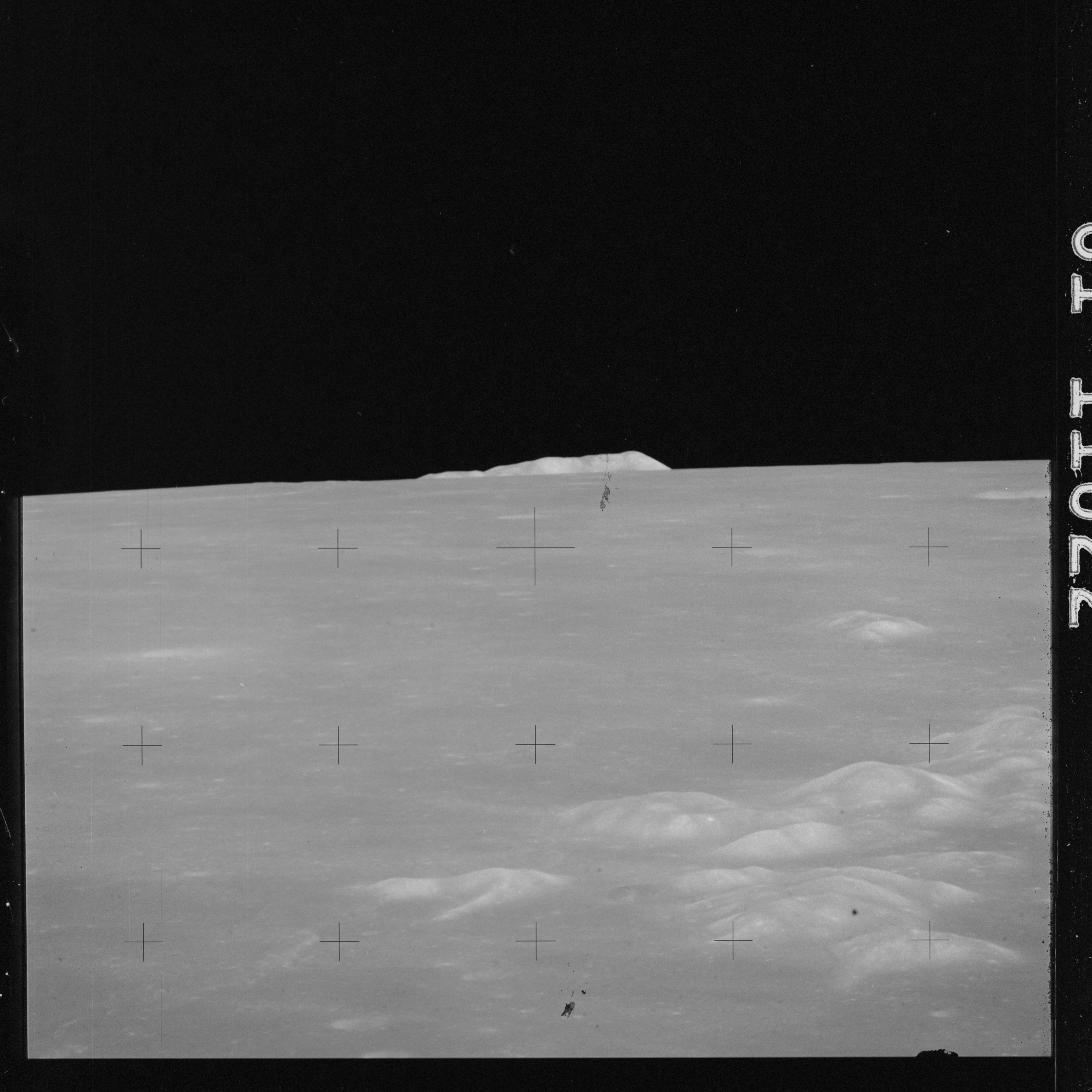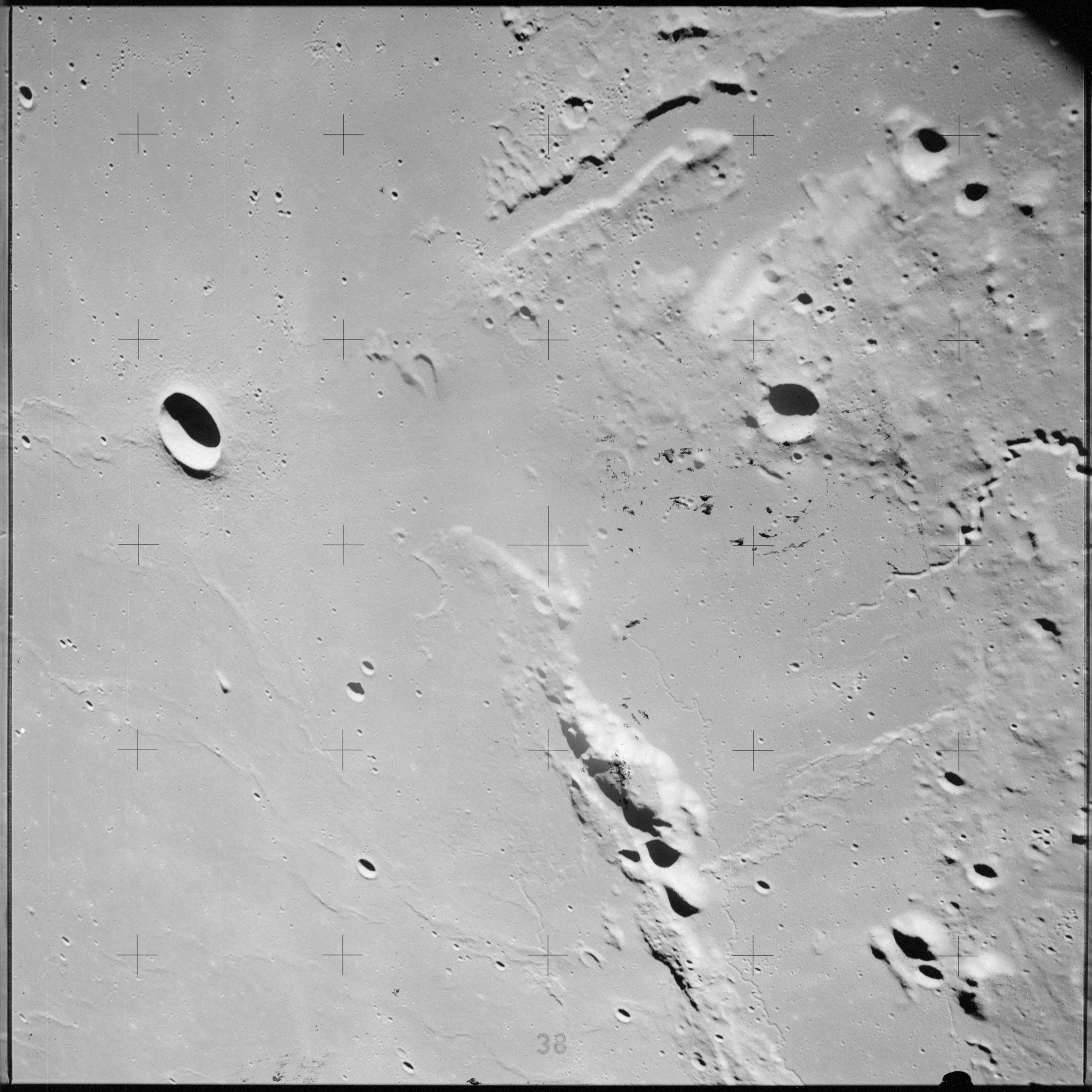 The crater to the right of the rille-producing pair is Toscanelli. The remaining ten frames on magazine PP for this pass follow slightly to the west of Toscanelli across the northern edge of the Aristarchus Plateau to Montes Agricola, finally settling on its northern end.