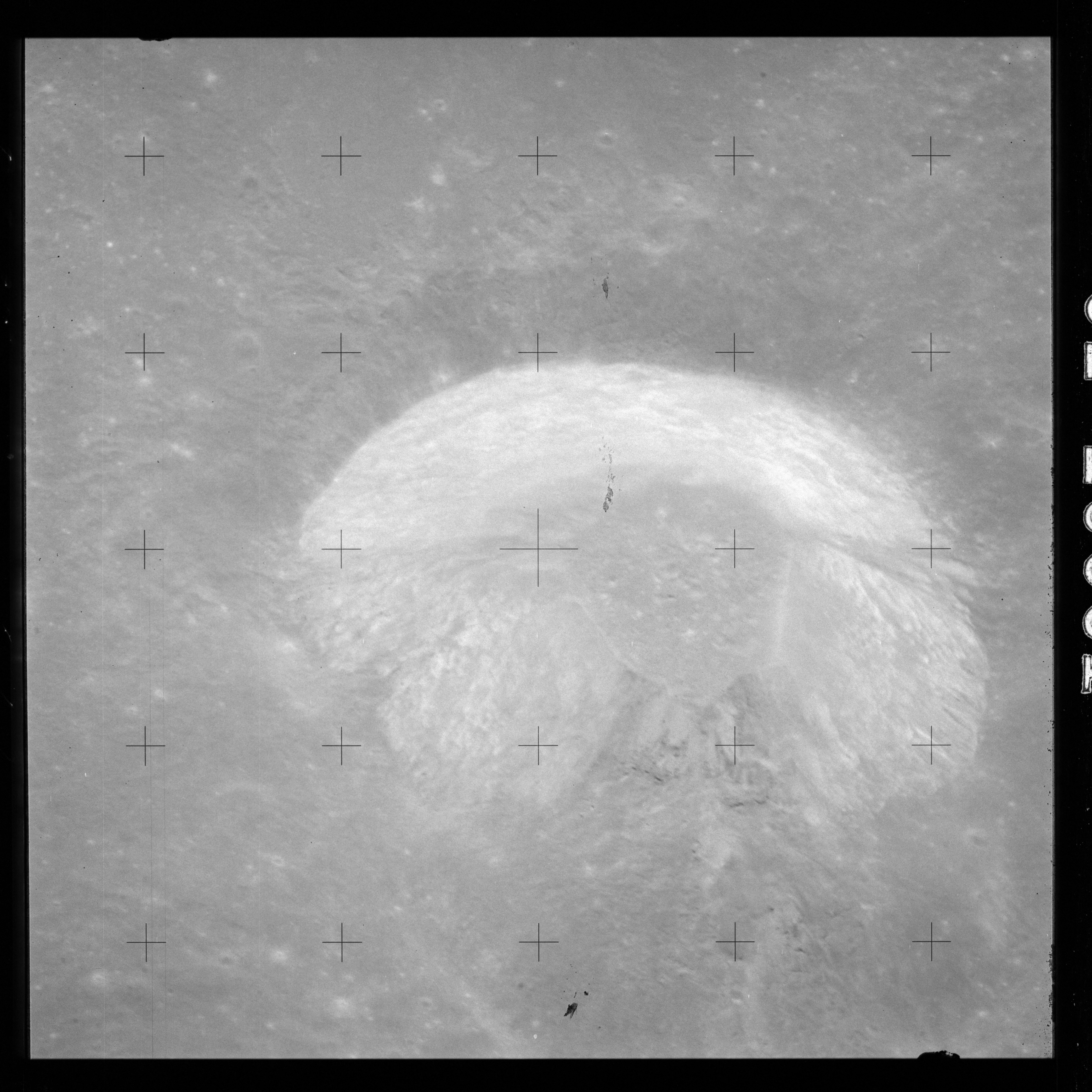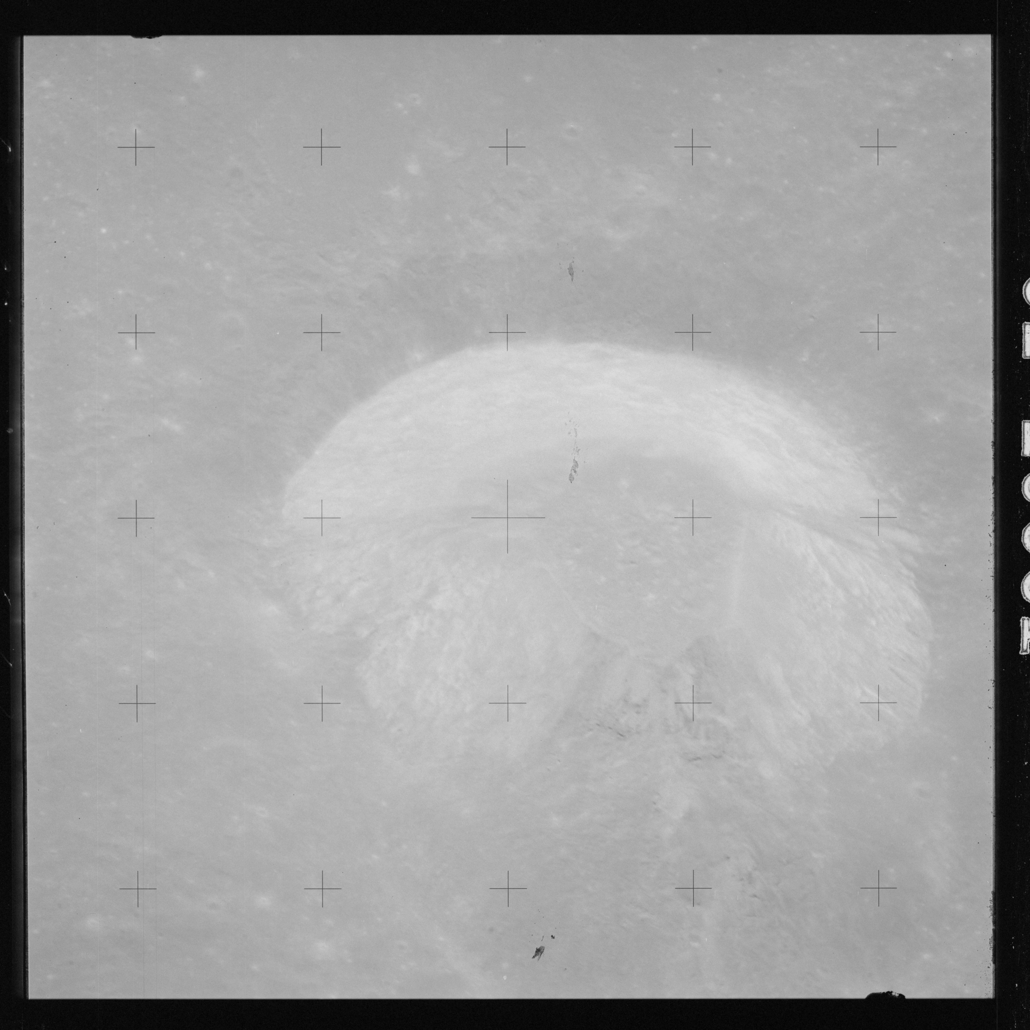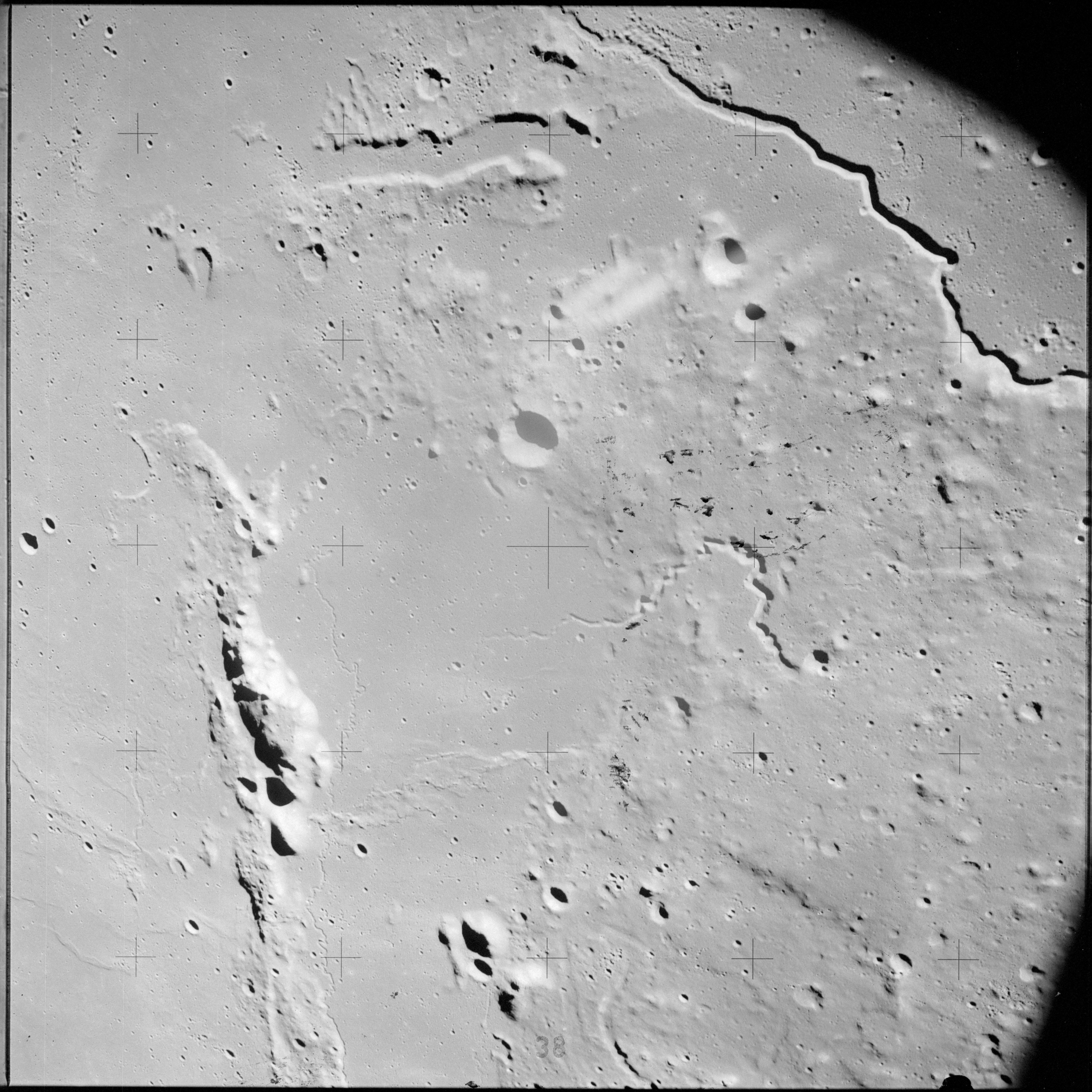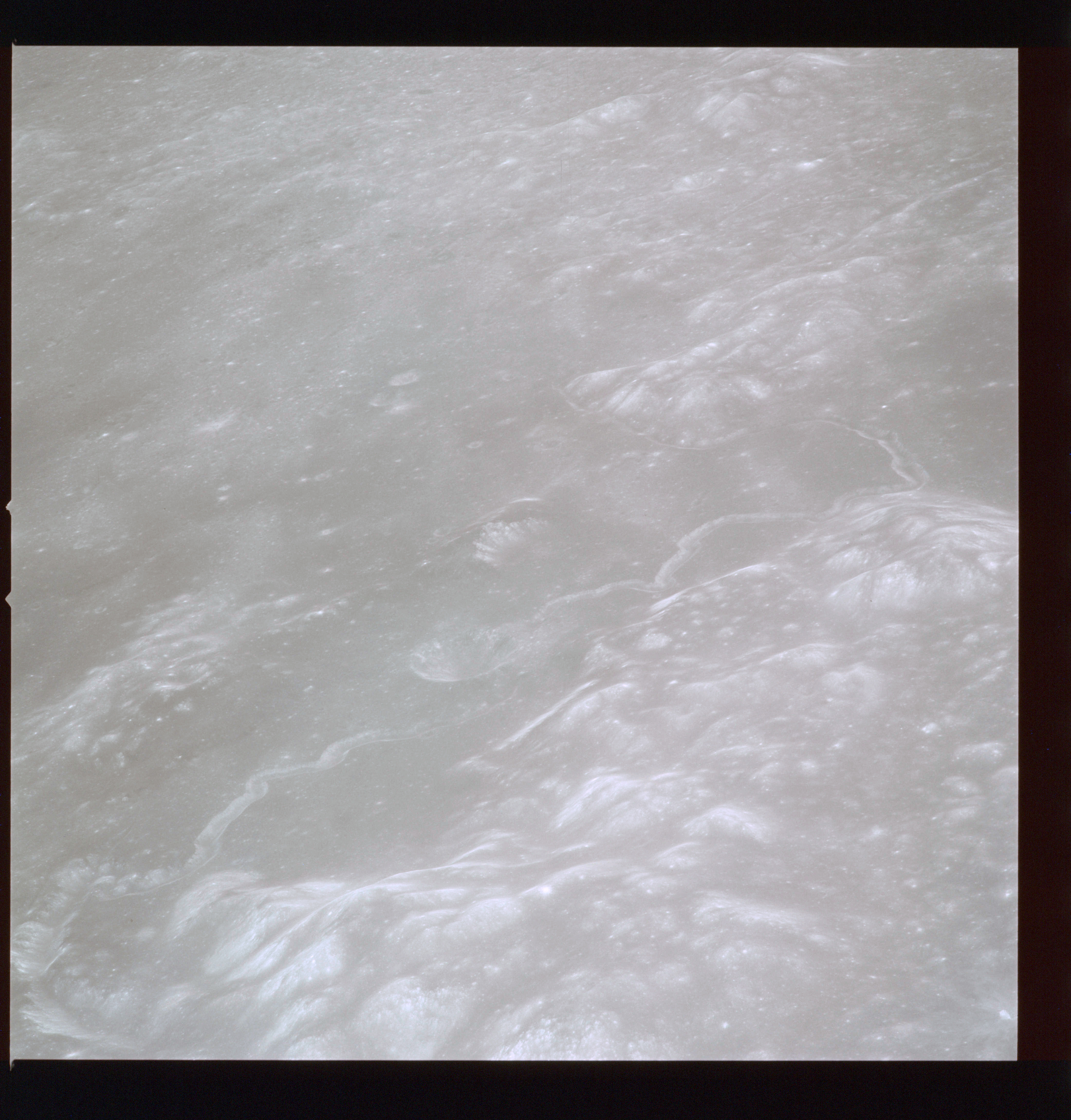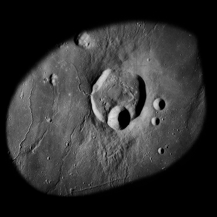 The crater to the right of the rille-producing pair is Toscanelli. The remaining ten frames on magazine PP for this pass follow slightly to the west of Toscanelli across the northern edge of the Aristarchus Plateau to Montes Agricola, finally settling on its northern end.