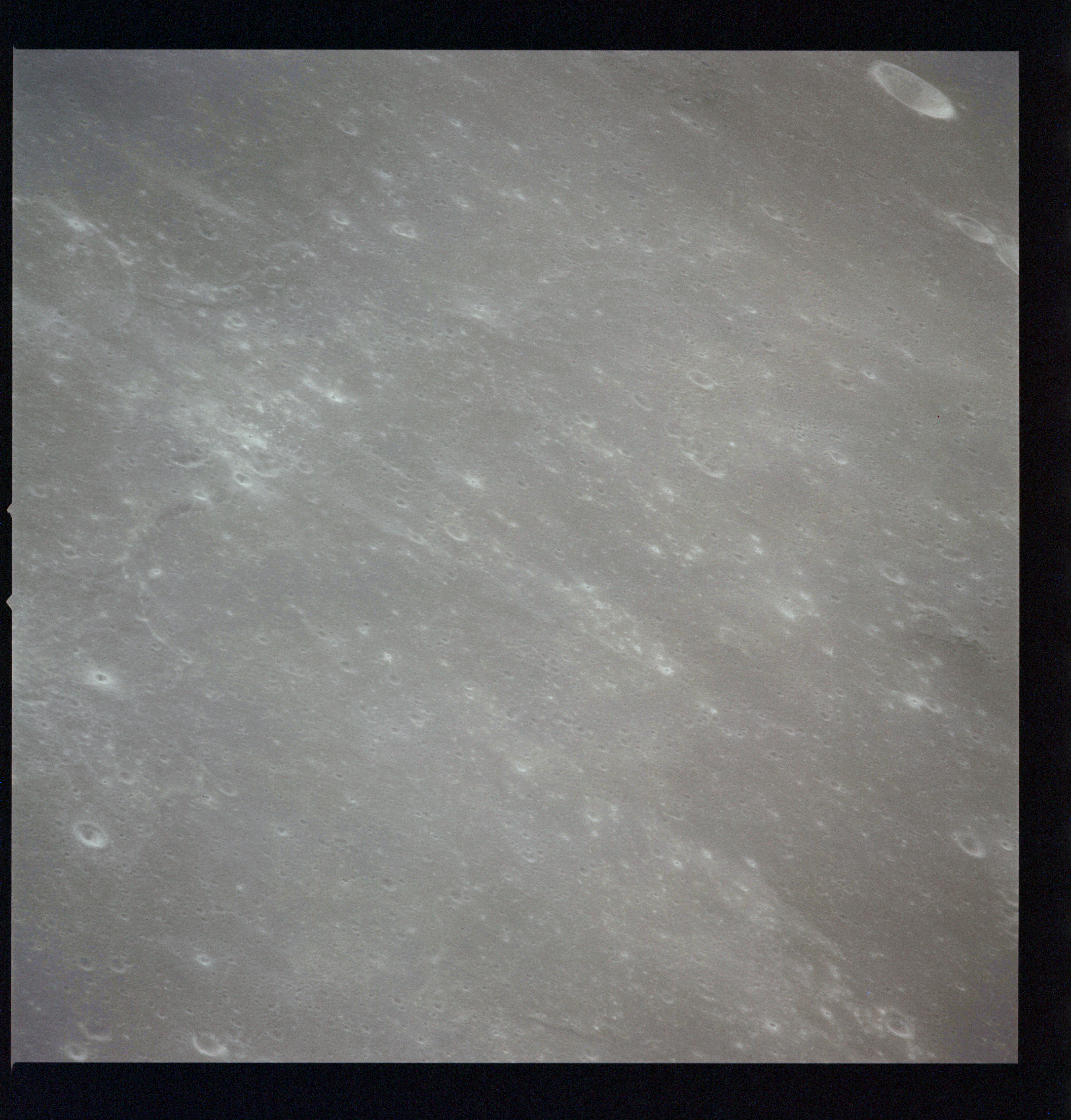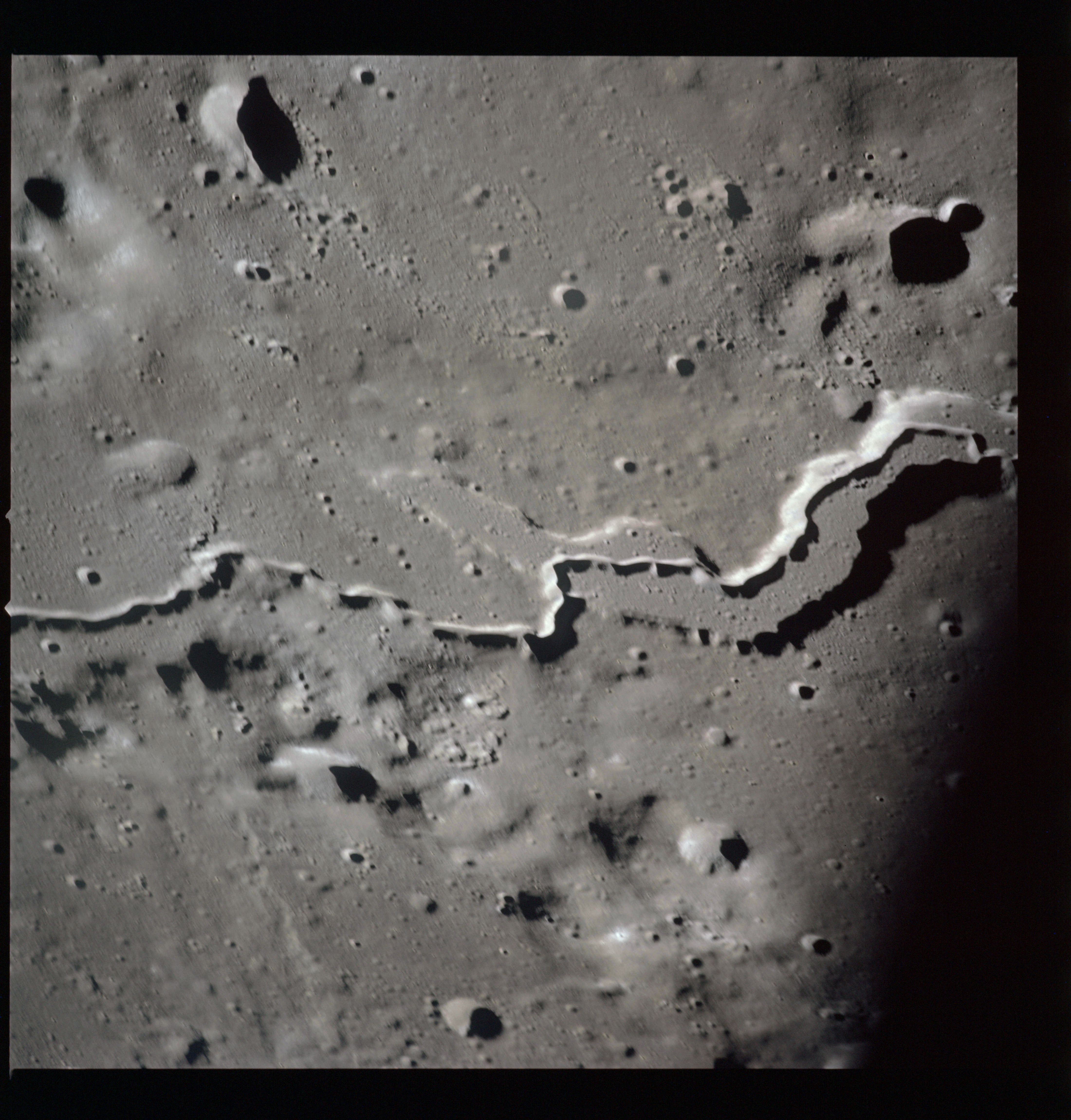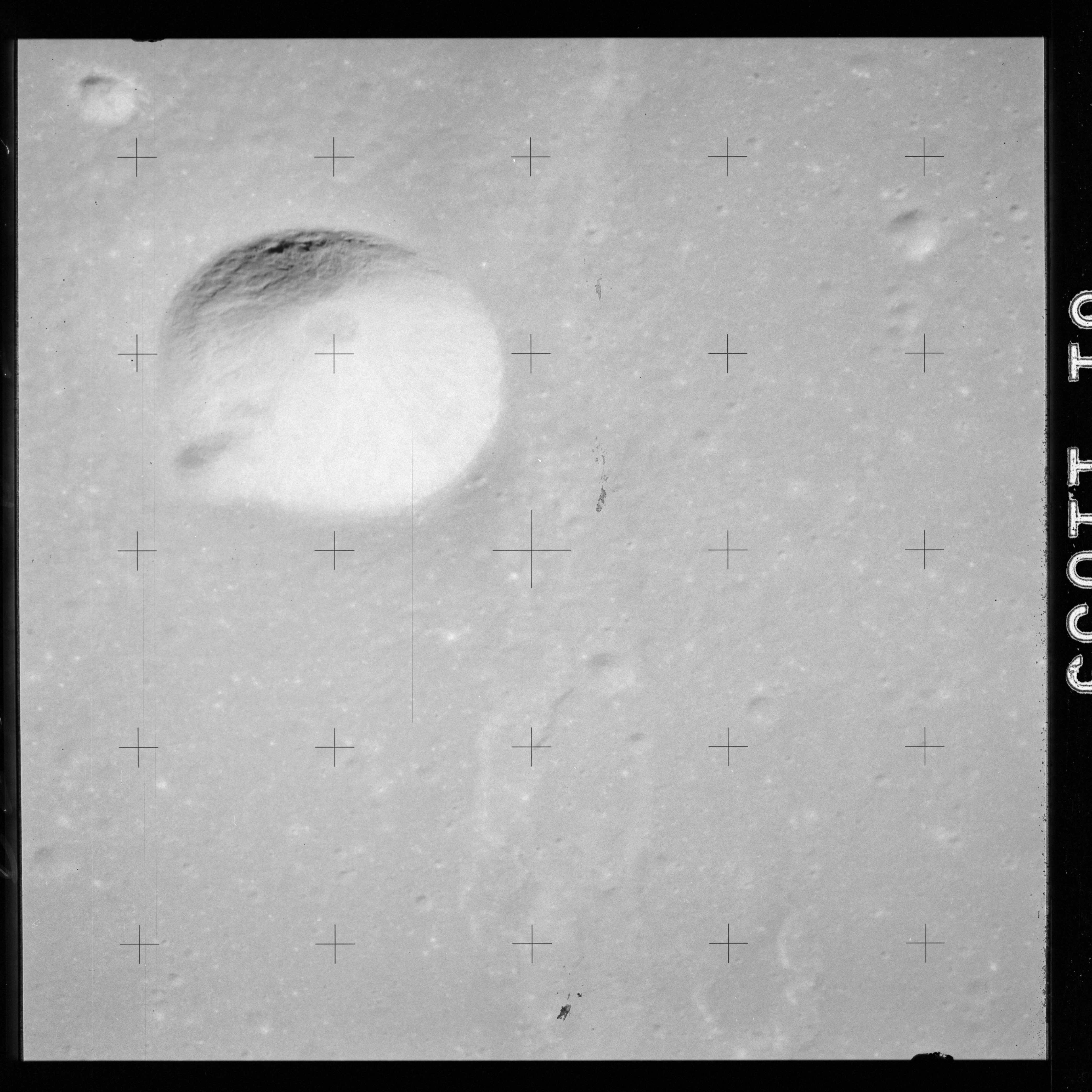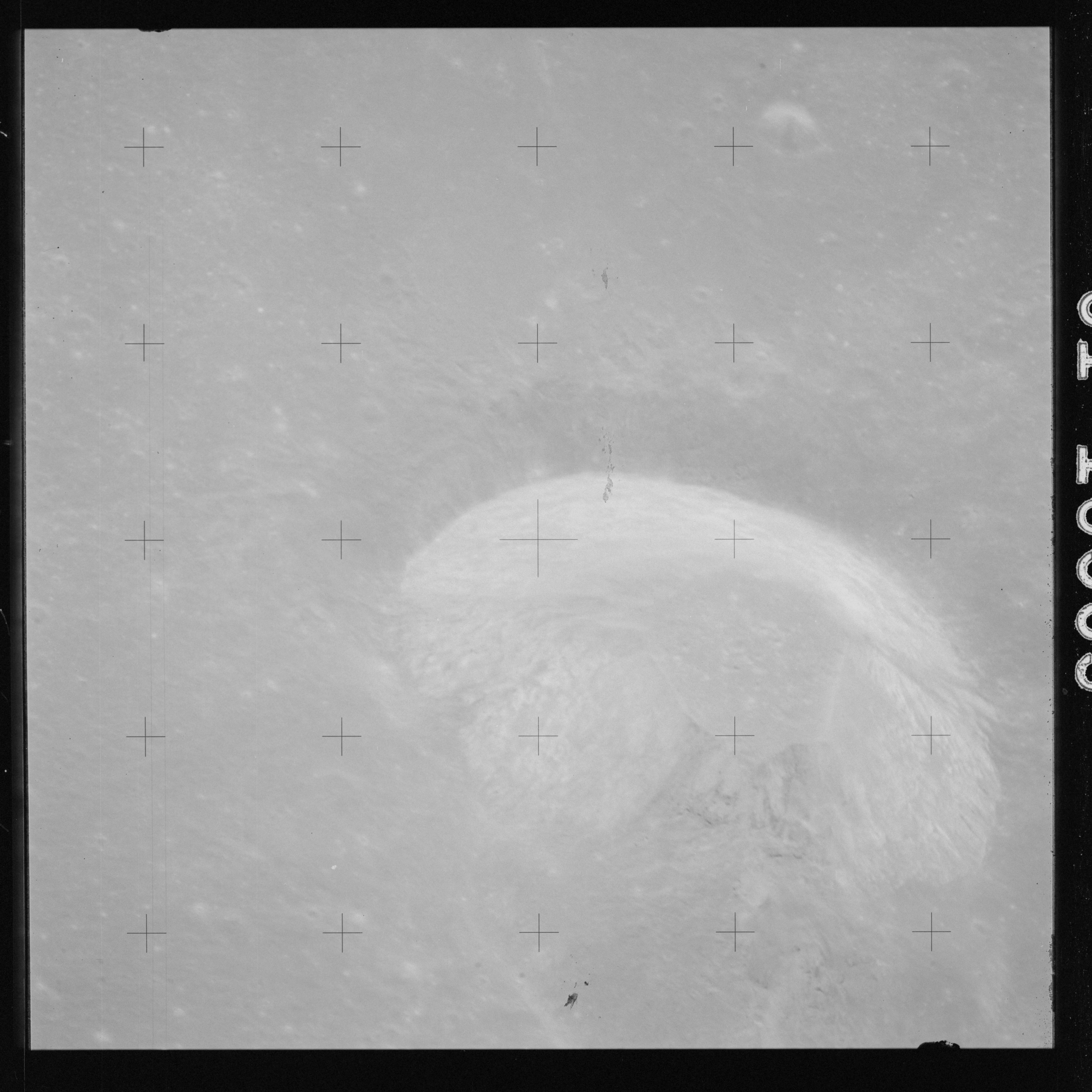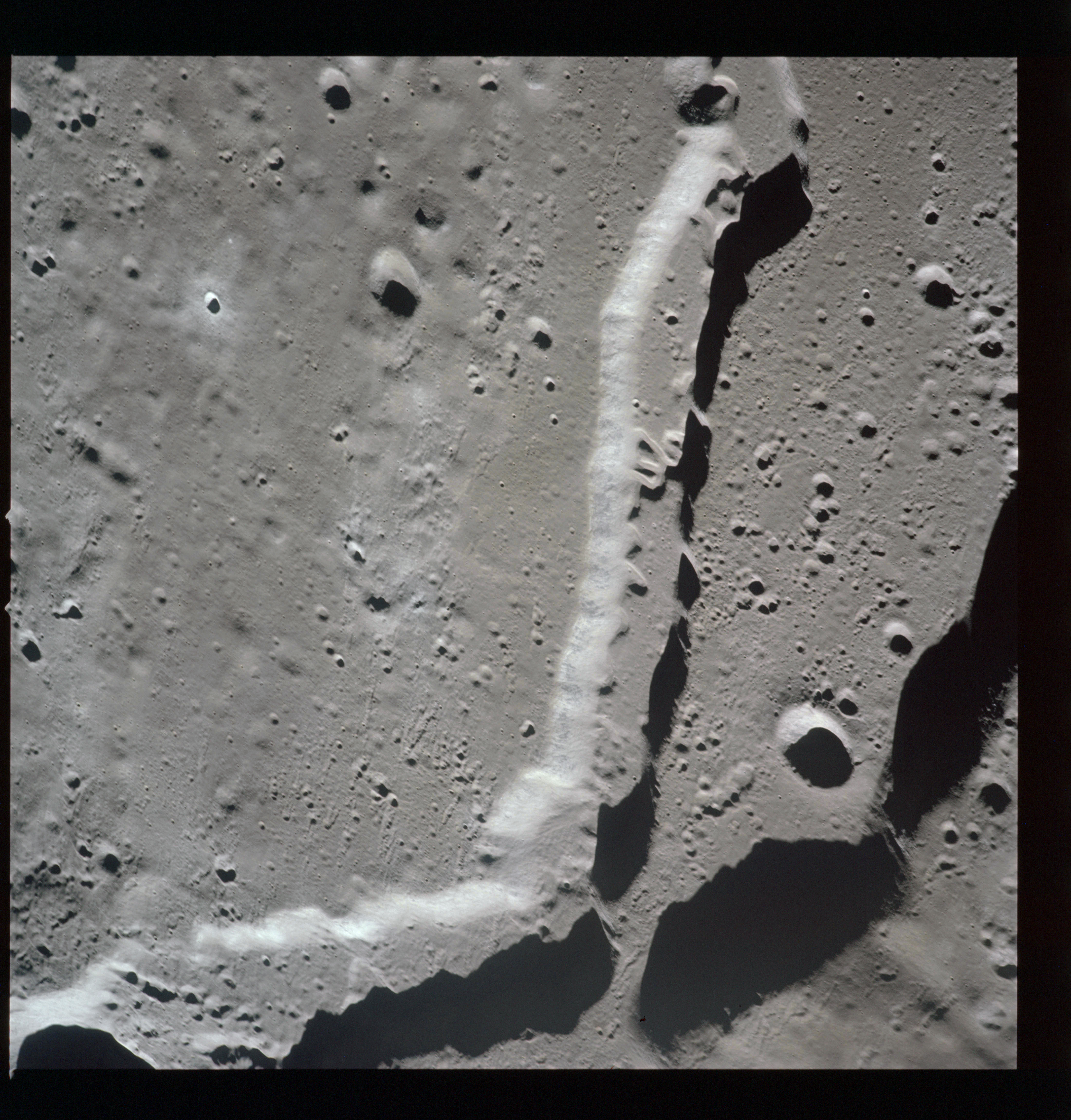 The crater to the right of the rille-producing pair is Toscanelli. The remaining ten frames on magazine PP for this pass follow slightly to the west of Toscanelli across the northern edge of the Aristarchus Plateau to Montes Agricola, finally settling on its northern end.