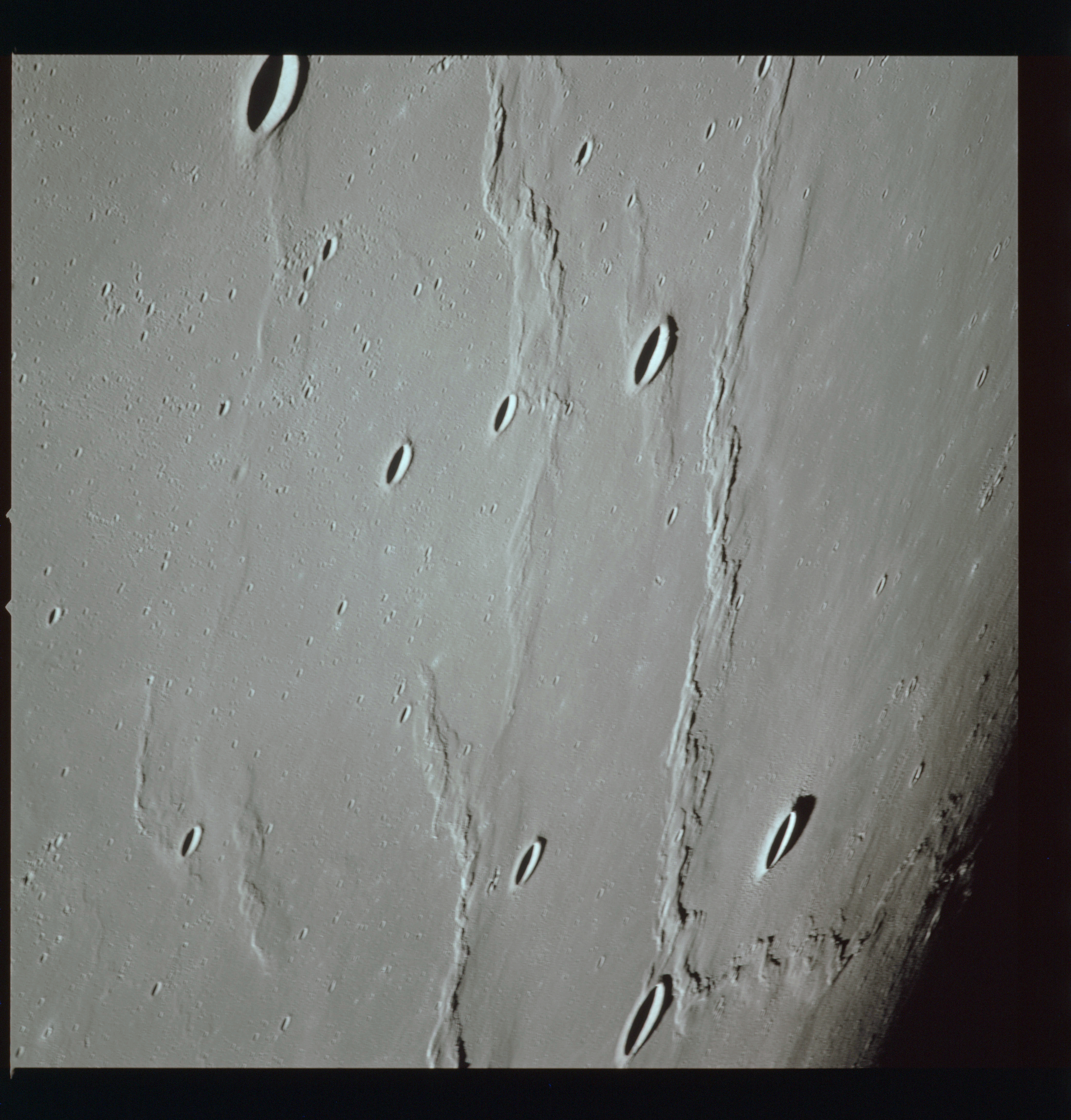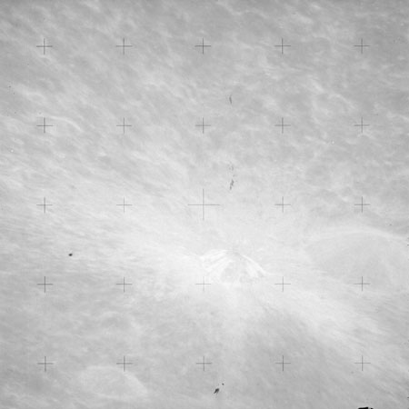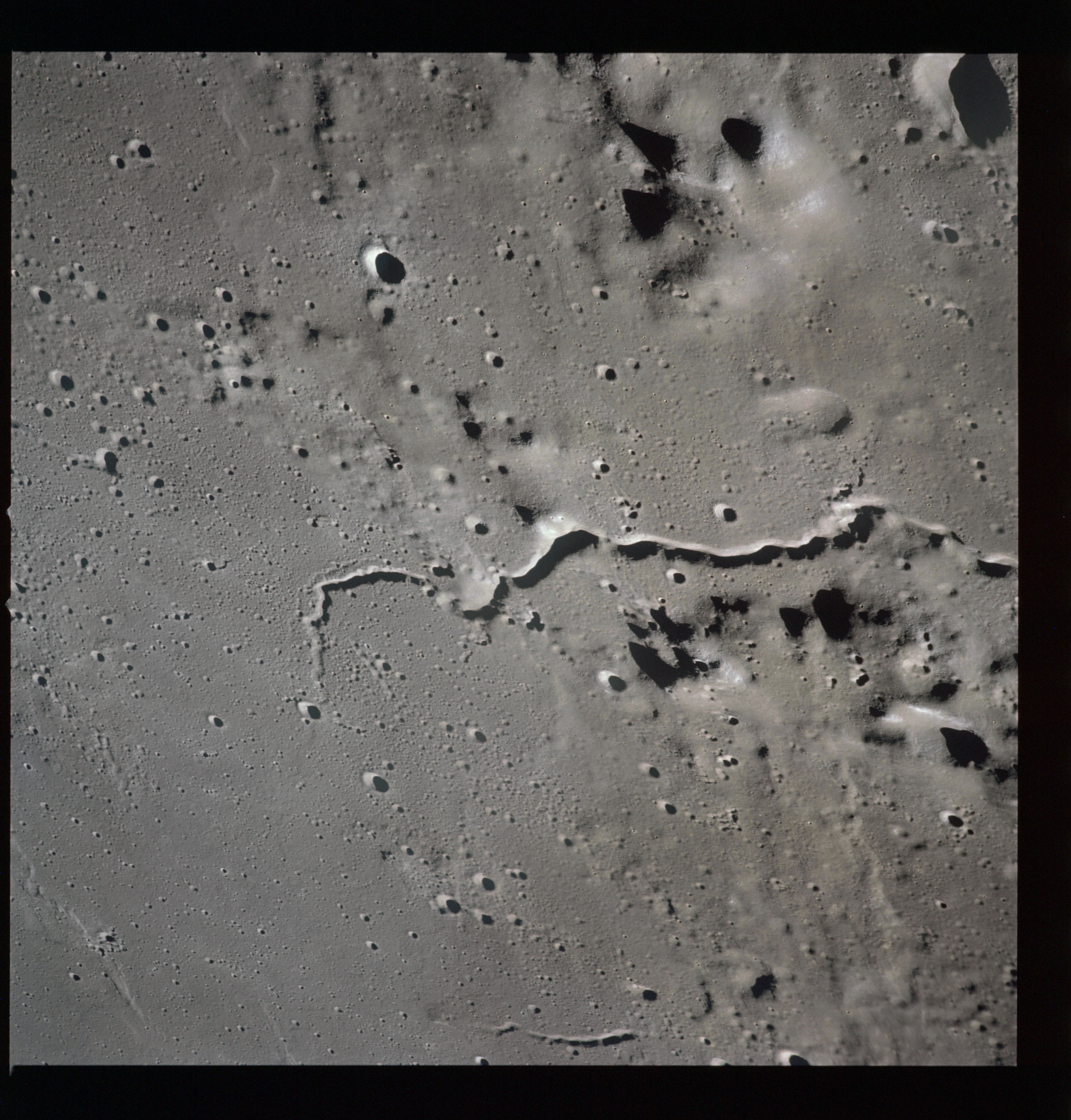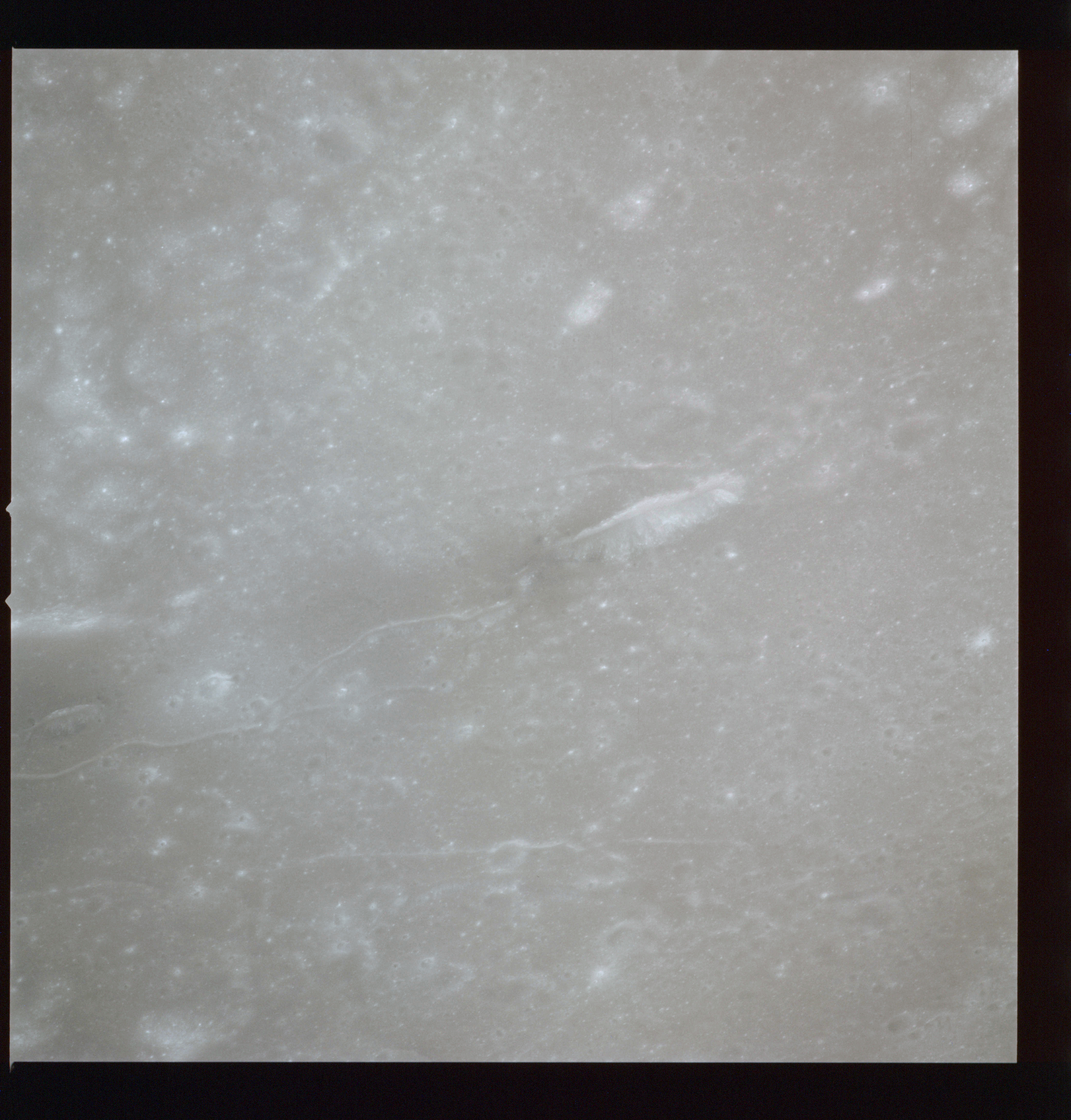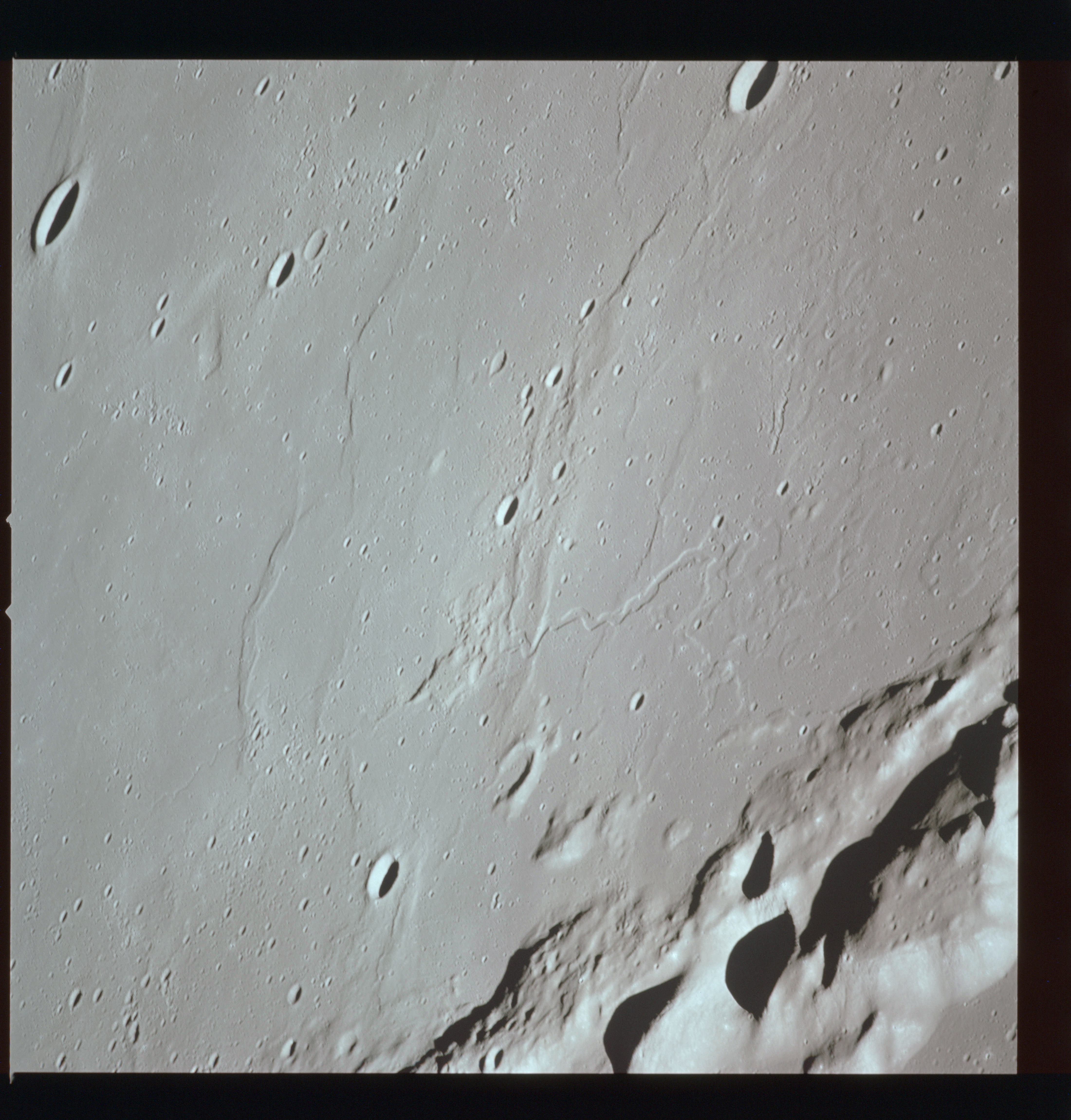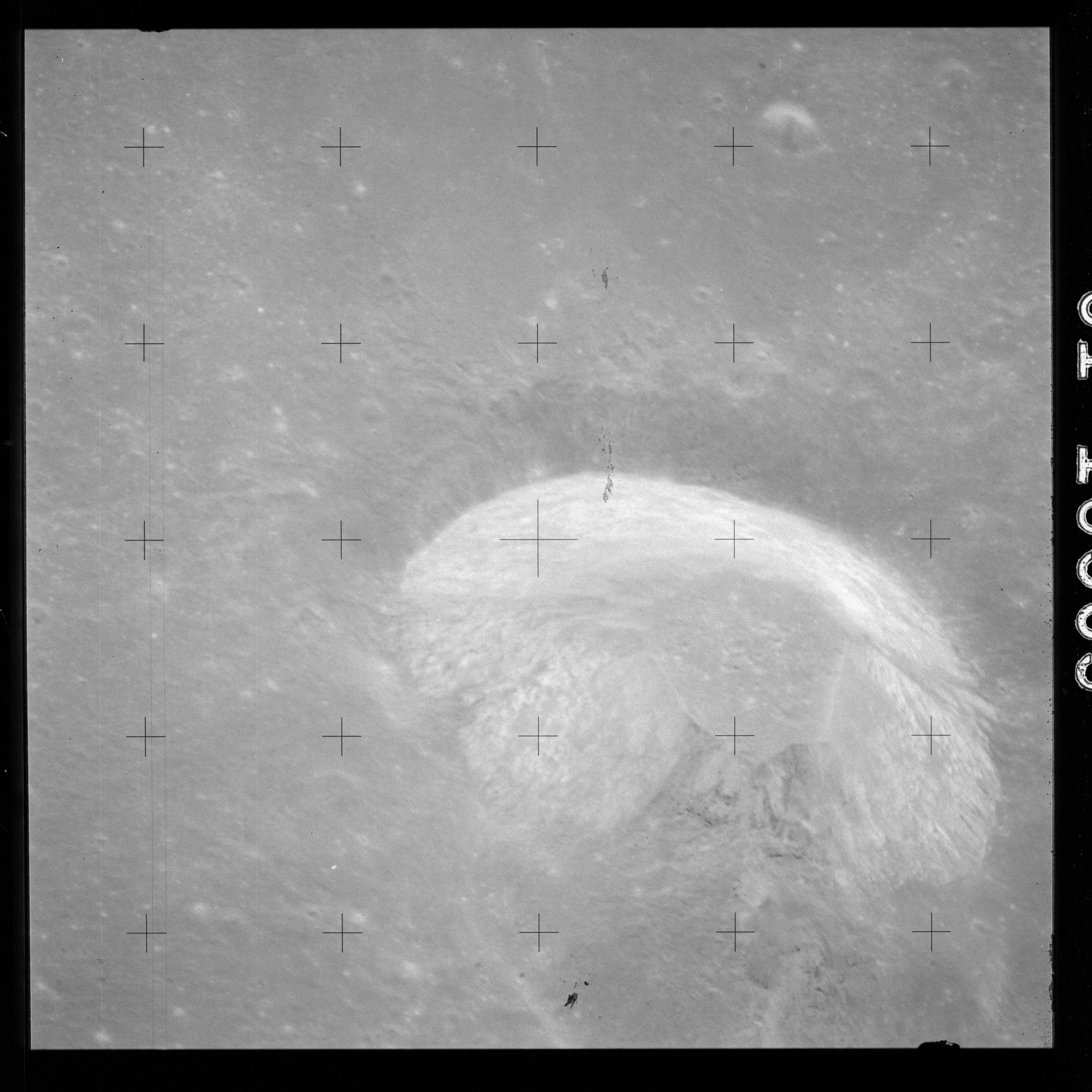 The crater to the right of the rille-producing pair is Toscanelli. The remaining ten frames on magazine PP for this pass follow slightly to the west of Toscanelli across the northern edge of the Aristarchus Plateau to Montes Agricola, finally settling on its northern end.