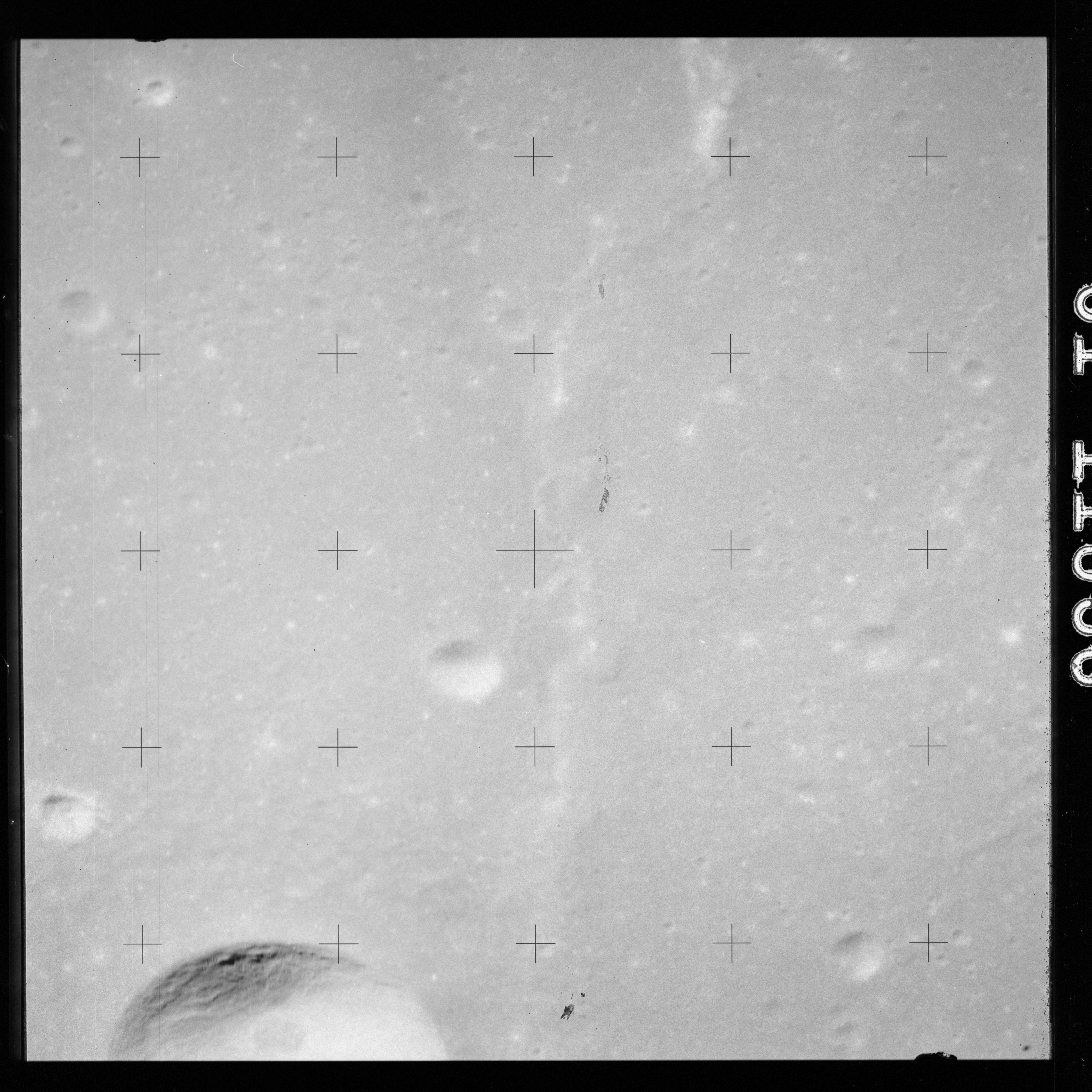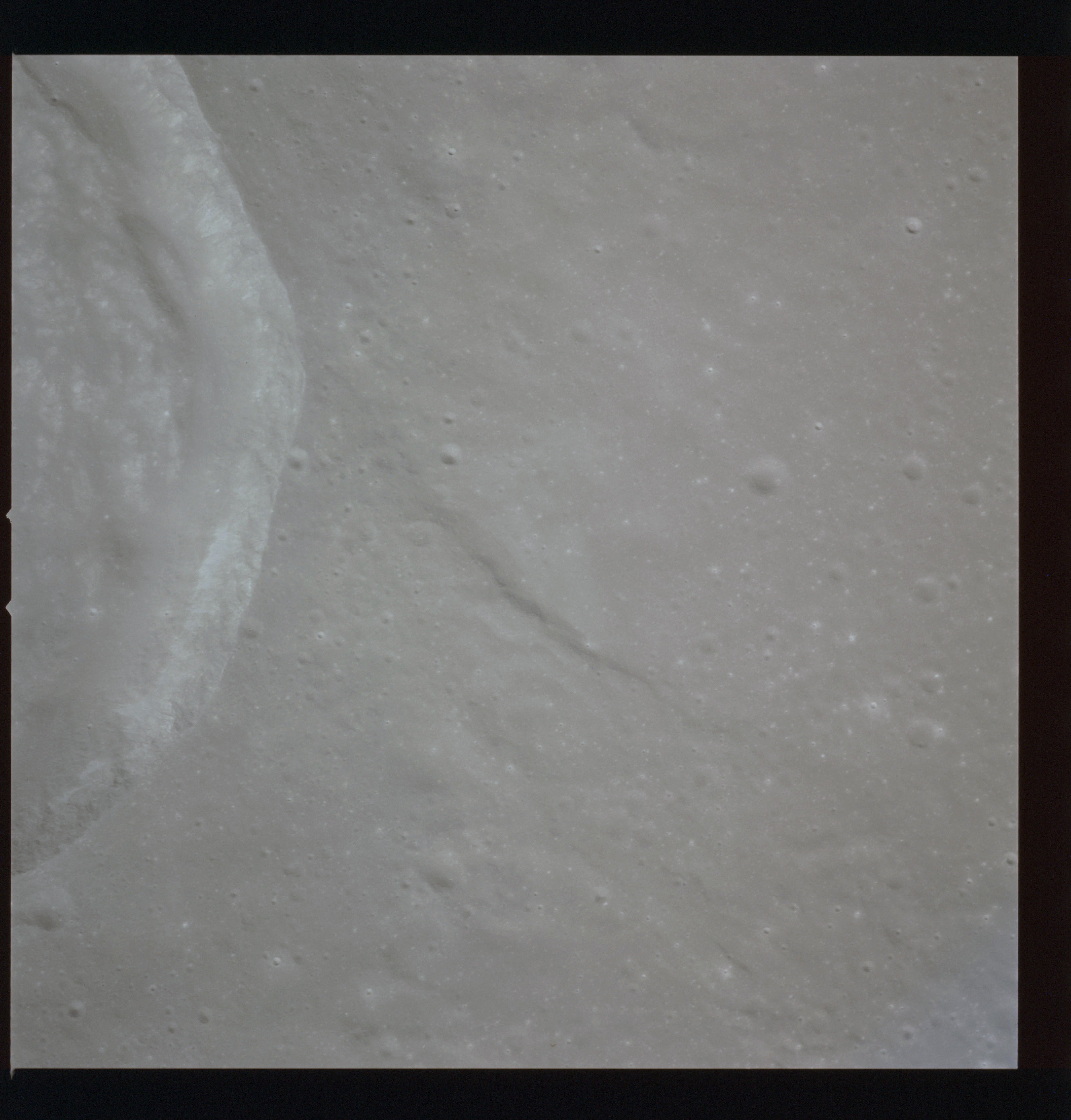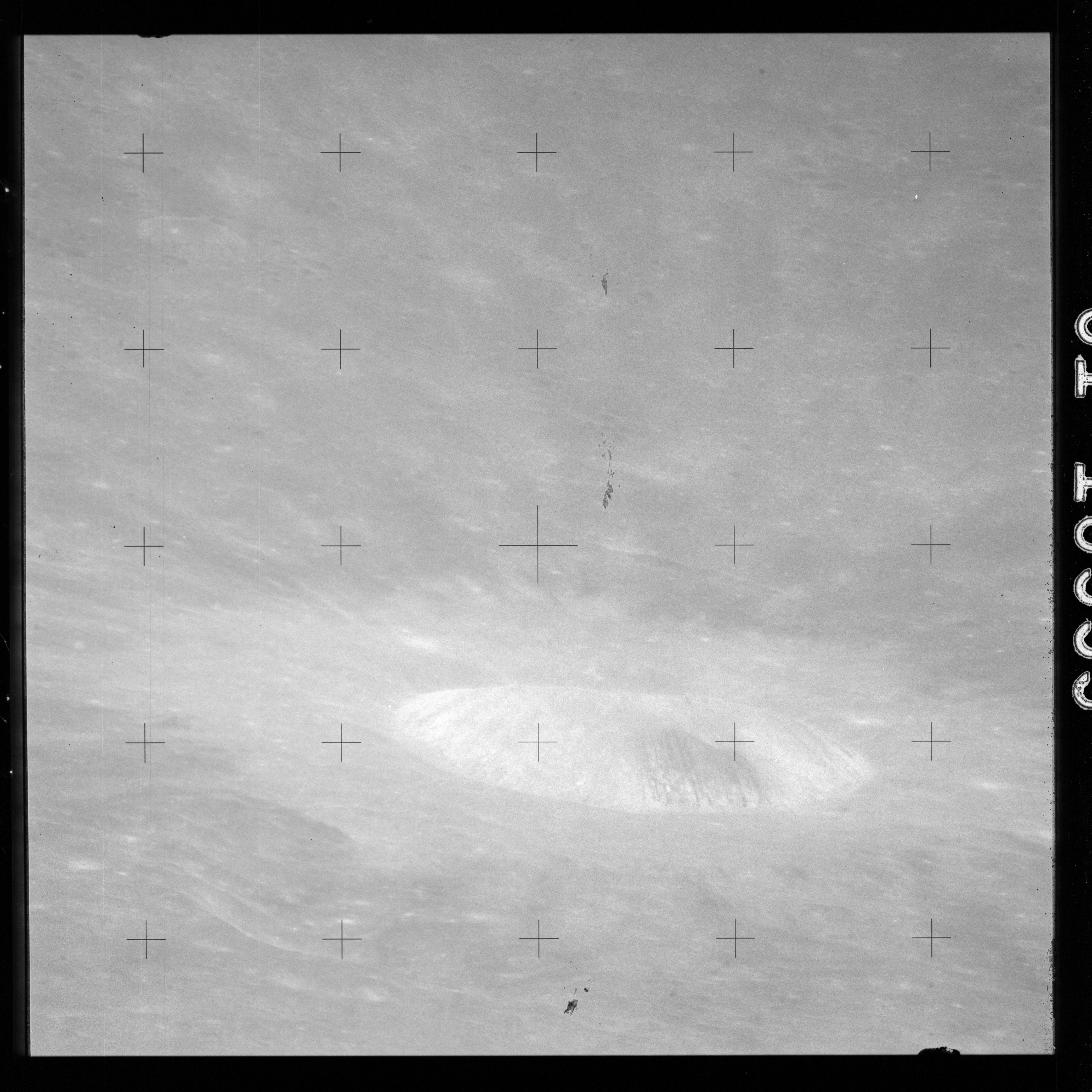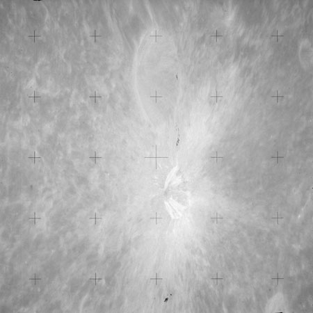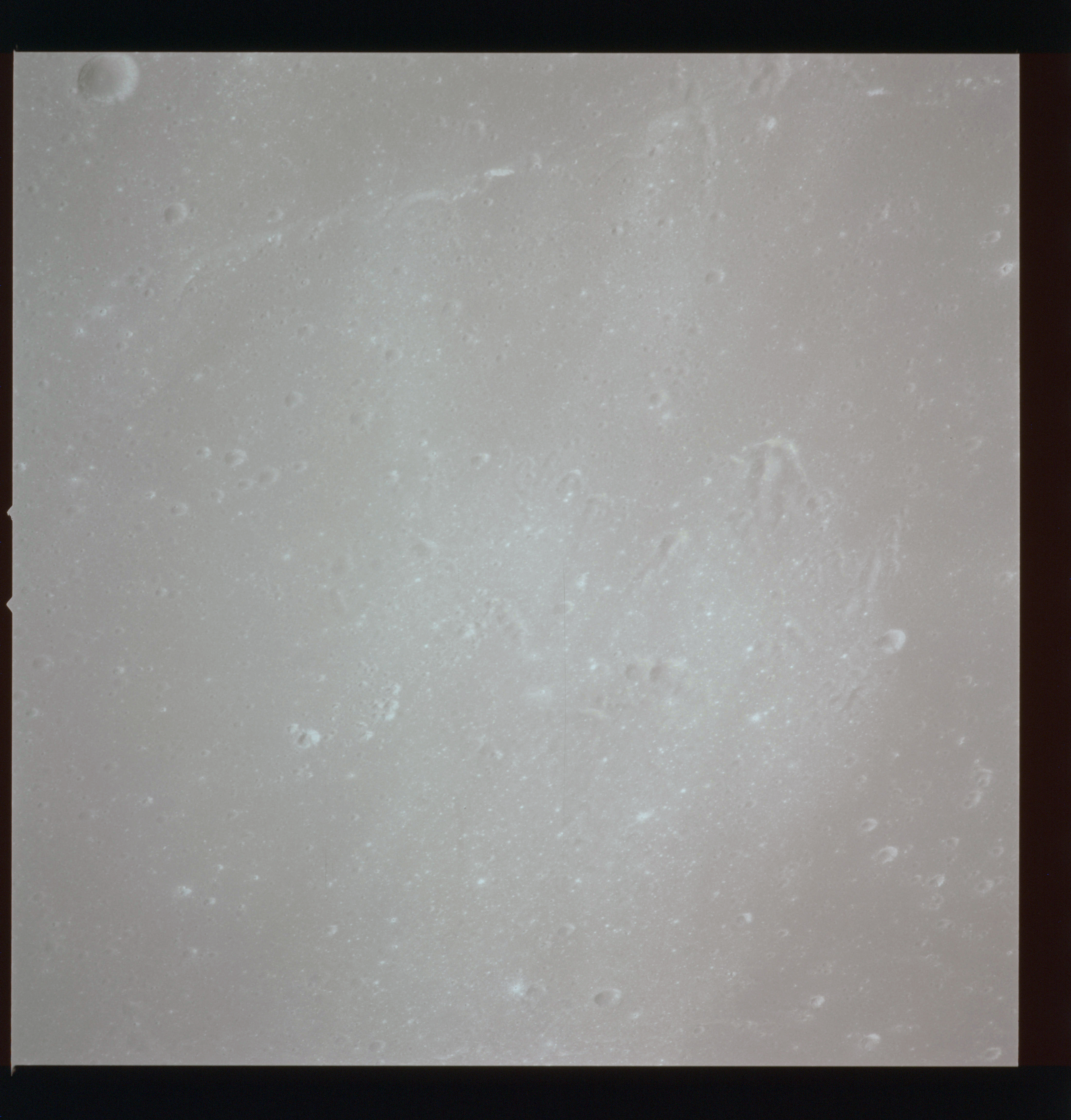 The crater to the right of the rille-producing pair is Toscanelli. The remaining ten frames on magazine PP for this pass follow slightly to the west of Toscanelli across the northern edge of the Aristarchus Plateau to Montes Agricola, finally settling on its northern end.