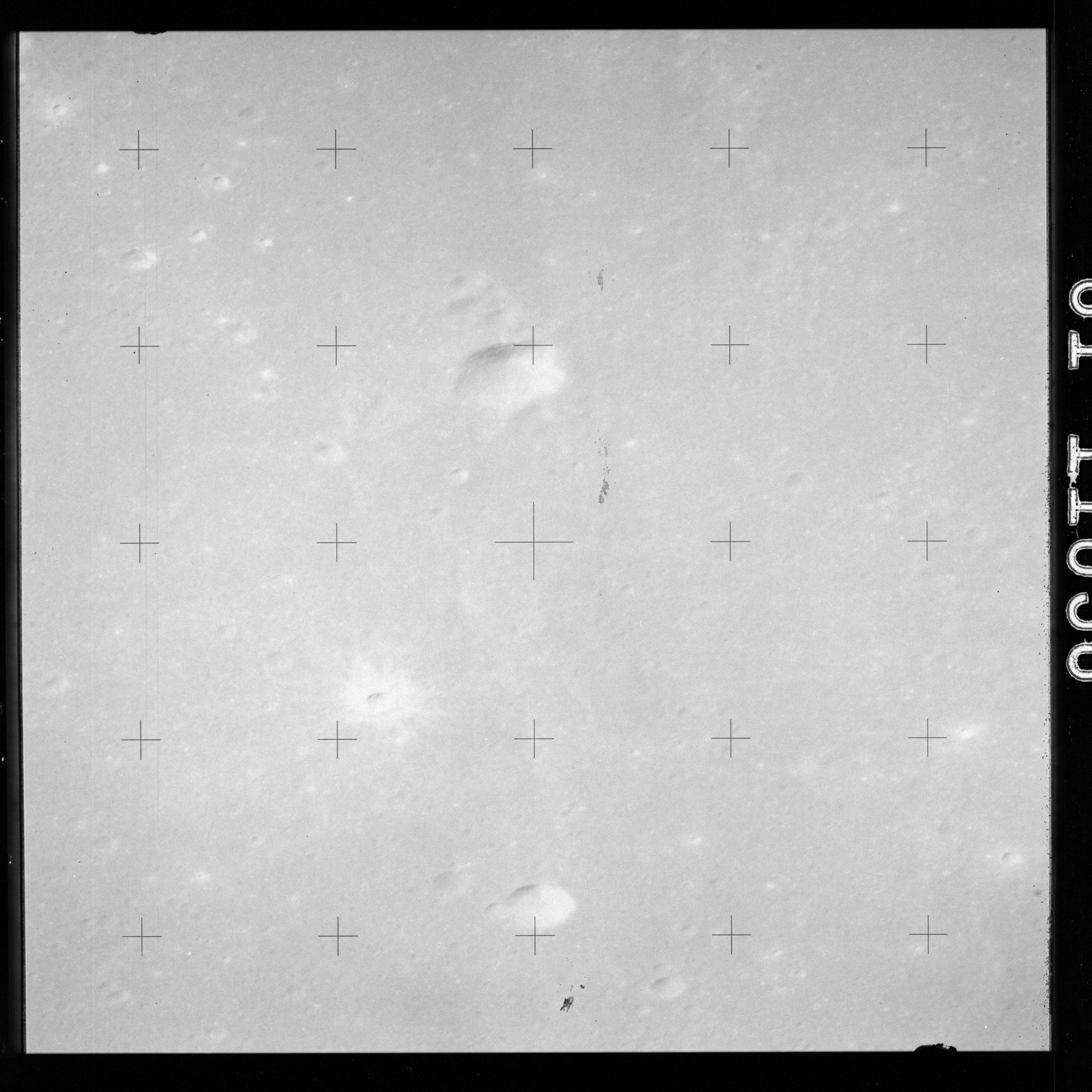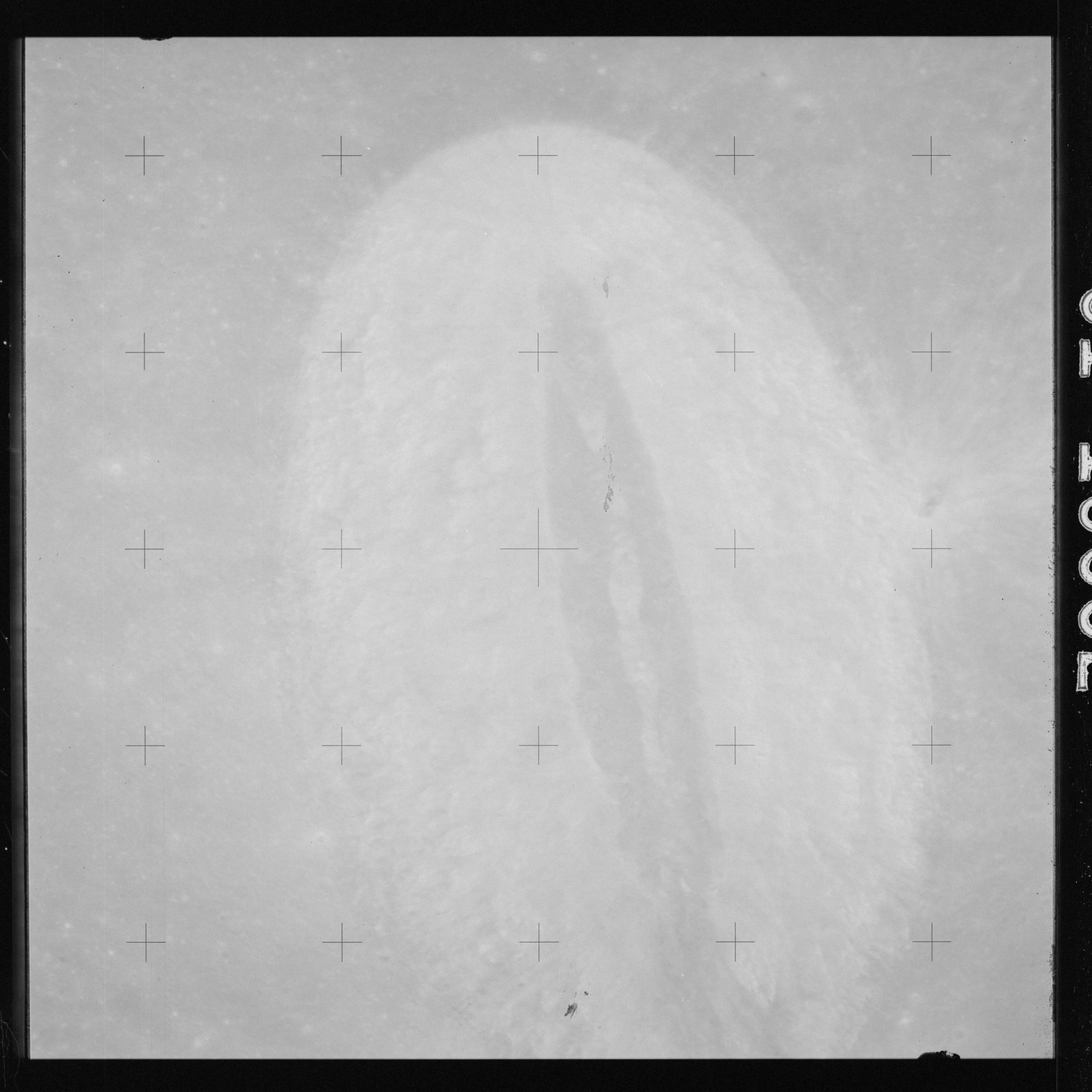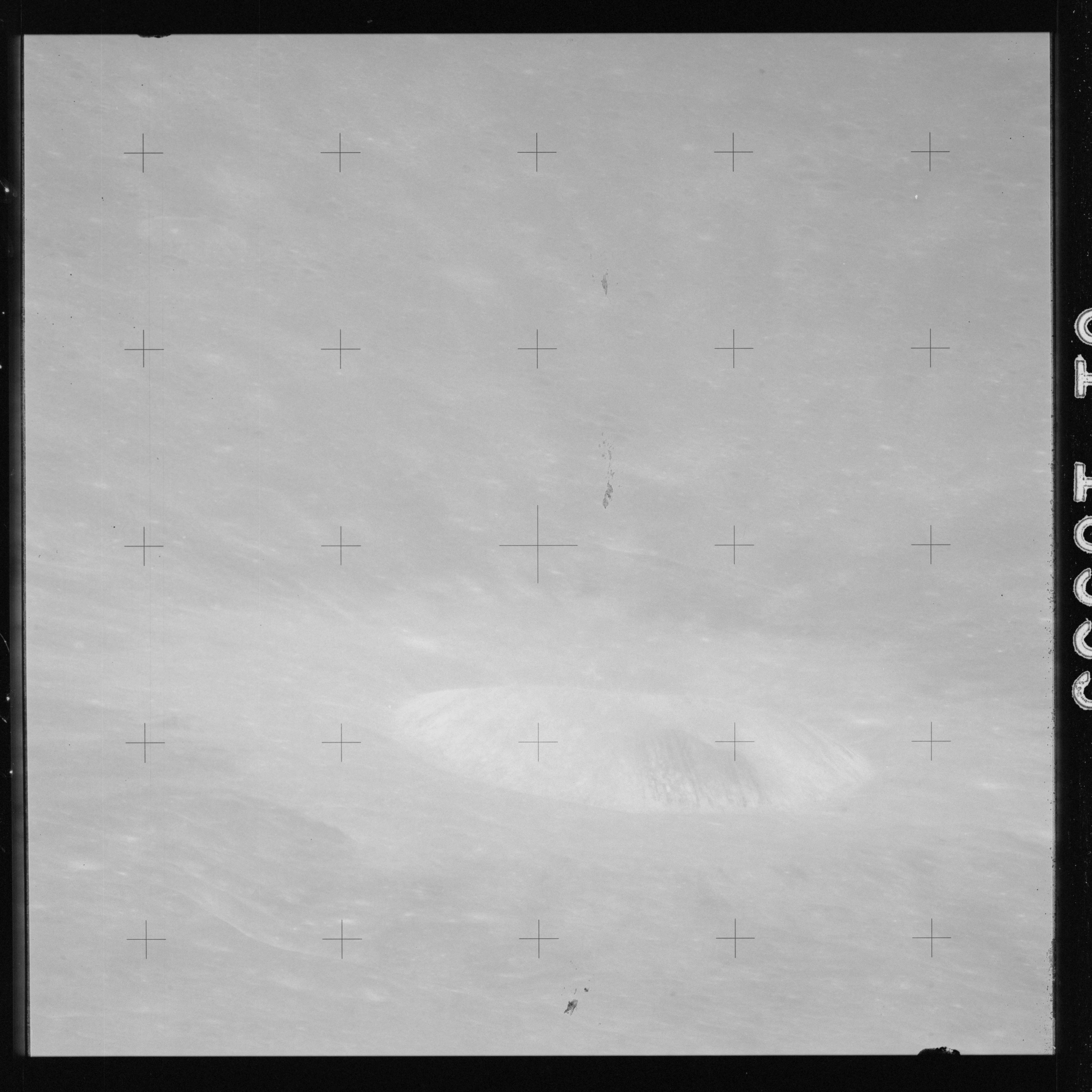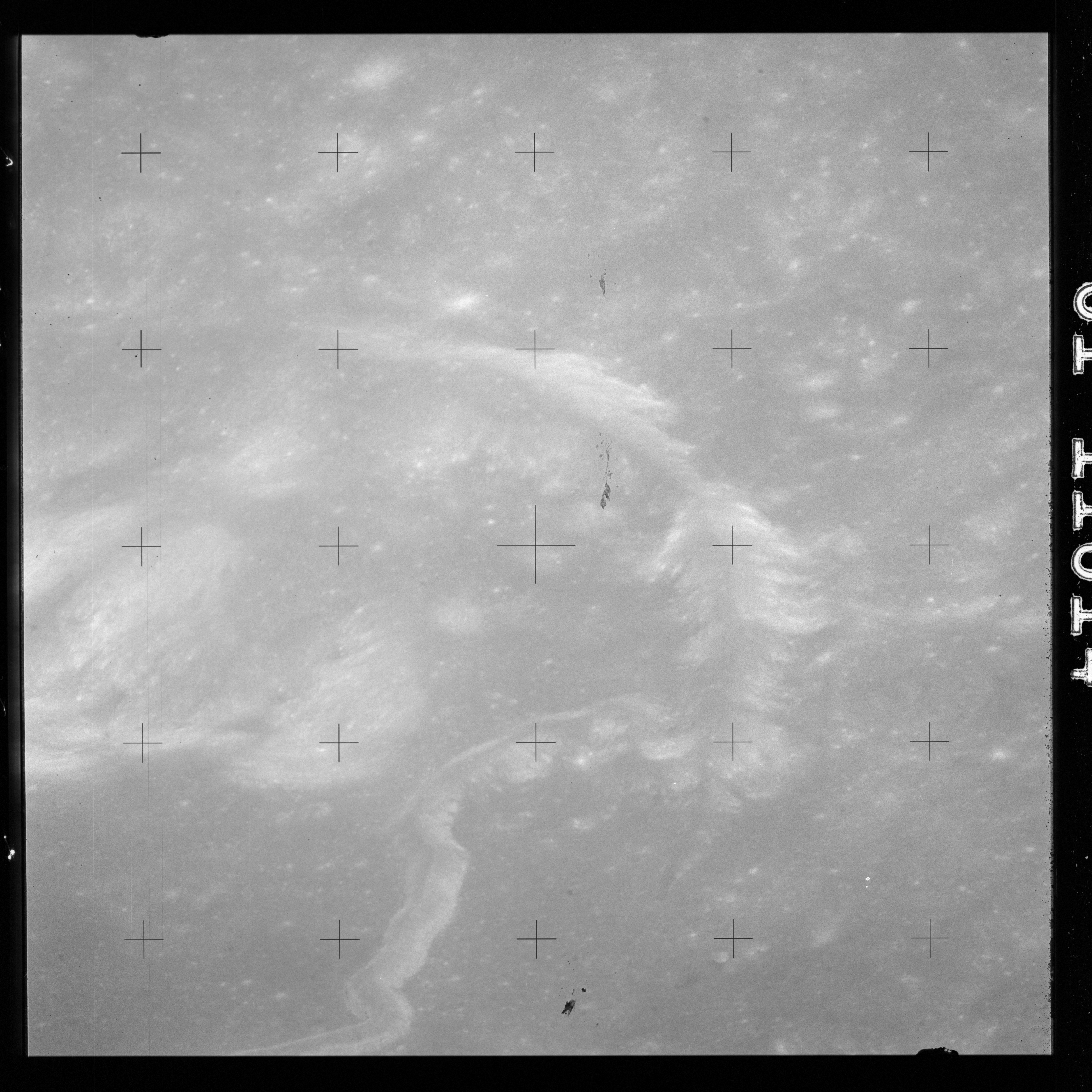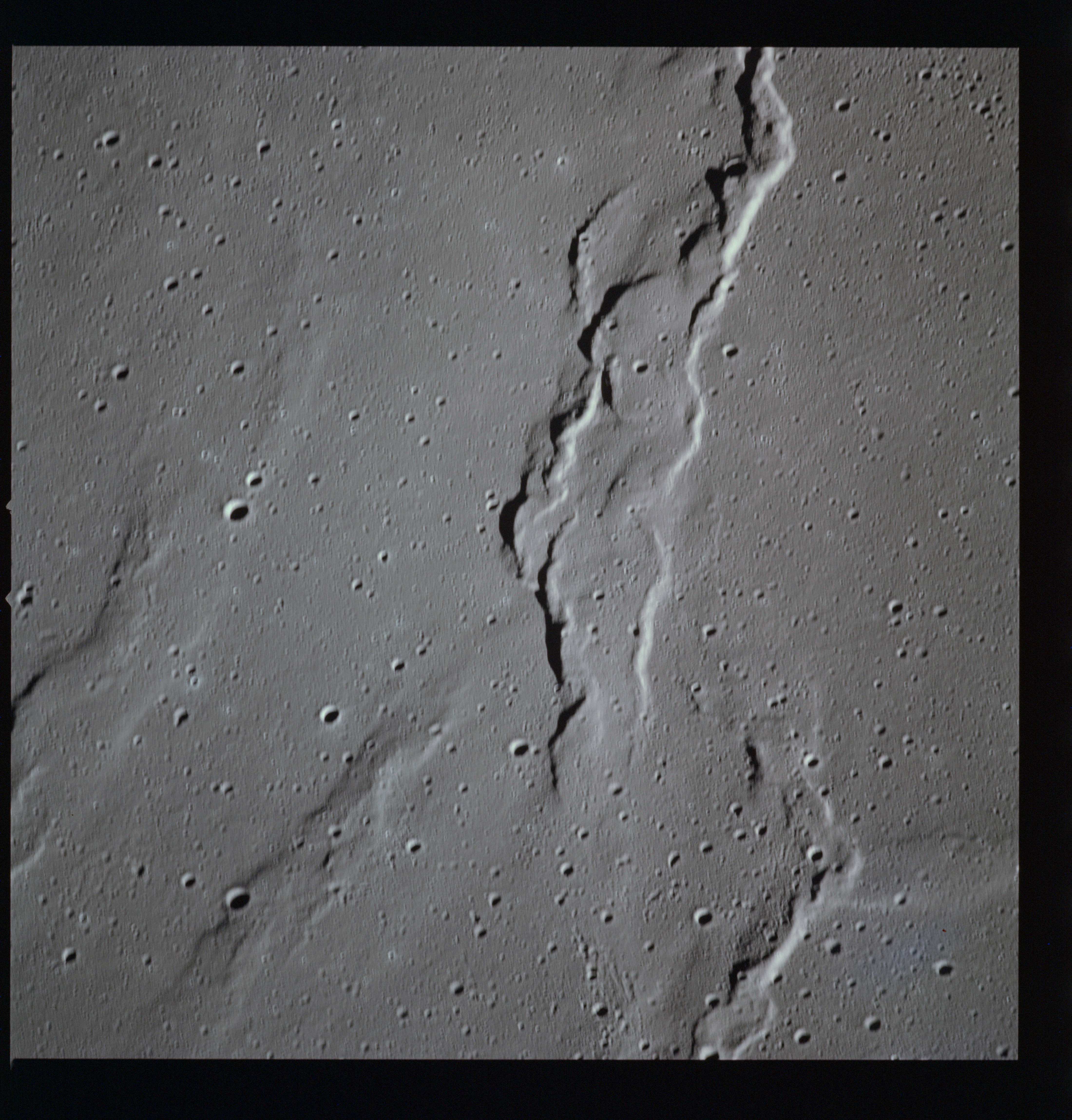 The crater to the right of the rille-producing pair is Toscanelli. The remaining ten frames on magazine PP for this pass follow slightly to the west of Toscanelli across the northern edge of the Aristarchus Plateau to Montes Agricola, finally settling on its northern end.