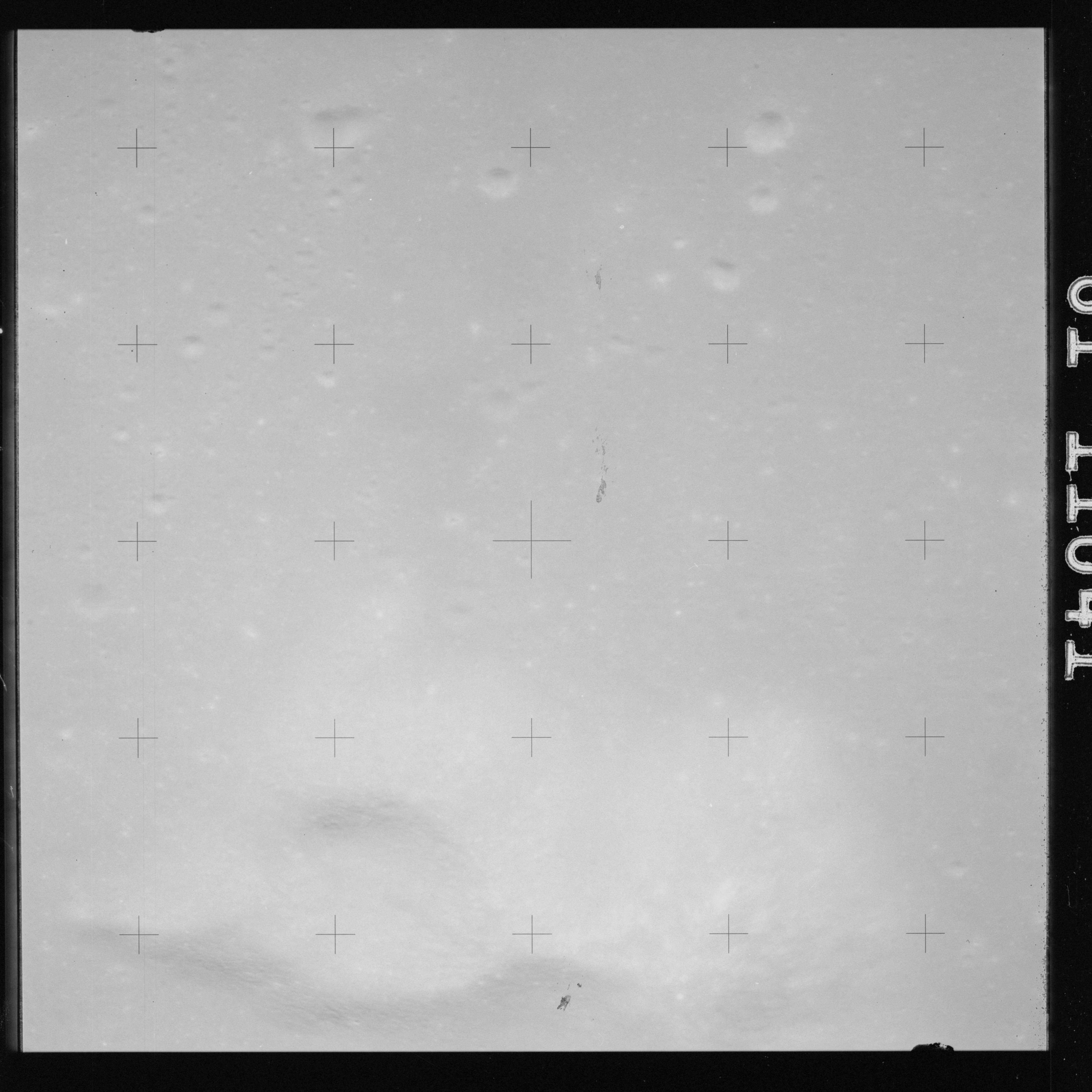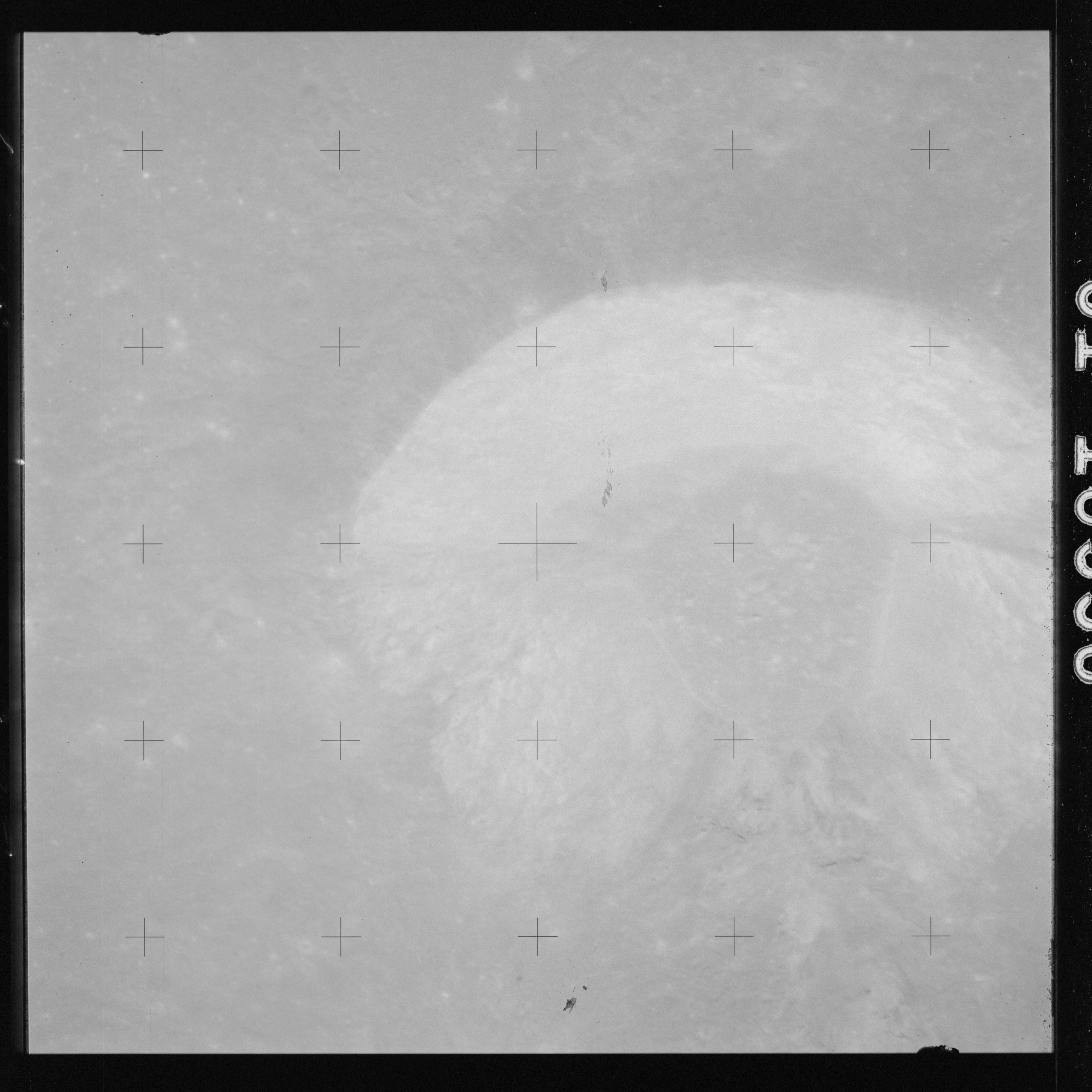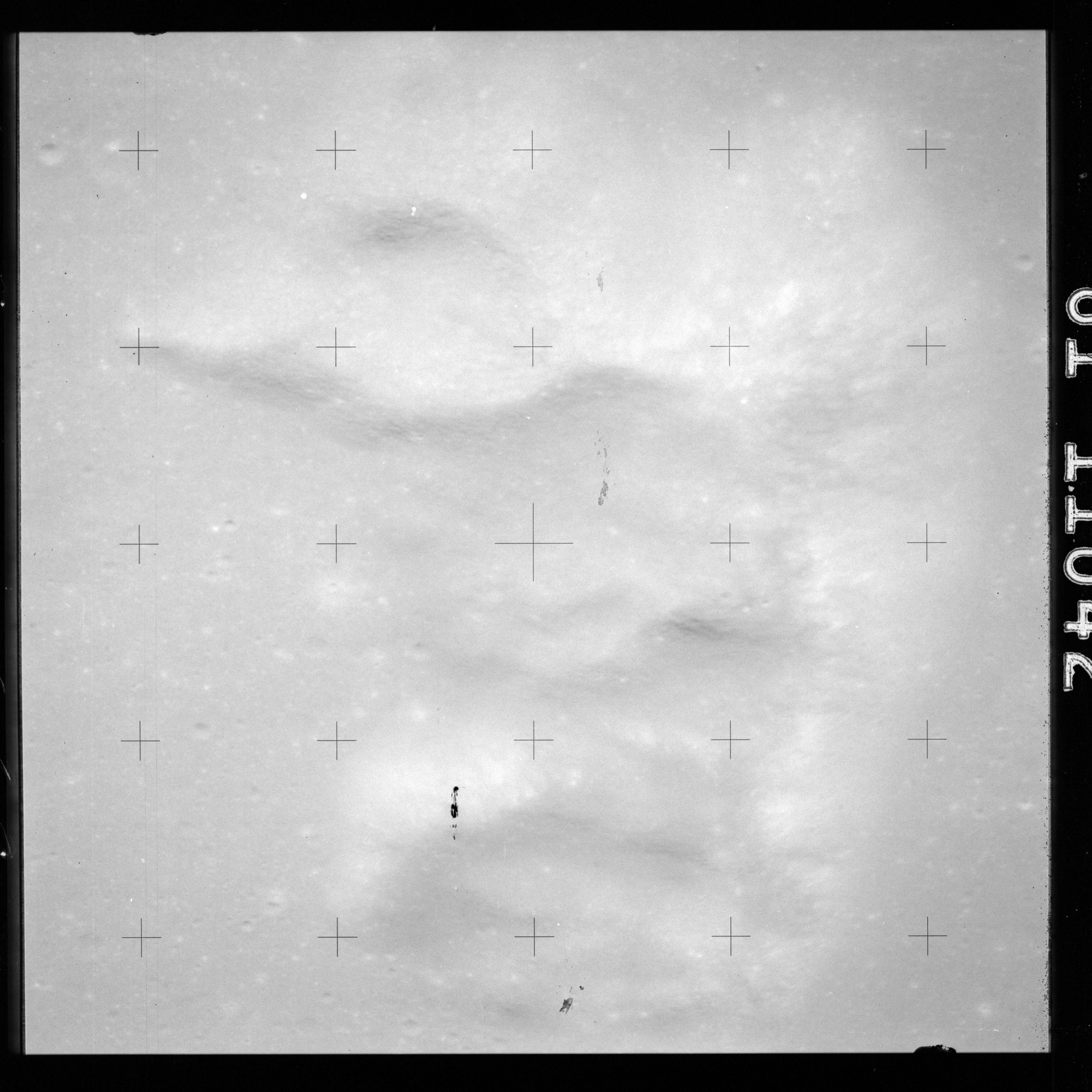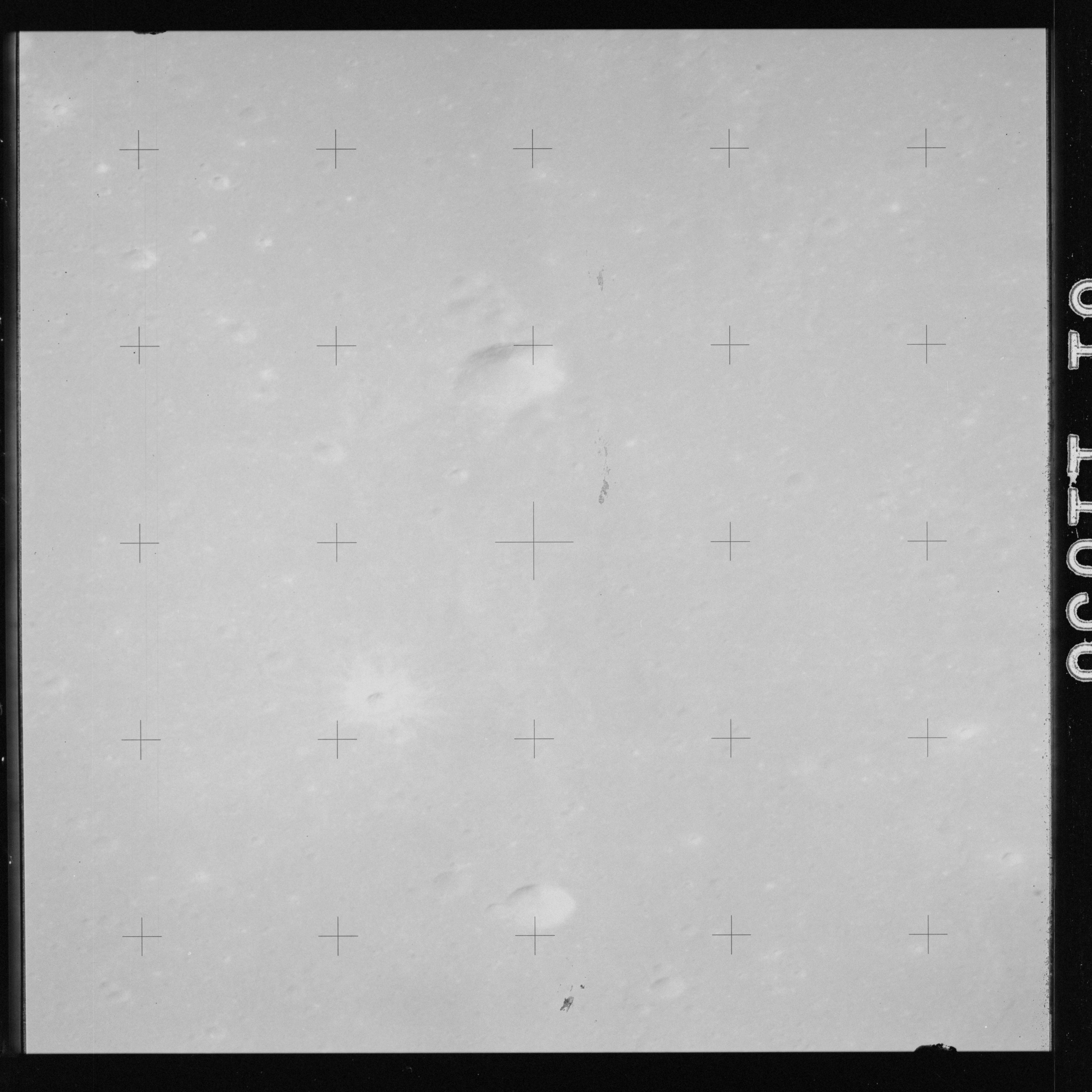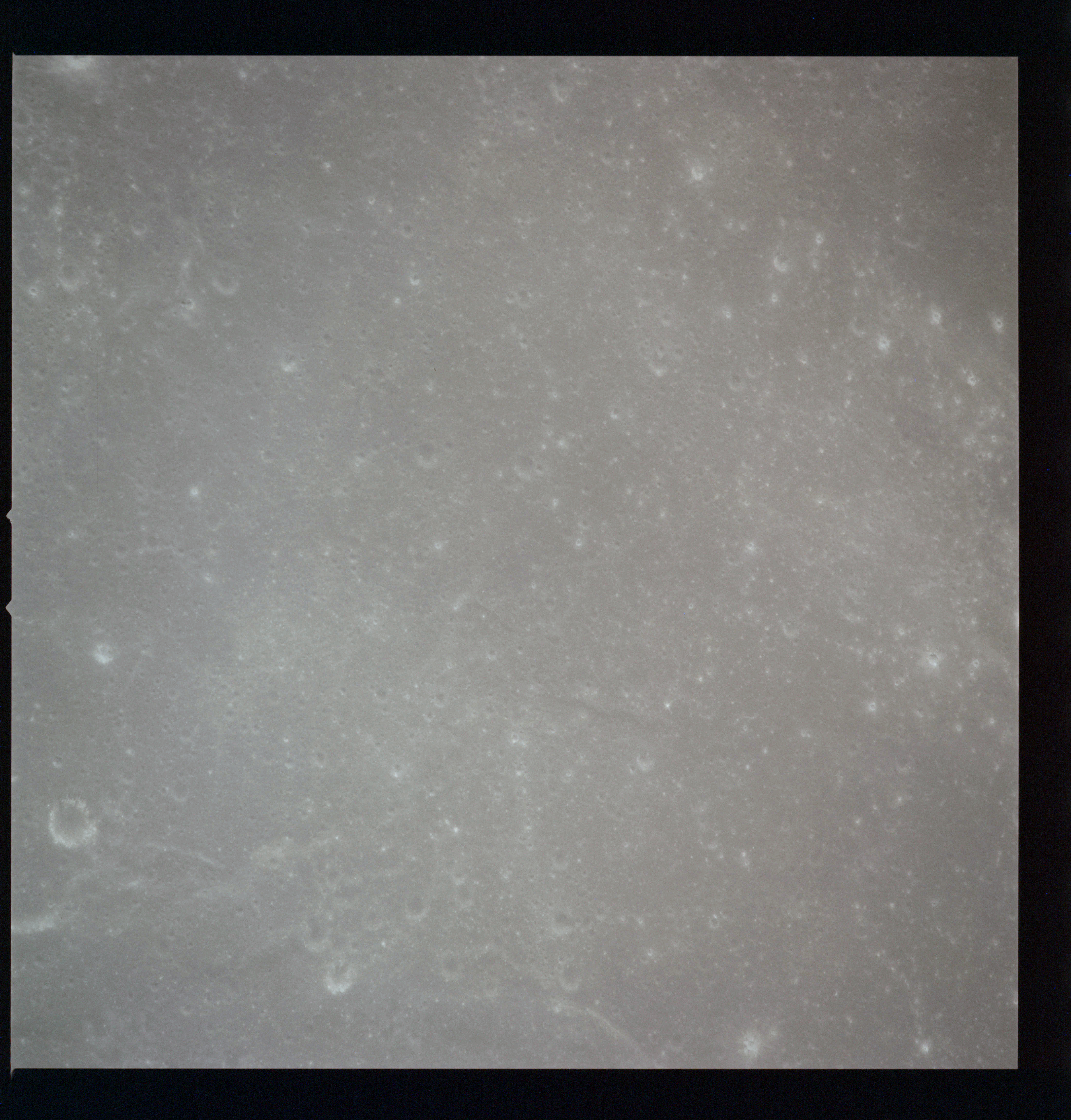 The crater to the right of the rille-producing pair is Toscanelli. The remaining ten frames on magazine PP for this pass follow slightly to the west of Toscanelli across the northern edge of the Aristarchus Plateau to Montes Agricola, finally settling on its northern end.