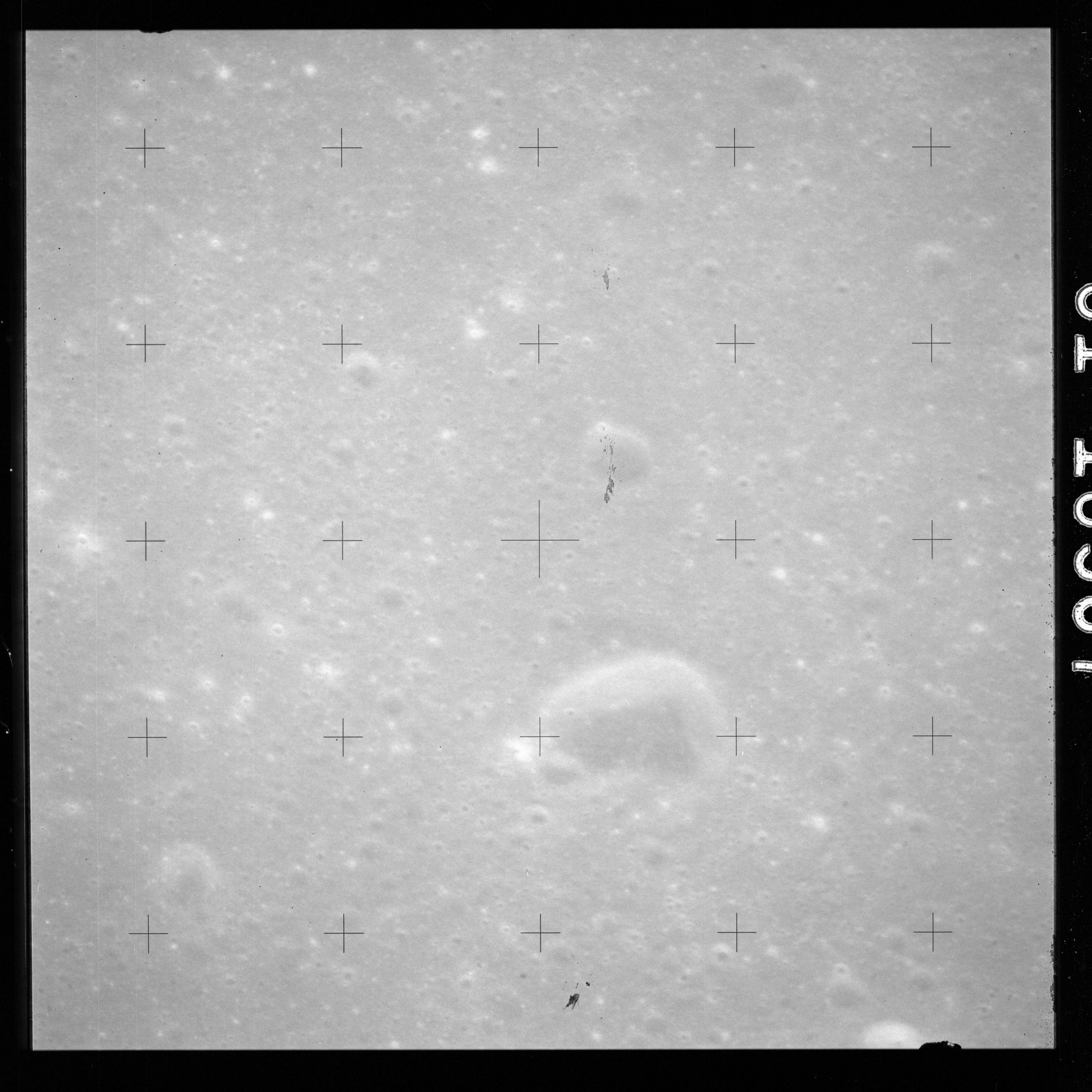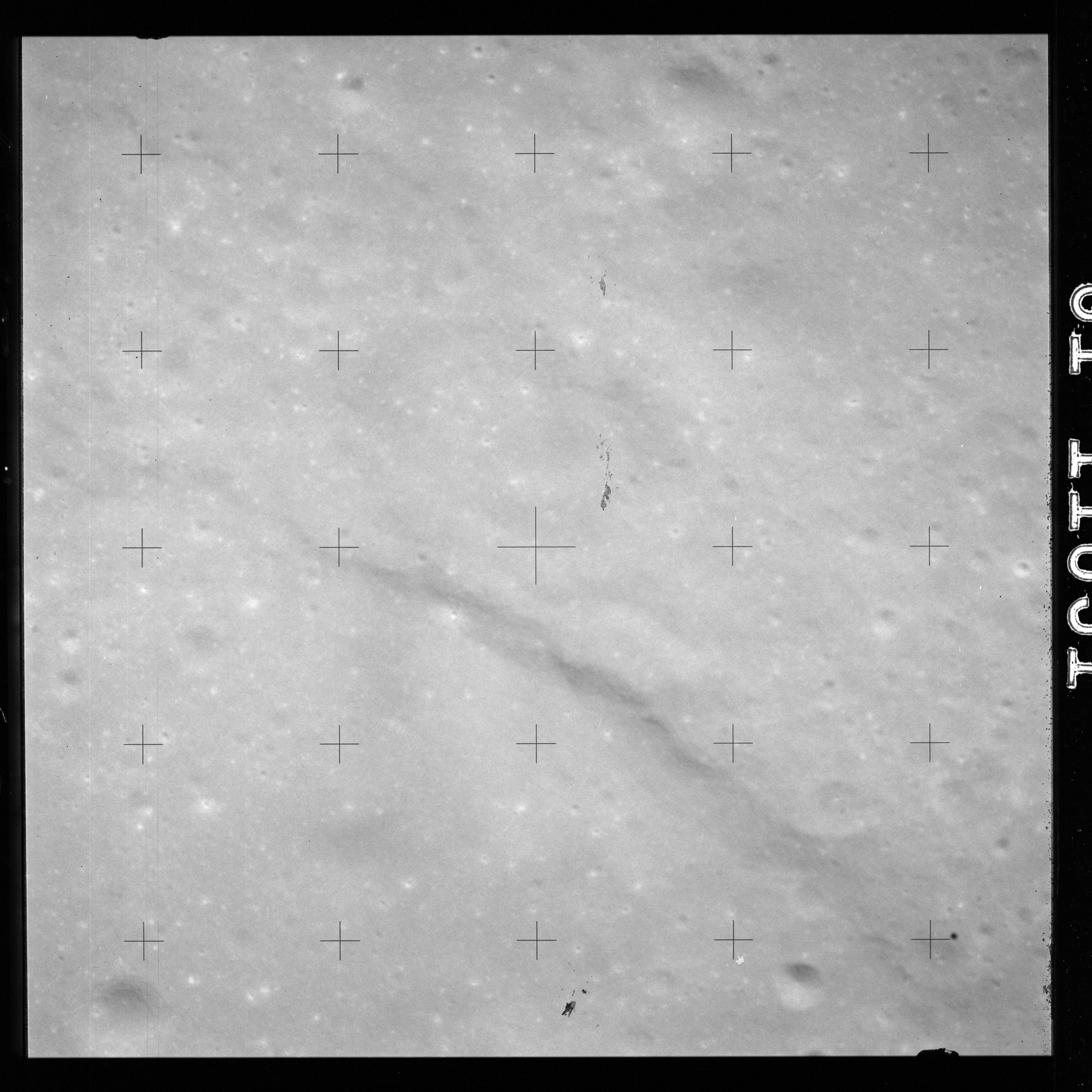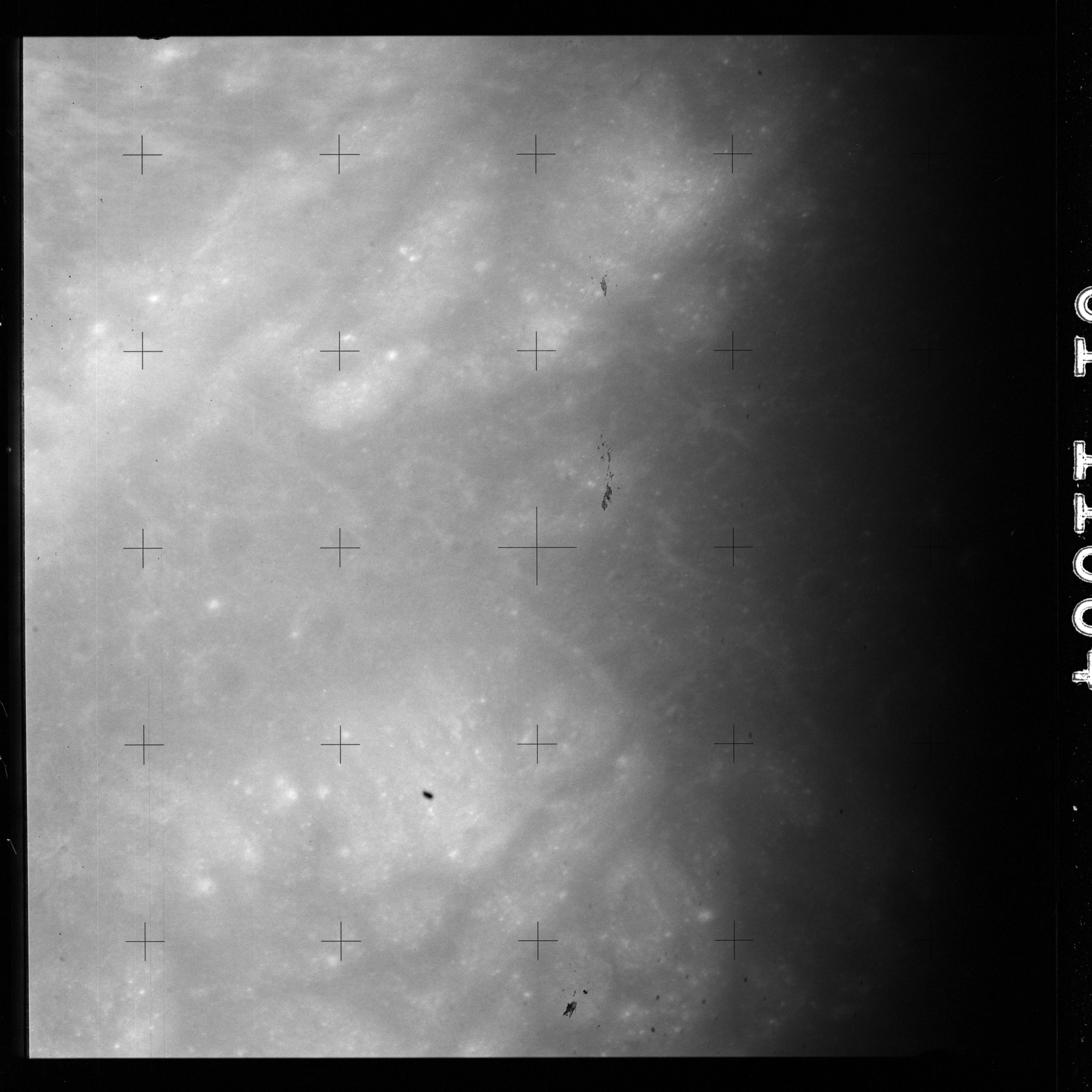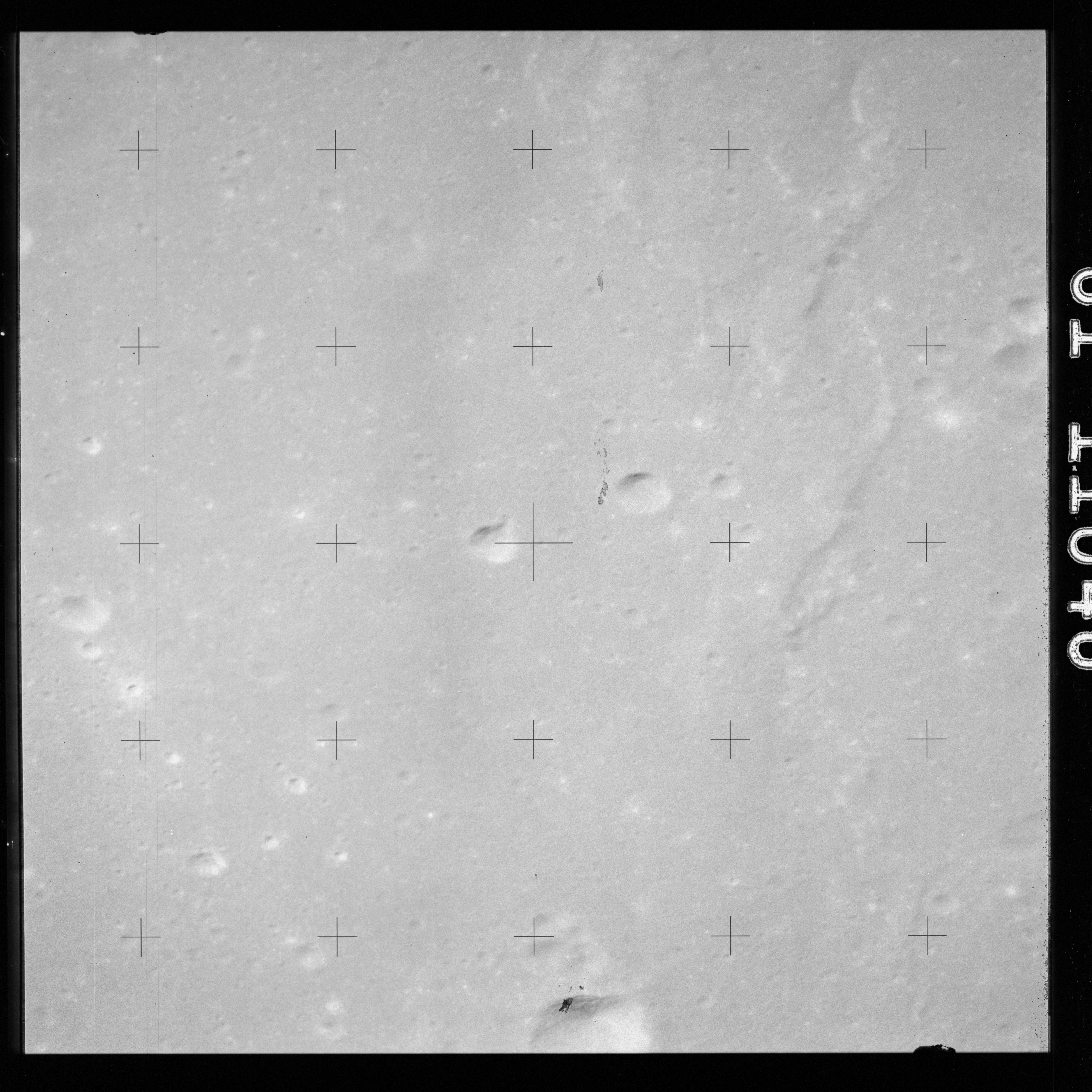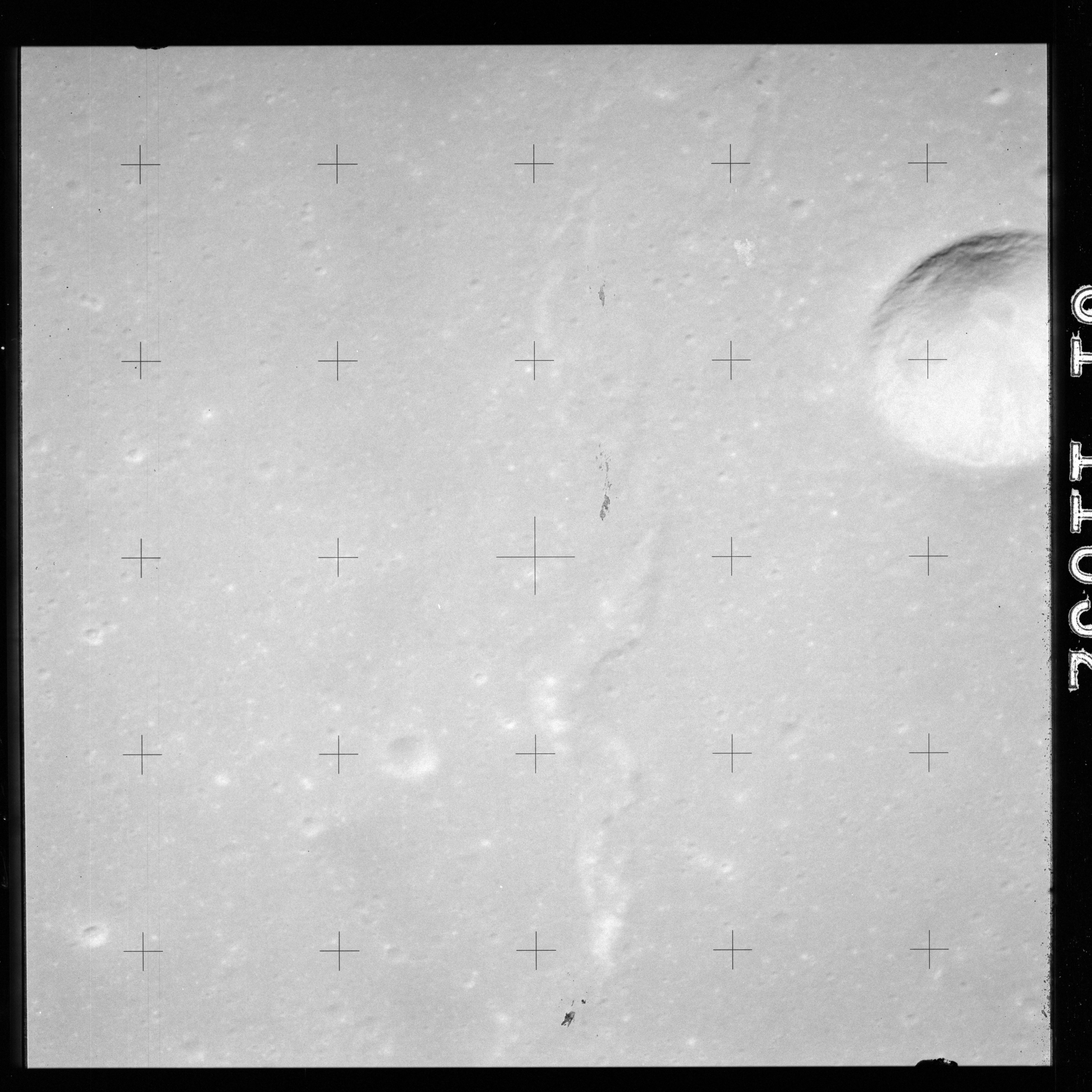 The crater to the right of the rille-producing pair is Toscanelli. The remaining ten frames on magazine PP for this pass follow slightly to the west of Toscanelli across the northern edge of the Aristarchus Plateau to Montes Agricola, finally settling on its northern end.