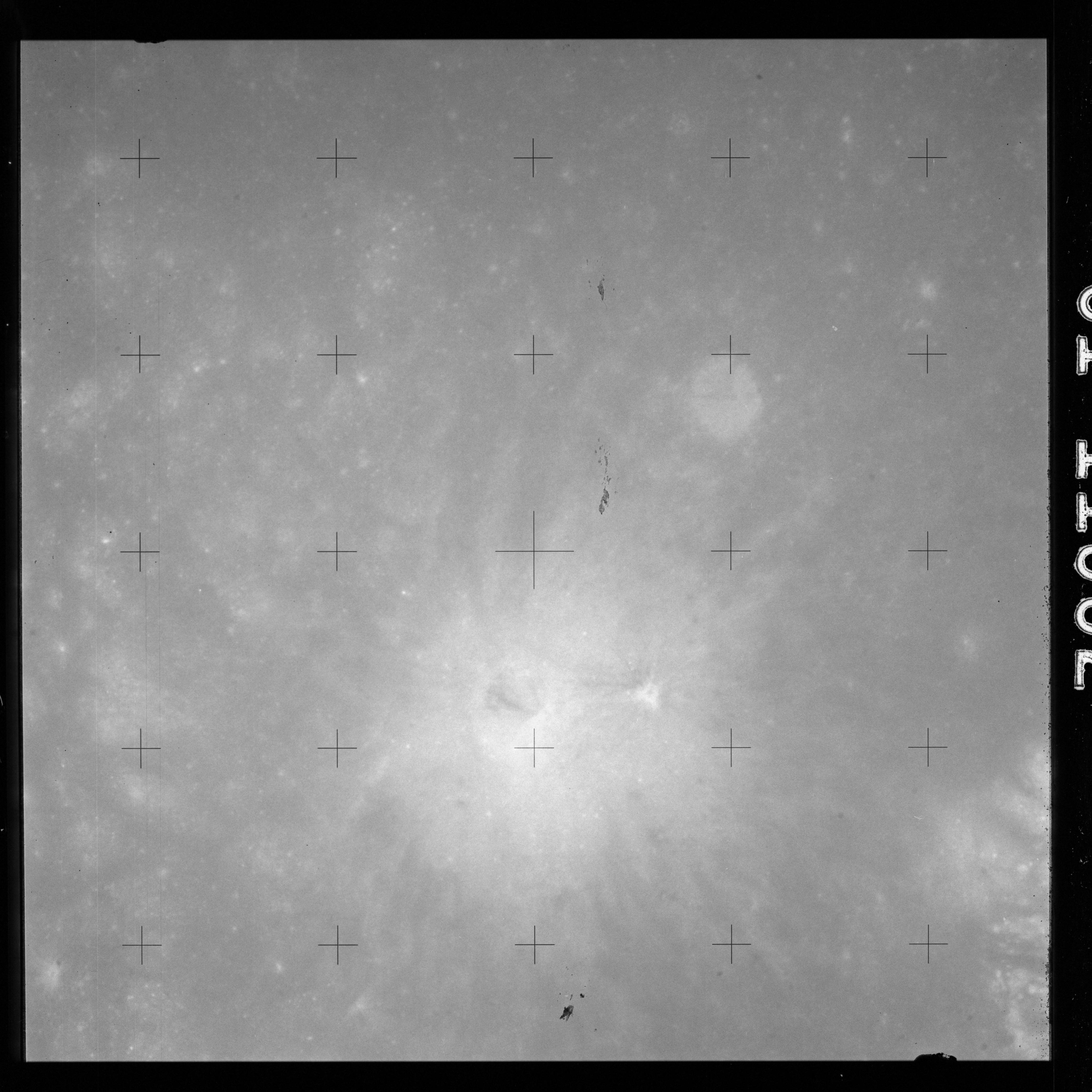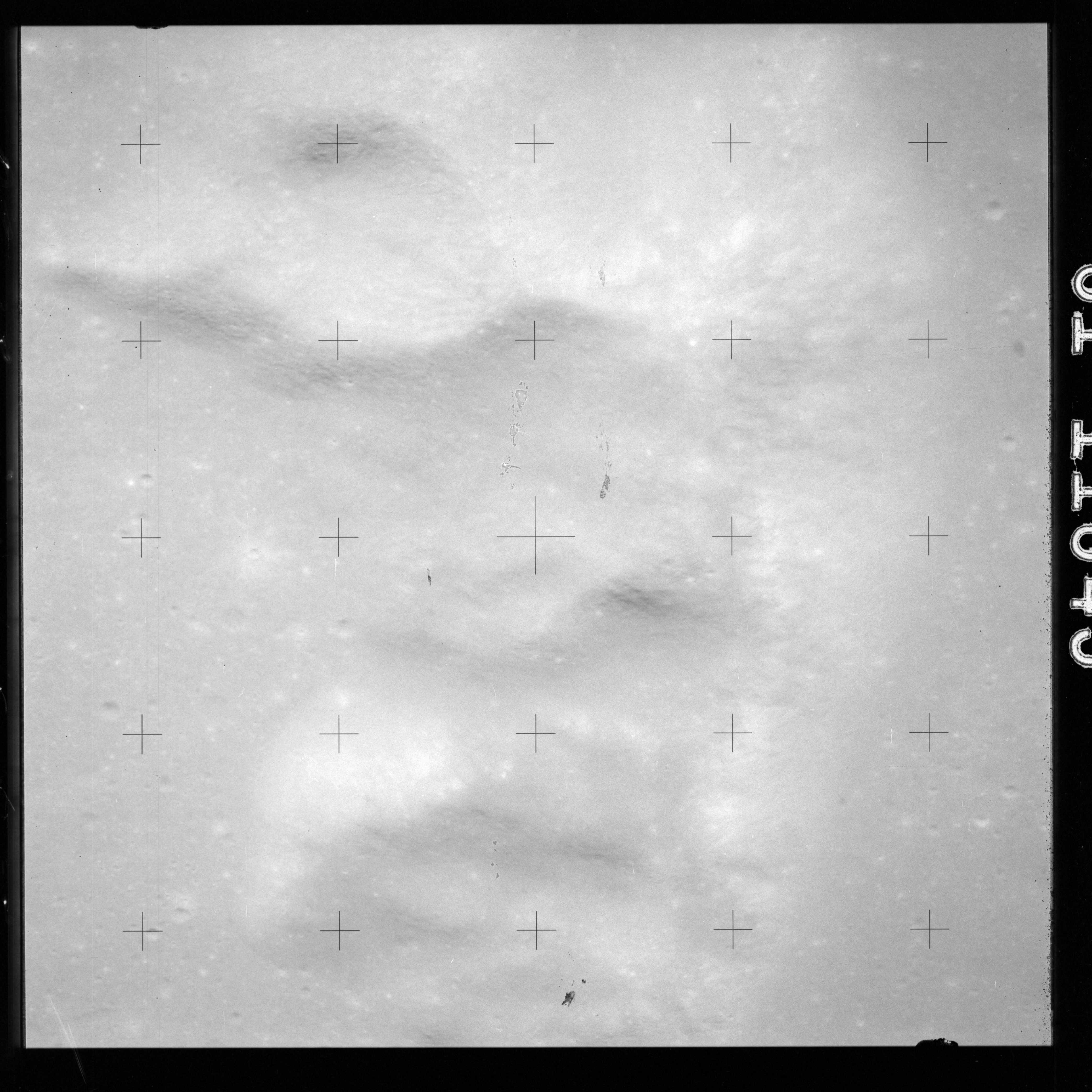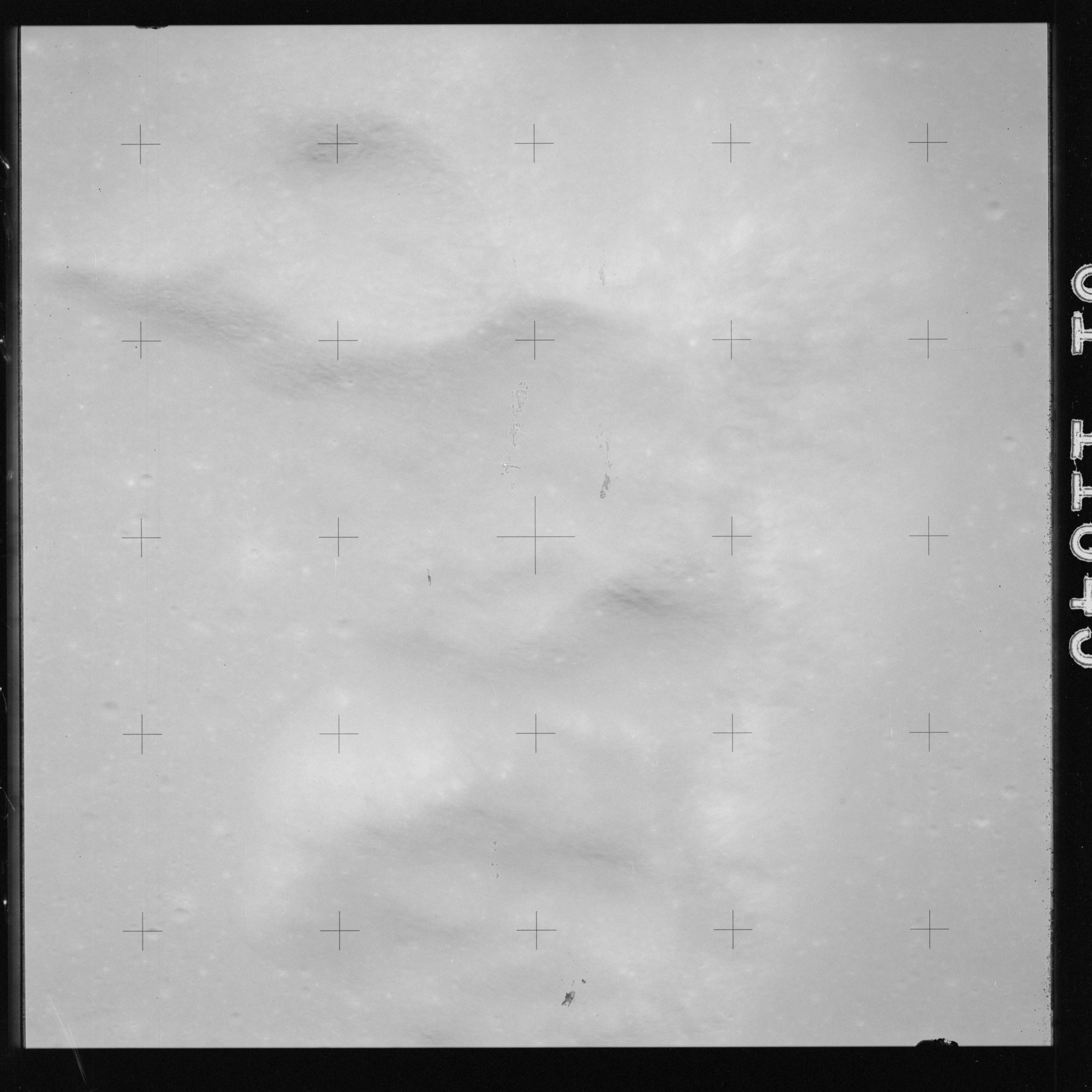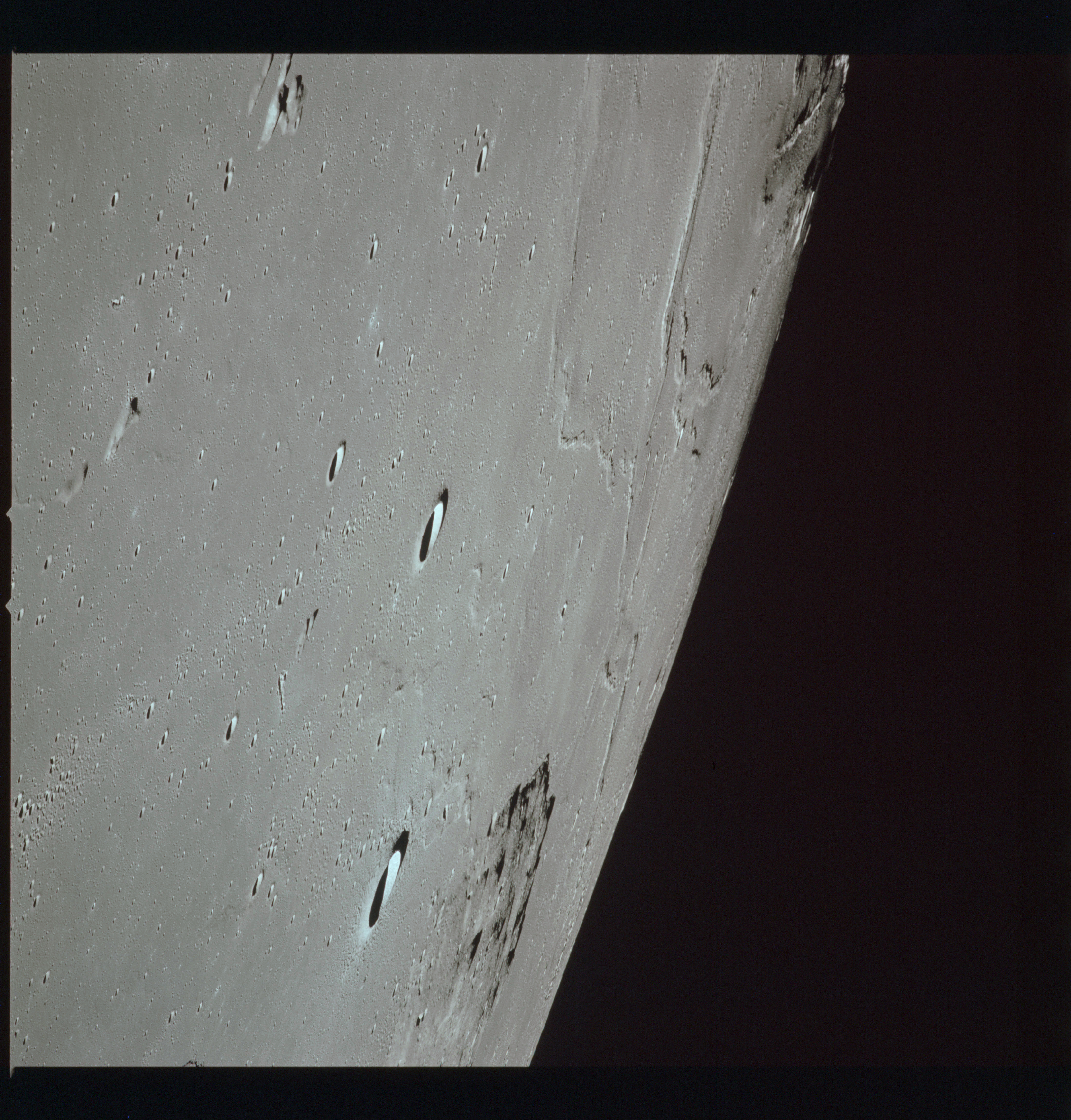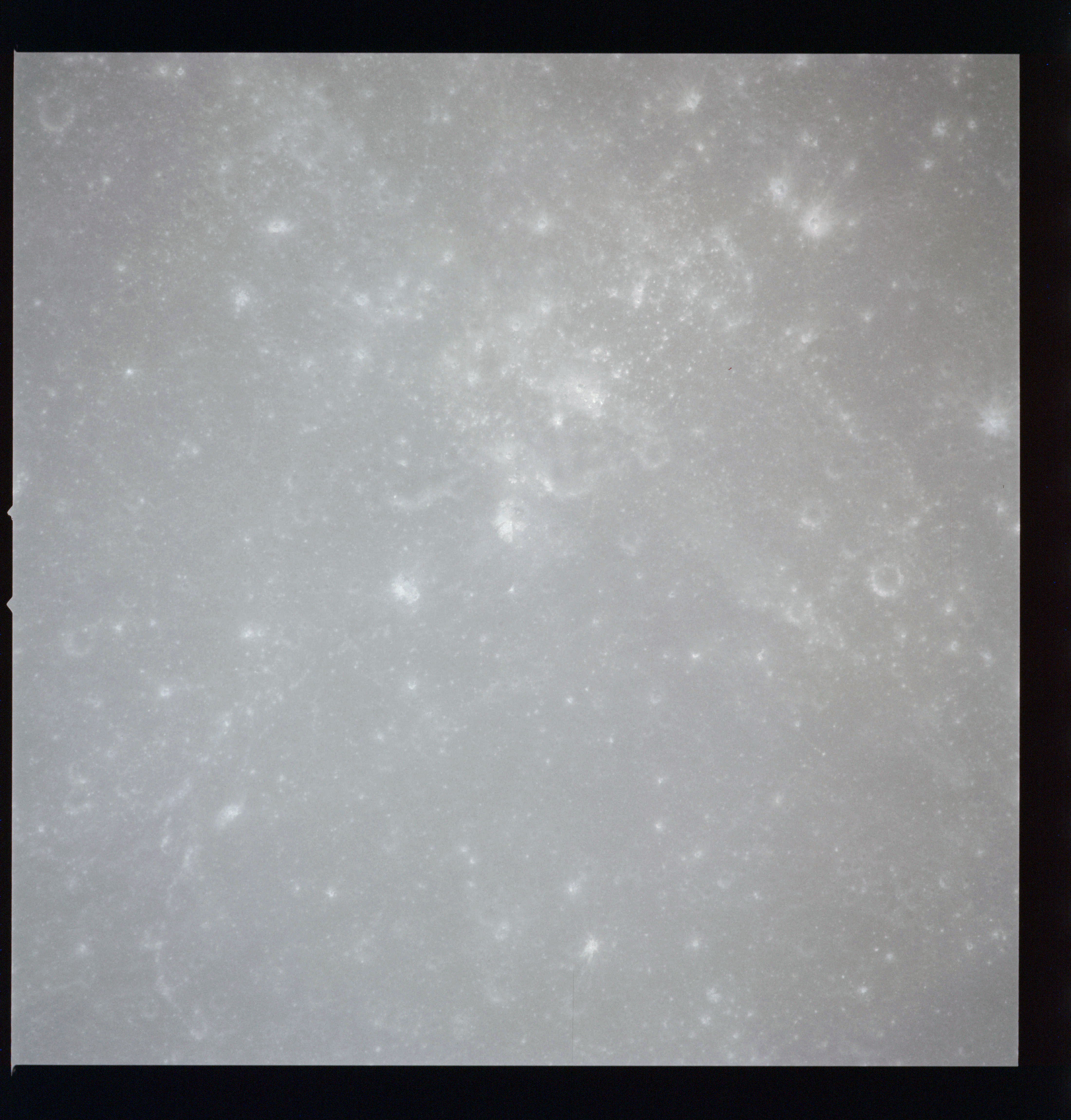 The crater to the right of the rille-producing pair is Toscanelli. The remaining ten frames on magazine PP for this pass follow slightly to the west of Toscanelli across the northern edge of the Aristarchus Plateau to Montes Agricola, finally settling on its northern end.