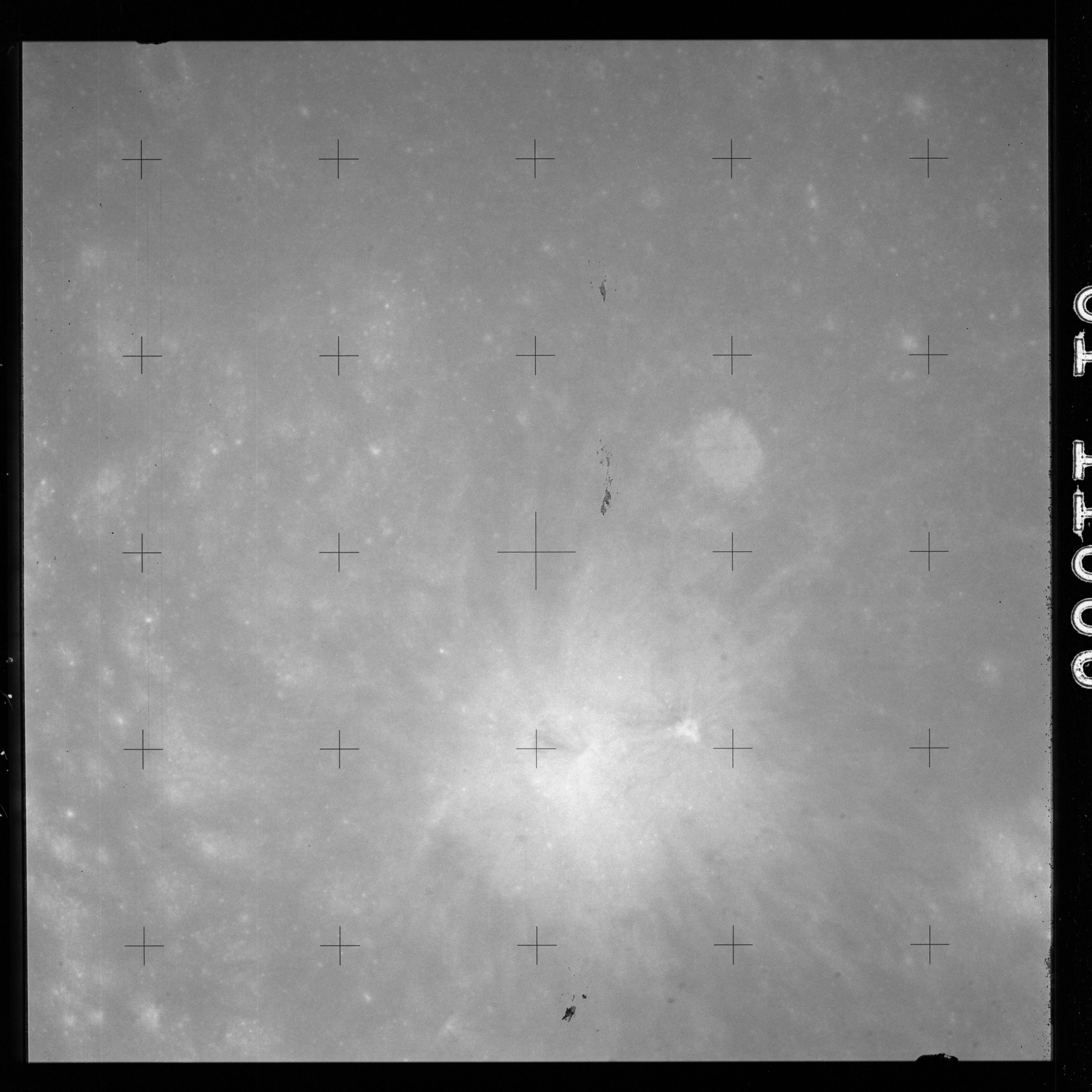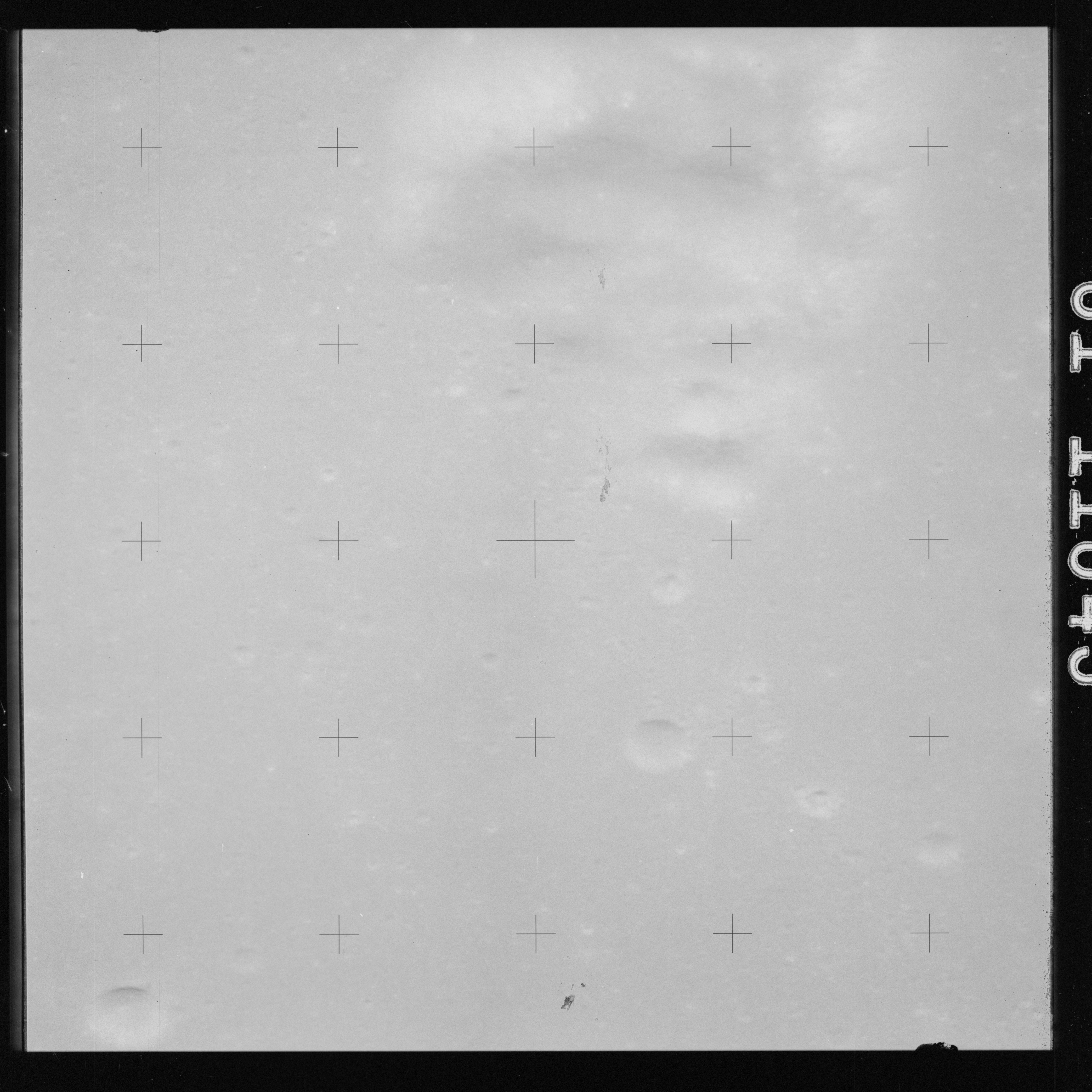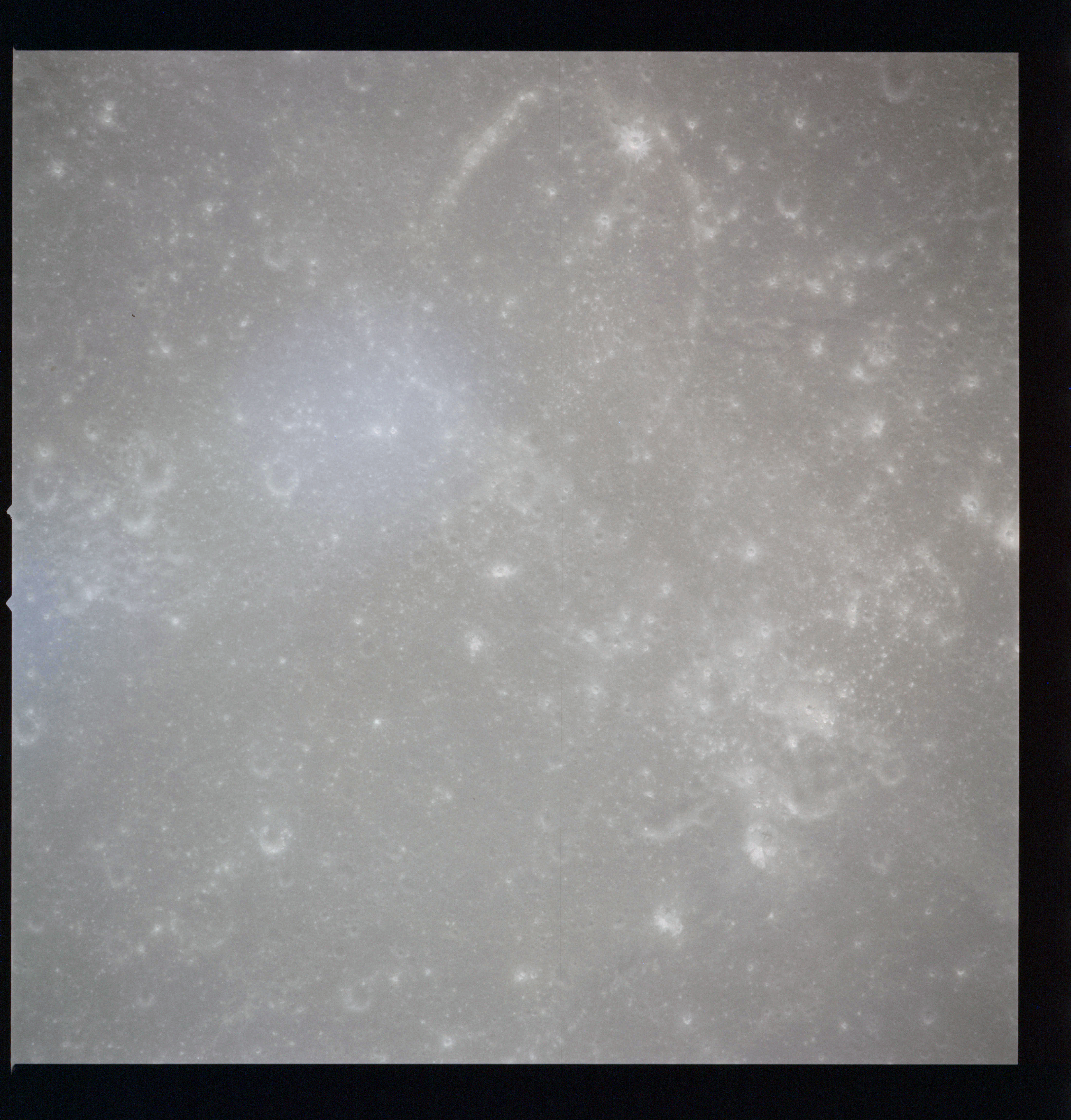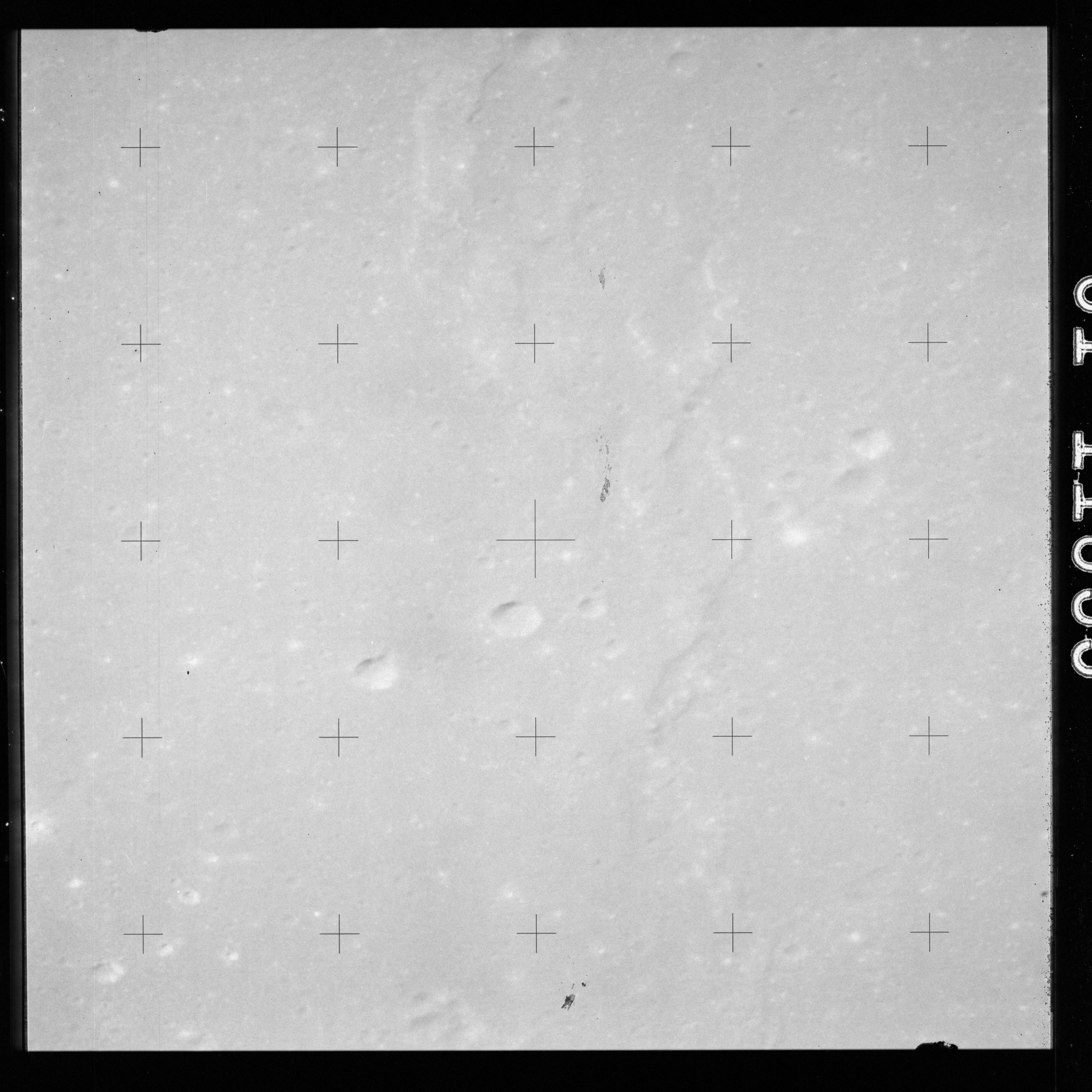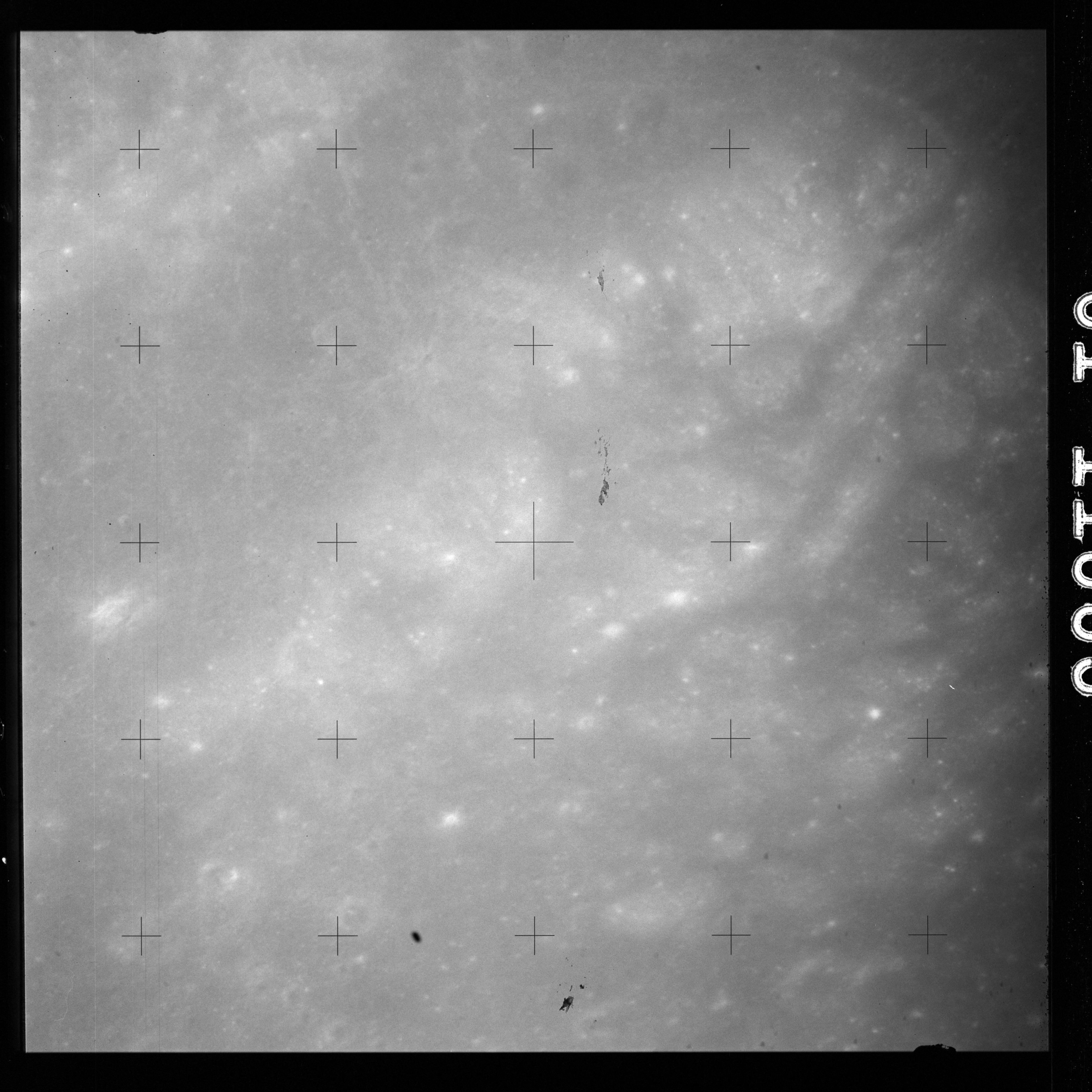 The crater to the right of the rille-producing pair is Toscanelli. The remaining ten frames on magazine PP for this pass follow slightly to the west of Toscanelli across the northern edge of the Aristarchus Plateau to Montes Agricola, finally settling on its northern end.