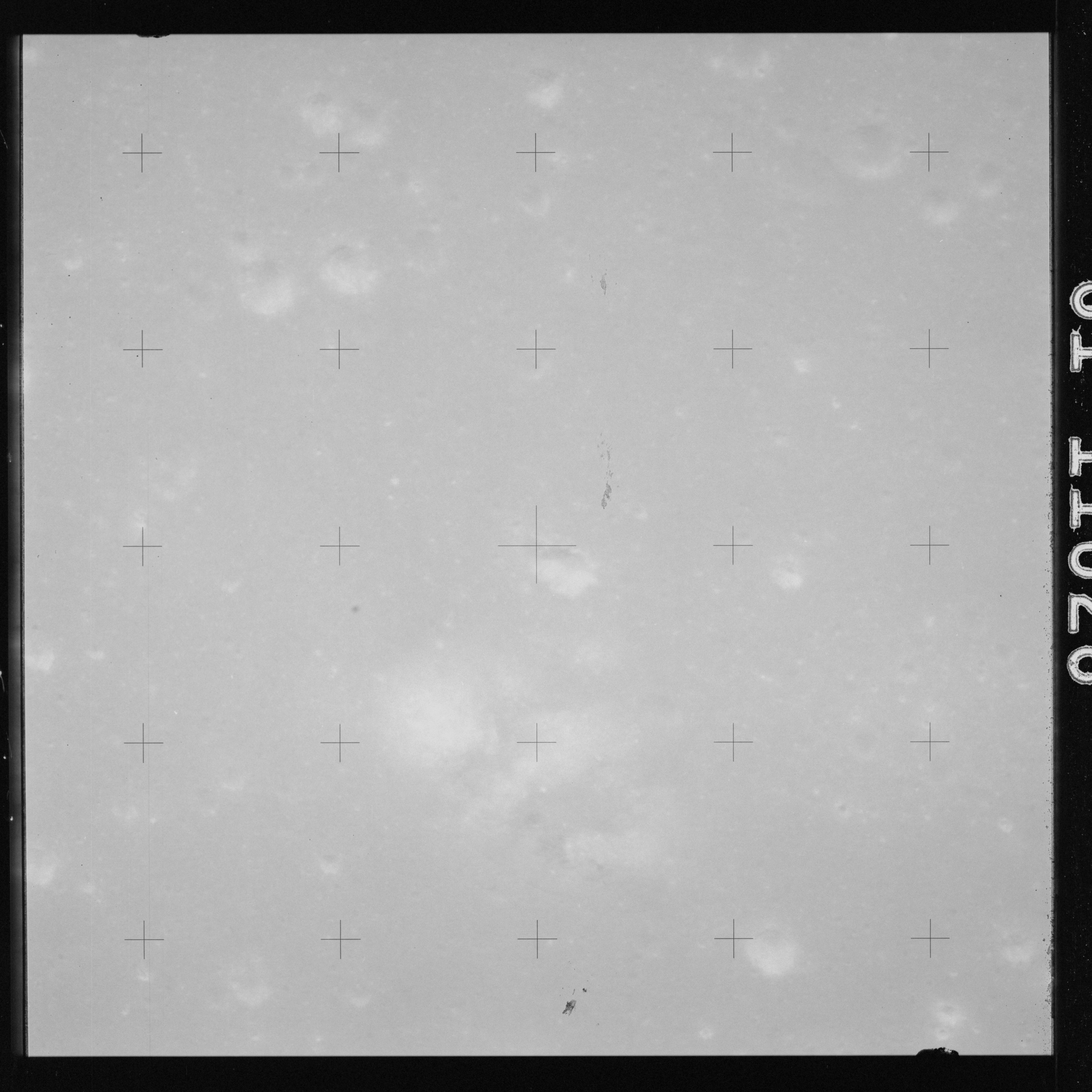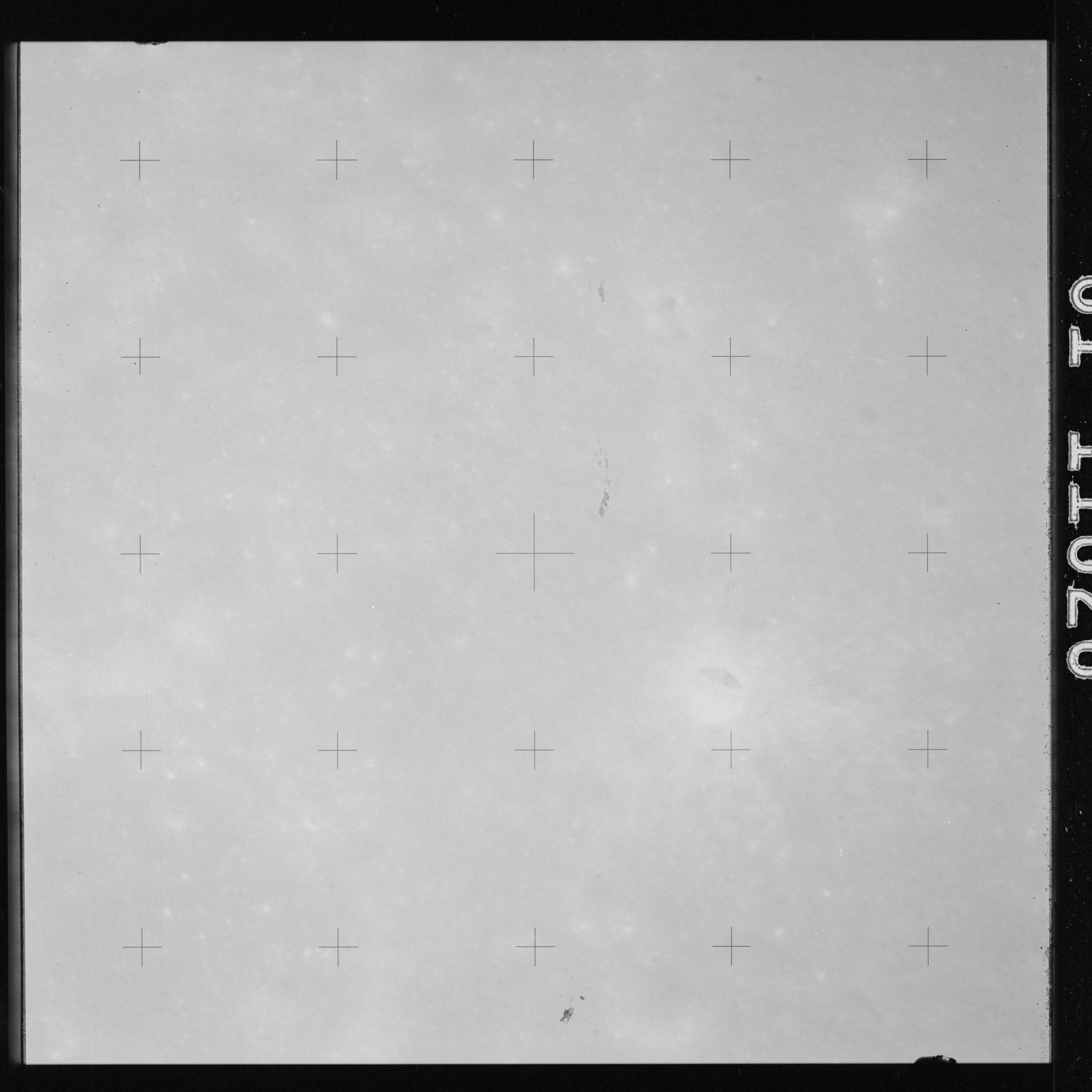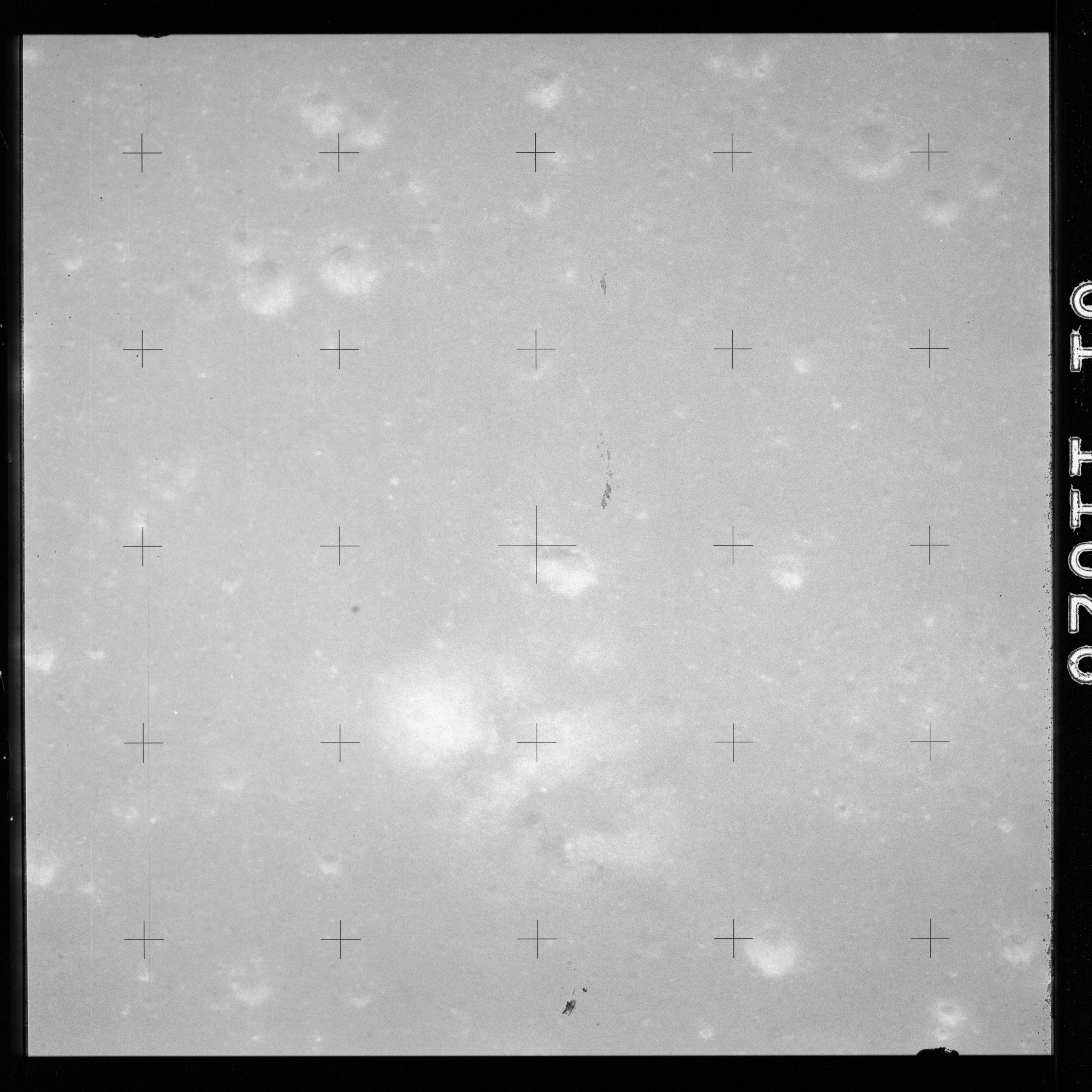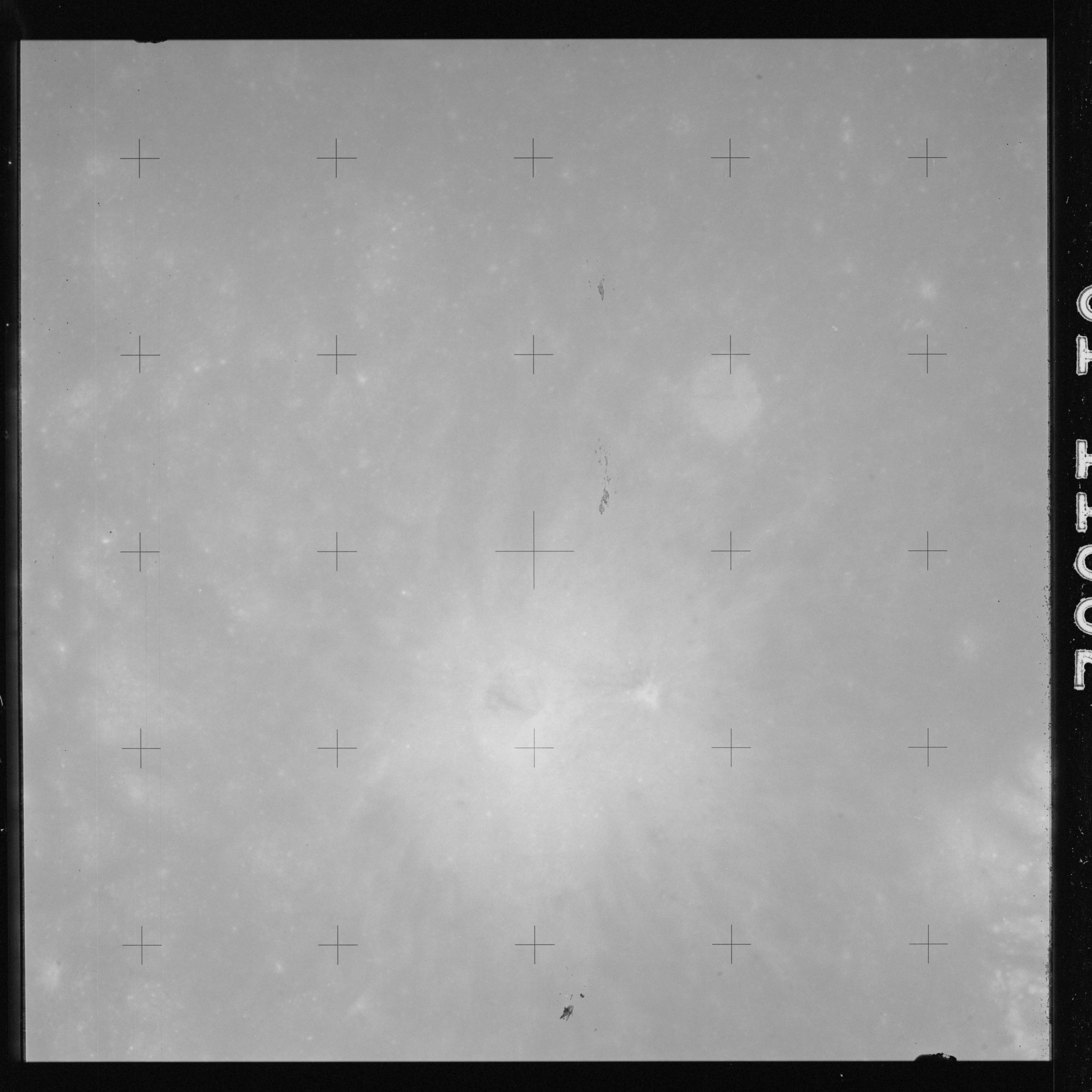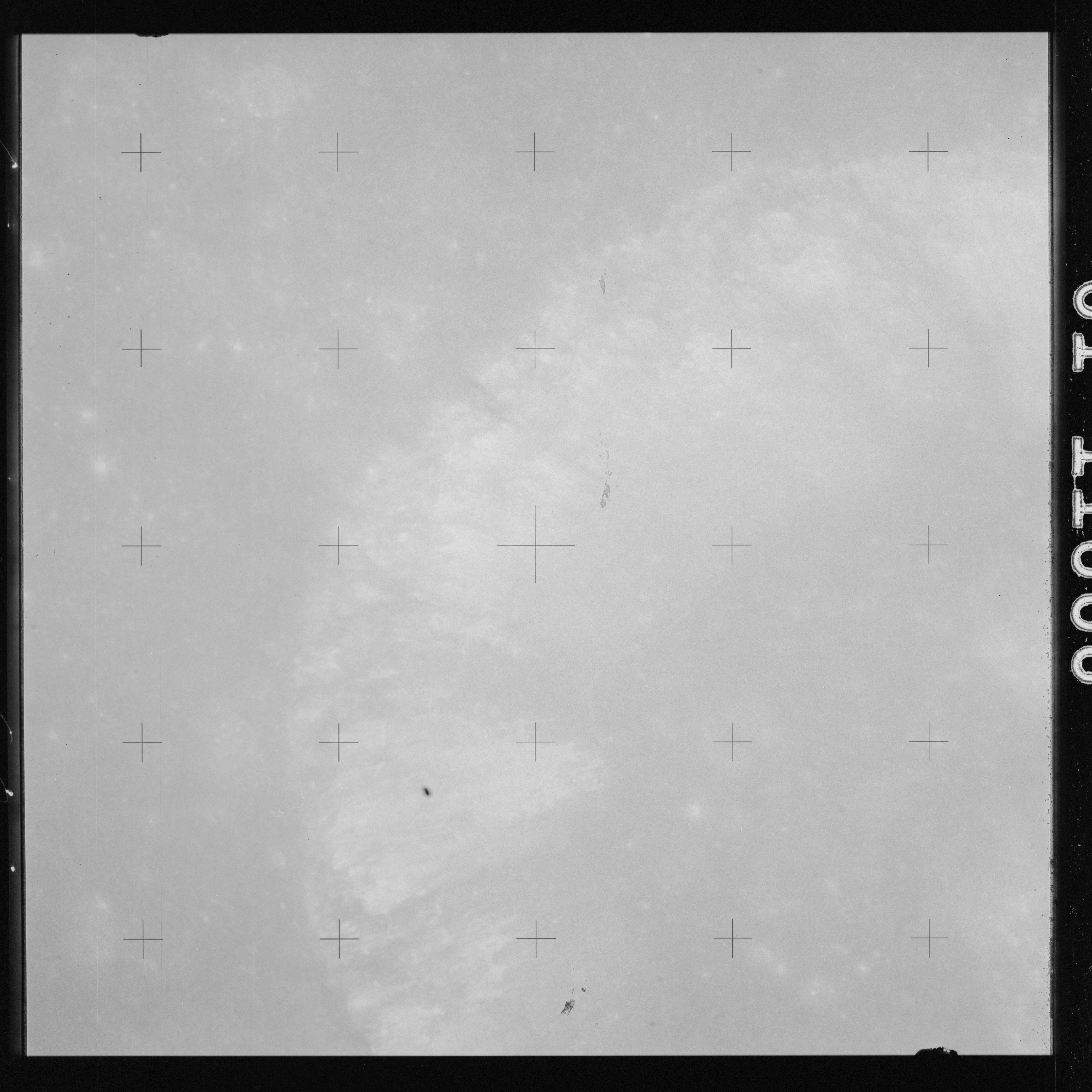 The crater to the right of the rille-producing pair is Toscanelli. The remaining ten frames on magazine PP for this pass follow slightly to the west of Toscanelli across the northern edge of the Aristarchus Plateau to Montes Agricola, finally settling on its northern end.