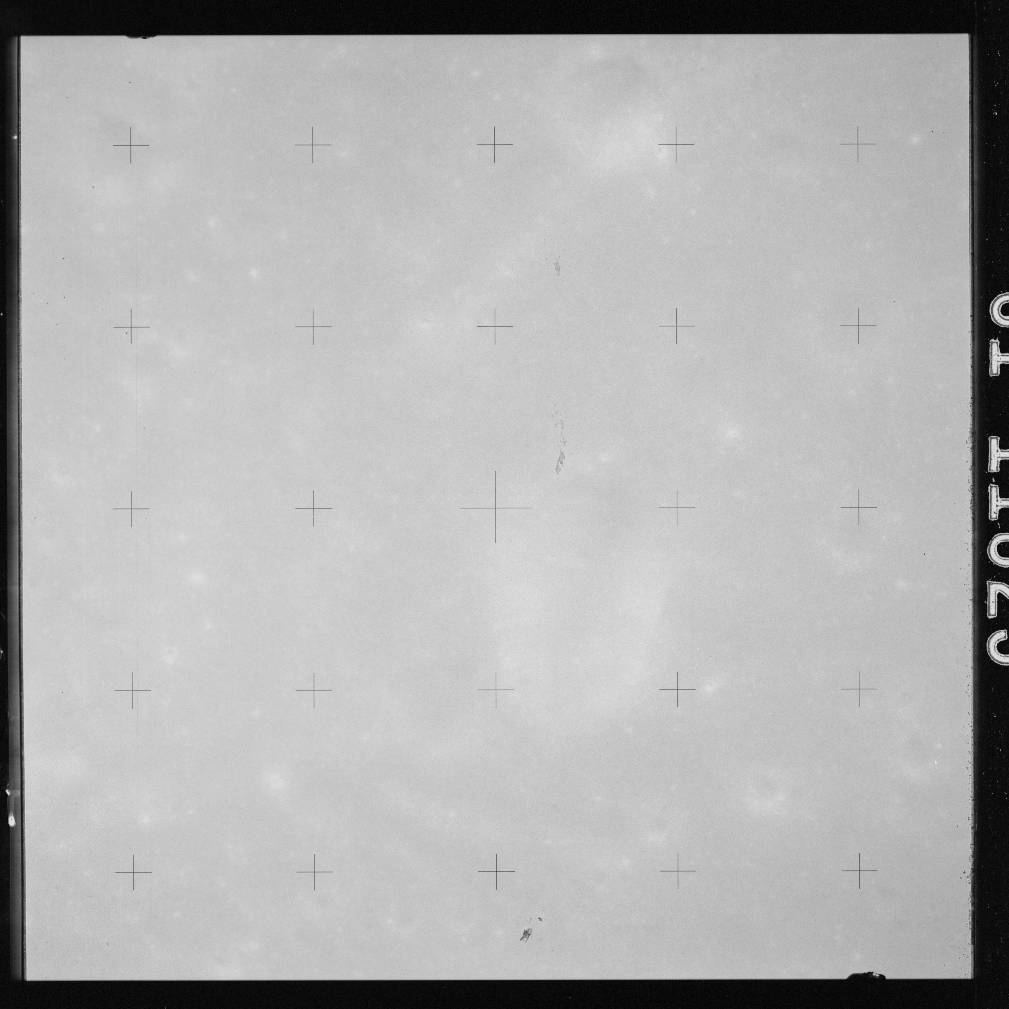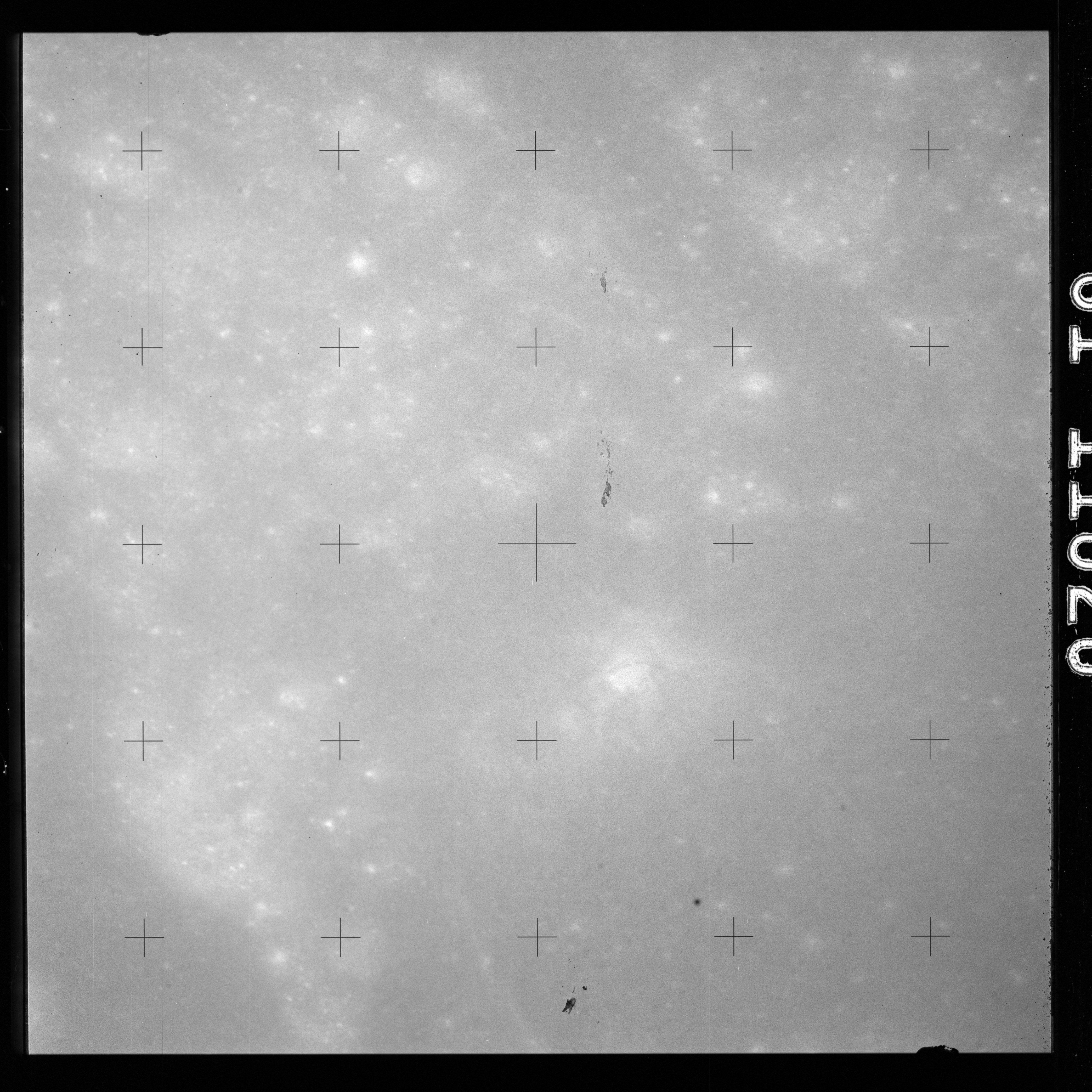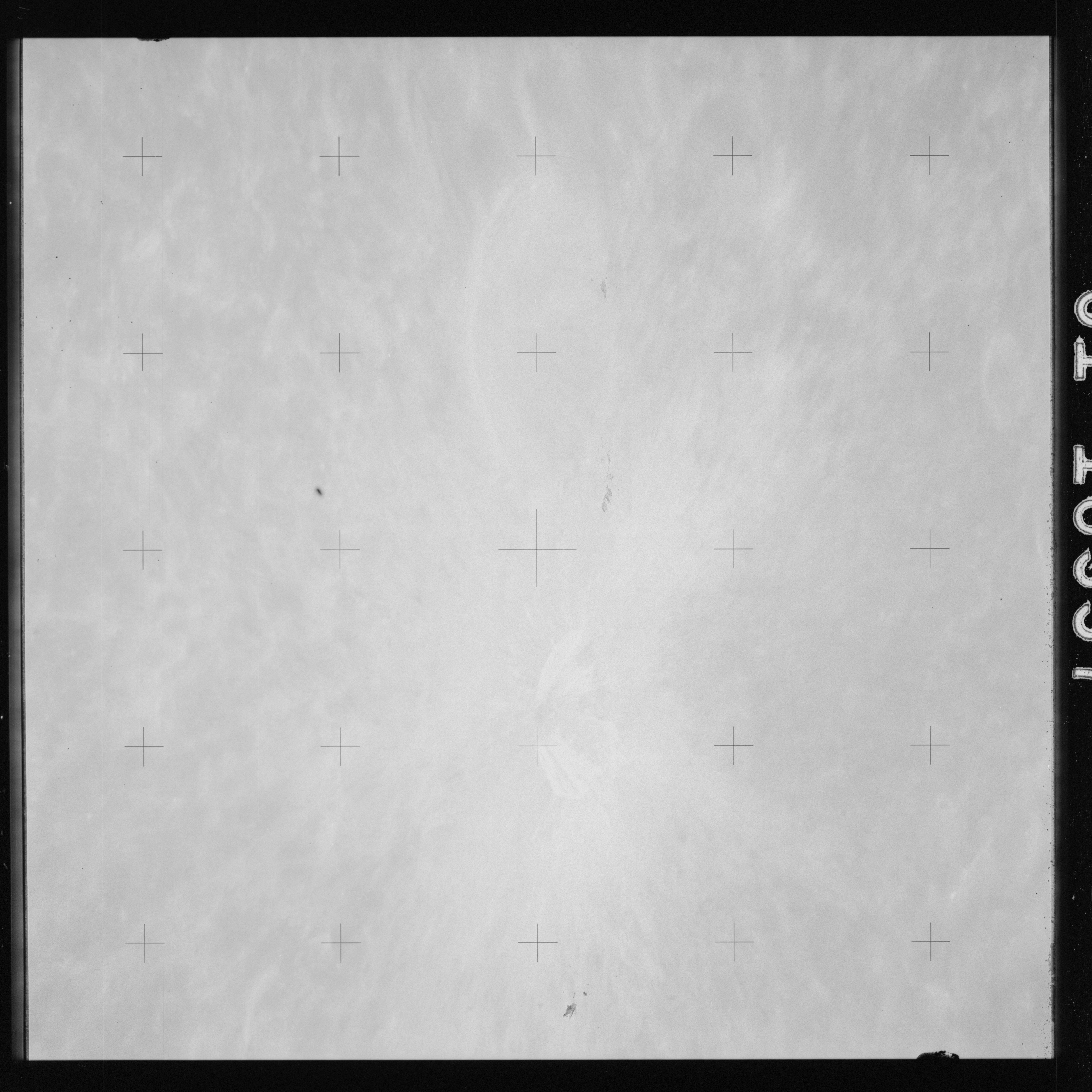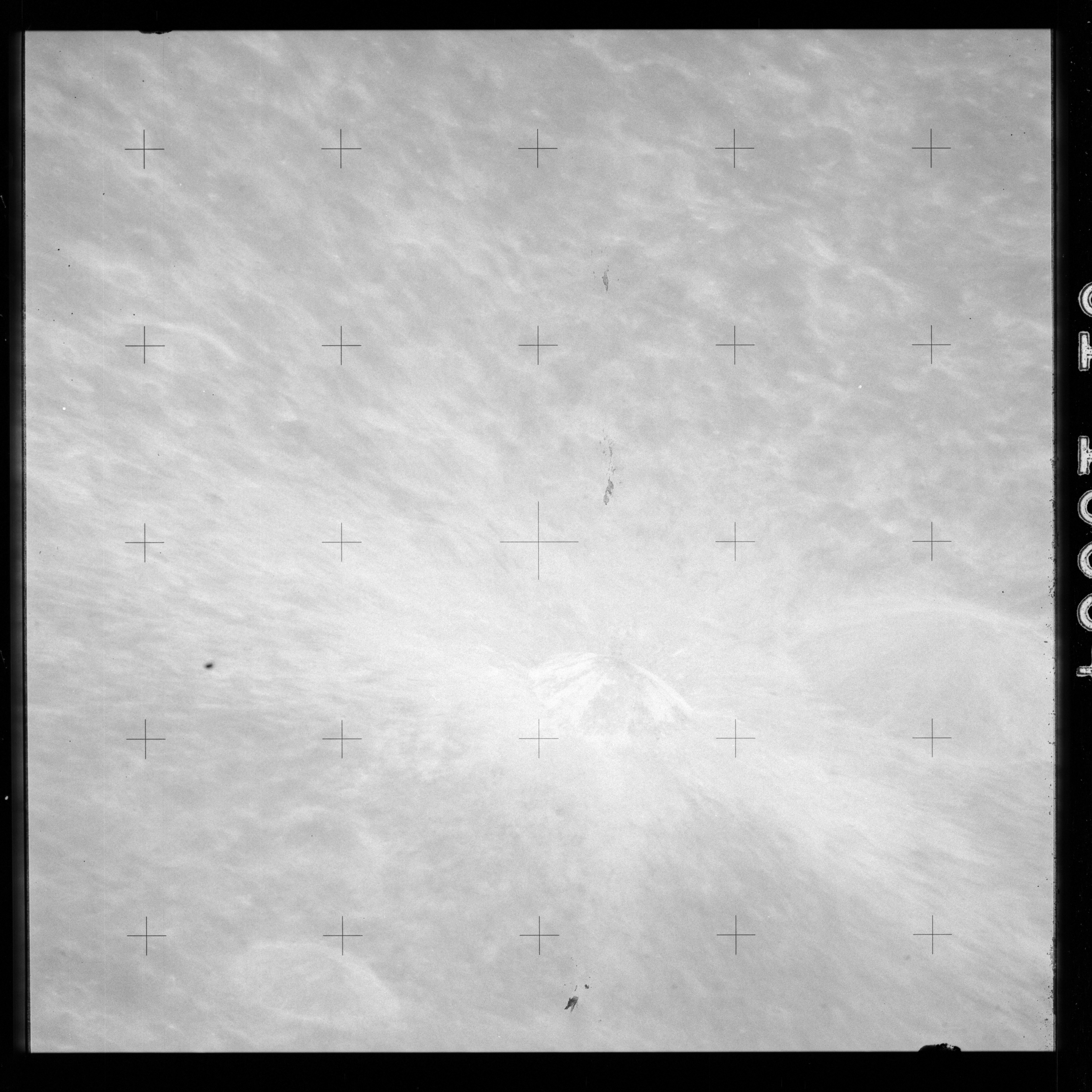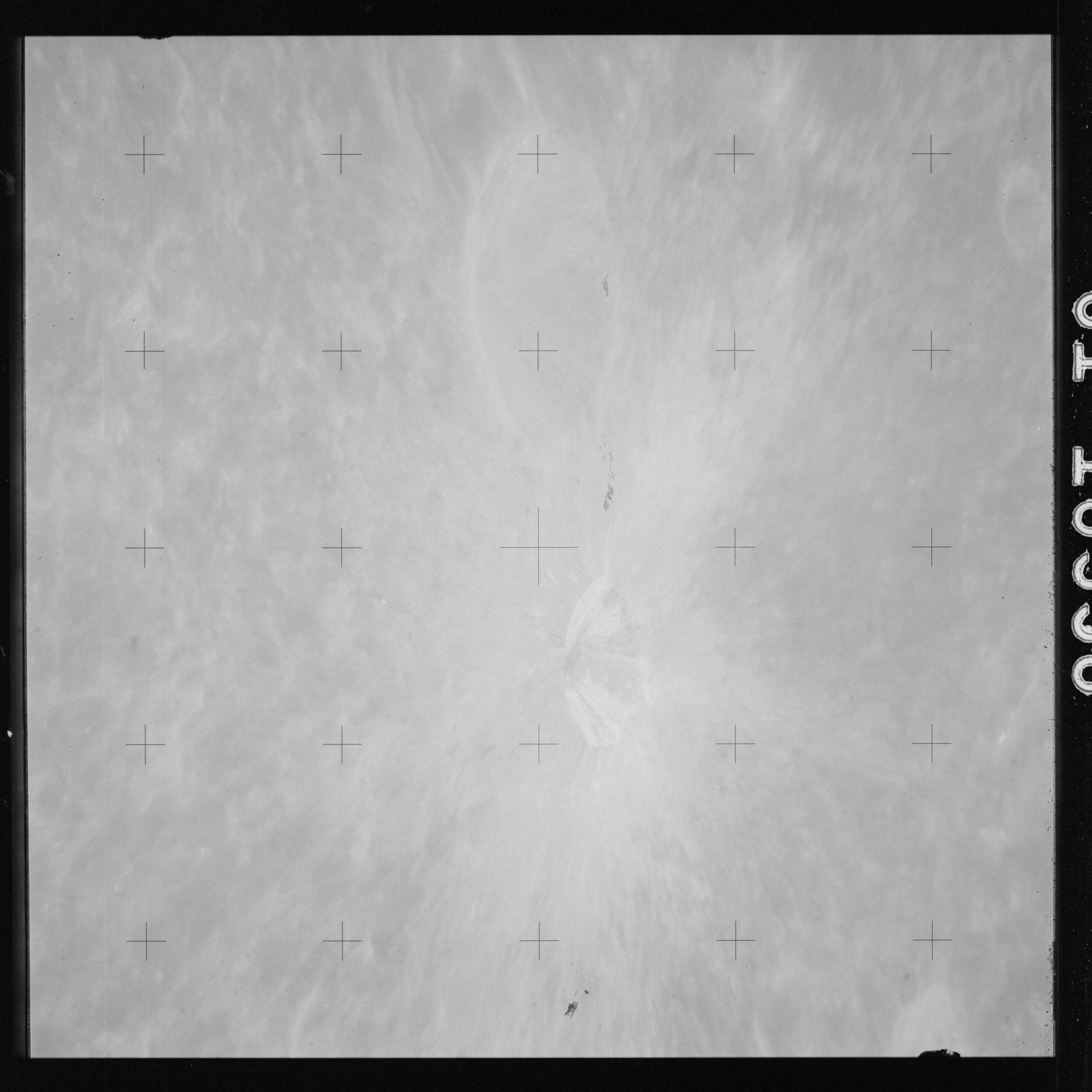 The crater to the right of the rille-producing pair is Toscanelli. The remaining ten frames on magazine PP for this pass follow slightly to the west of Toscanelli across the northern edge of the Aristarchus Plateau to Montes Agricola, finally settling on its northern end.