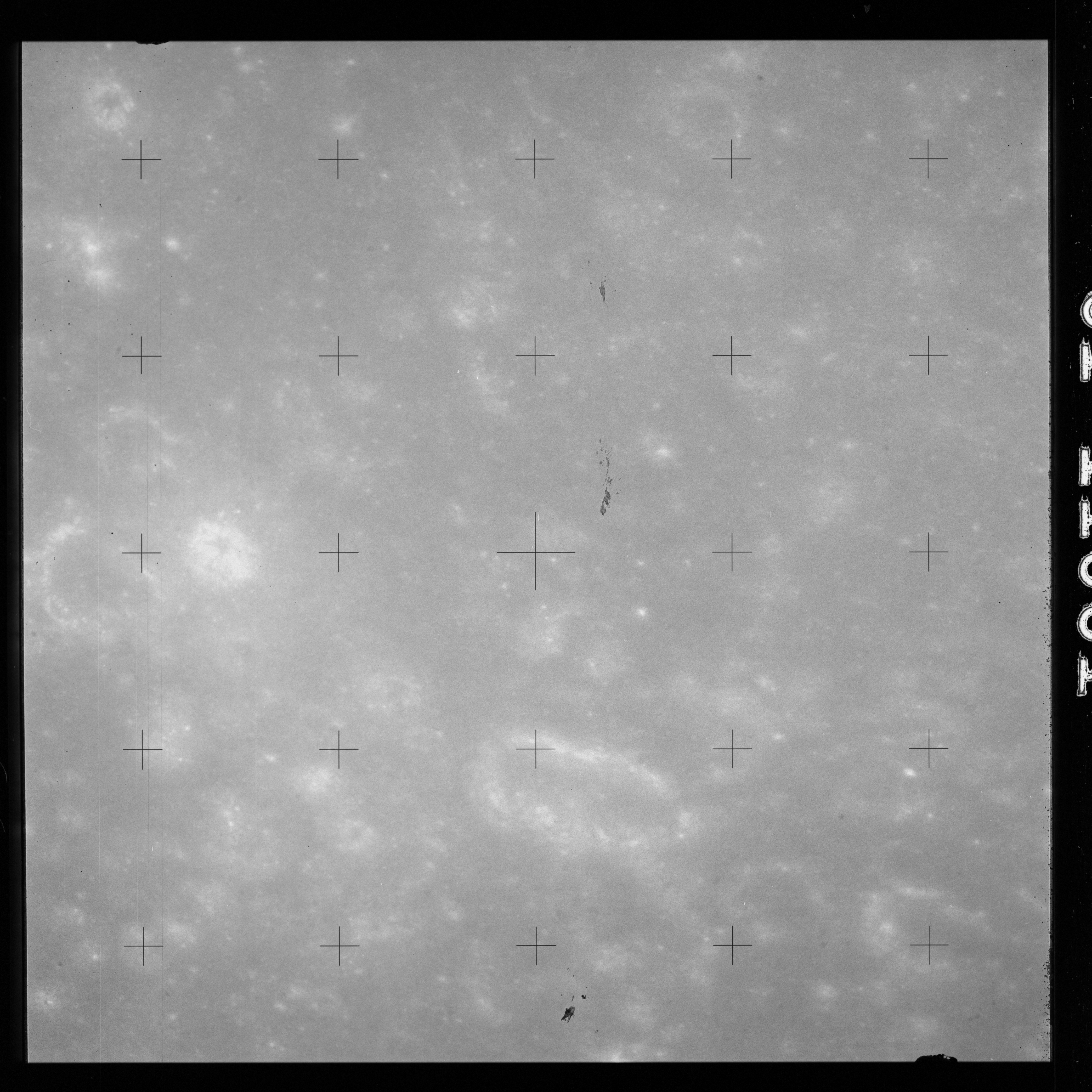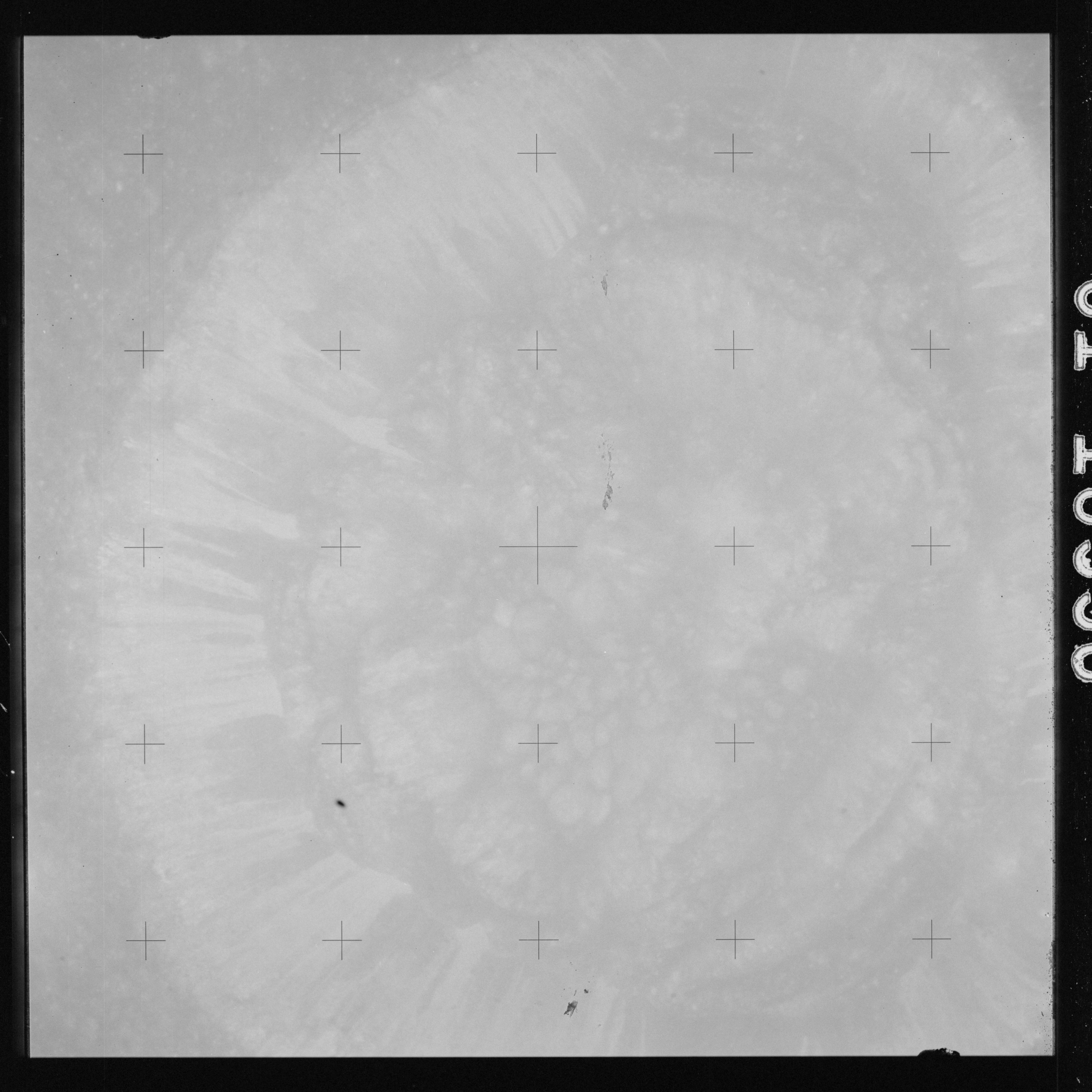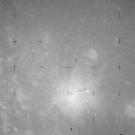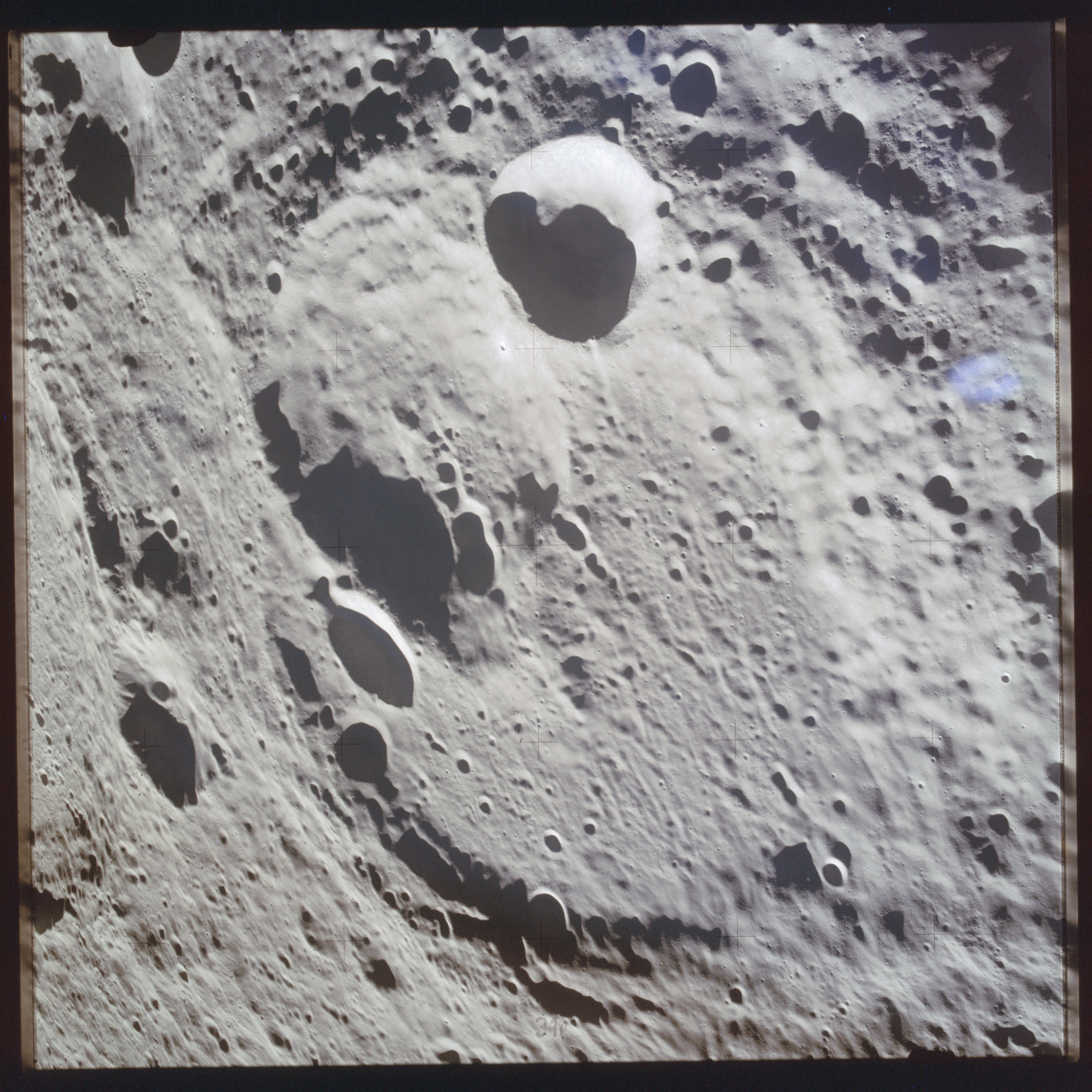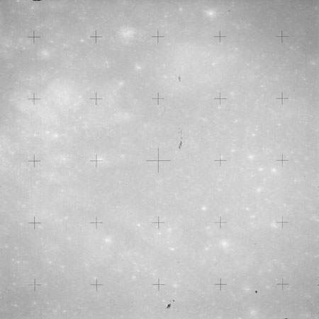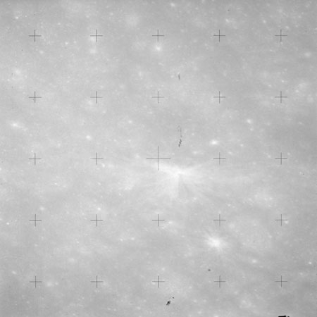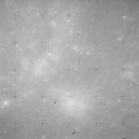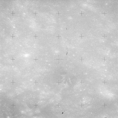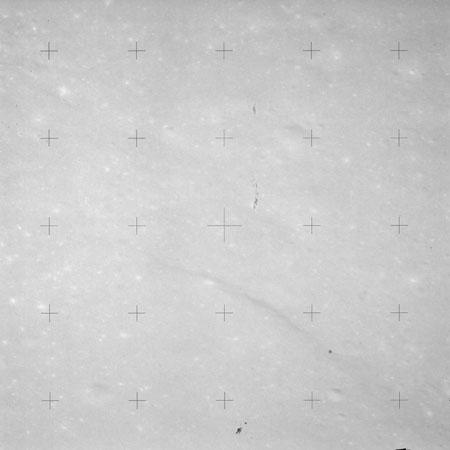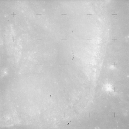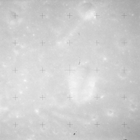 Using colour film in magazine PP and its wide-angle lens, AS15-90-12299 begins a sequence of four images which allow the spacecraft's motion to track the camera across the western Mare Imbrium. The contamination on the Réseau plate of this camera is very apparent.