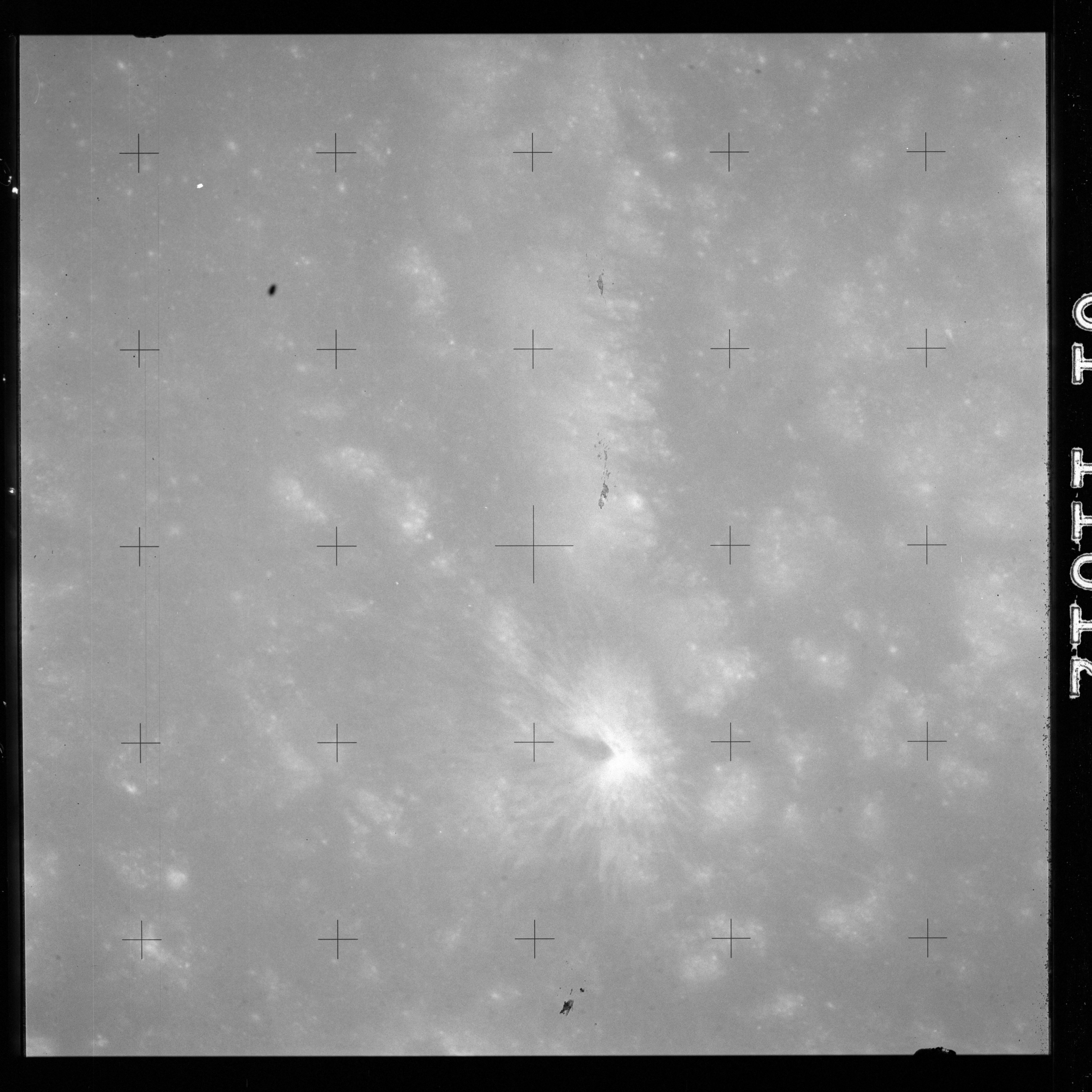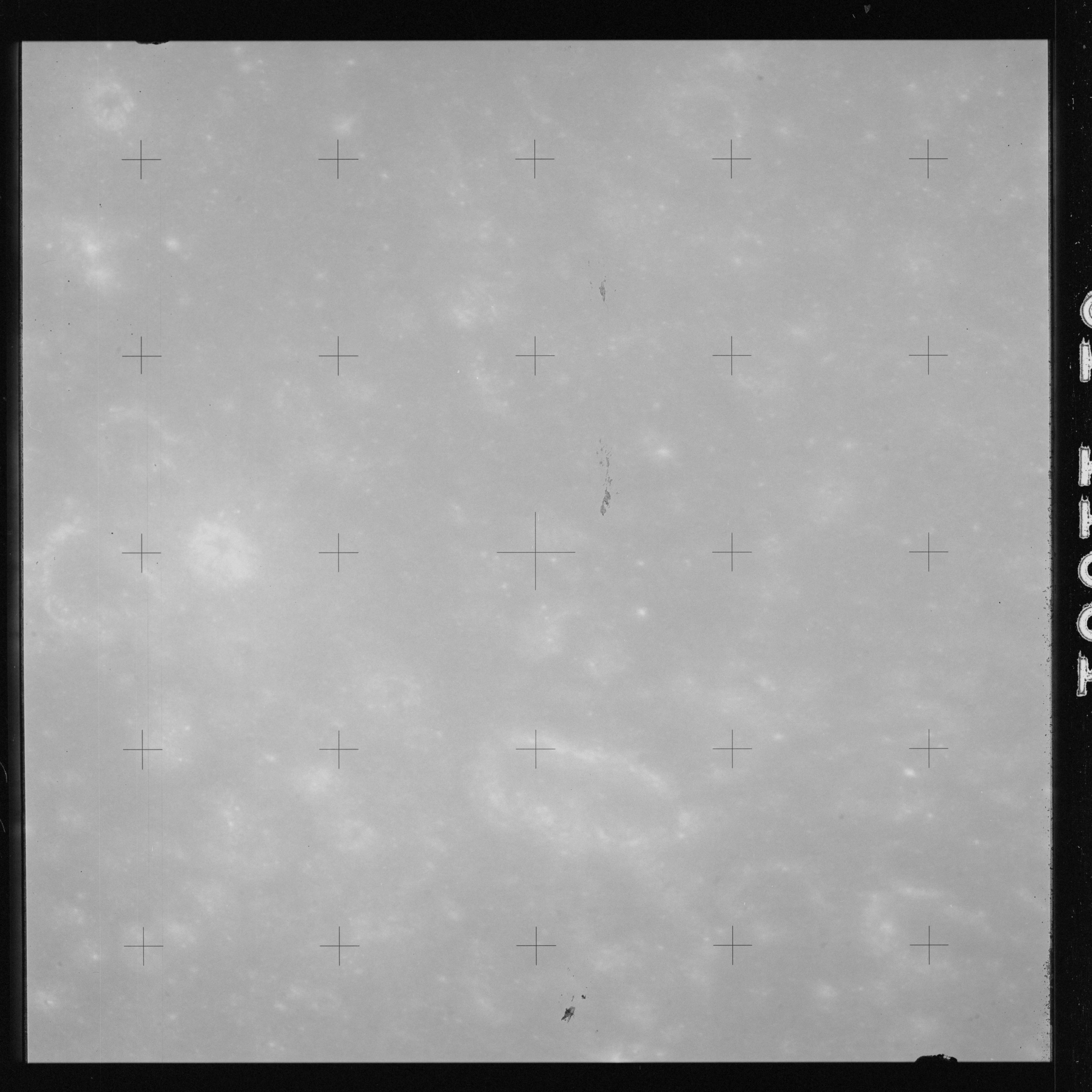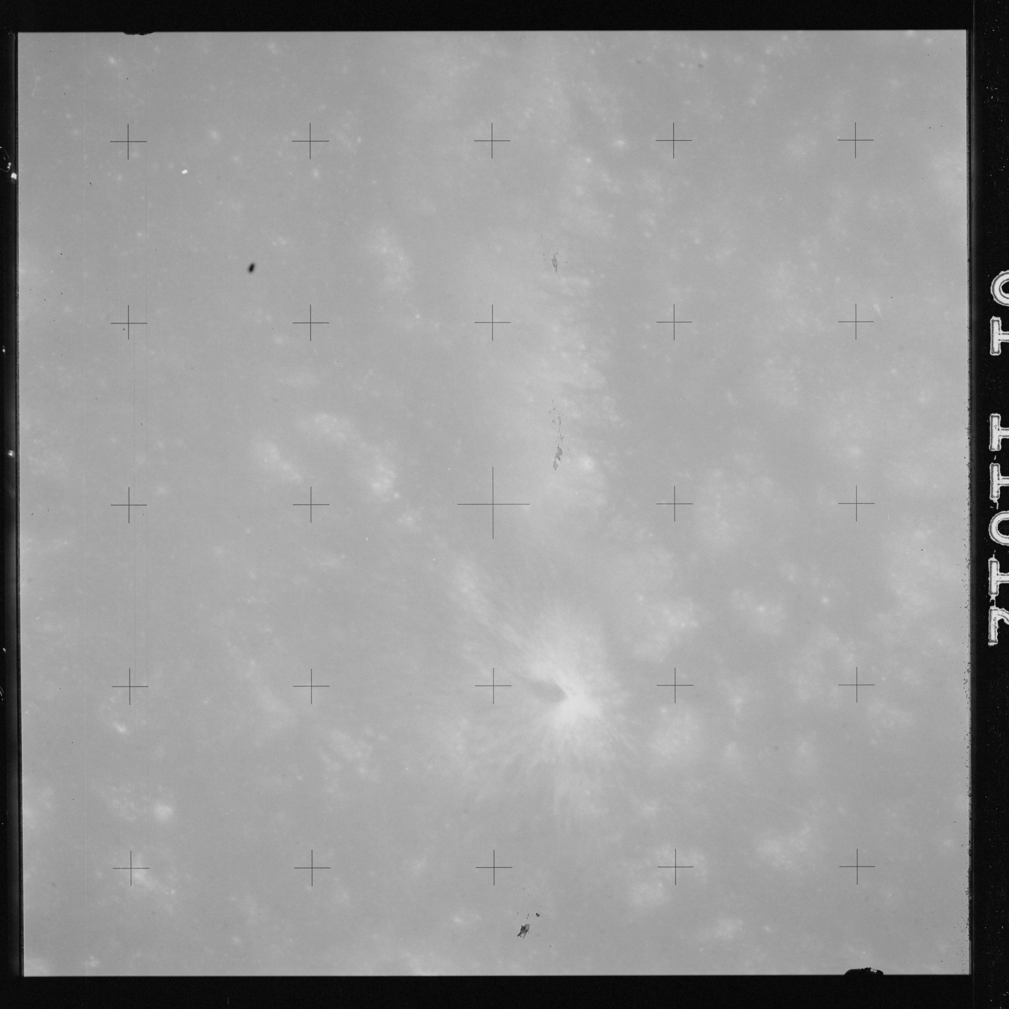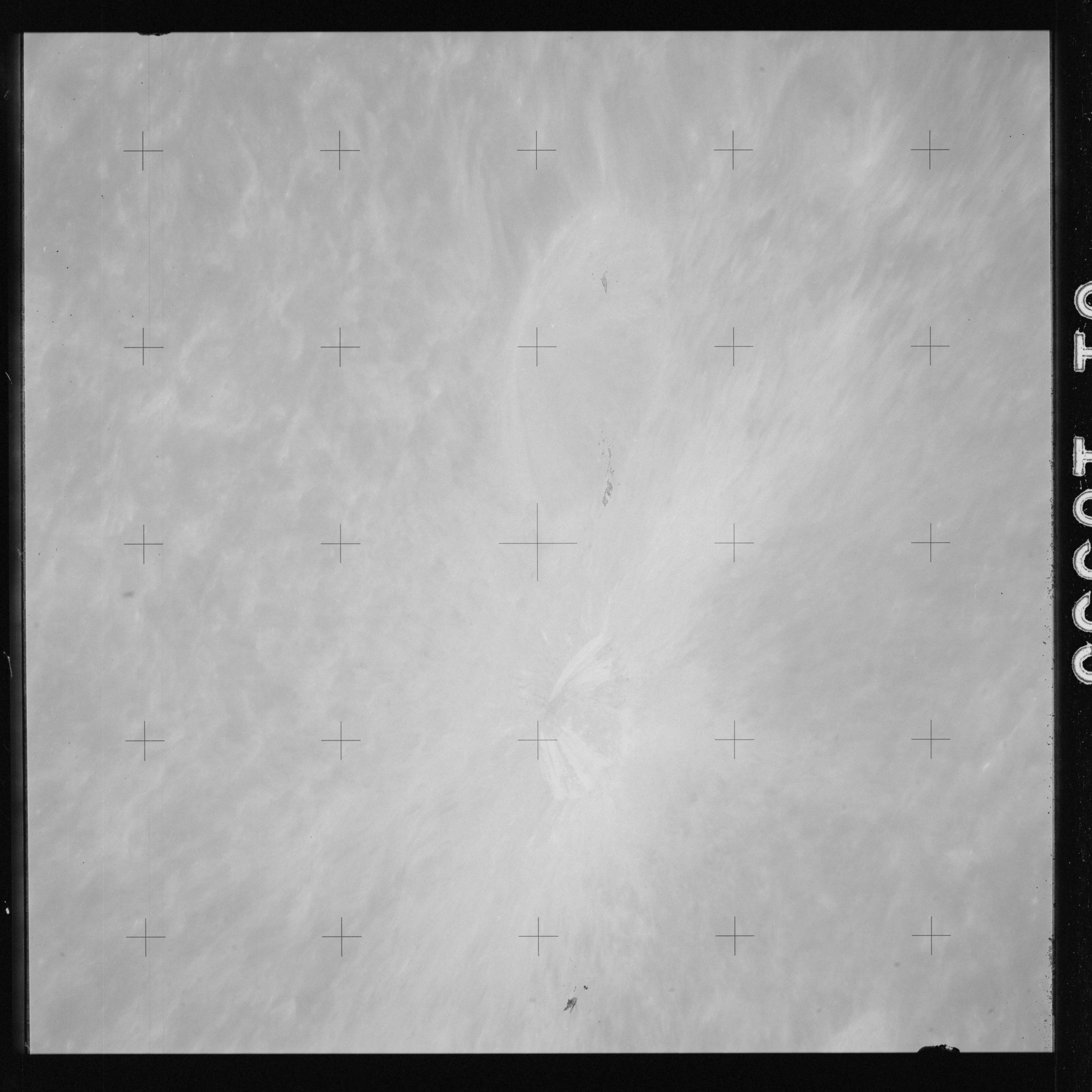 Using colour film in magazine PP and its wide-angle lens, AS15-90-12299 begins a sequence of four images which allow the spacecraft's motion to track the camera across the western Mare Imbrium. The contamination on the Réseau plate of this camera is very apparent.