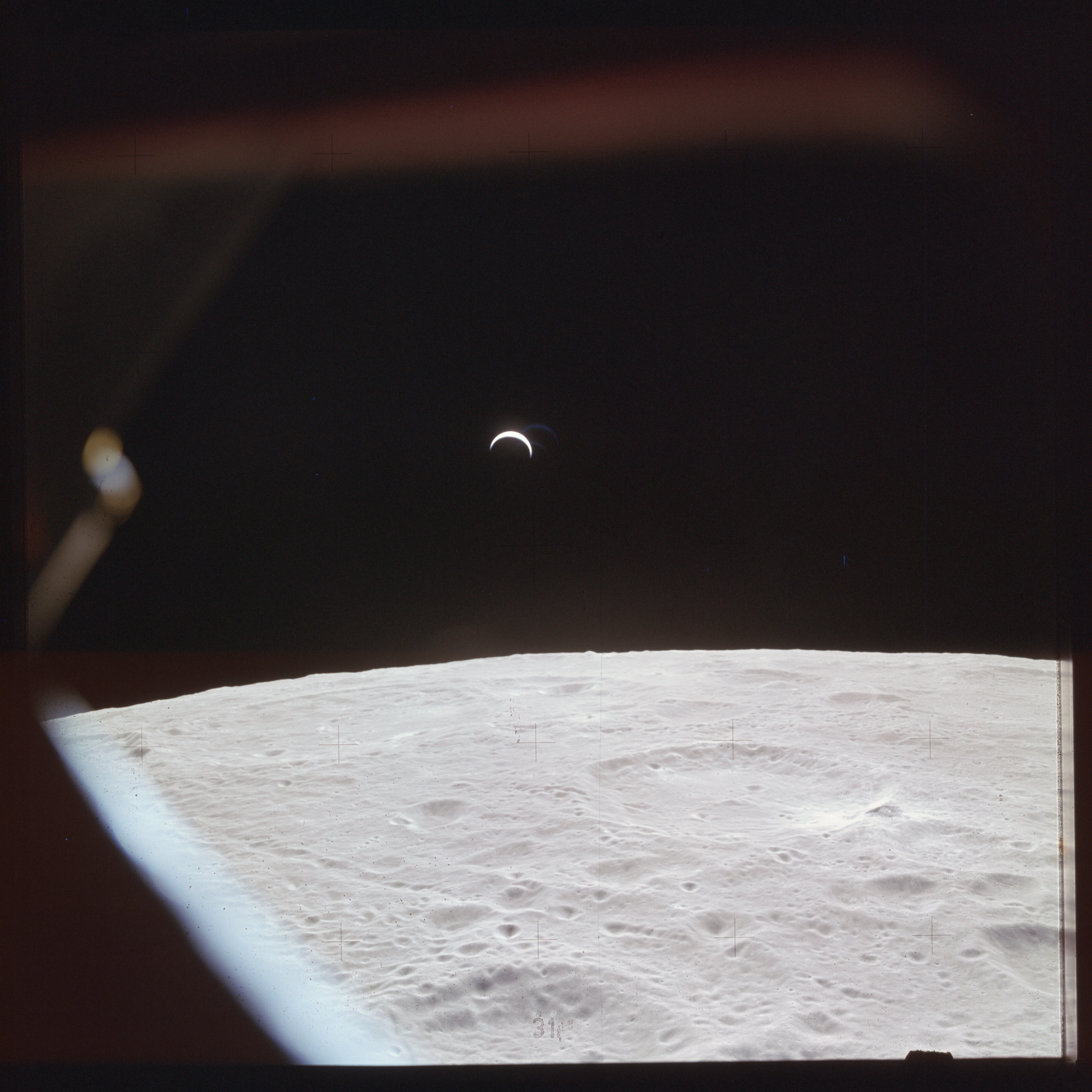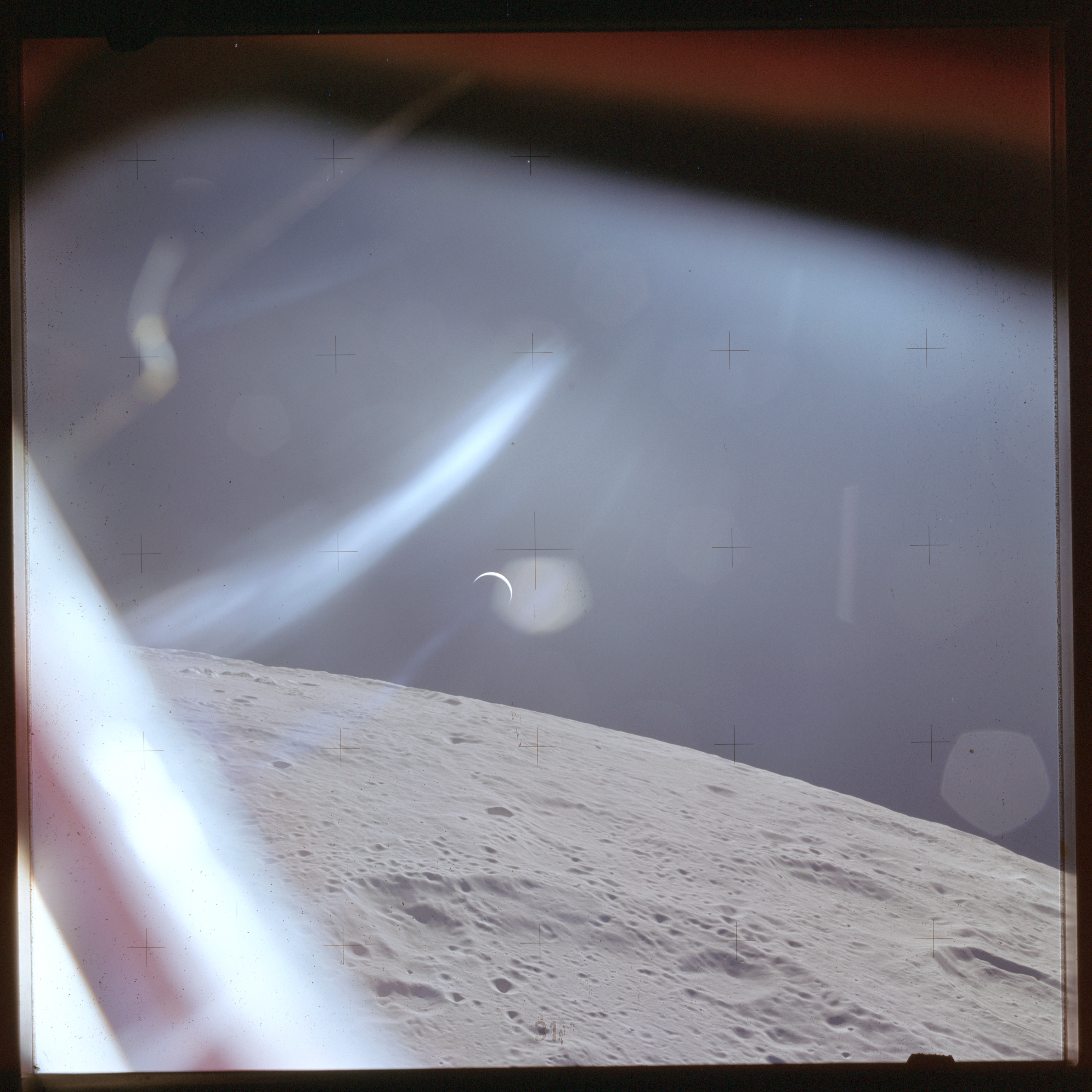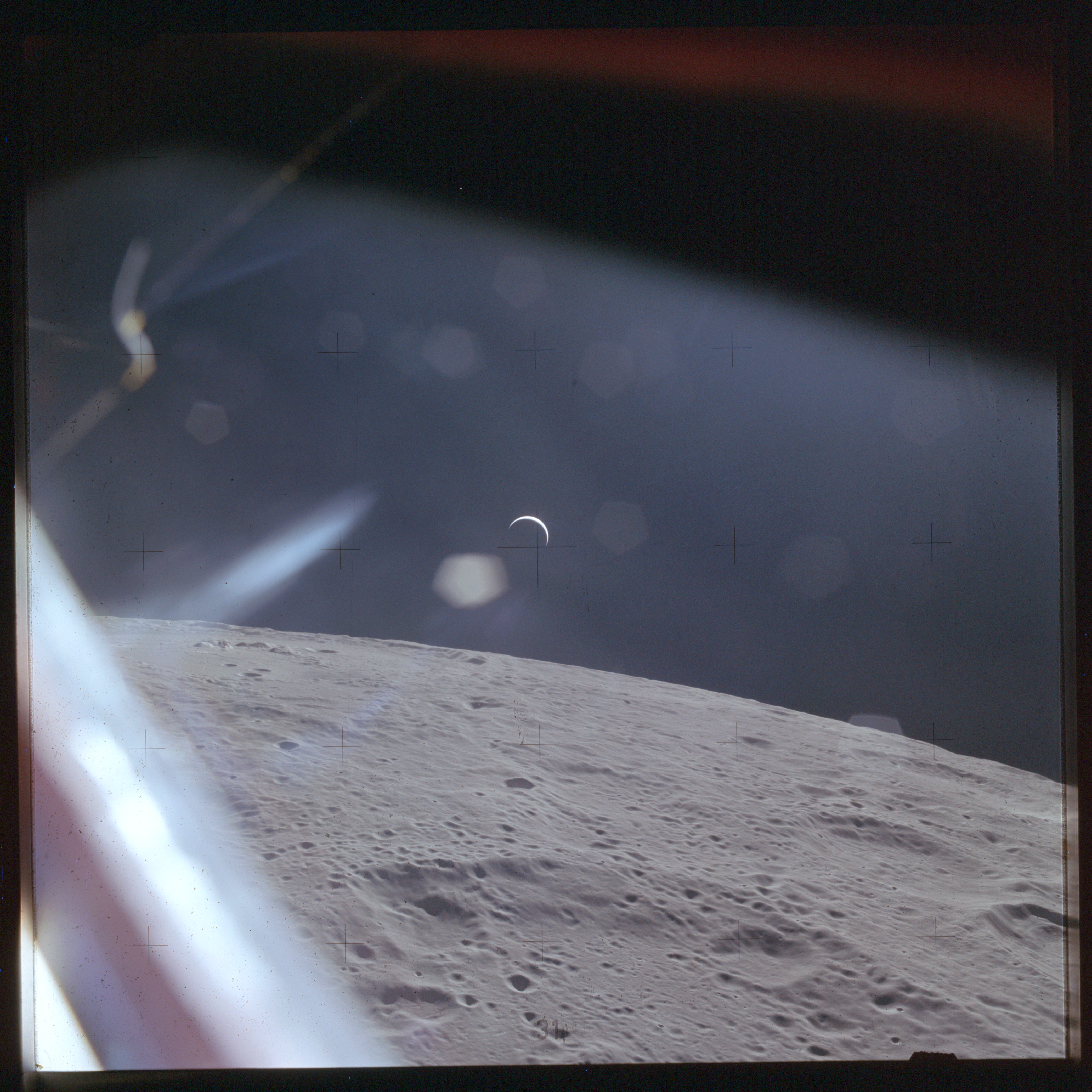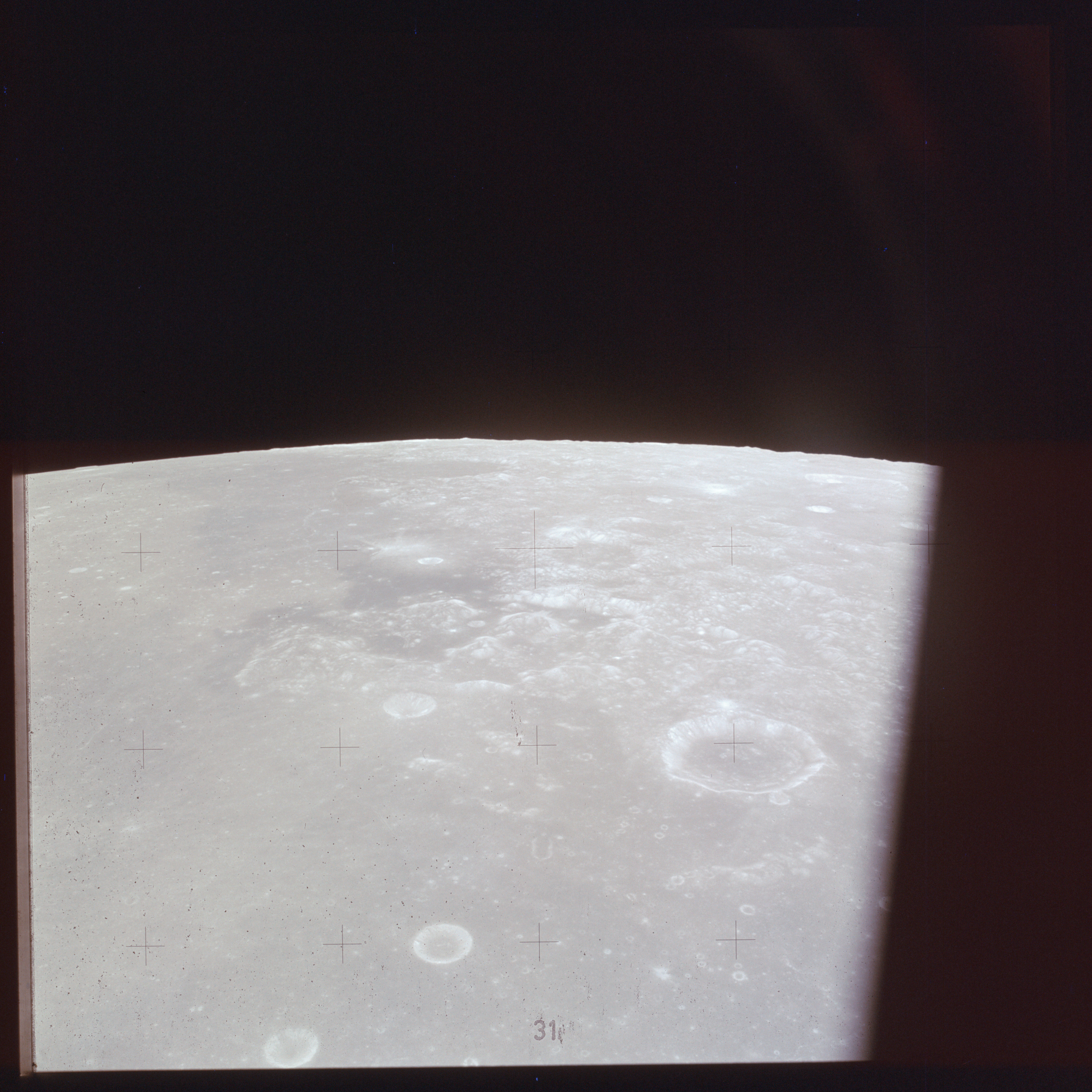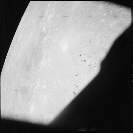 The next image on magazine PP is an image framed in the window of the main hatch that was used in the astonishing book, 'Full Moon' by Michael Light, who has kindly donated this version to the Journal, this being number 28 in his collection. Light has processed his version heavily to increase its contrast, remove the Réseau plate dirt and remove the reflections of the cabin lights in the window.