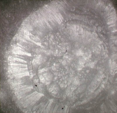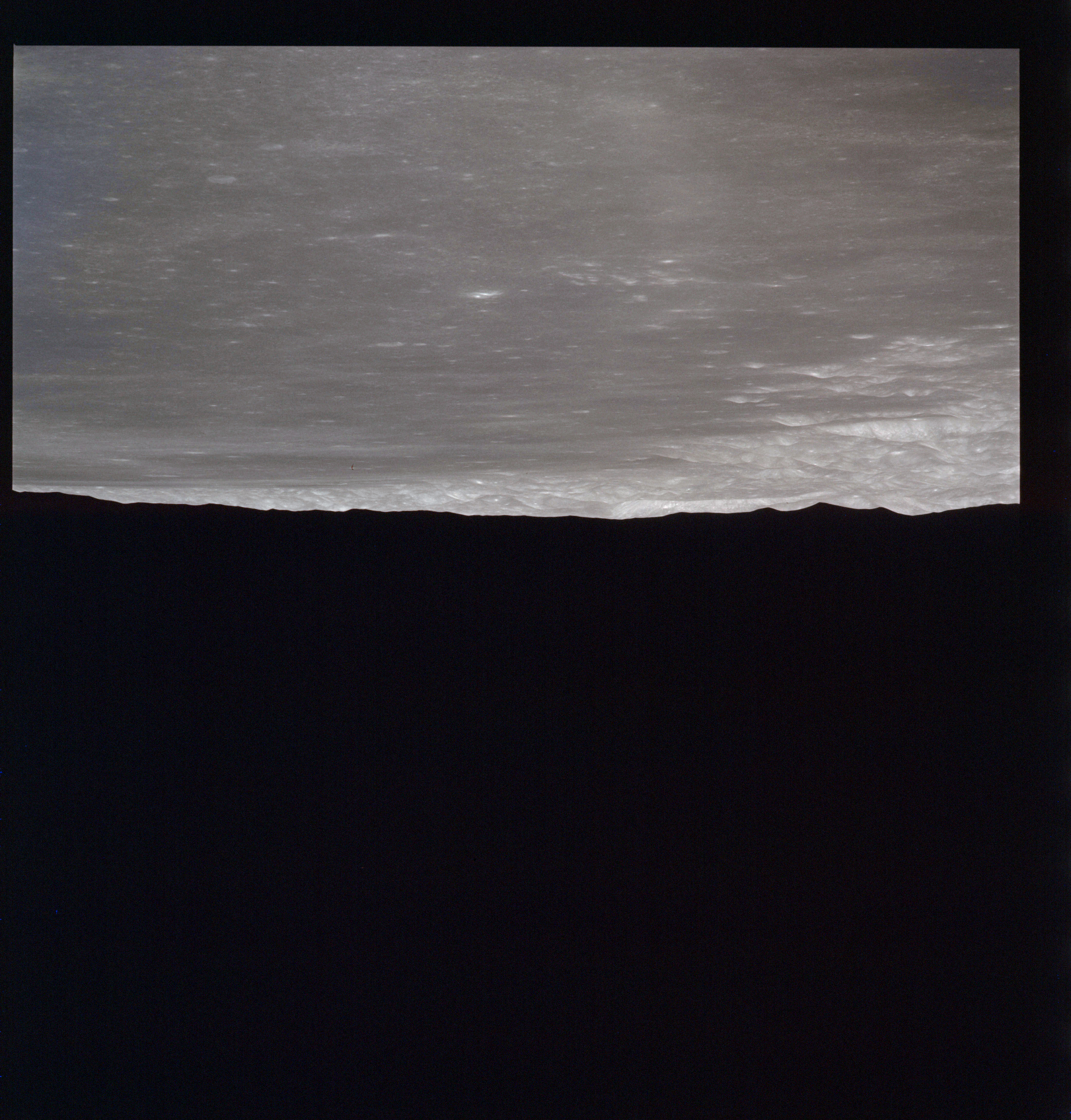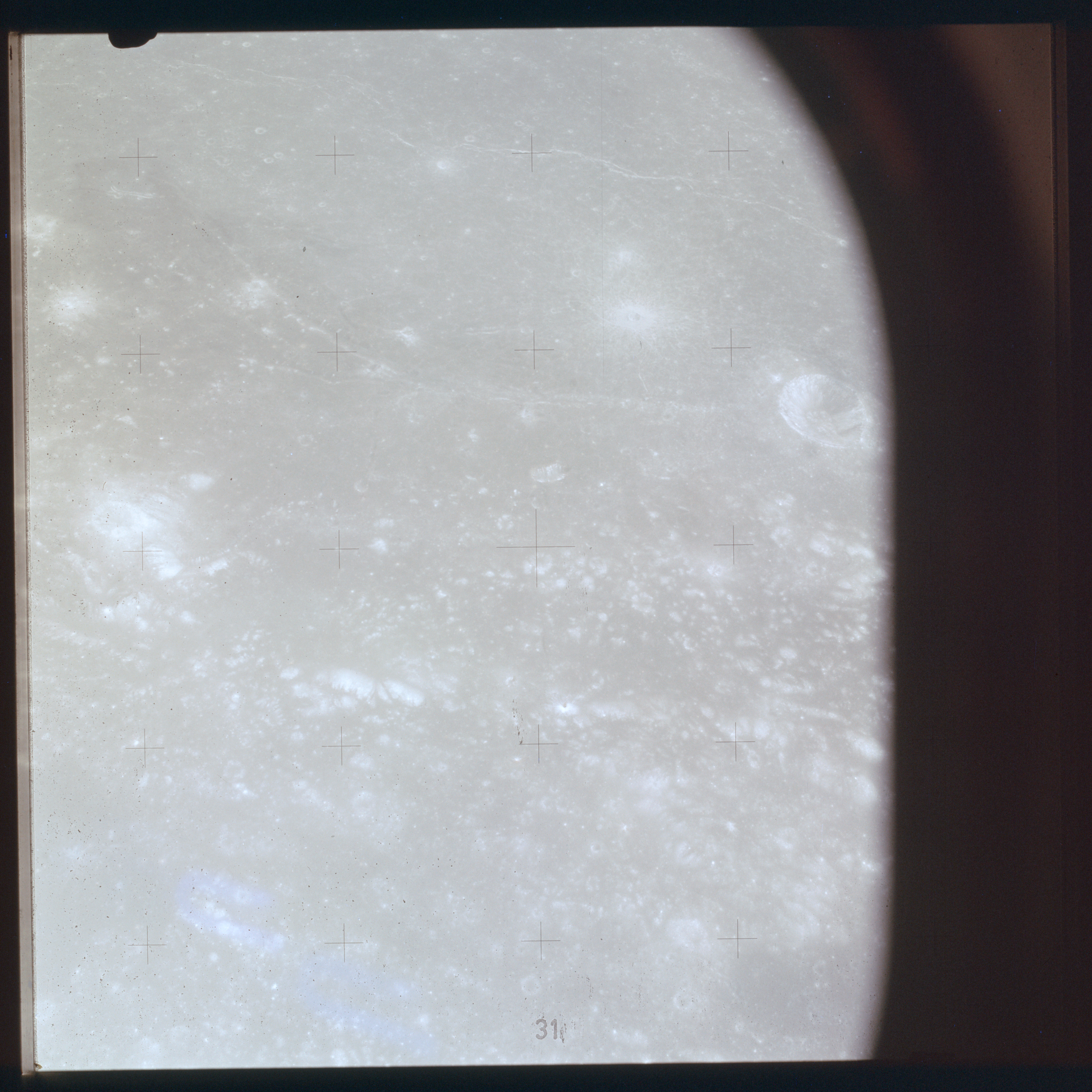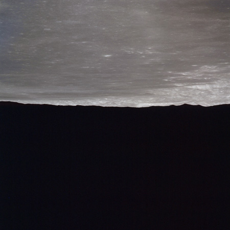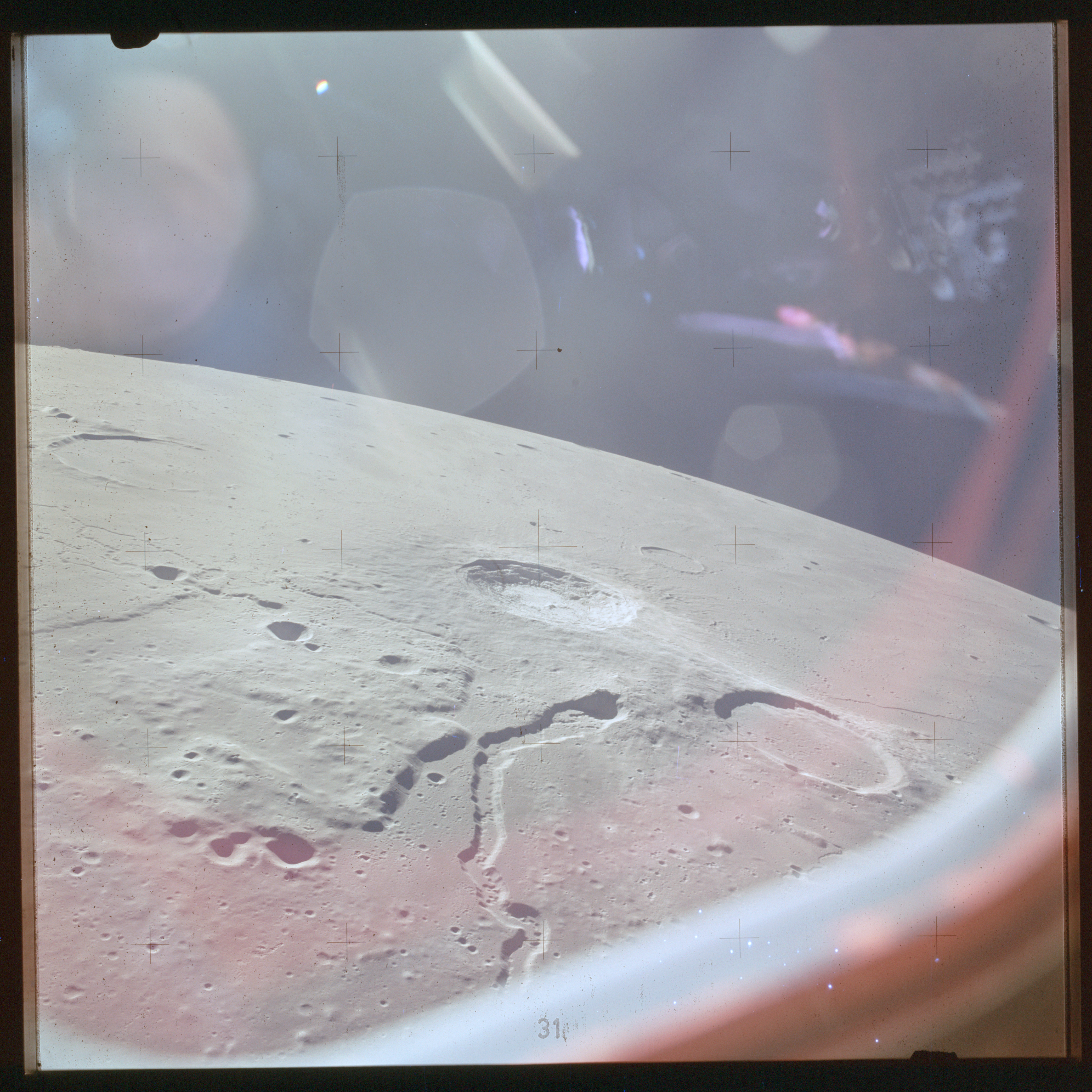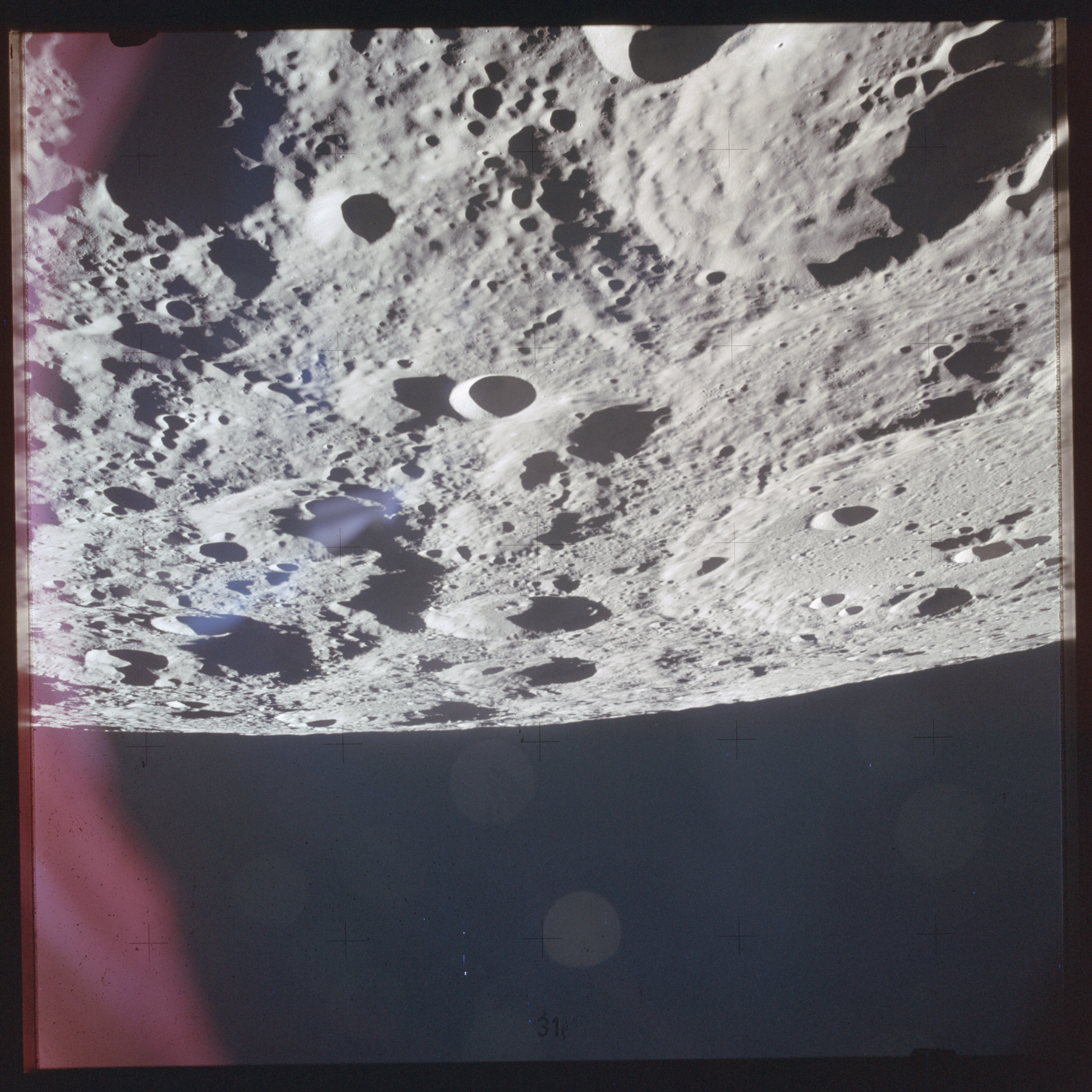 The next image on magazine PP is an image framed in the window of the main hatch that was used in the astonishing book, 'Full Moon' by Michael Light, who has kindly donated this version to the Journal, this being number 28 in his collection. Light has processed his version heavily to increase its contrast, remove the Réseau plate dirt and remove the reflections of the cabin lights in the window.