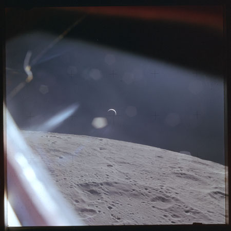 Just as the Moon appears nearly full from Earth, so the home planet reciprocates by displaying a striking crescent to the crew.