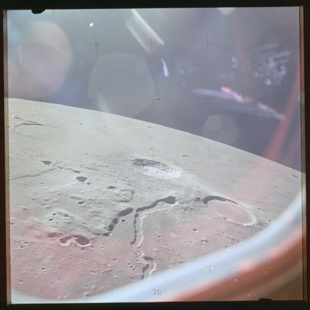 Simultaneously with these wide-angle images in and around the Aristarchus Plateau, another crop are being taken of this rich area using colour film and the medium telephoto (250-mm) lens. These are AS15-97-13246 to 13265.
