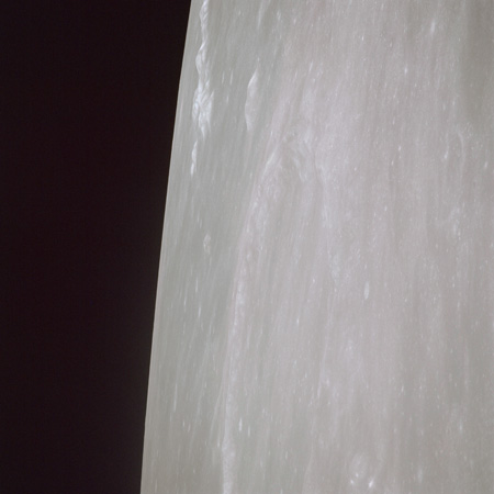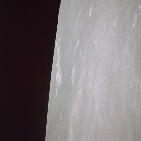 As seen from Earth, the Moon is very near full and as a consequence, there are only about five minutes between Endeavour passing the terminator and AOS. Only limited photography can be achieved on the far side, so with magazine TT and the slightly wide-angle 60-mm lens, three images are taken during this short interval.