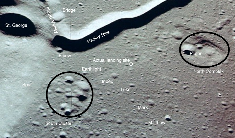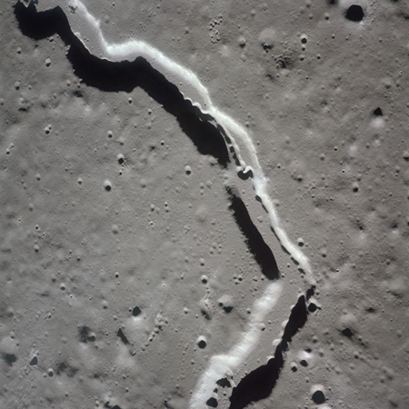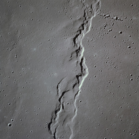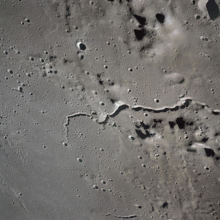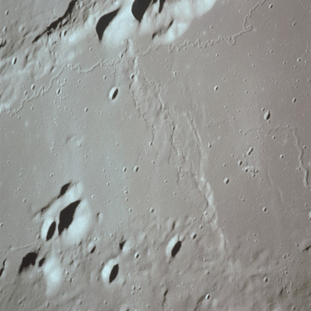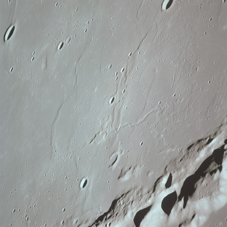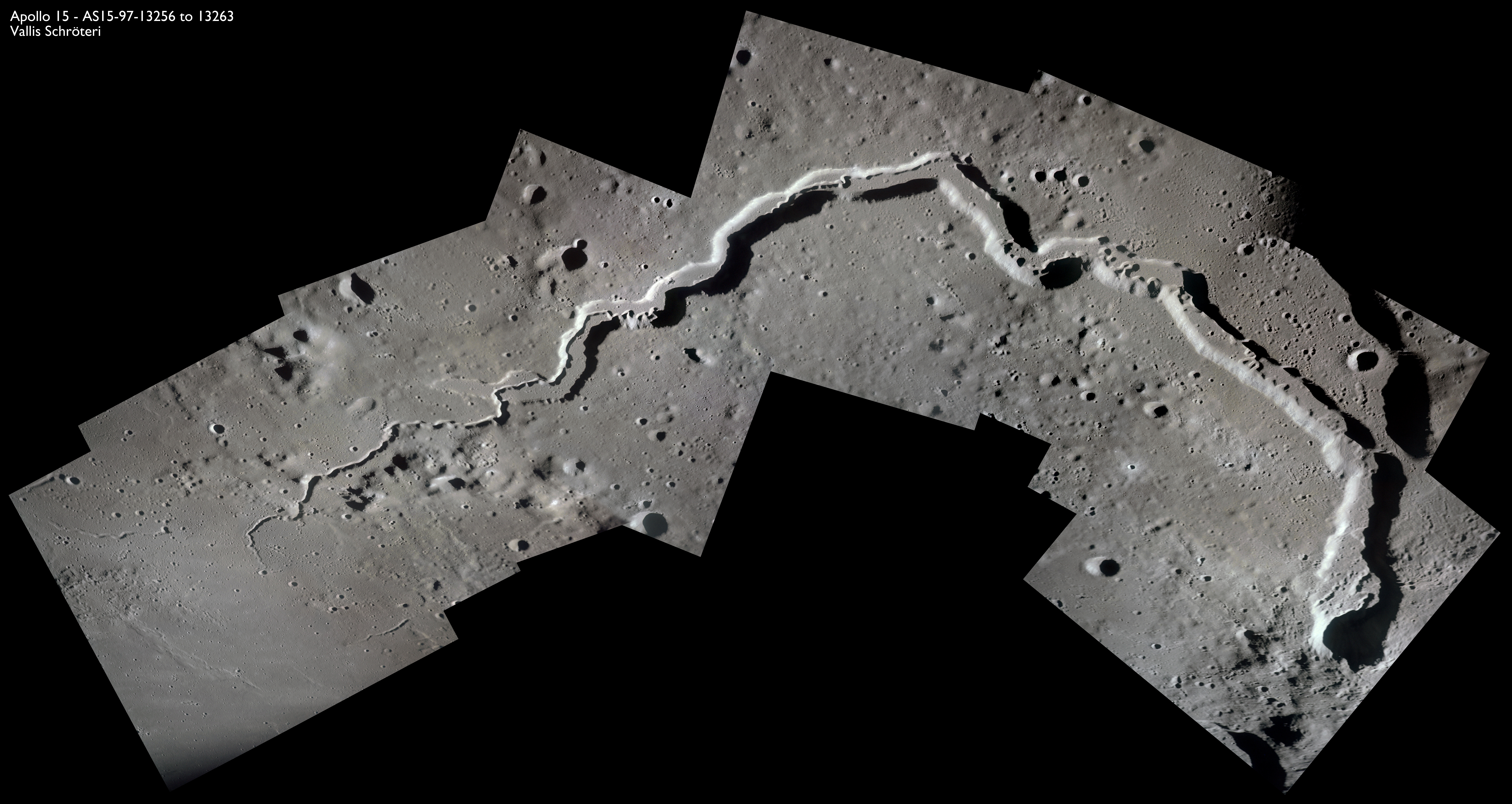 The valley is visible from Earth with even a small telescope but it took spacecraft to reveal the smaller meandering rille within. When compared to the bulk of the rille, the Cobra Head is very heavily pitted with craters. These are secondary impacts from the ejecta thrown out by Aristarchus a few dozen kilometres to the left and much younger than the rille. While Schröter's Valley is about 3 aeons old, Aristarchus' age is "only" about ½ an aeon or less. The composite was produced from frames AS15-97-13256 to 13263. Paul Spudis is a geologist at the Lunar and Planetary Institute in Houston and we discussed the sinuous rilles.